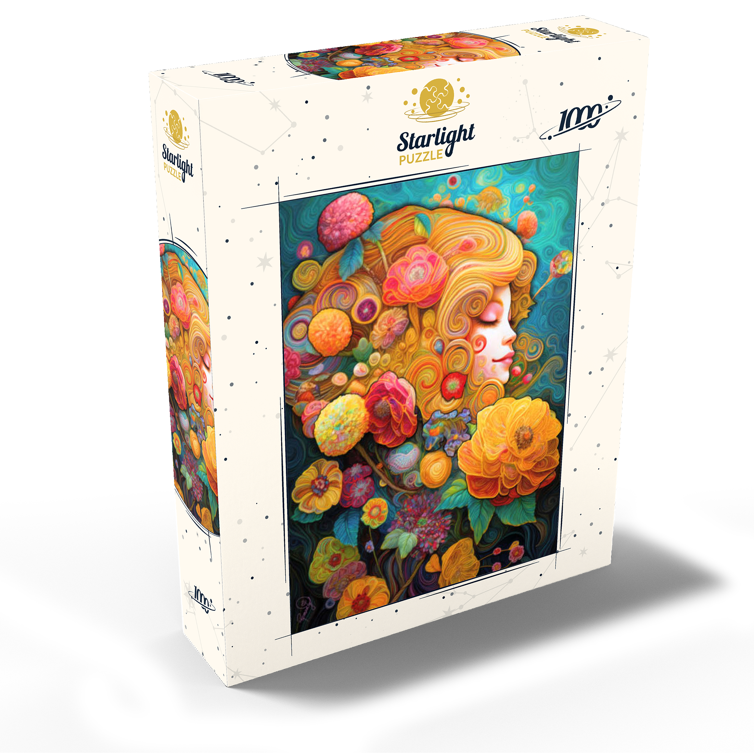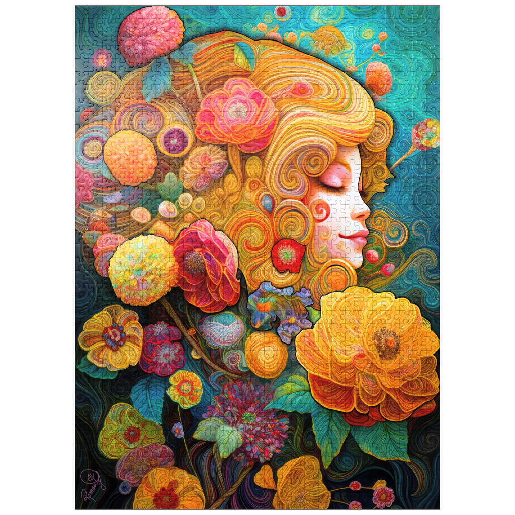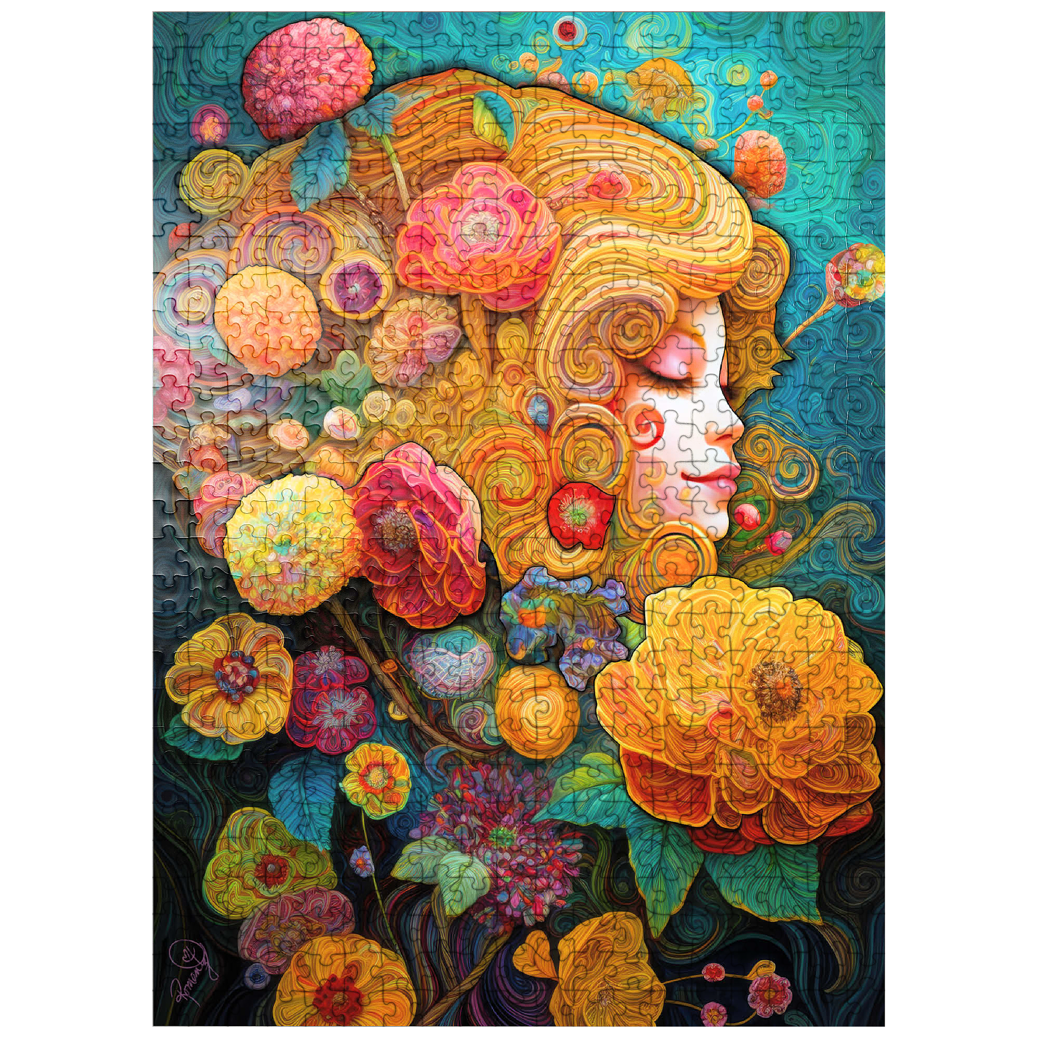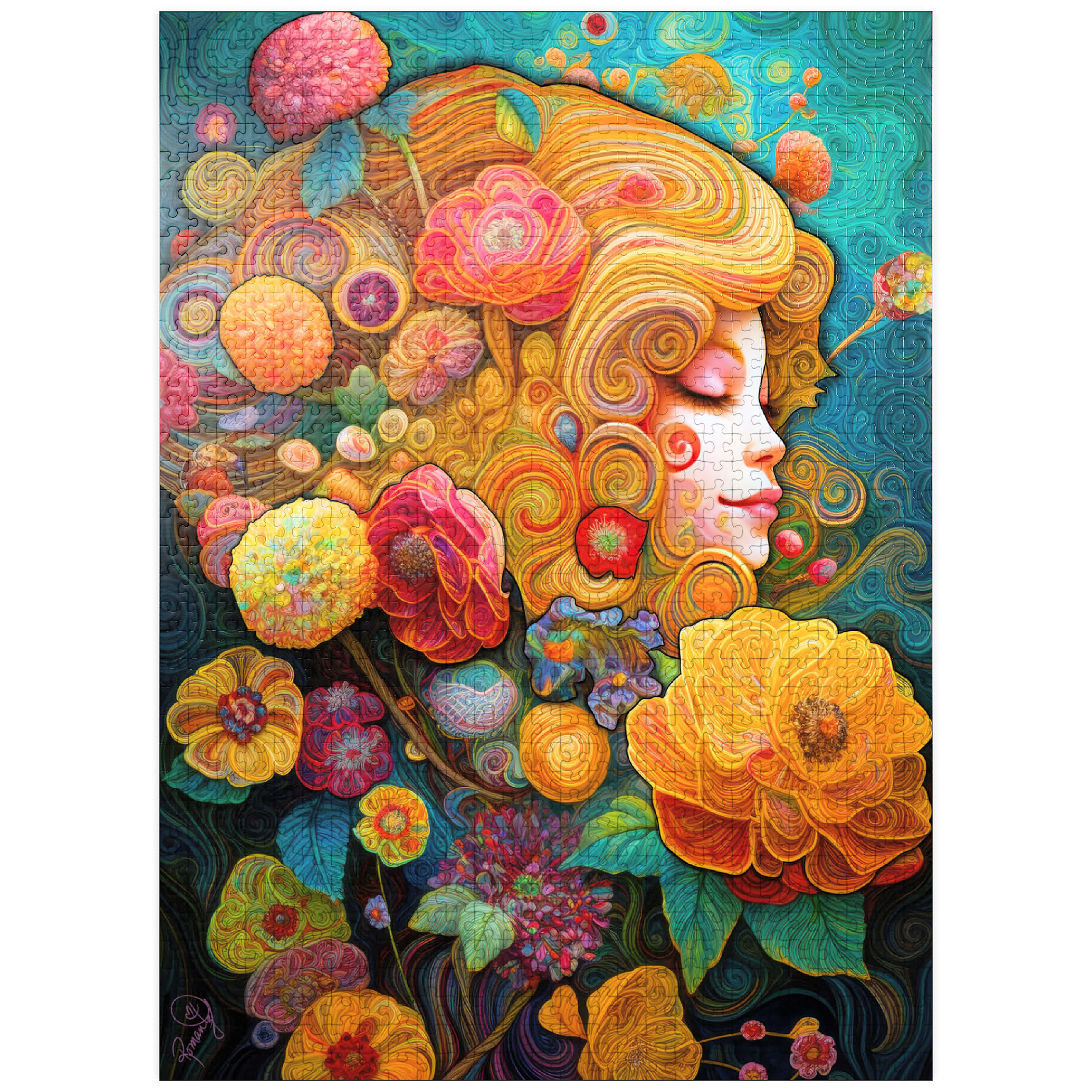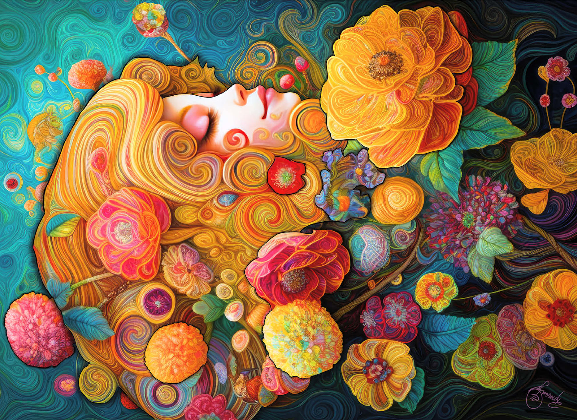 This mesmerizing artwork portrays a serene female profile immersed in an intricate swirl of golden curls and vibrant blossoms. the background is alive with fluid, spiraling patterns in blues and greens, contrasting the rich oranges, reds, and yellows of the flowers blooming from her hair. each detail, from delicate petals to ornamental curls, evokes a dreamlike connection to nature and imagination. with a tranquil expression and closed eyes, the subject embodies peace, inner beauty, and whimsical charm-capturing a magical fusion of fantasy and floral elegance.