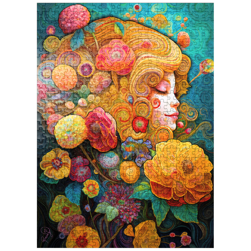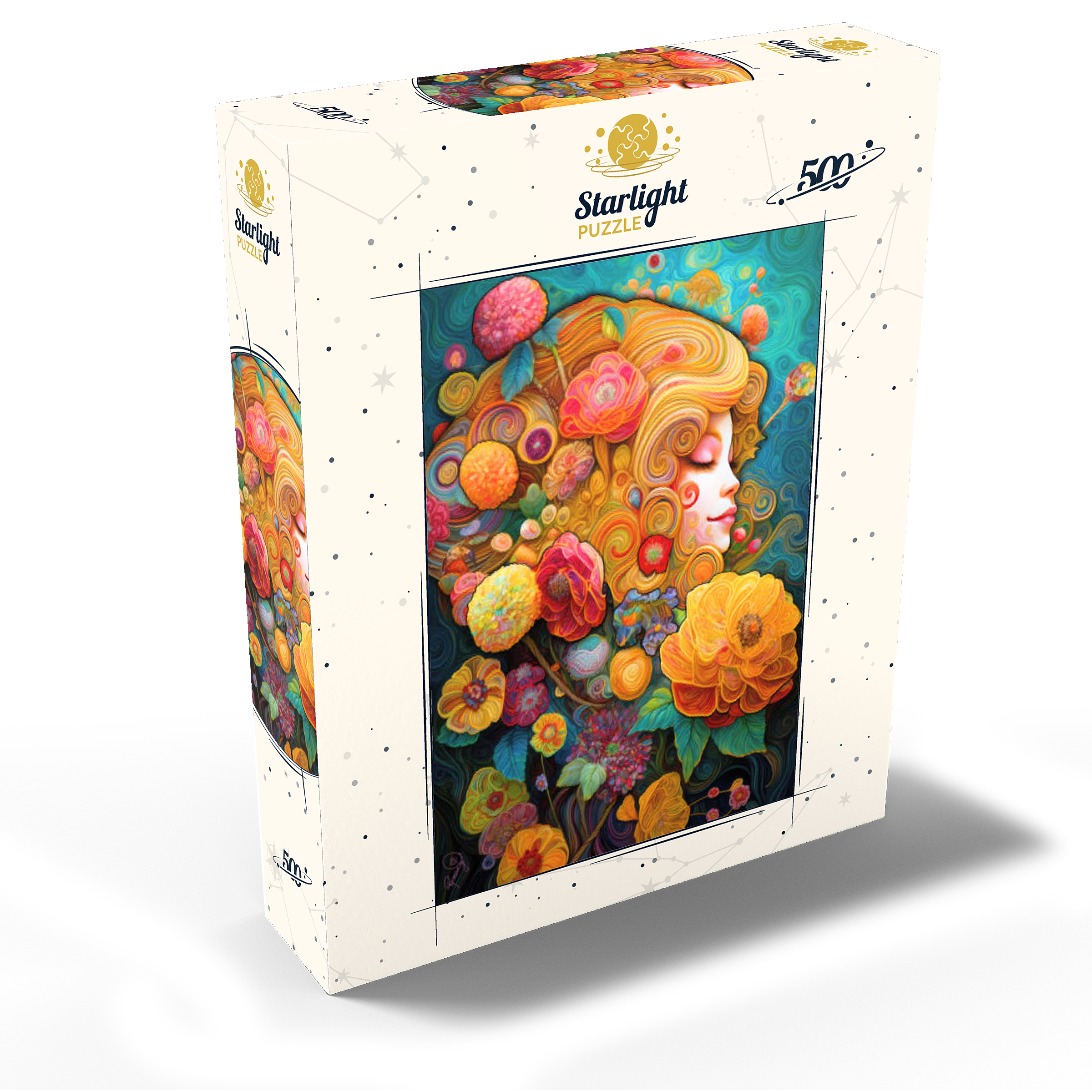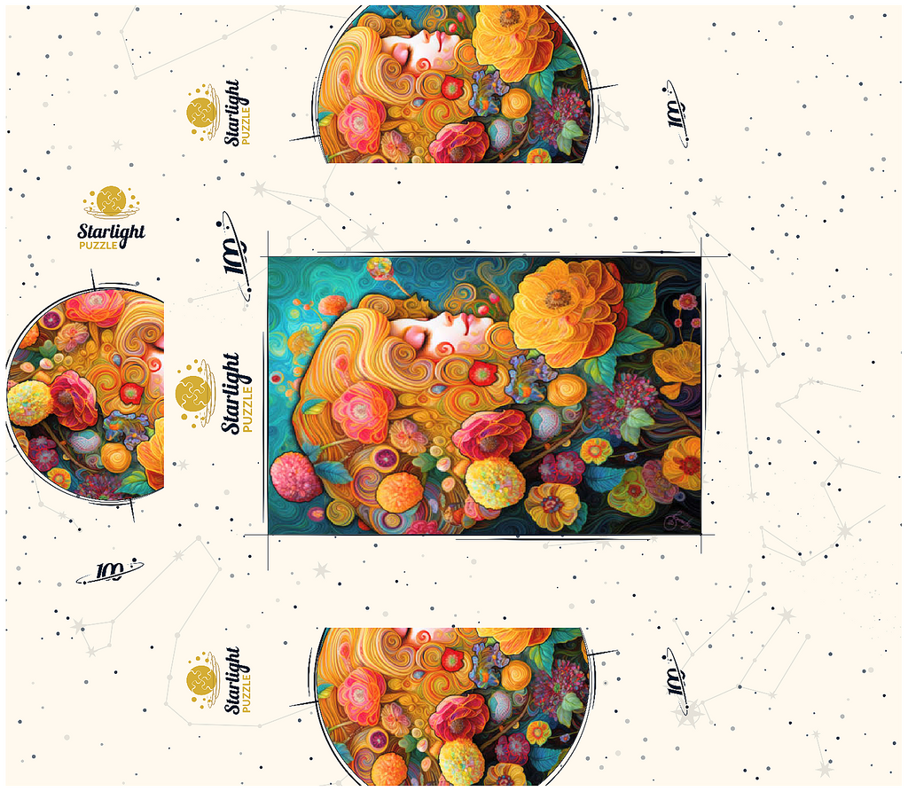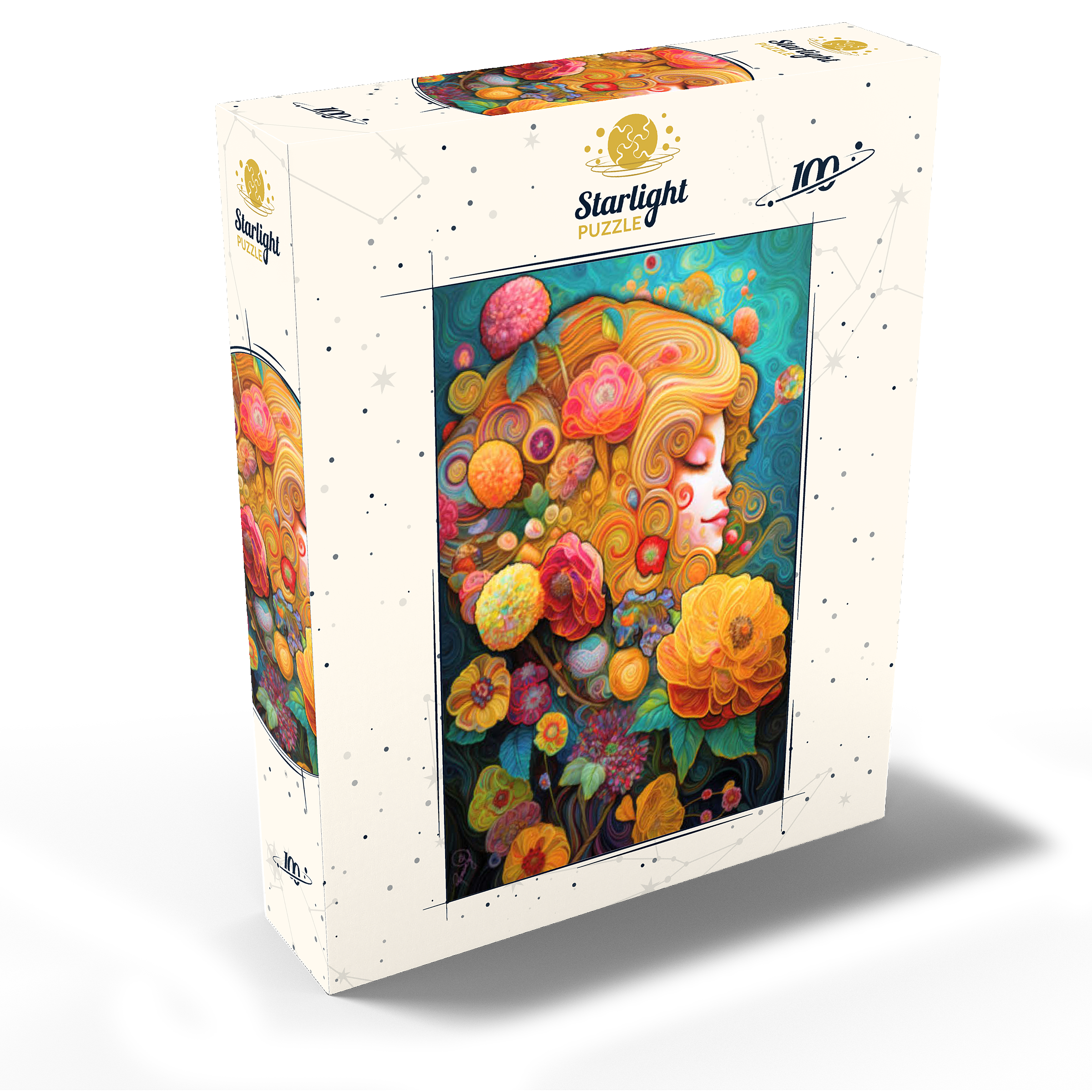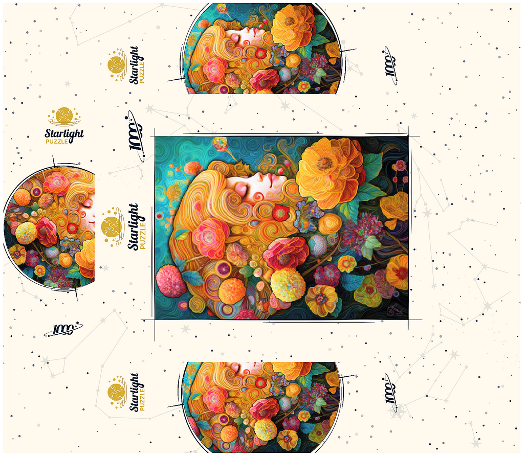 This mesmerizing artwork portrays a serene female profile immersed in an intricate swirl of golden curls and vibrant blossoms. the background is alive with fluid, spiraling patterns in blues and greens, contrasting the rich oranges, reds, and yellows of the flowers blooming from her hair. each detail, from delicate petals to ornamental curls, evokes a dreamlike connection to nature and imagination. with a tranquil expression and closed eyes, the subject embodies peace, inner beauty, and whimsical charm-capturing a magical fusion of fantasy and floral elegance.
