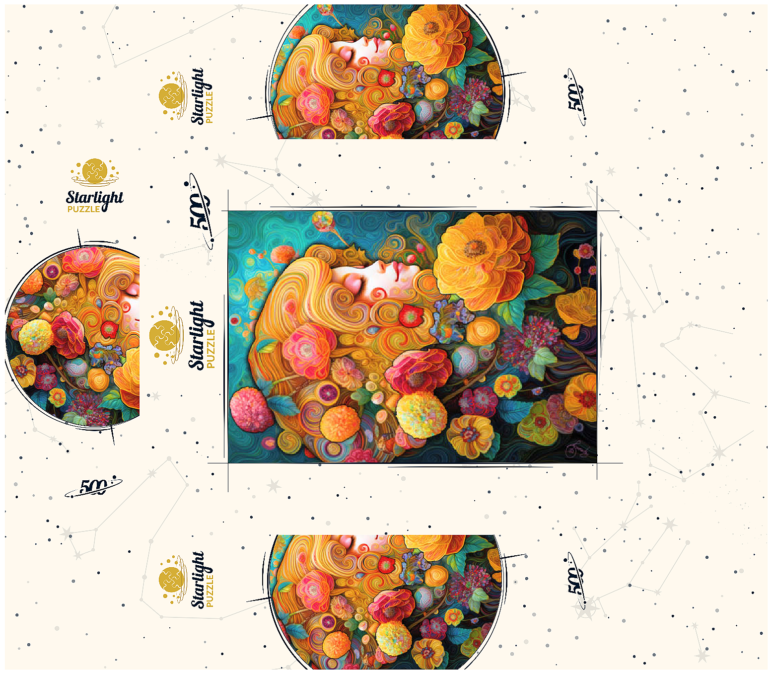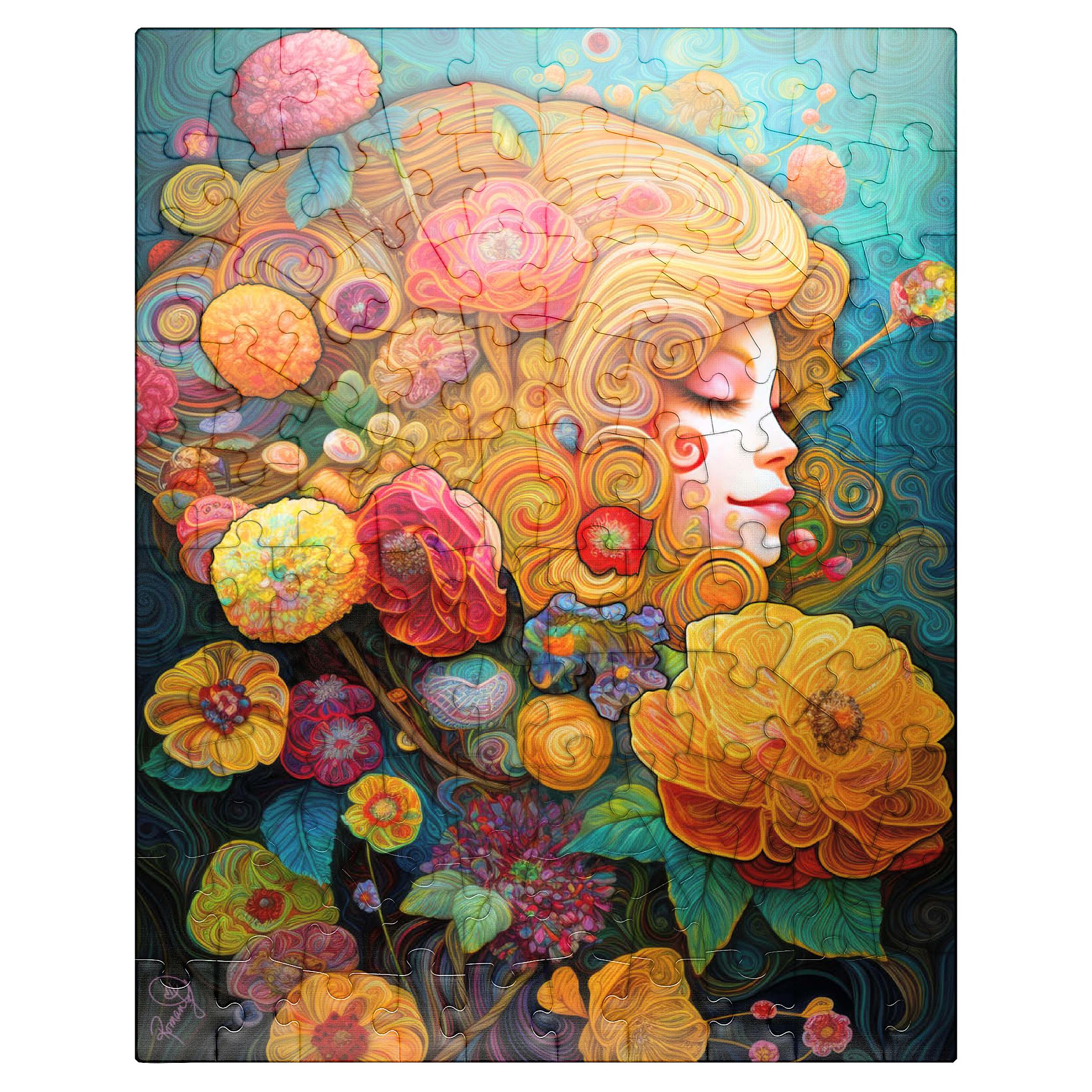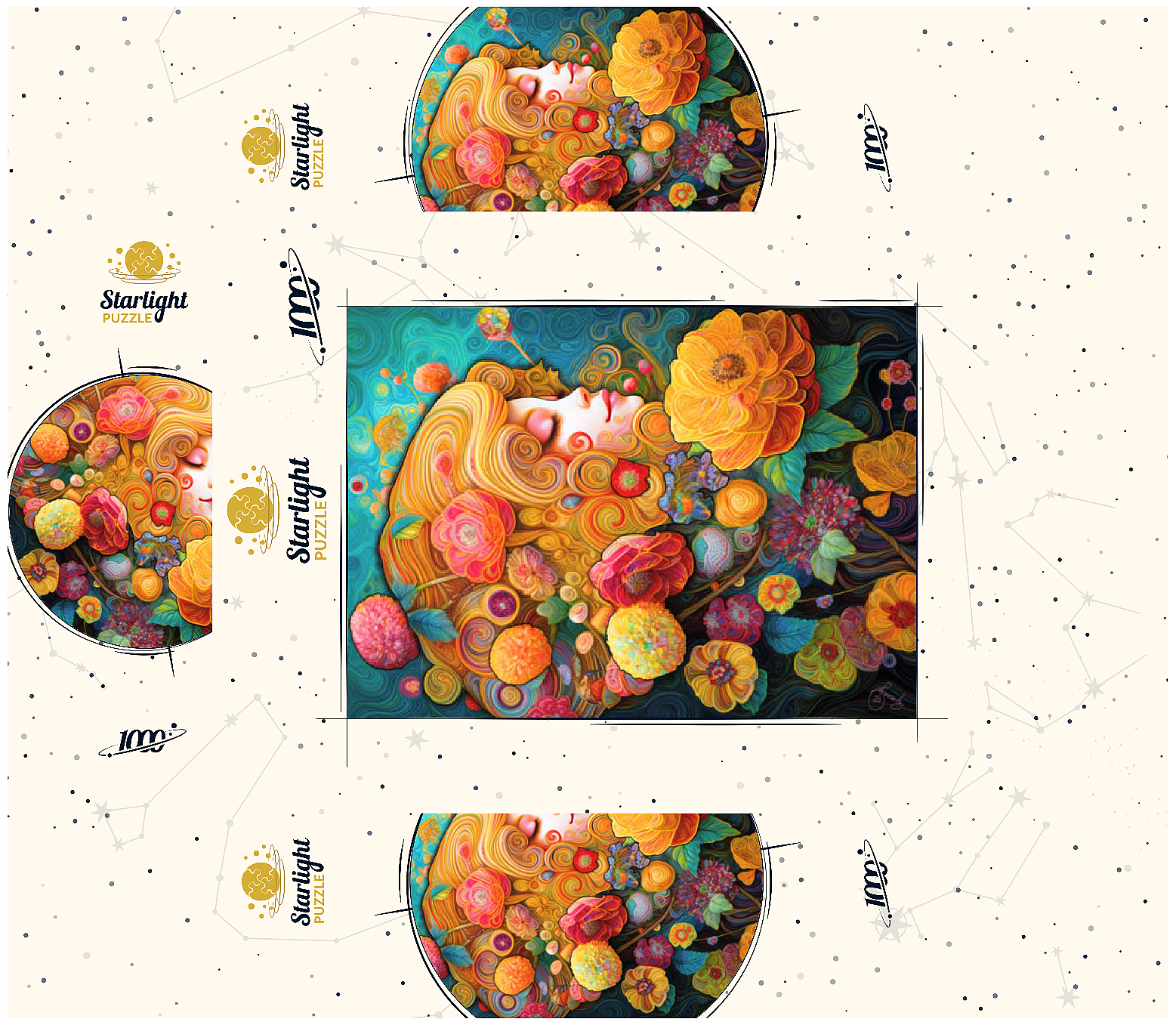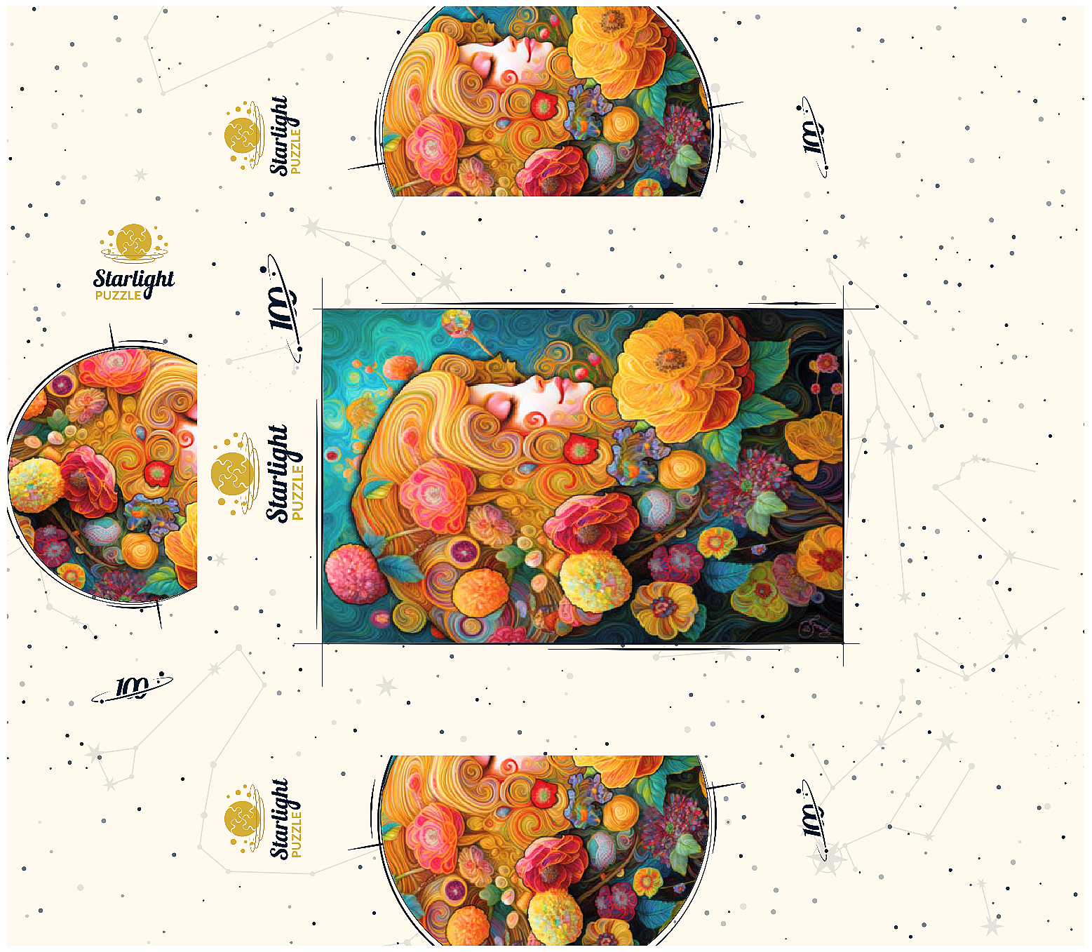 This mesmerizing artwork portrays a serene female profile immersed in an intricate swirl of golden curls and vibrant blossoms. the background is alive with fluid, spiraling patterns in blues and greens, contrasting the rich oranges, reds, and yellows of the flowers blooming from her hair. each detail, from delicate petals to ornamental curls, evokes a dreamlike connection to nature and imagination. with a tranquil expression and closed eyes, the subject embodies peace, inner beauty, and whimsical charm-capturing a magical fusion of fantasy and floral elegance.