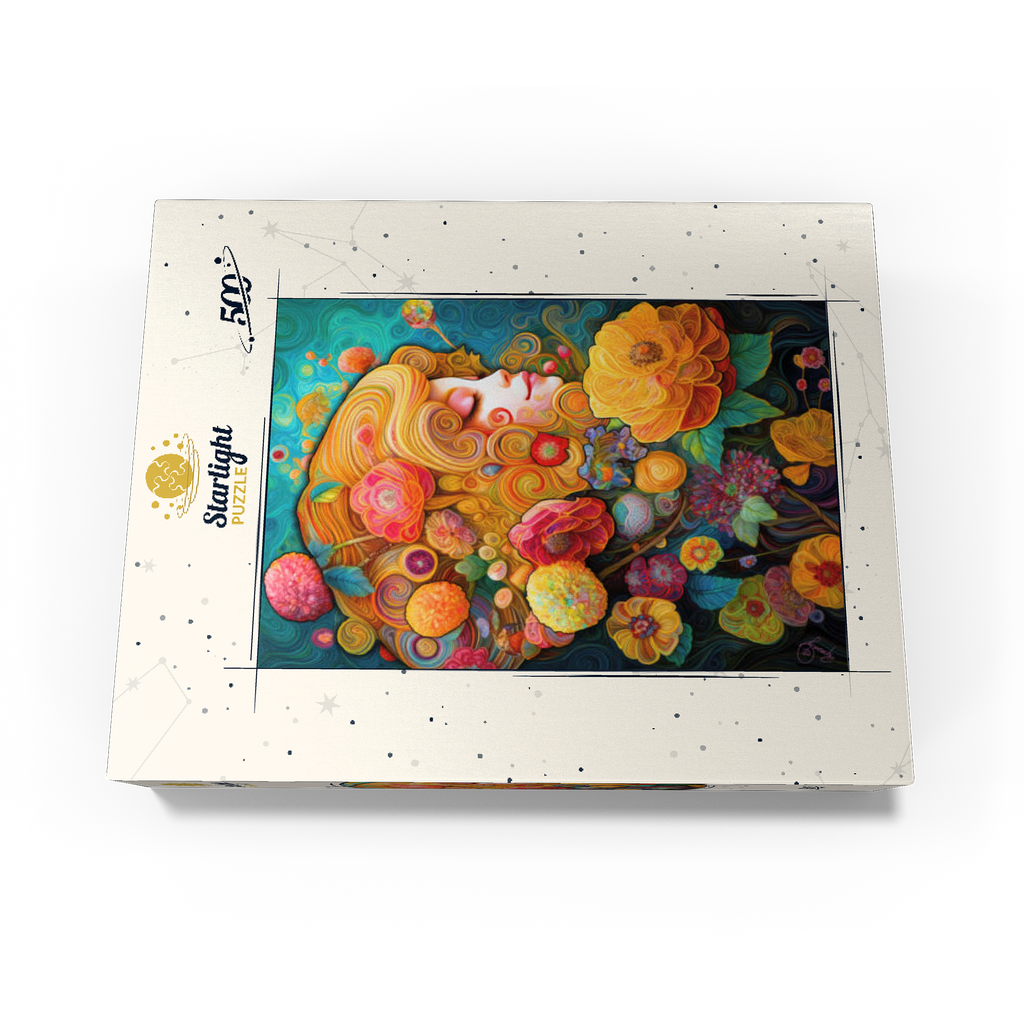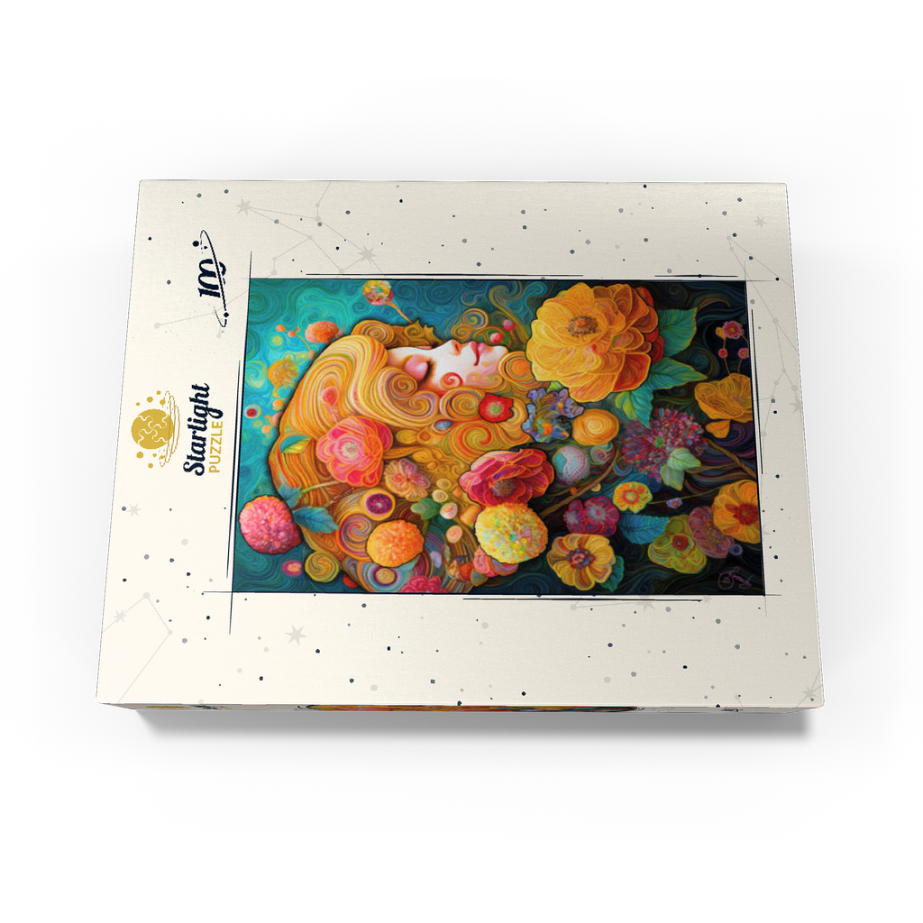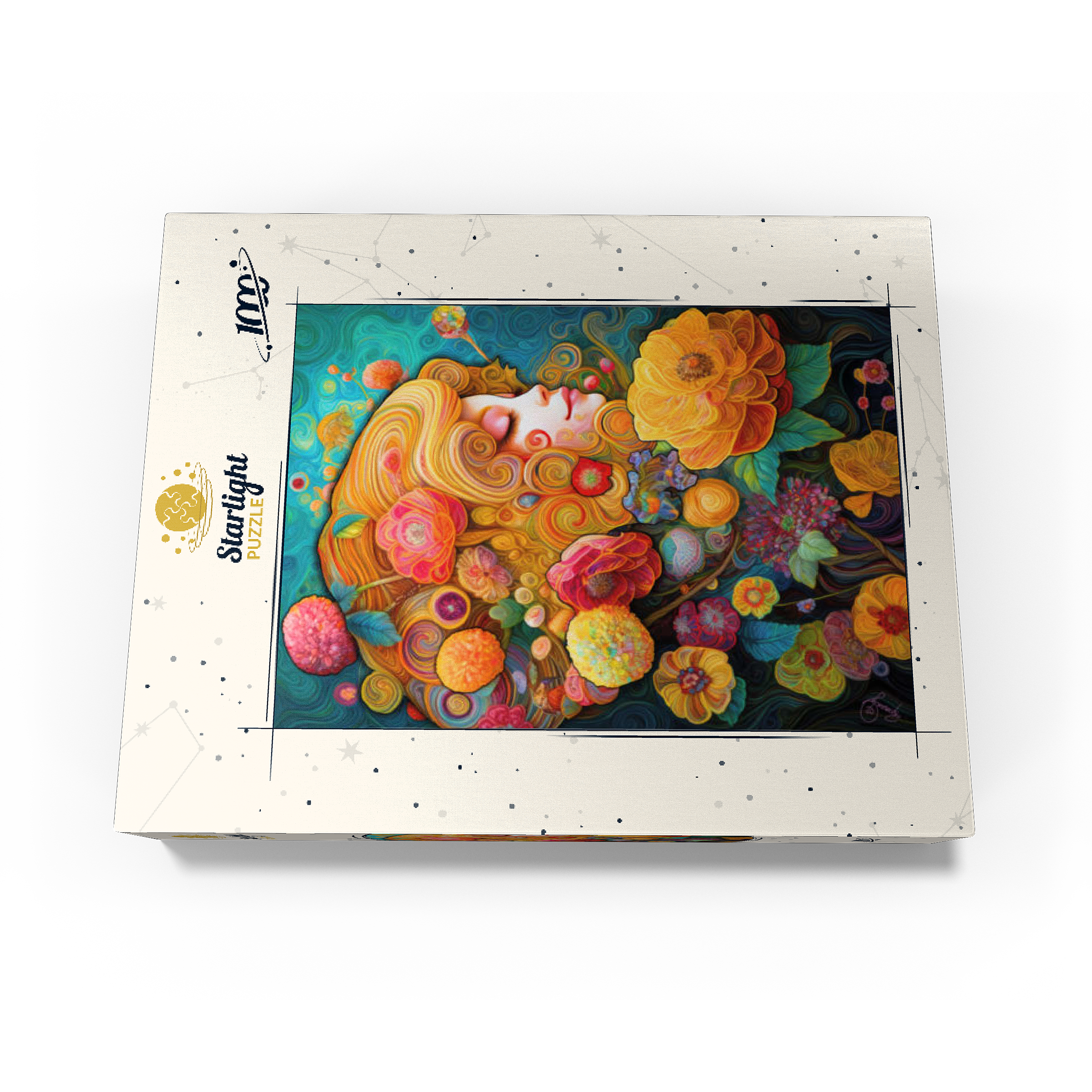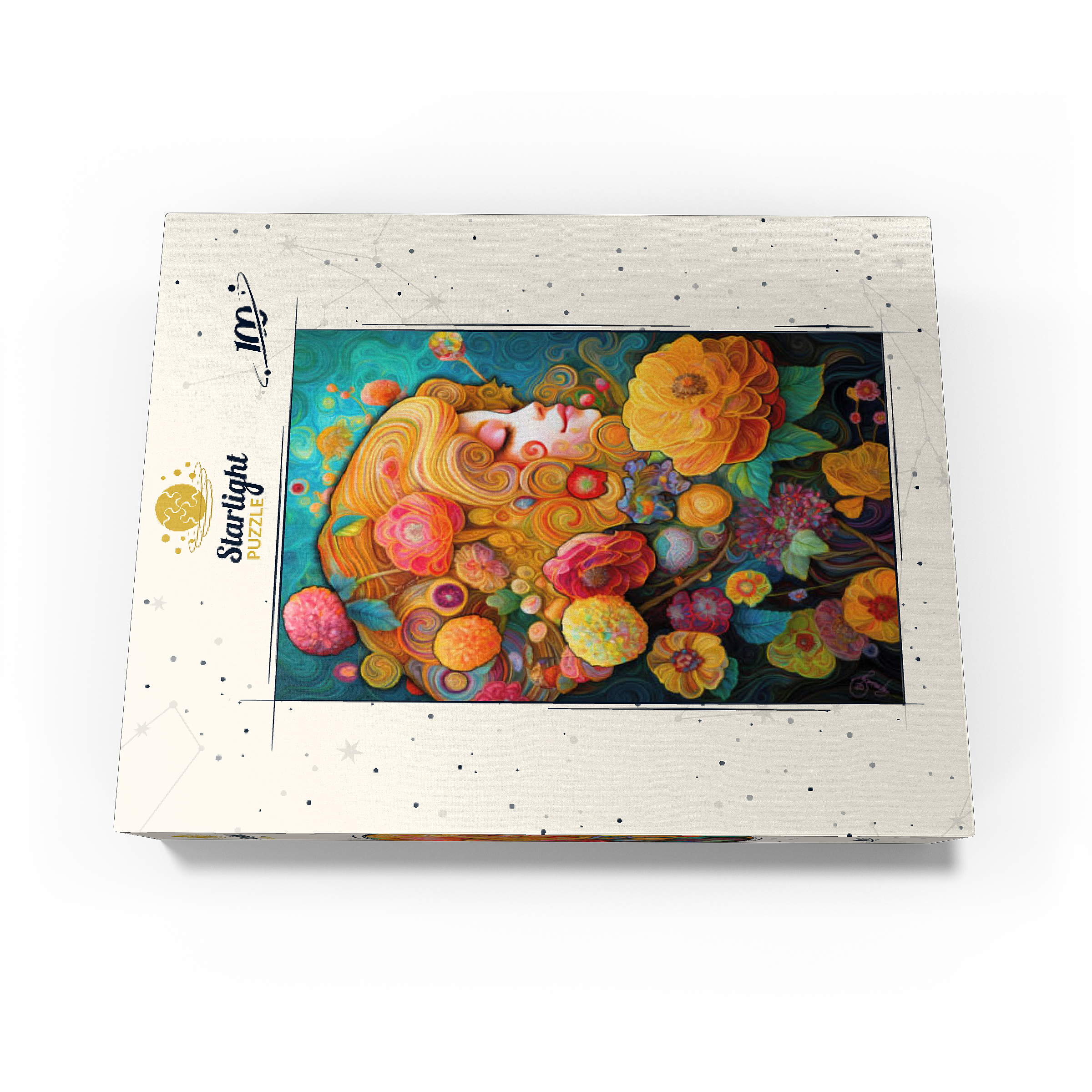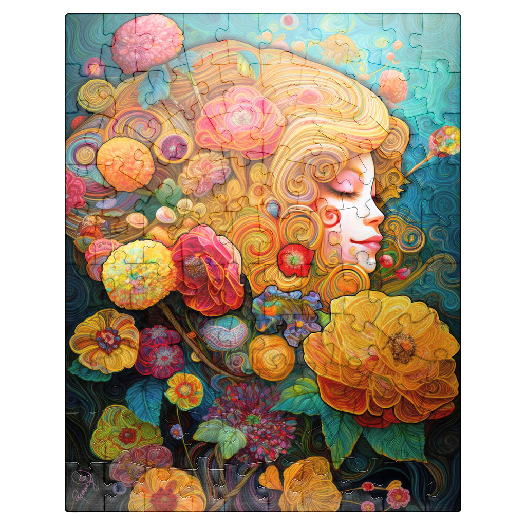 This mesmerizing artwork portrays a serene female profile immersed in an intricate swirl of golden curls and vibrant blossoms. the background is alive with fluid, spiraling patterns in blues and greens, contrasting the rich oranges, reds, and yellows of the flowers blooming from her hair. each detail, from delicate petals to ornamental curls, evokes a dreamlike connection to nature and imagination. with a tranquil expression and closed eyes, the subject embodies peace, inner beauty, and whimsical charm-capturing a magical fusion of fantasy and floral elegance.