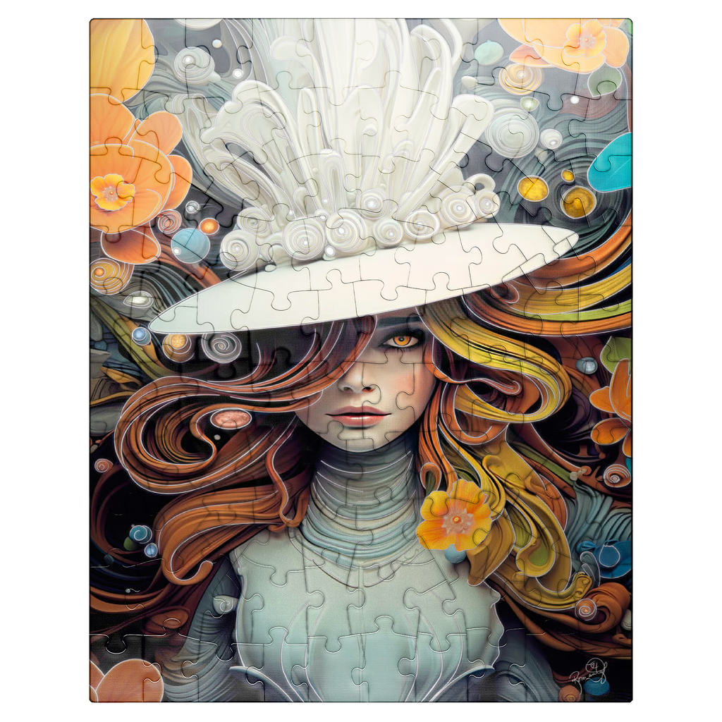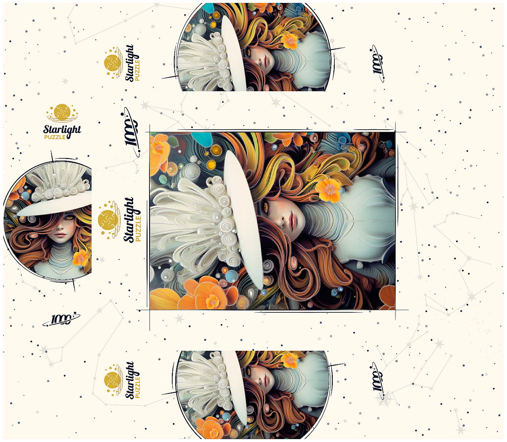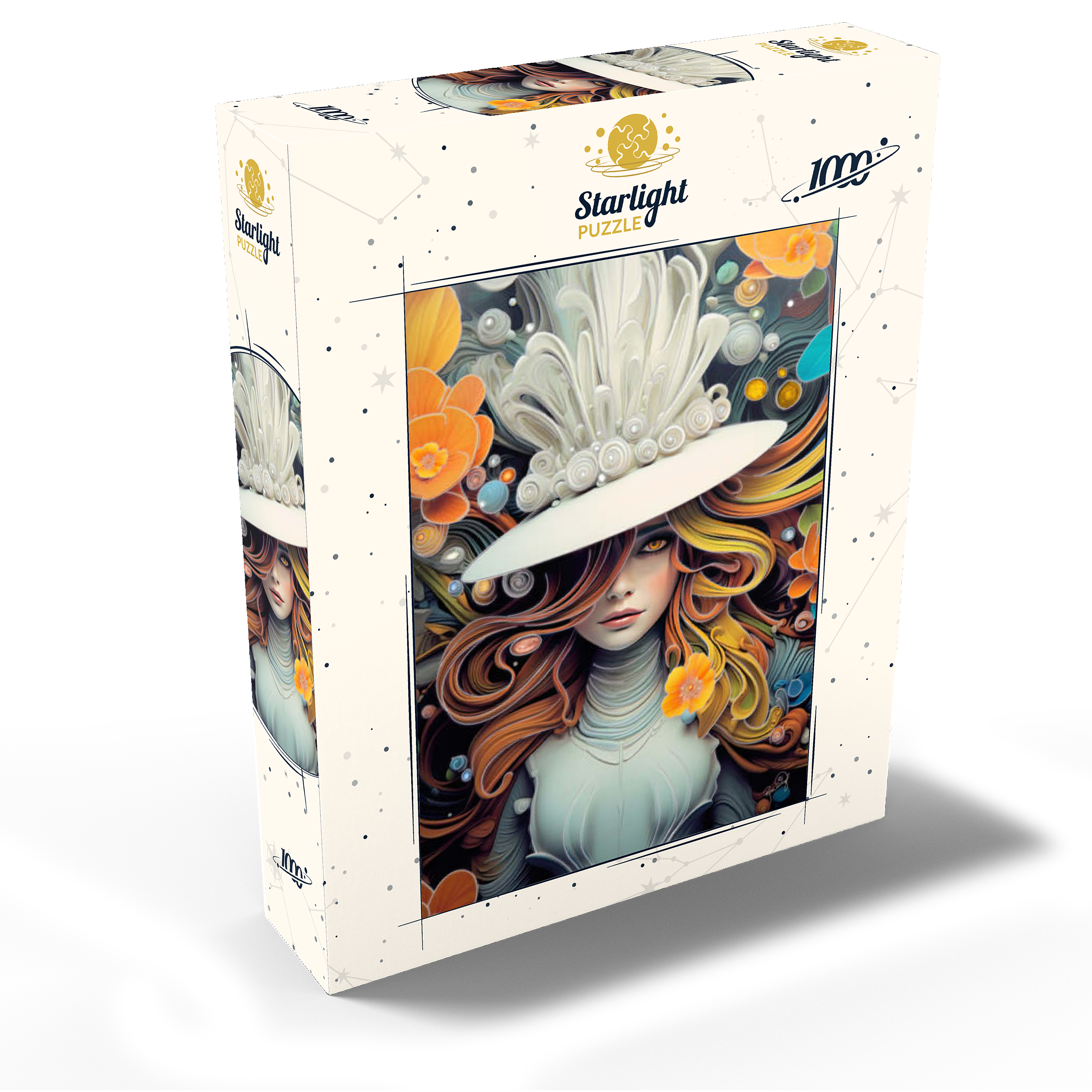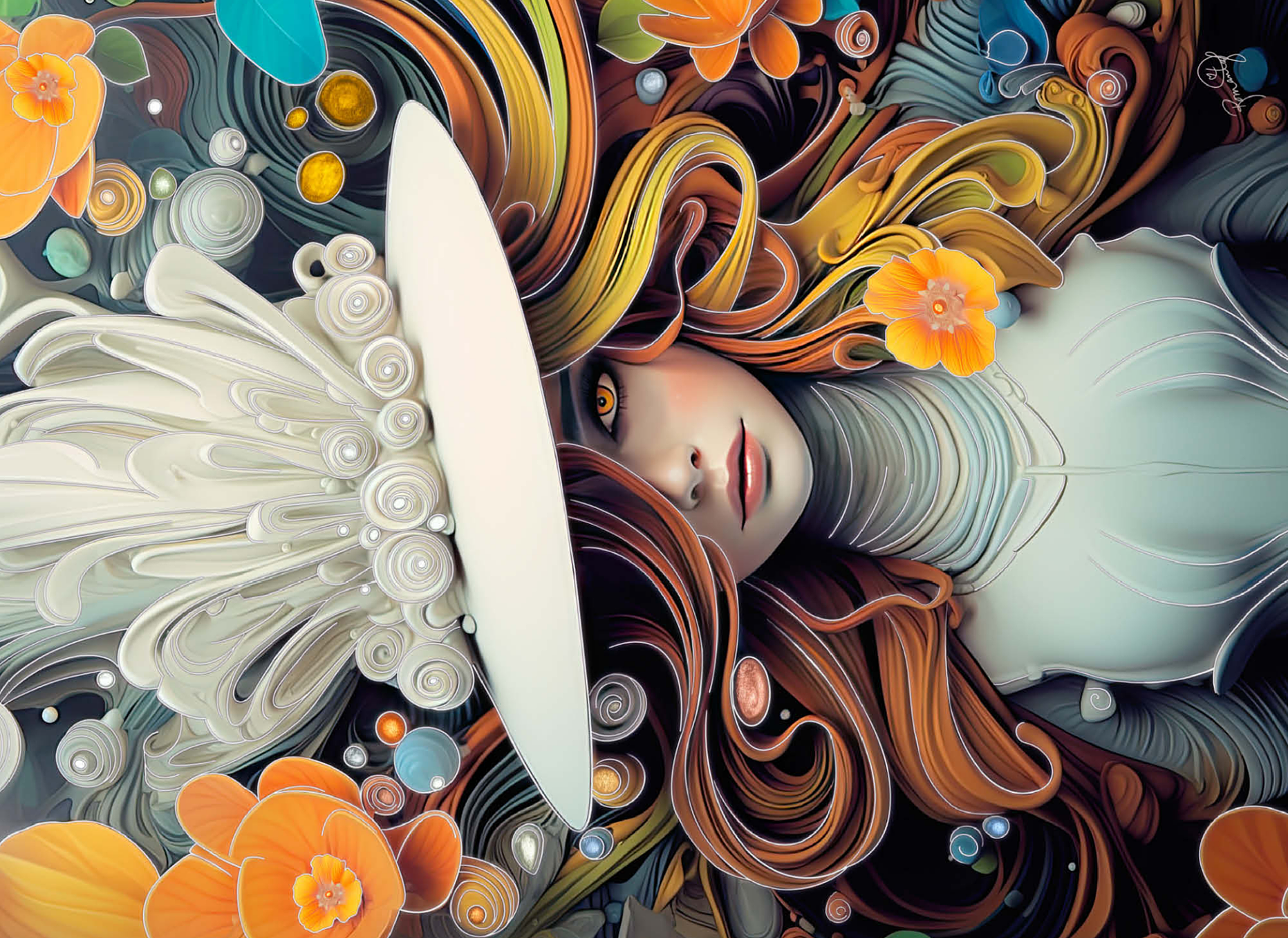 An enchanting digital artwork of a mysterious woman with piercing golden eyes, partially veiled by a grand white hat adorned with swirling feather-like elements. her flowing auburn and golden locks blend seamlessly with floral and abstract motifs that swirl around her. the color palette features rich creams, warm yellows, and soft oranges, creating a dreamlike, fantasy-inspired aesthetic. the piece merges elegance and surrealism, making it a striking visual that evokes wonder and sophistication.