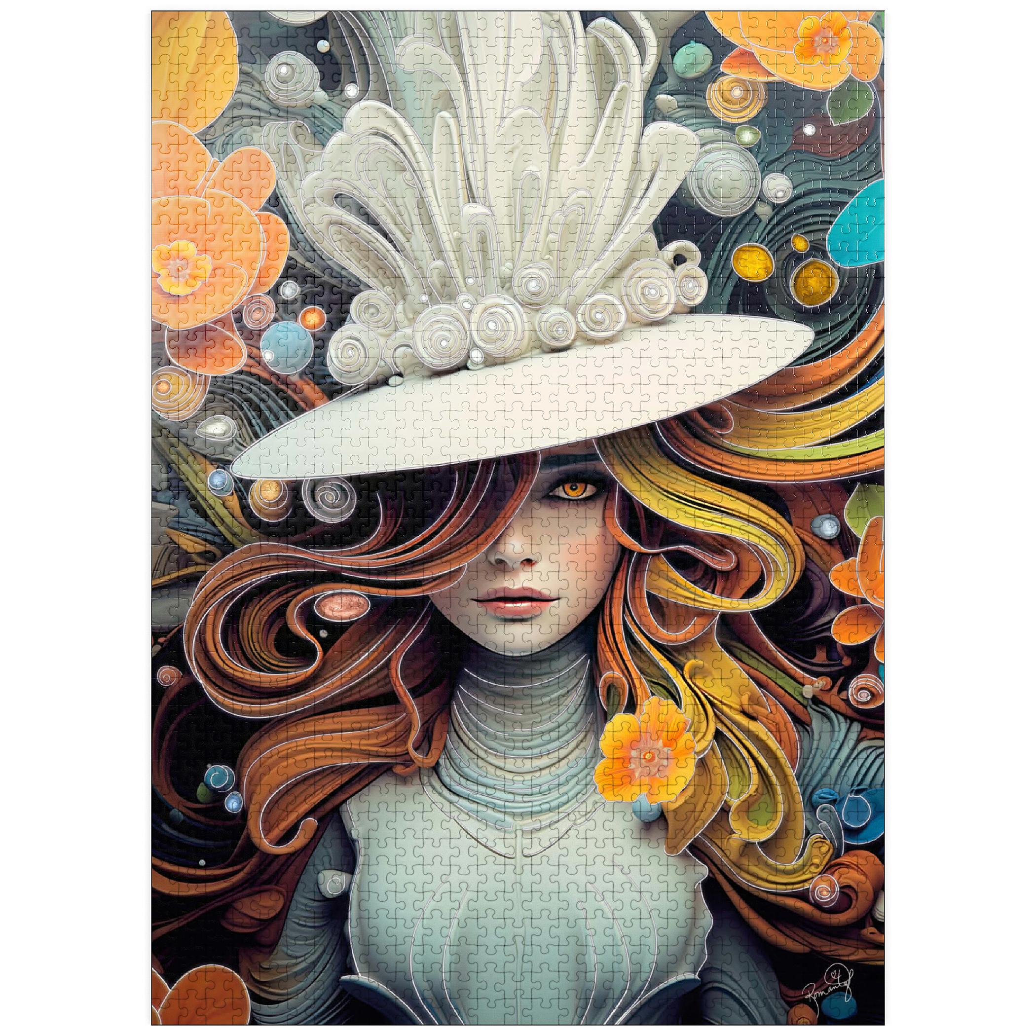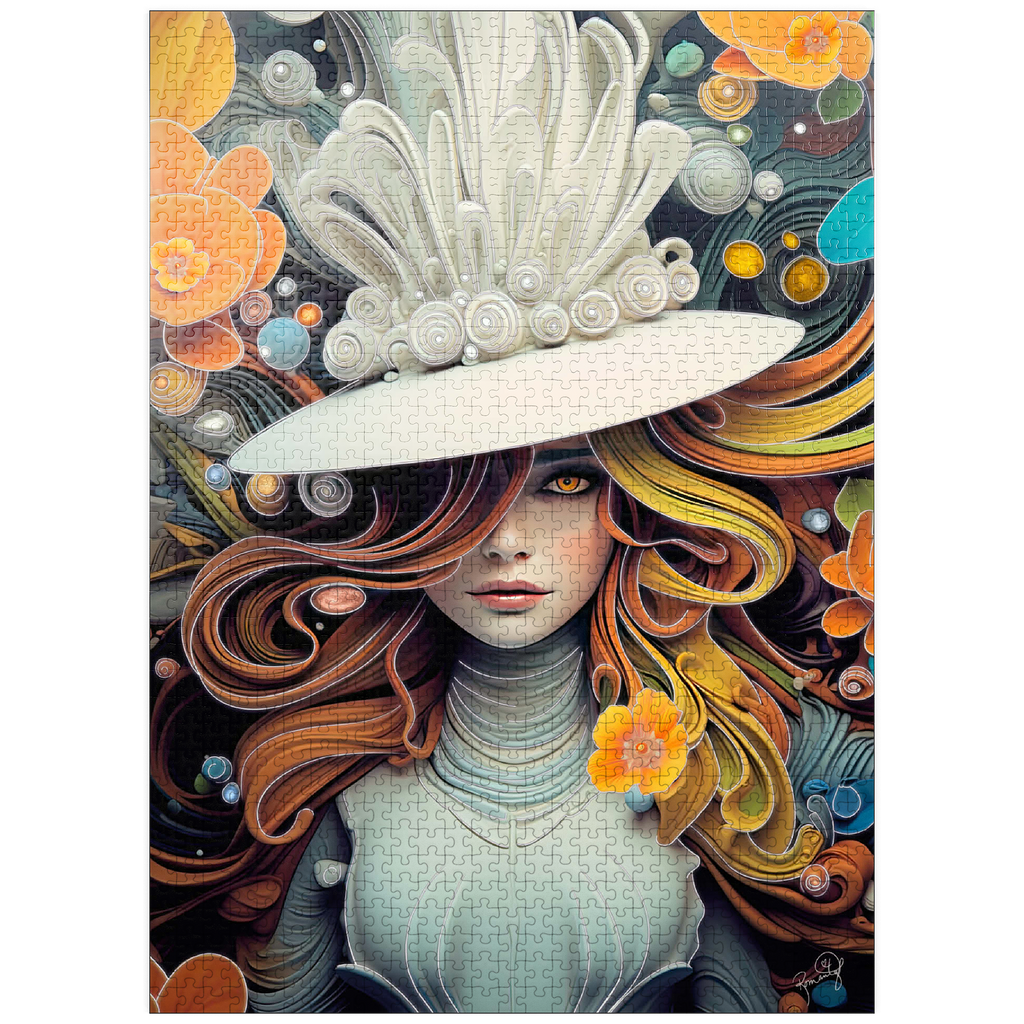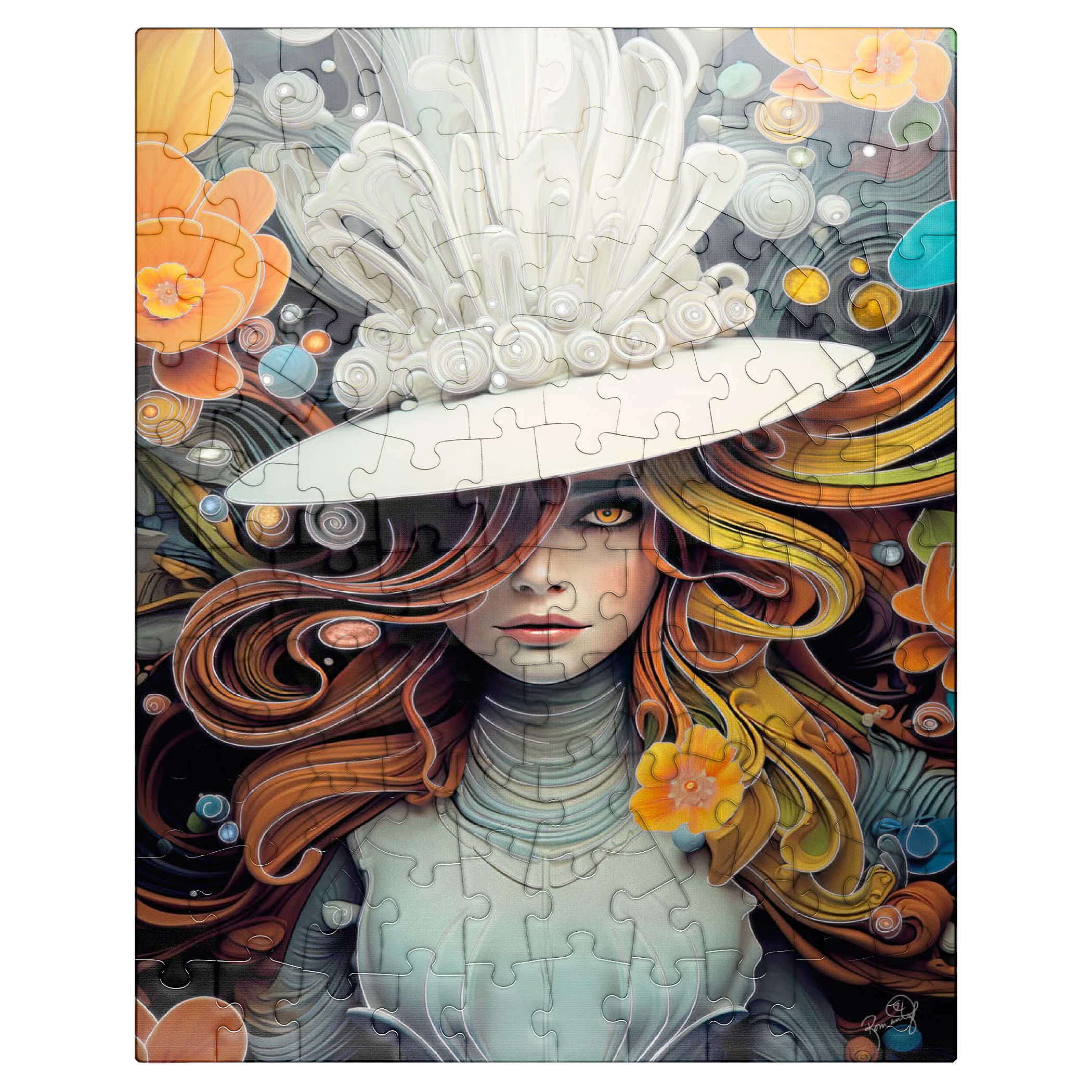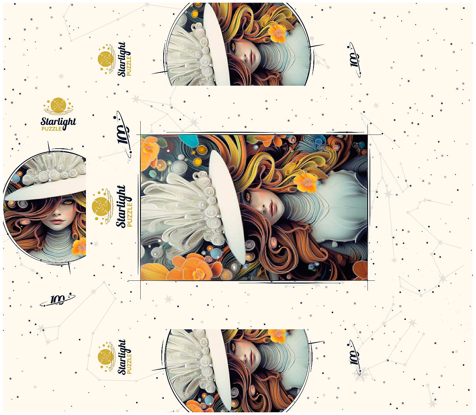 An enchanting digital artwork of a mysterious woman with piercing golden eyes, partially veiled by a grand white hat adorned with swirling feather-like elements. her flowing auburn and golden locks blend seamlessly with floral and abstract motifs that swirl around her. the color palette features rich creams, warm yellows, and soft oranges, creating a dreamlike, fantasy-inspired aesthetic. the piece merges elegance and surrealism, making it a striking visual that evokes wonder and sophistication.