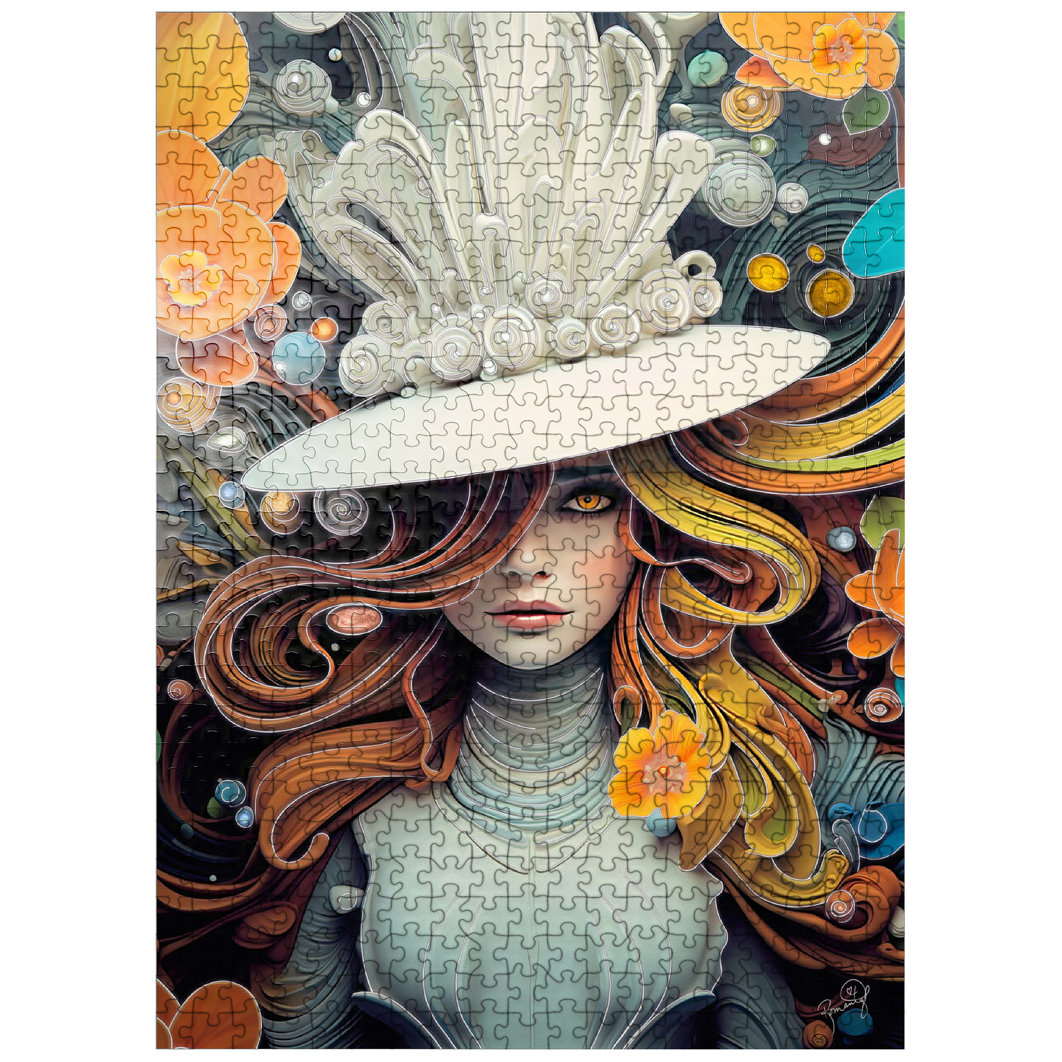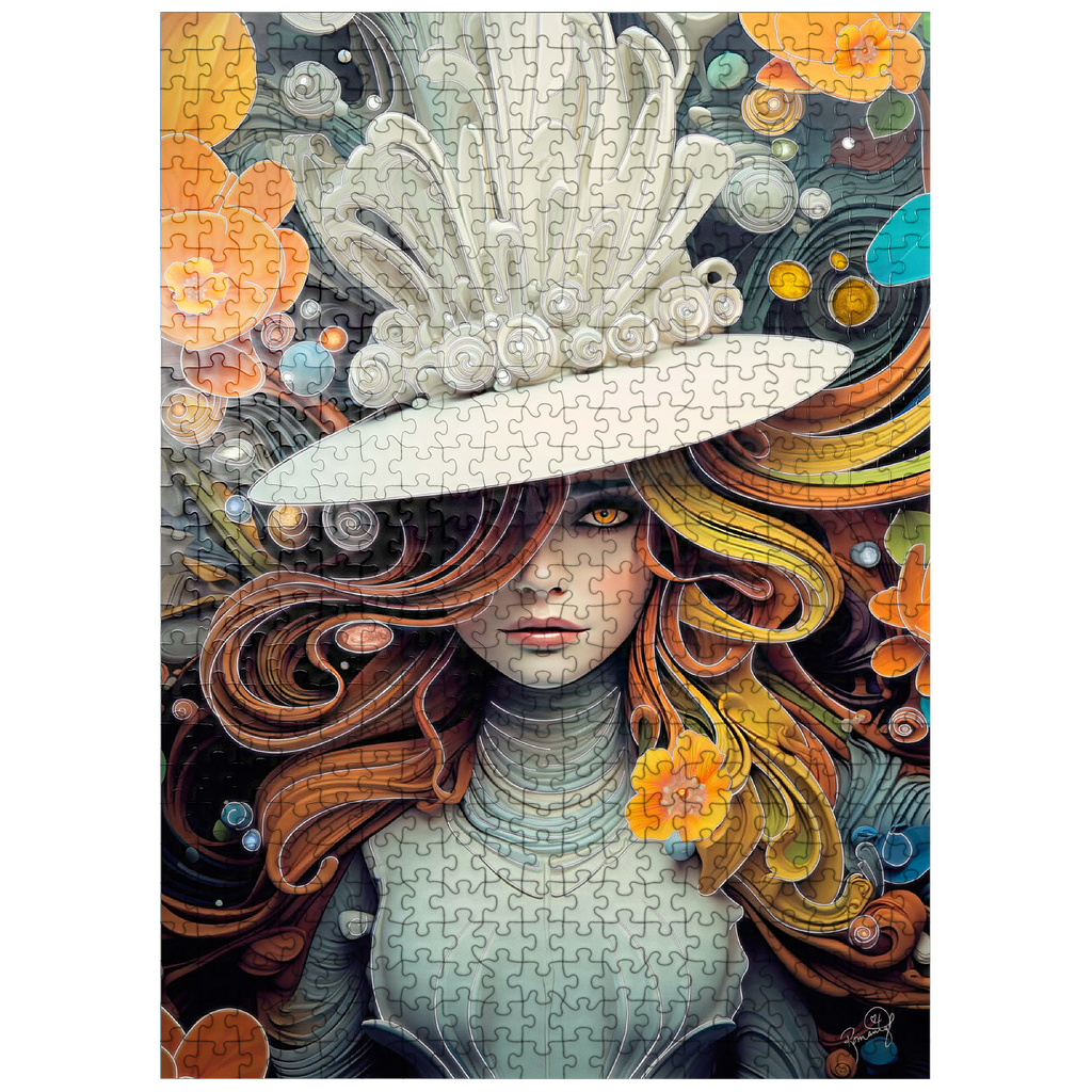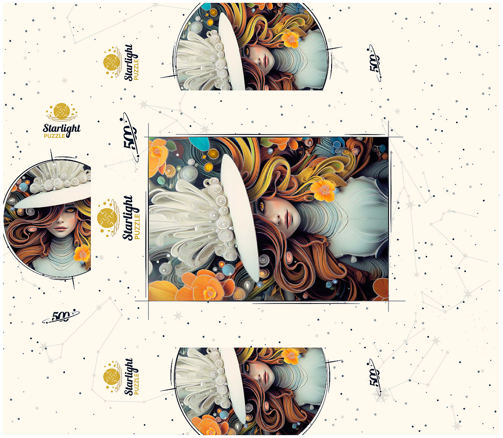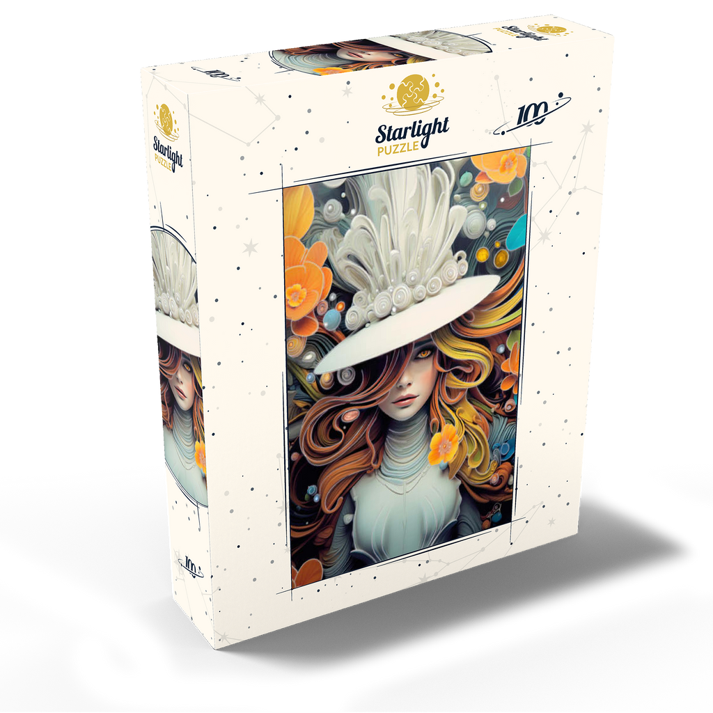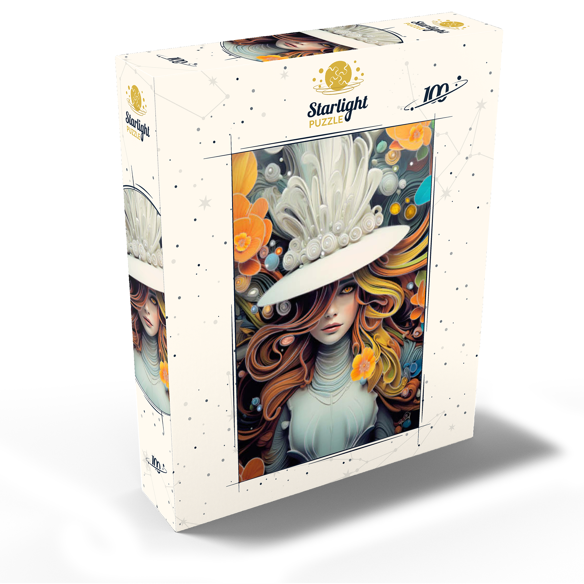 An enchanting digital artwork of a mysterious woman with piercing golden eyes, partially veiled by a grand white hat adorned with swirling feather-like elements. her flowing auburn and golden locks blend seamlessly with floral and abstract motifs that swirl around her. the color palette features rich creams, warm yellows, and soft oranges, creating a dreamlike, fantasy-inspired aesthetic. the piece merges elegance and surrealism, making it a striking visual that evokes wonder and sophistication.