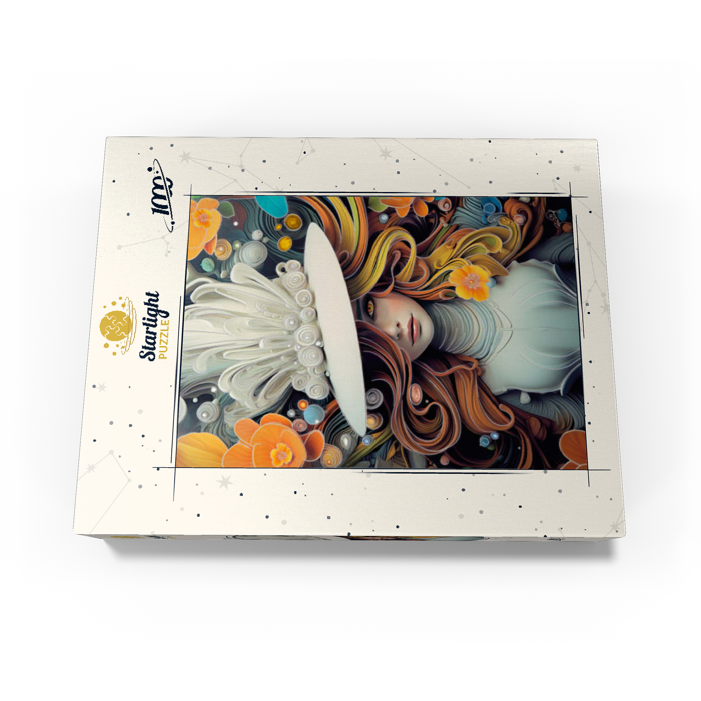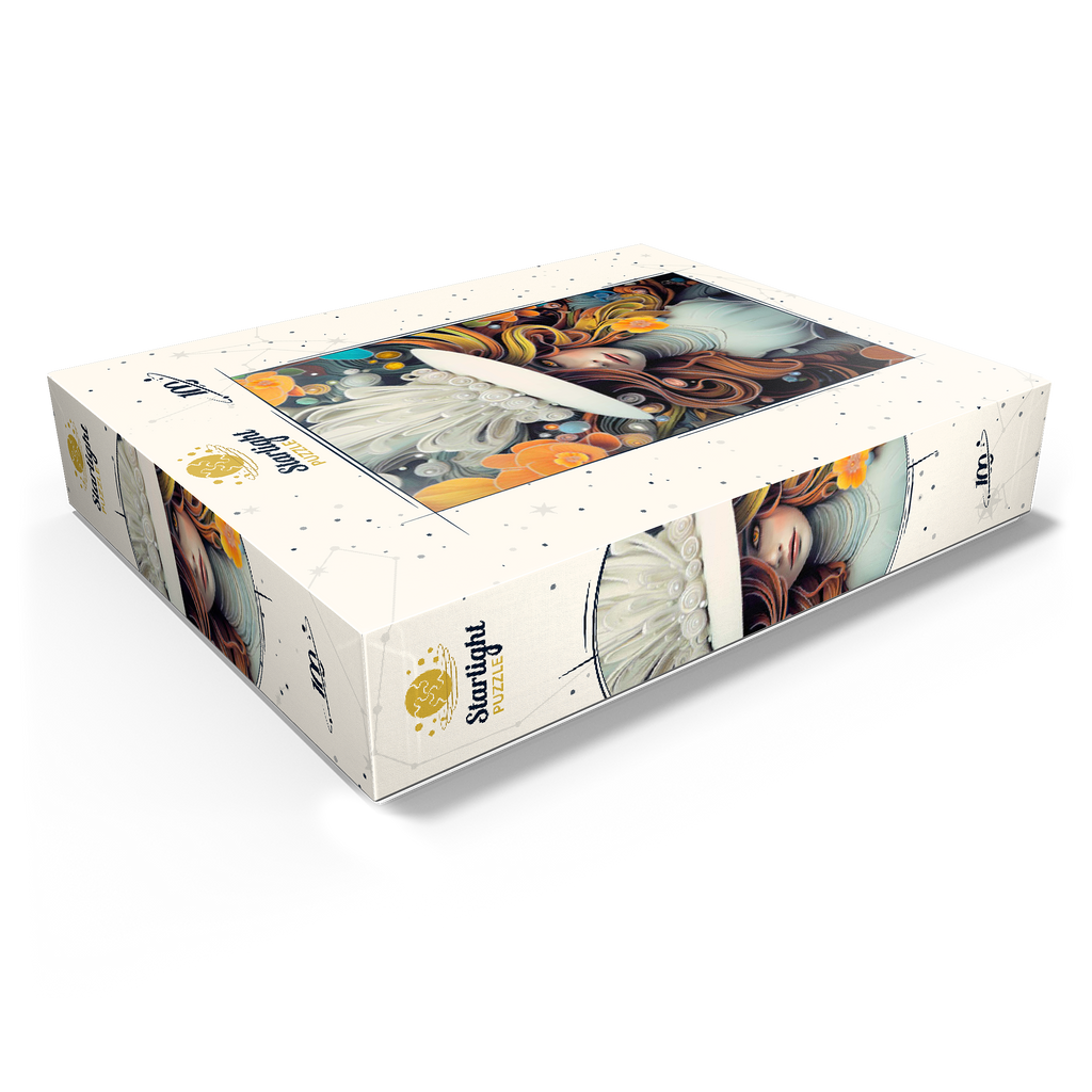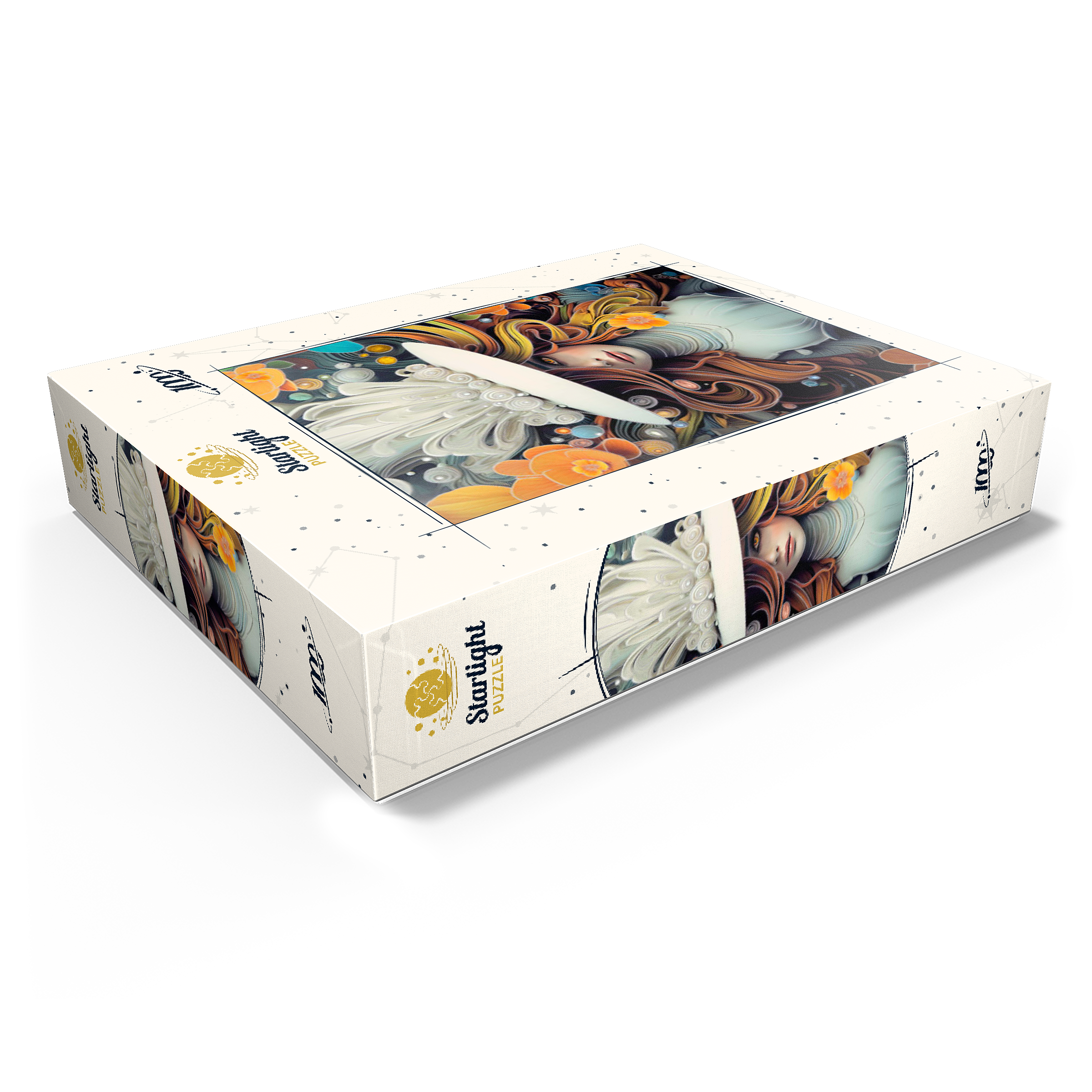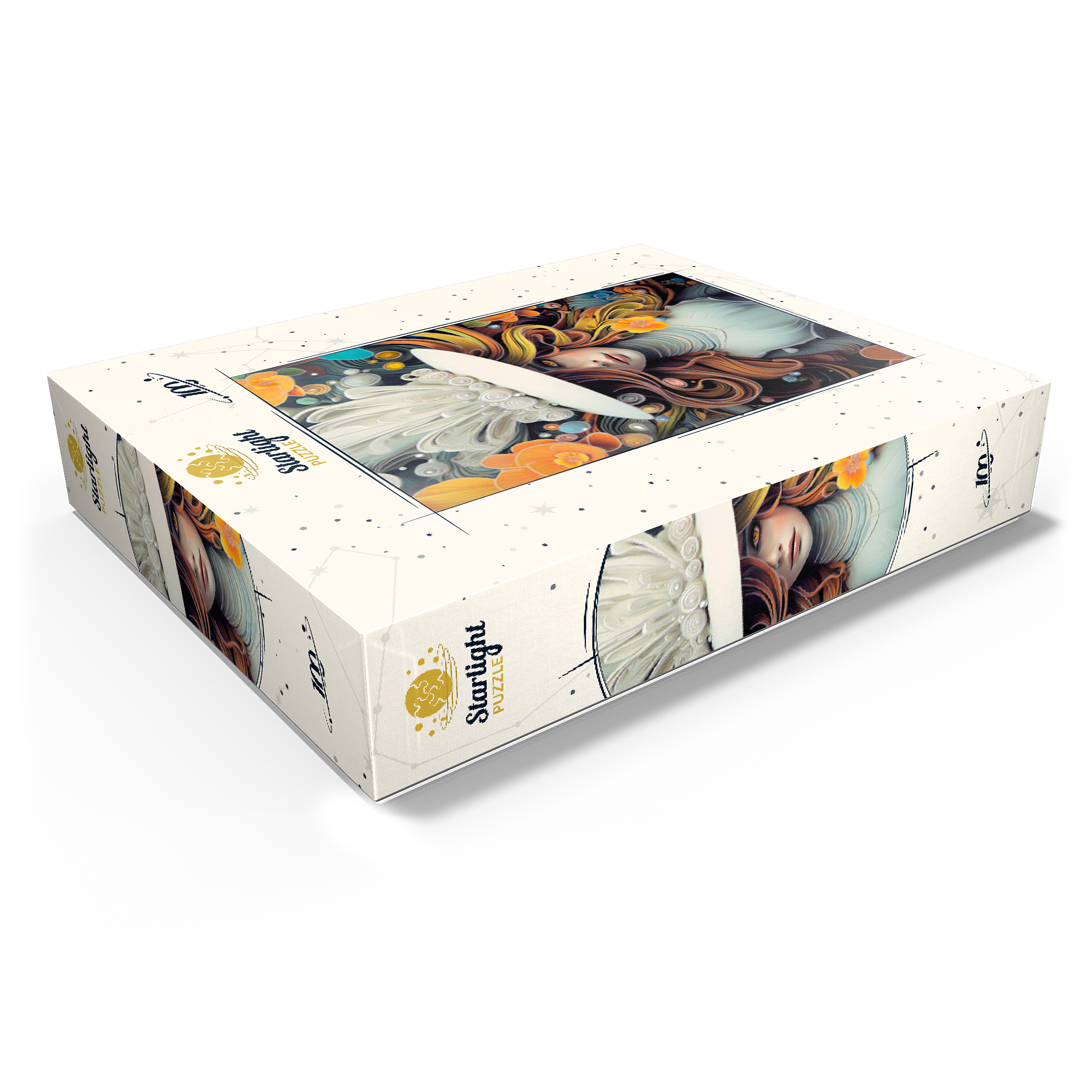 An enchanting digital artwork of a mysterious woman with piercing golden eyes, partially veiled by a grand white hat adorned with swirling feather-like elements. her flowing auburn and golden locks blend seamlessly with floral and abstract motifs that swirl around her. the color palette features rich creams, warm yellows, and soft oranges, creating a dreamlike, fantasy-inspired aesthetic. the piece merges elegance and surrealism, making it a striking visual that evokes wonder and sophistication.
