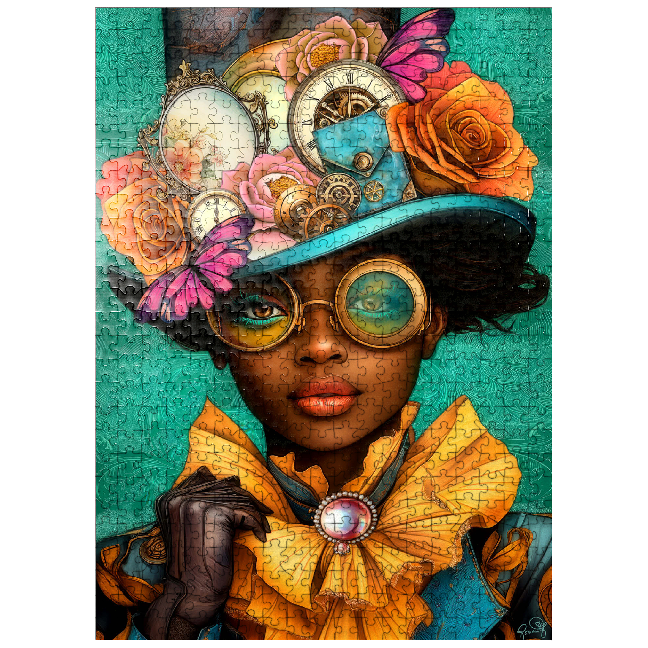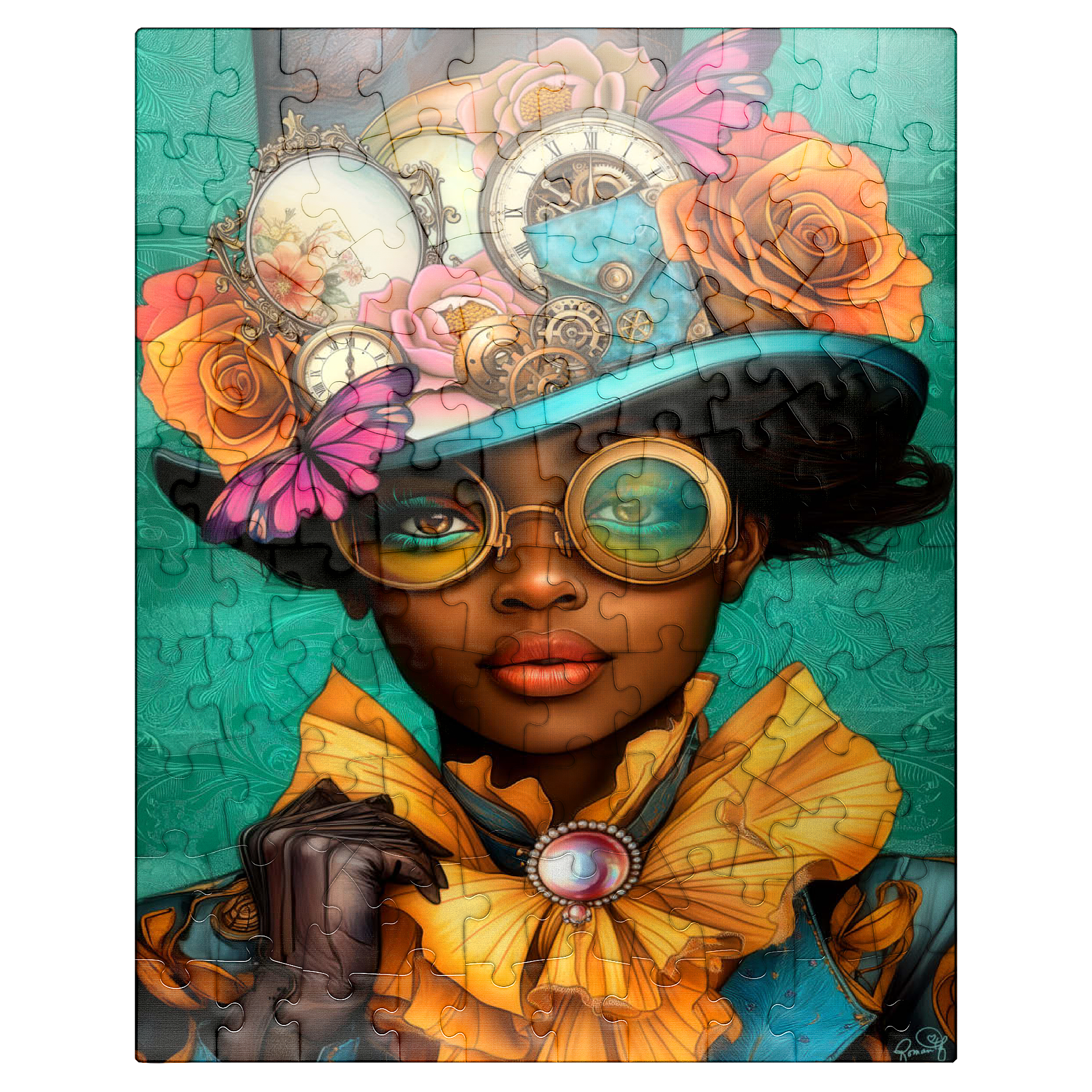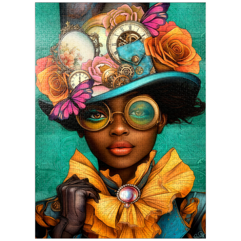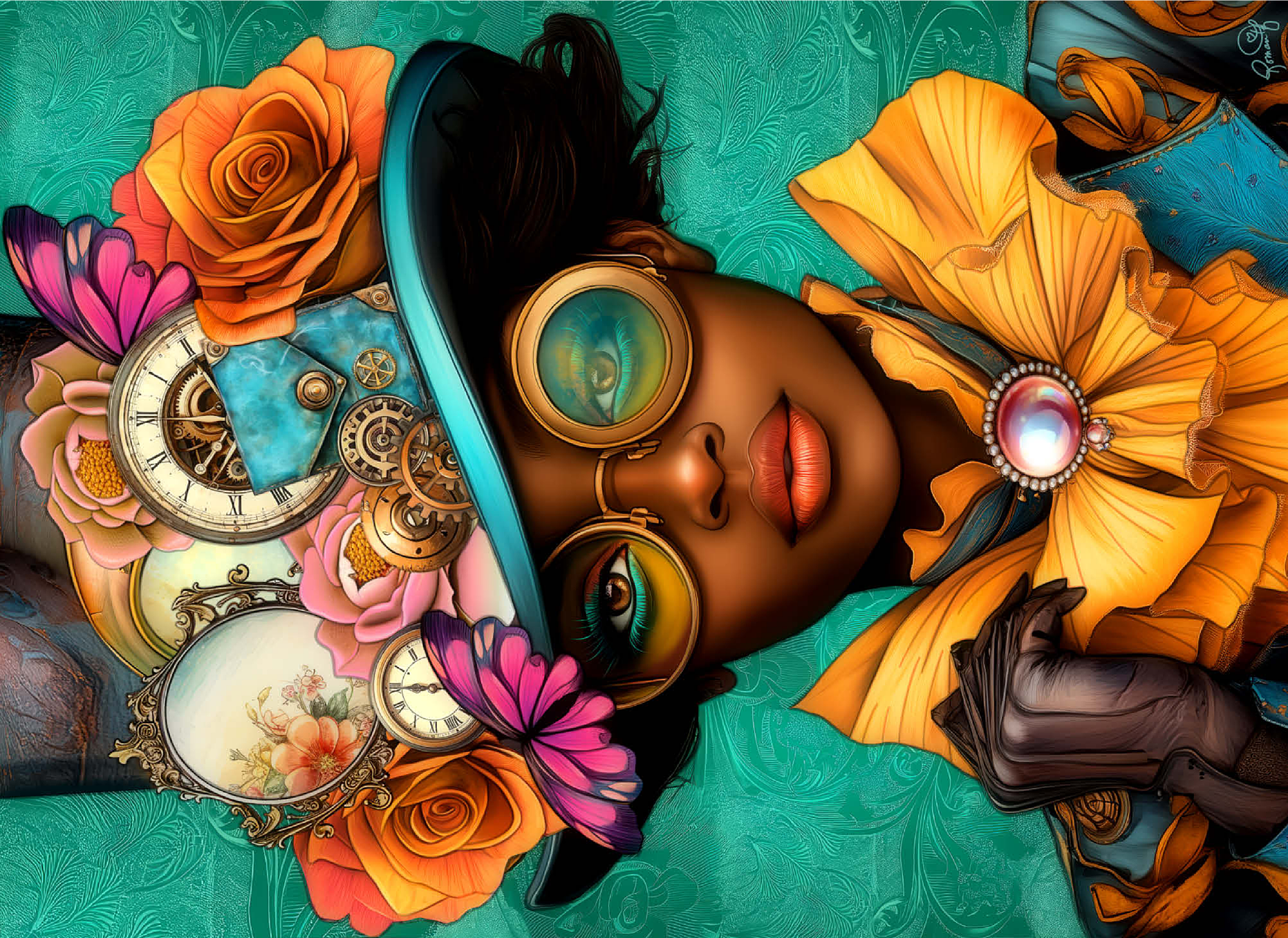 A striking steampunk-inspired digital artwork featuring a confident woman adorned in a vibrant turquoise hat embellished with intricate gears, vintage clocks, and delicate flowers in shades of orange, pink, and gold. Her bold, yellow-tinted goggles and matching golden ruffled collar add a dramatic flair, while the elegant pearl brooch enhances the Victorian aesthetic. The teal background with ornate patterns complements the vibrant tones and steampunk elements. This detailed artwork is perfect for fans of steampunk fashion, fantasy portraits, and retro-futuristic themes. An excellent choice for wall art, design inspiration, or adding a unique statement piece to any collection.