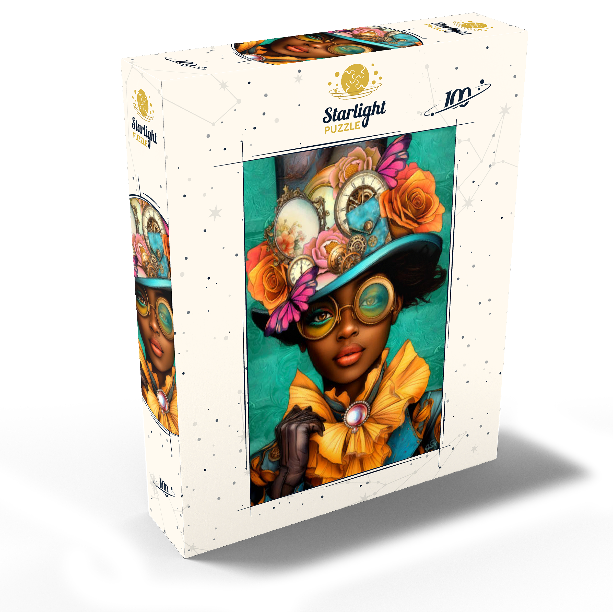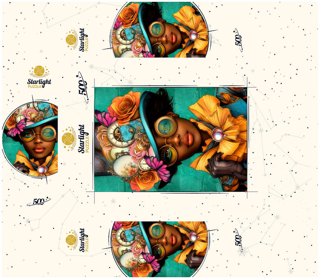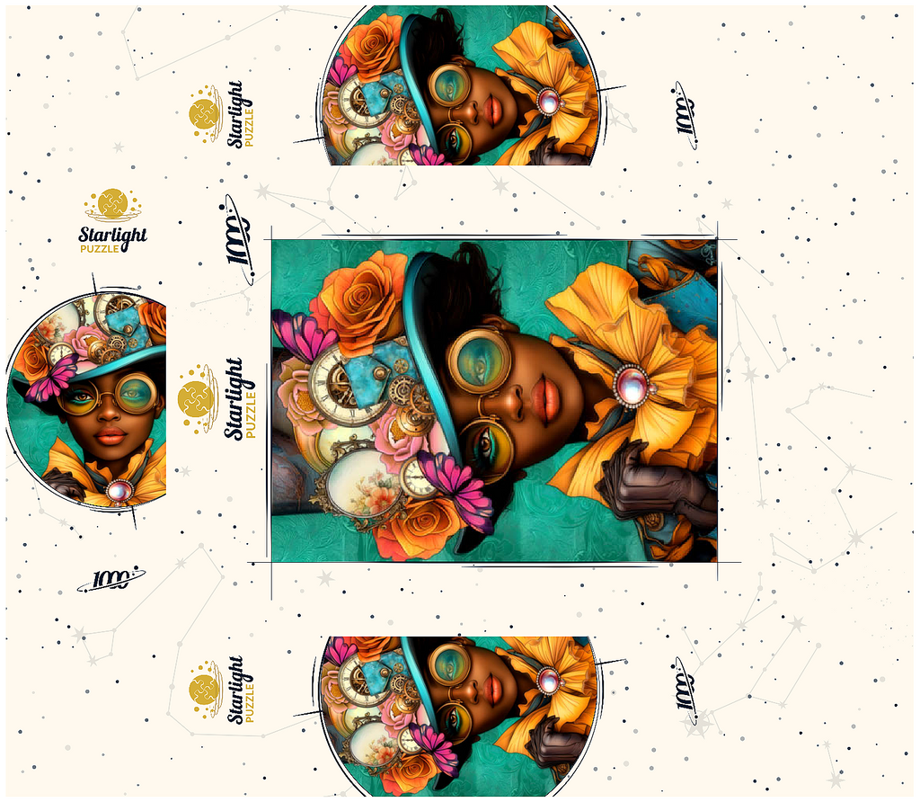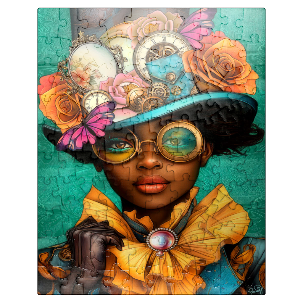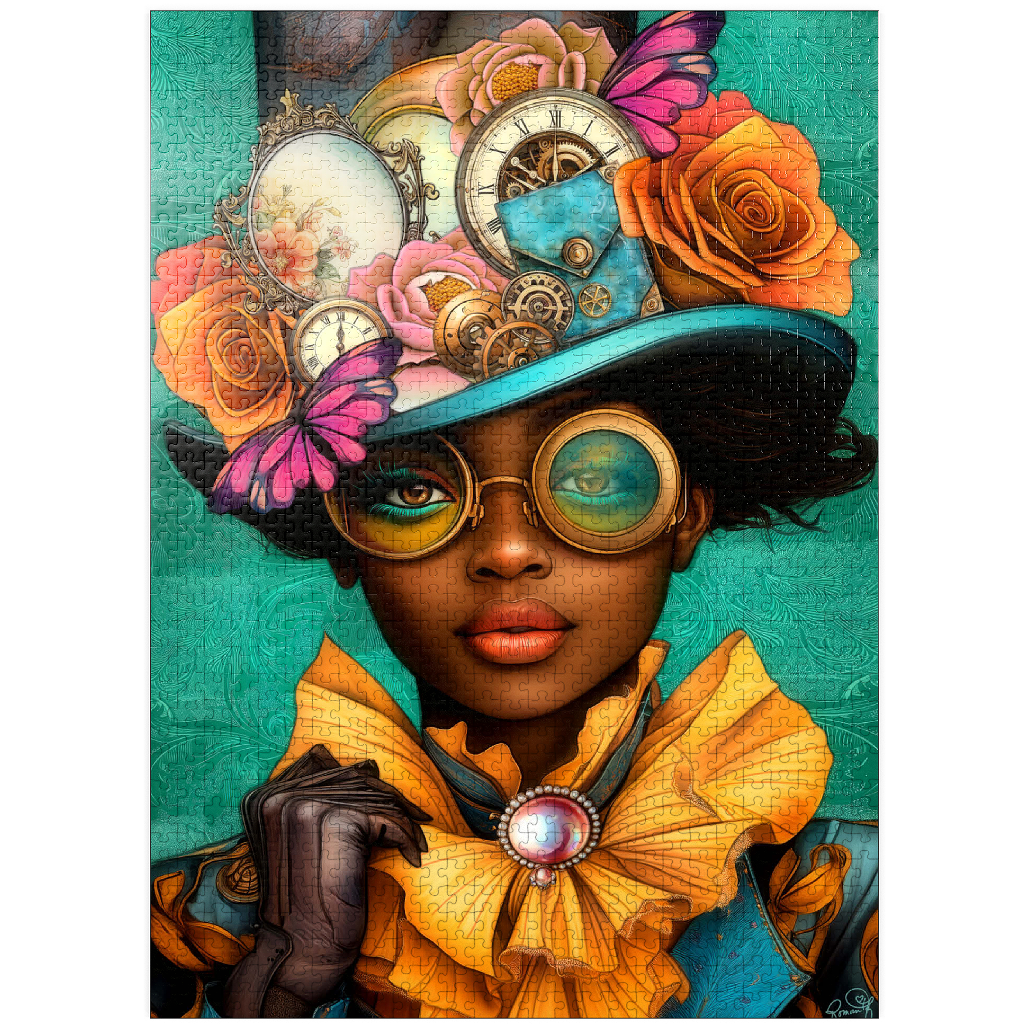 A striking steampunk-inspired digital artwork featuring a confident woman adorned in a vibrant turquoise hat embellished with intricate gears, vintage clocks, and delicate flowers in shades of orange, pink, and gold. Her bold, yellow-tinted goggles and matching golden ruffled collar add a dramatic flair, while the elegant pearl brooch enhances the Victorian aesthetic. The teal background with ornate patterns complements the vibrant tones and steampunk elements. This detailed artwork is perfect for fans of steampunk fashion, fantasy portraits, and retro-futuristic themes. An excellent choice for wall art, design inspiration, or adding a unique statement piece to any collection.