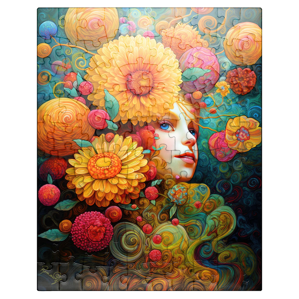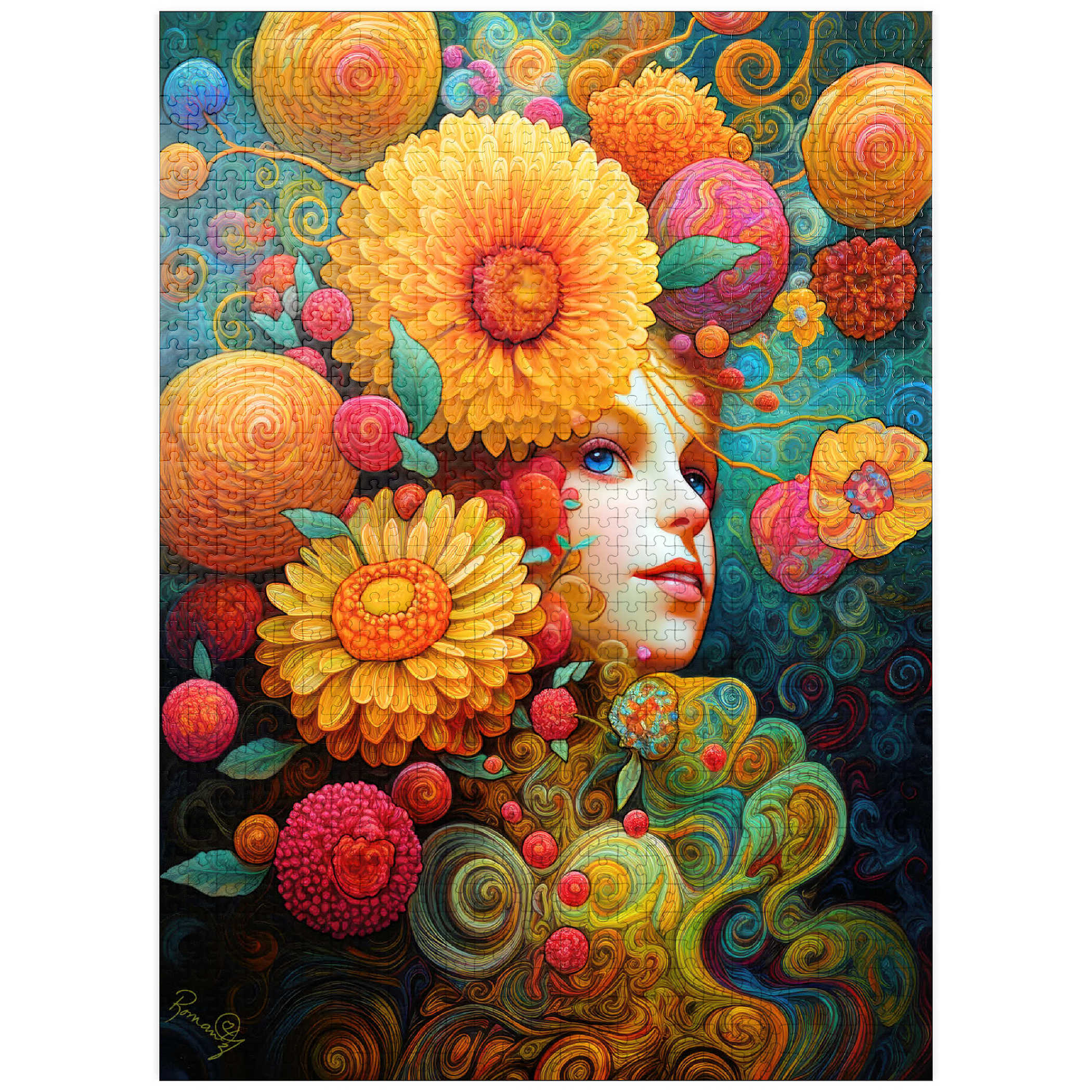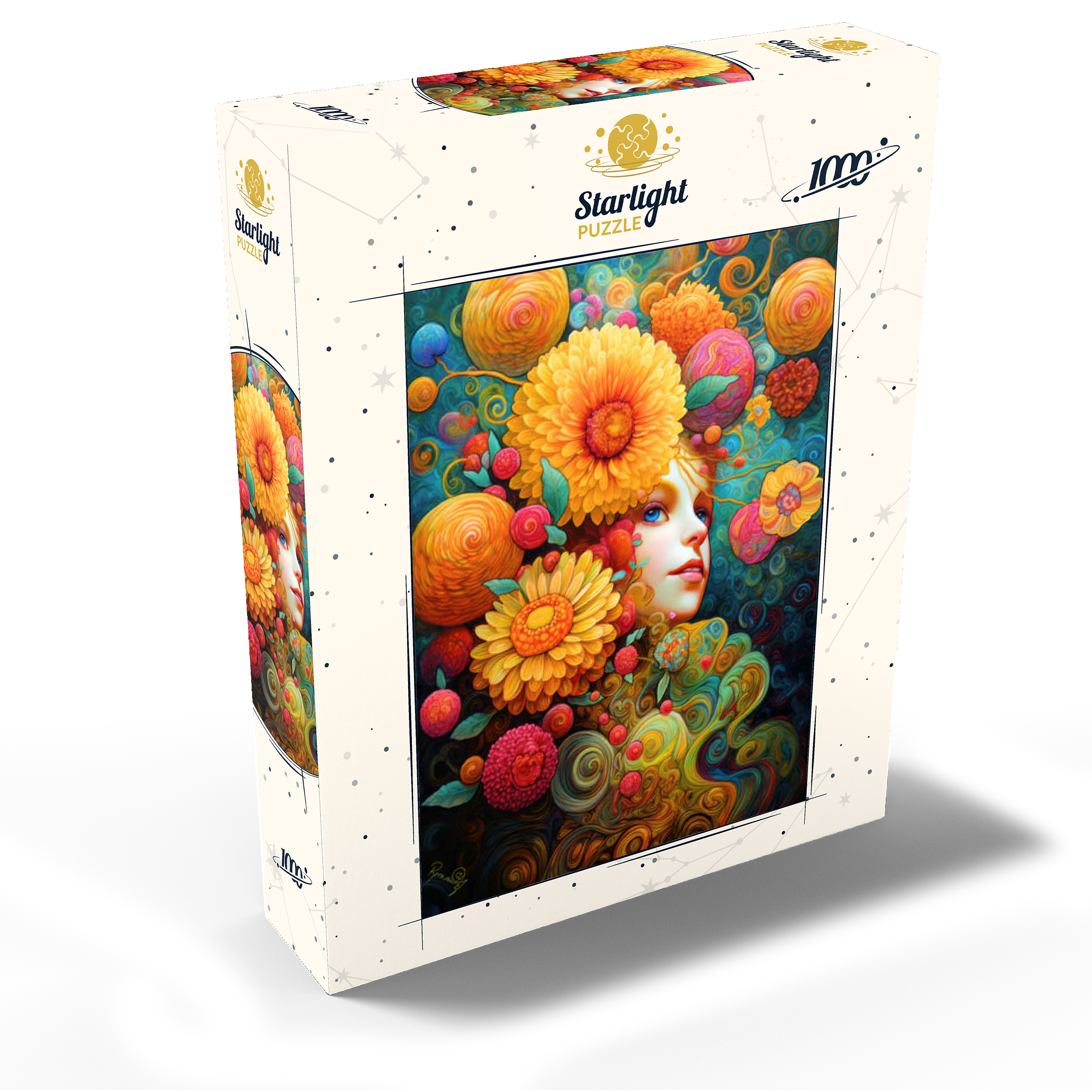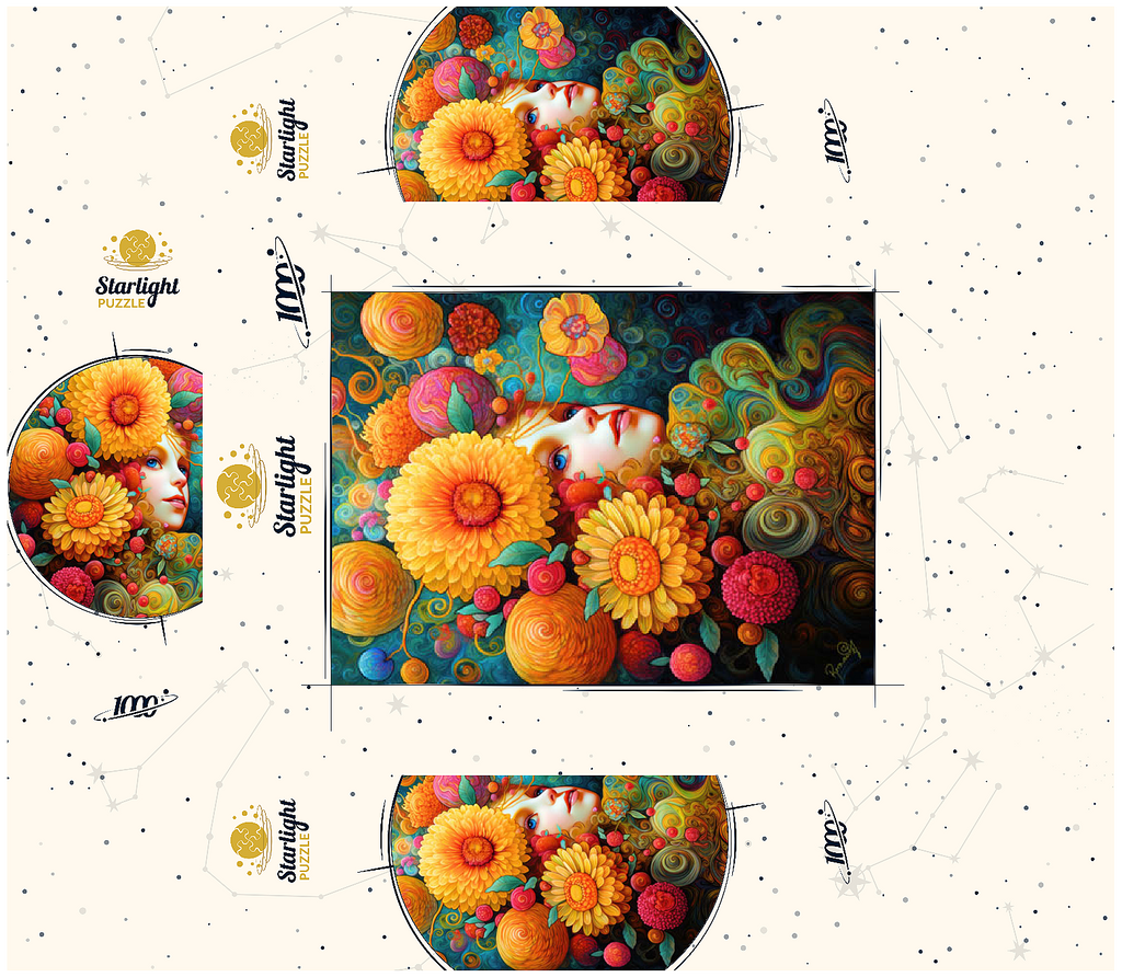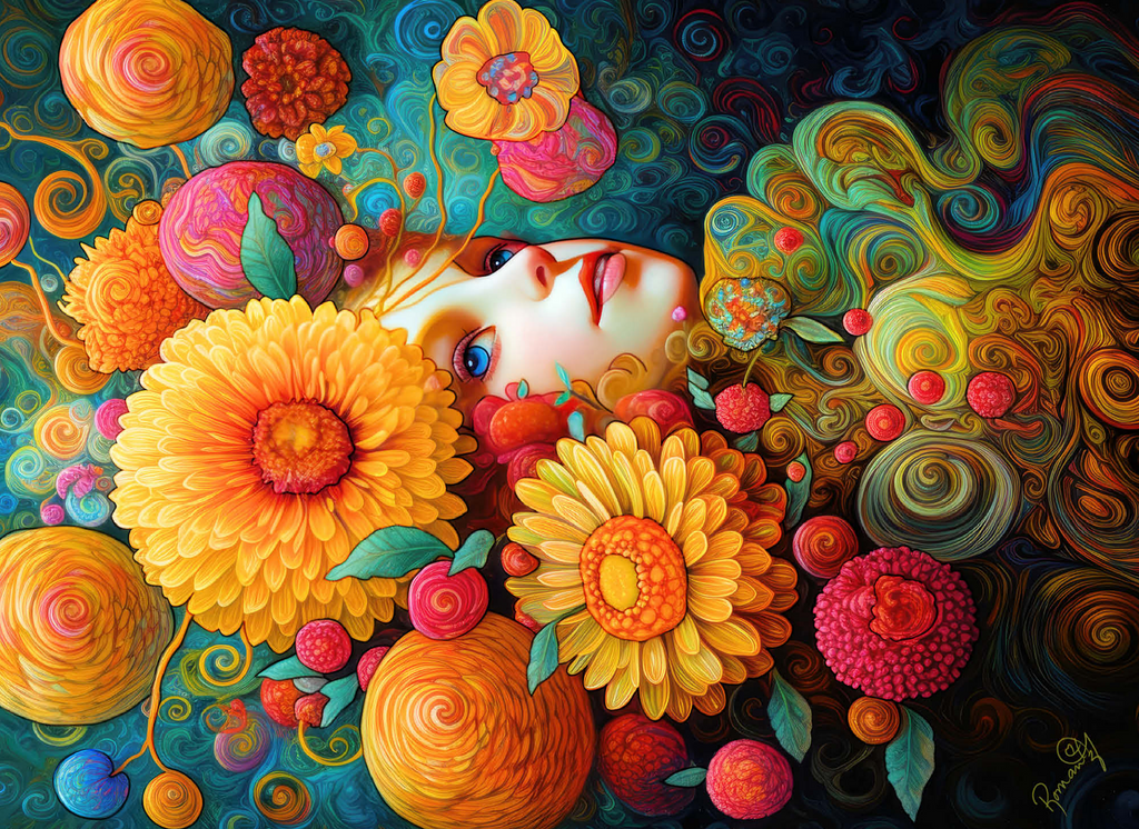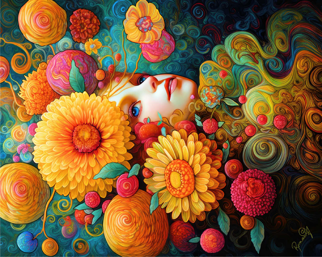 This radiant artwork showcases a dreamy female face enveloped by an explosion of golden-yellow flowers, swirling botanical patterns, and vibrant fruits. The woman's expressive blue eyes and soft features bring a gentle serenity to the otherwise energetic composition. Lush swirls of rich colors-turquoise, emerald, crimson, and coral-create a dynamic, whimsical atmosphere. The large sunflower-like blooms and raspberry orbs add a fantasy-garden feel, making the piece both uplifting and visually captivating. A harmonious blend of nature and surrealism, the scene evokes joy, imagination, and warmth.