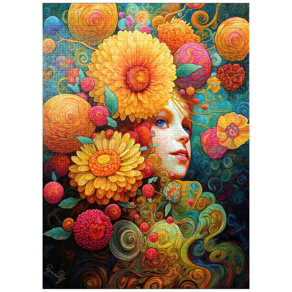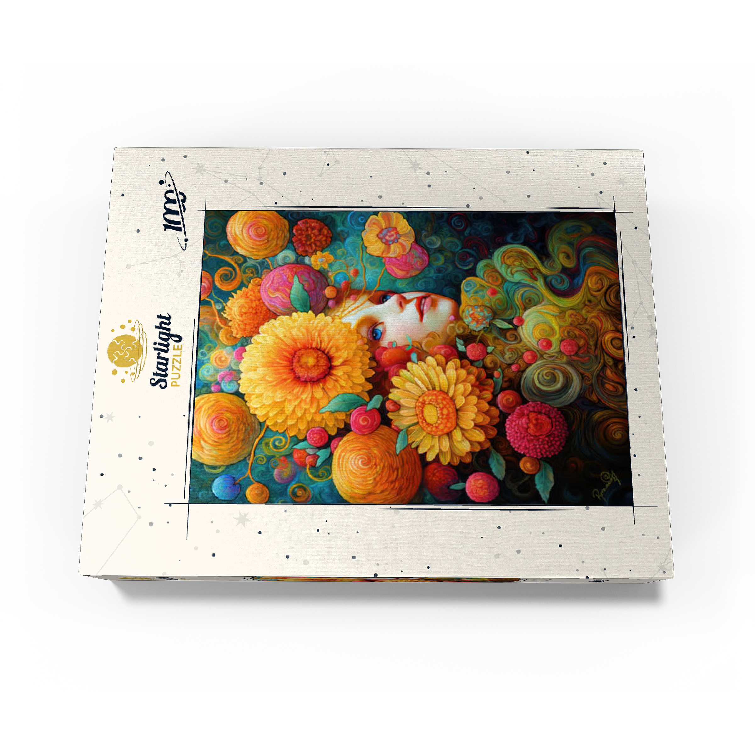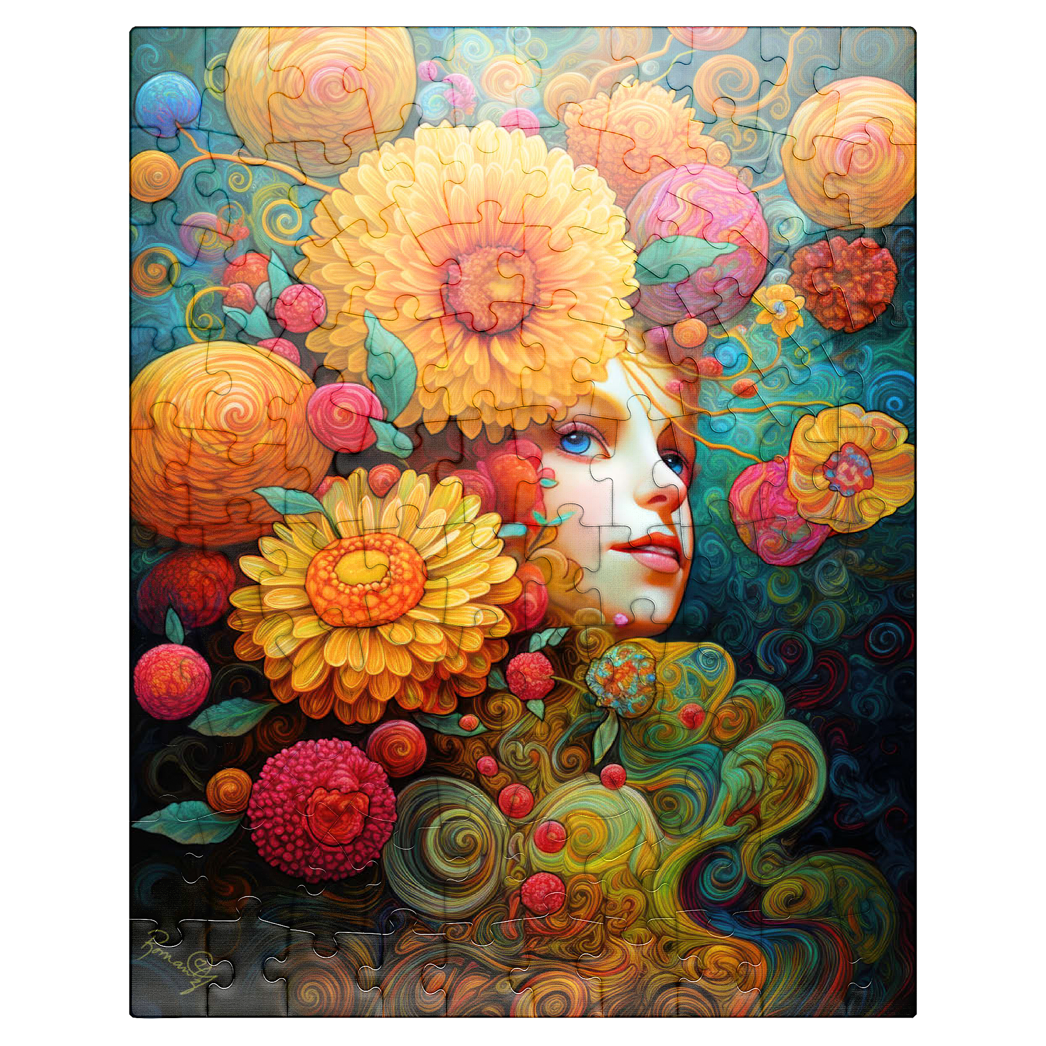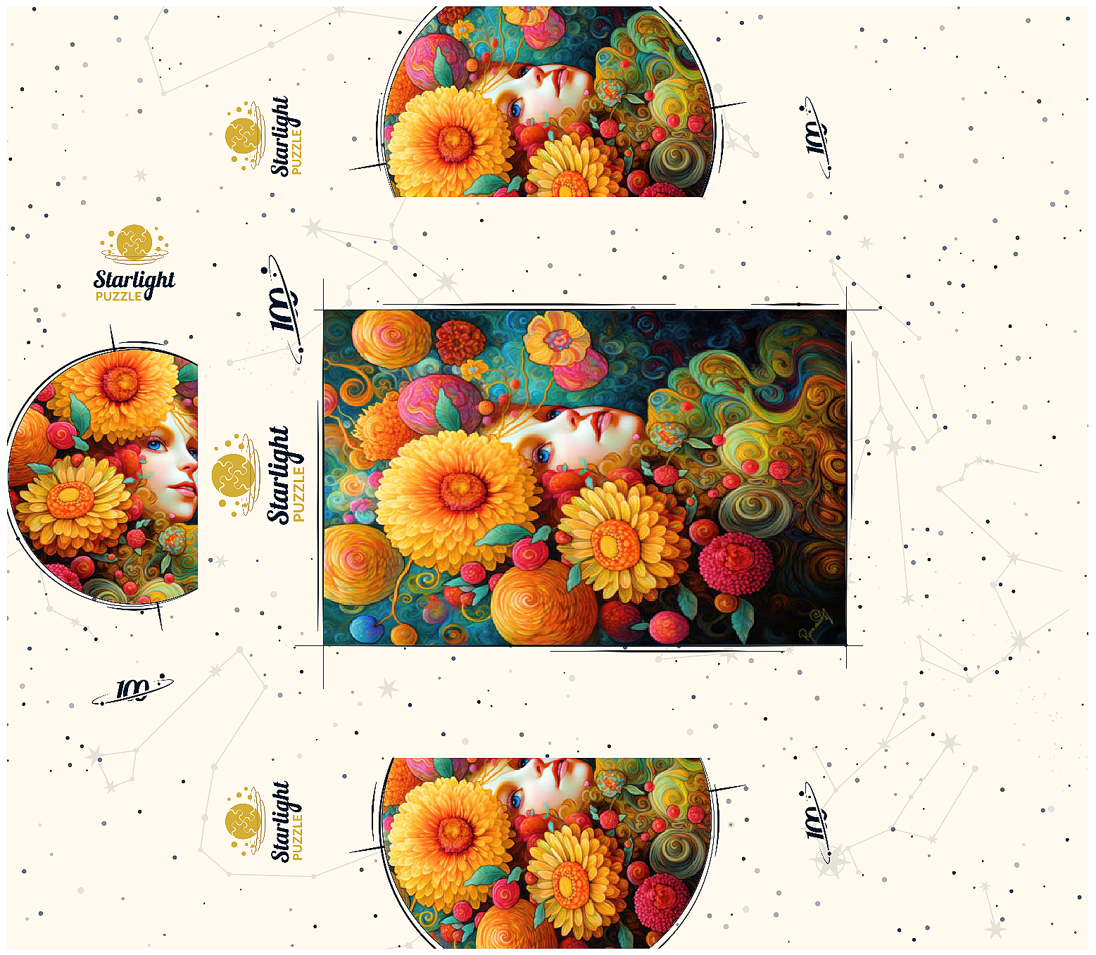 This radiant artwork showcases a dreamy female face enveloped by an explosion of golden-yellow flowers, swirling botanical patterns, and vibrant fruits. The woman's expressive blue eyes and soft features bring a gentle serenity to the otherwise energetic composition. Lush swirls of rich colors-turquoise, emerald, crimson, and coral-create a dynamic, whimsical atmosphere. The large sunflower-like blooms and raspberry orbs add a fantasy-garden feel, making the piece both uplifting and visually captivating. A harmonious blend of nature and surrealism, the scene evokes joy, imagination, and warmth.