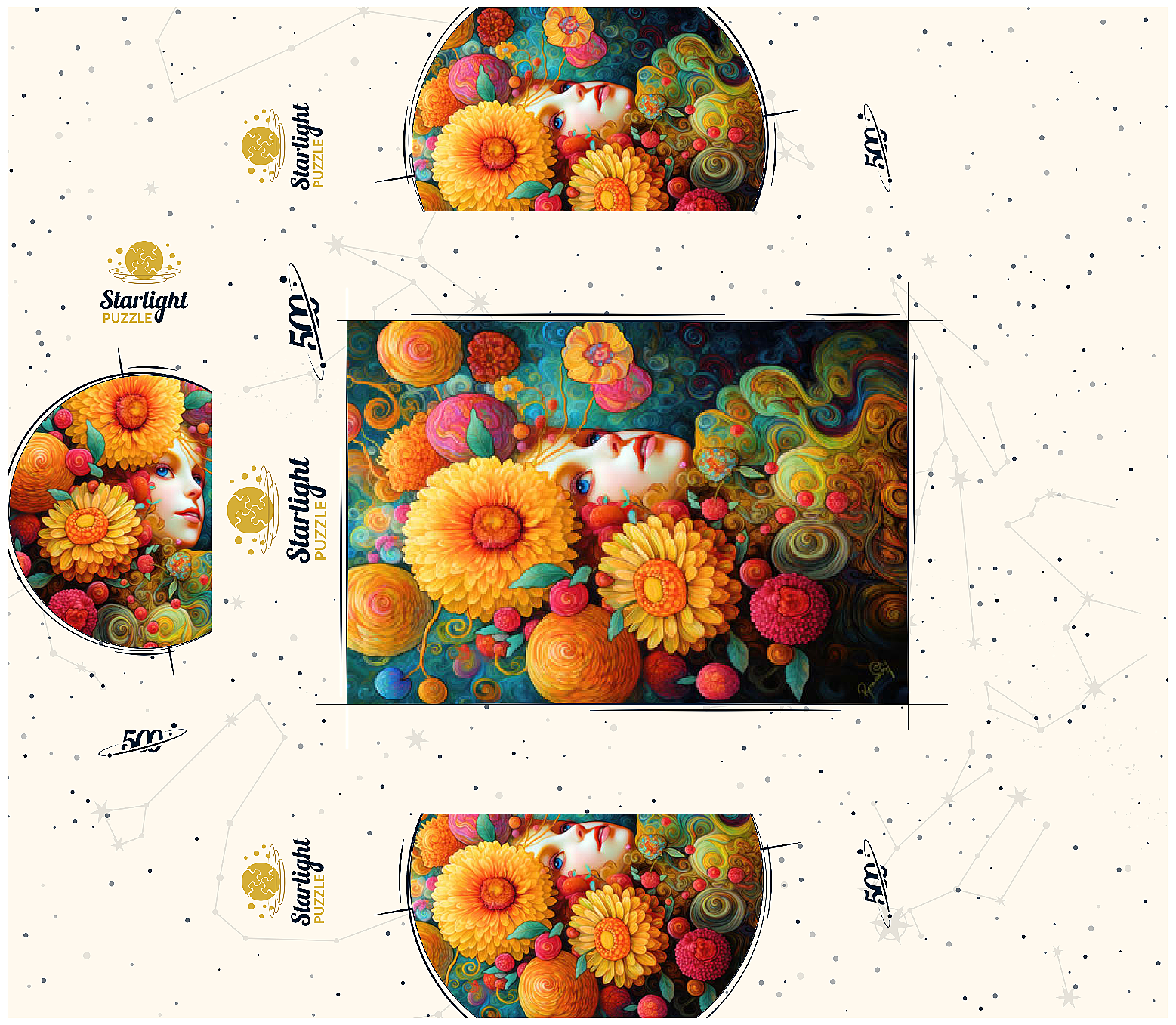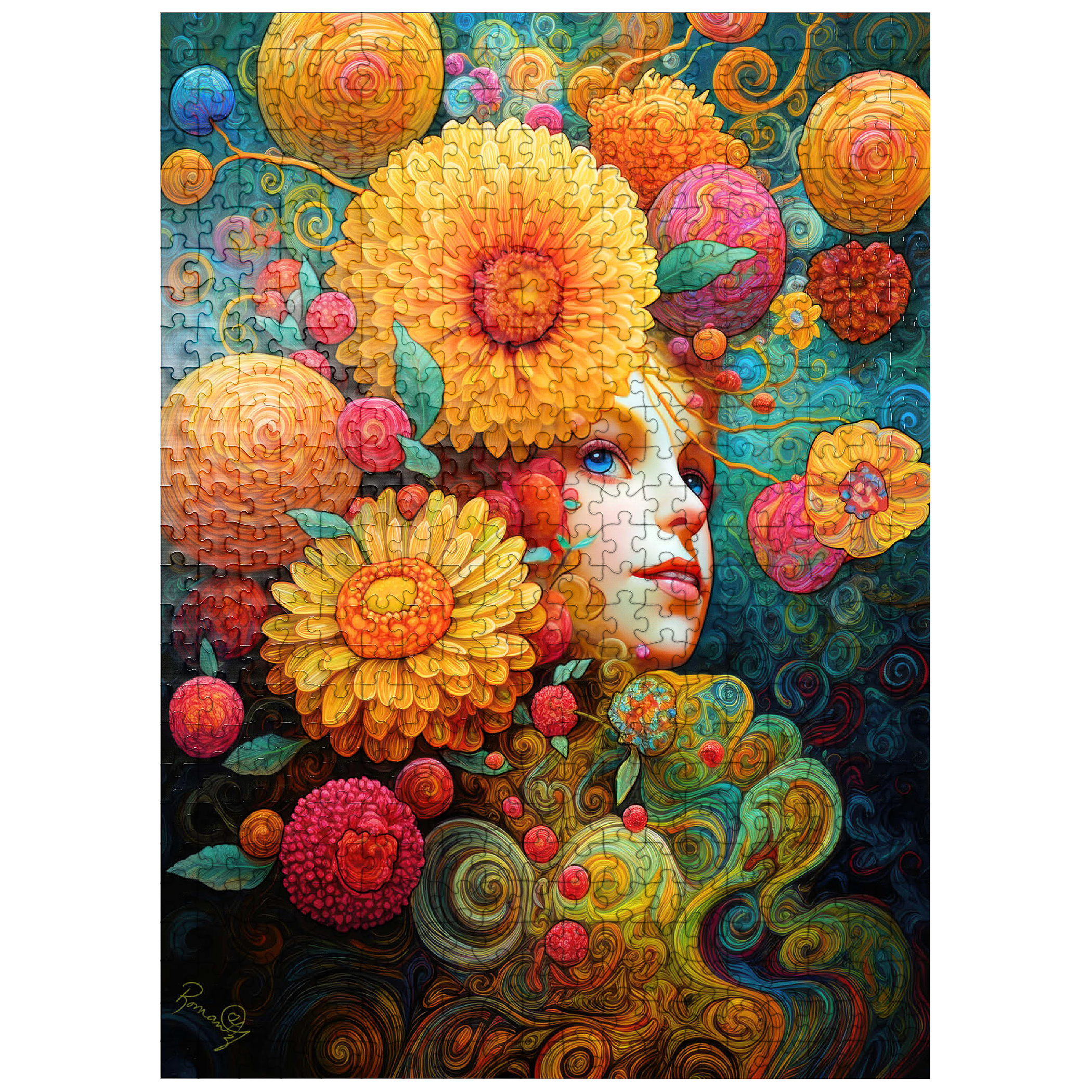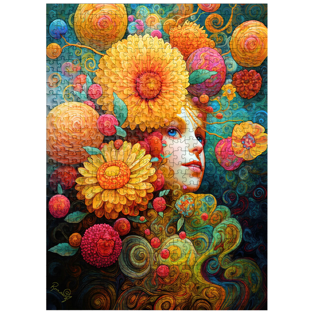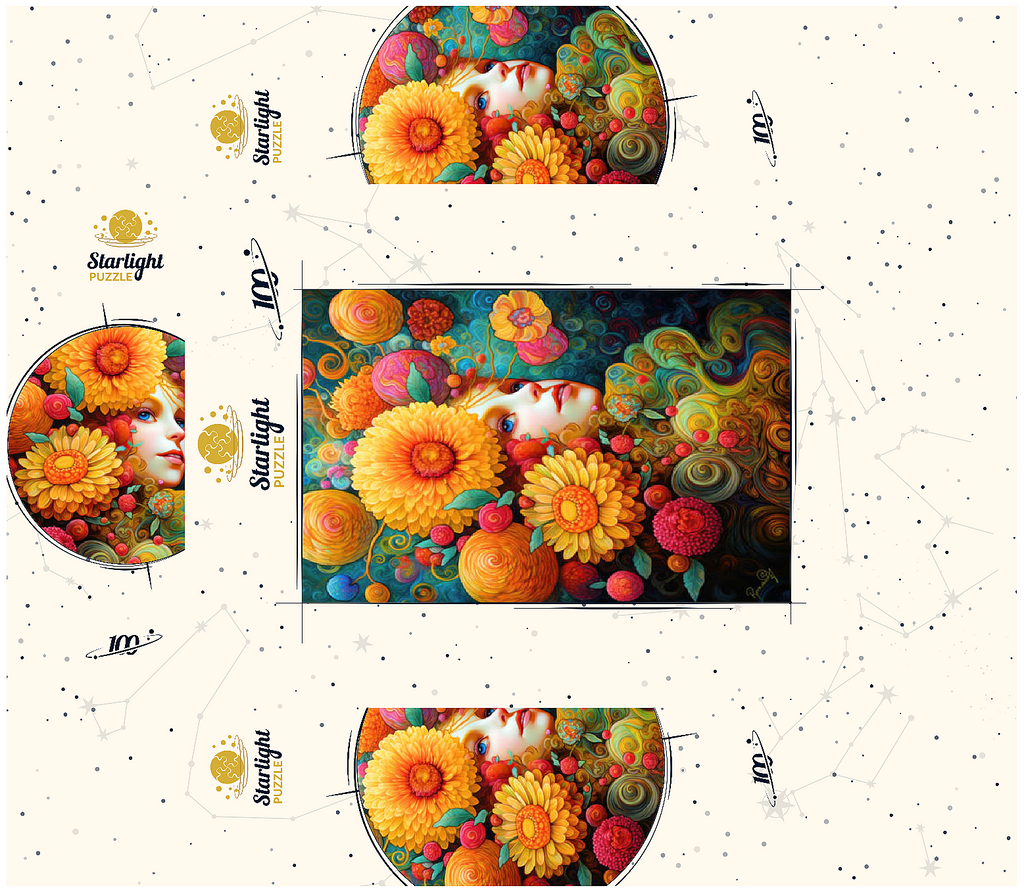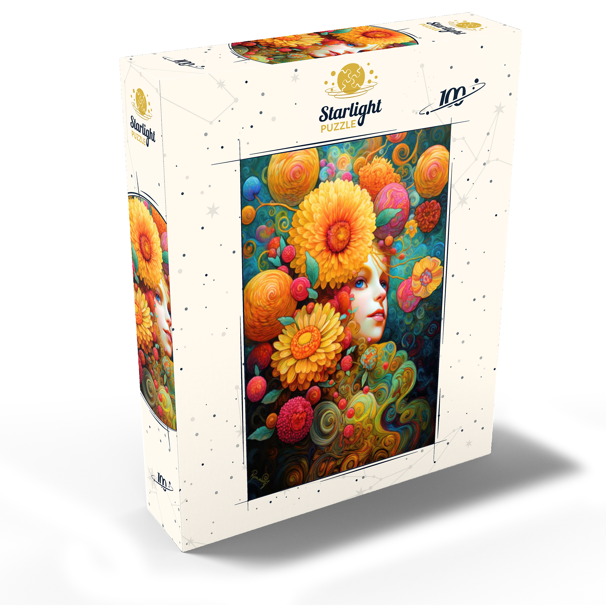 This radiant artwork showcases a dreamy female face enveloped by an explosion of golden-yellow flowers, swirling botanical patterns, and vibrant fruits. The woman's expressive blue eyes and soft features bring a gentle serenity to the otherwise energetic composition. Lush swirls of rich colors-turquoise, emerald, crimson, and coral-create a dynamic, whimsical atmosphere. The large sunflower-like blooms and raspberry orbs add a fantasy-garden feel, making the piece both uplifting and visually captivating. A harmonious blend of nature and surrealism, the scene evokes joy, imagination, and warmth.