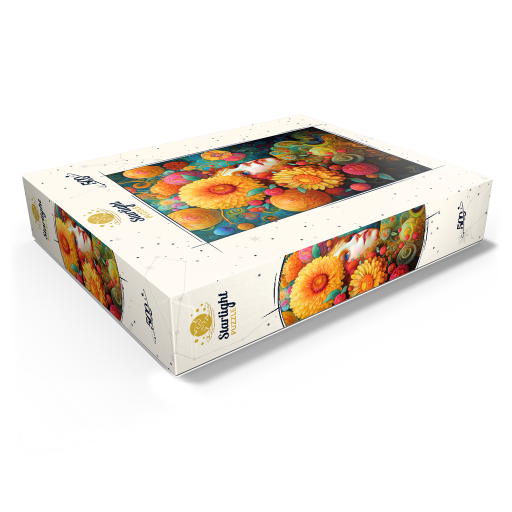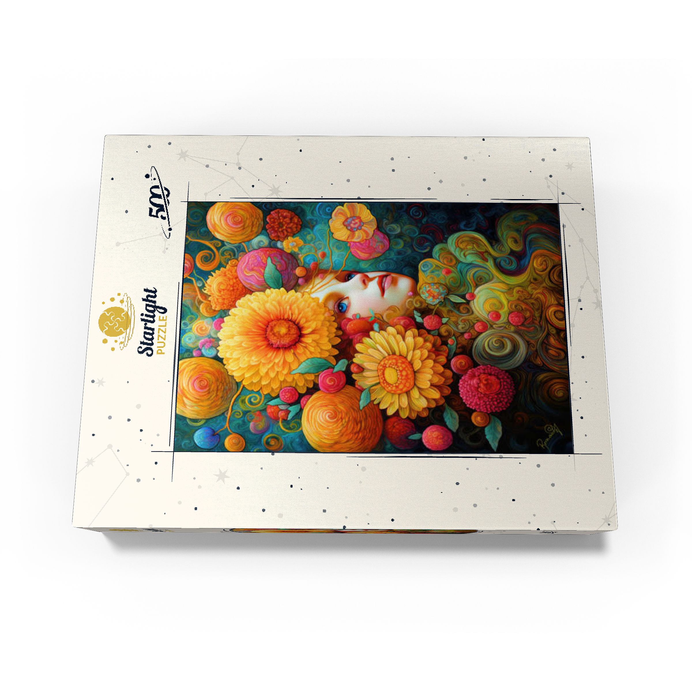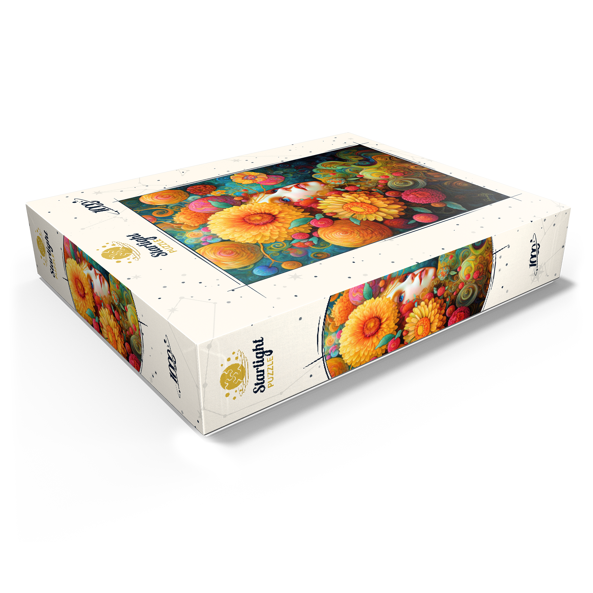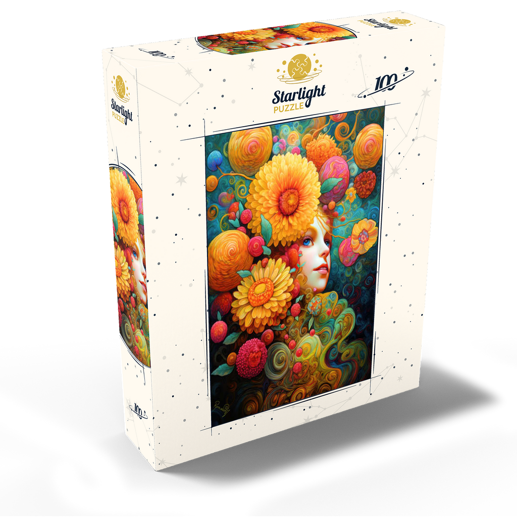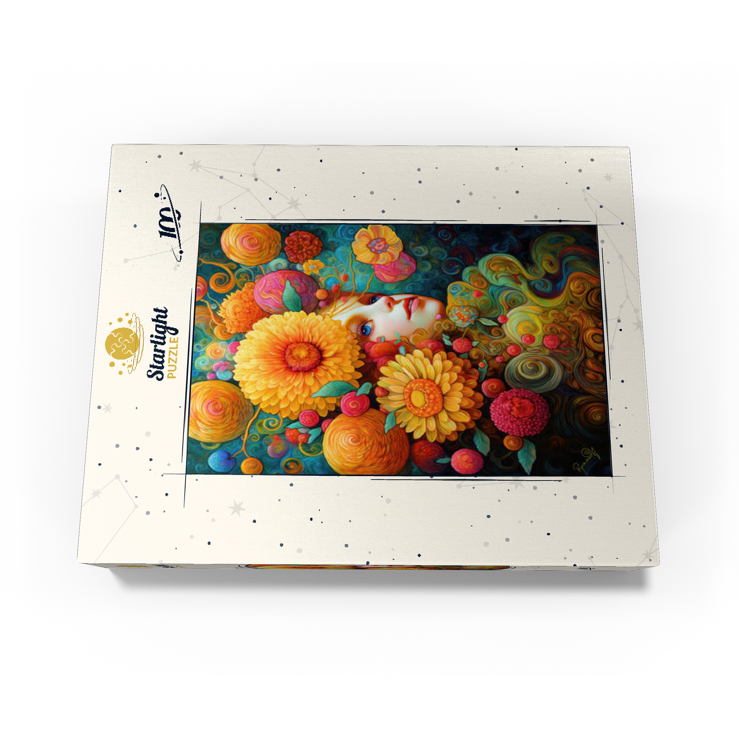 This radiant artwork showcases a dreamy female face enveloped by an explosion of golden-yellow flowers, swirling botanical patterns, and vibrant fruits. The woman's expressive blue eyes and soft features bring a gentle serenity to the otherwise energetic composition. Lush swirls of rich colors-turquoise, emerald, crimson, and coral-create a dynamic, whimsical atmosphere. The large sunflower-like blooms and raspberry orbs add a fantasy-garden feel, making the piece both uplifting and visually captivating. A harmonious blend of nature and surrealism, the scene evokes joy, imagination, and warmth.