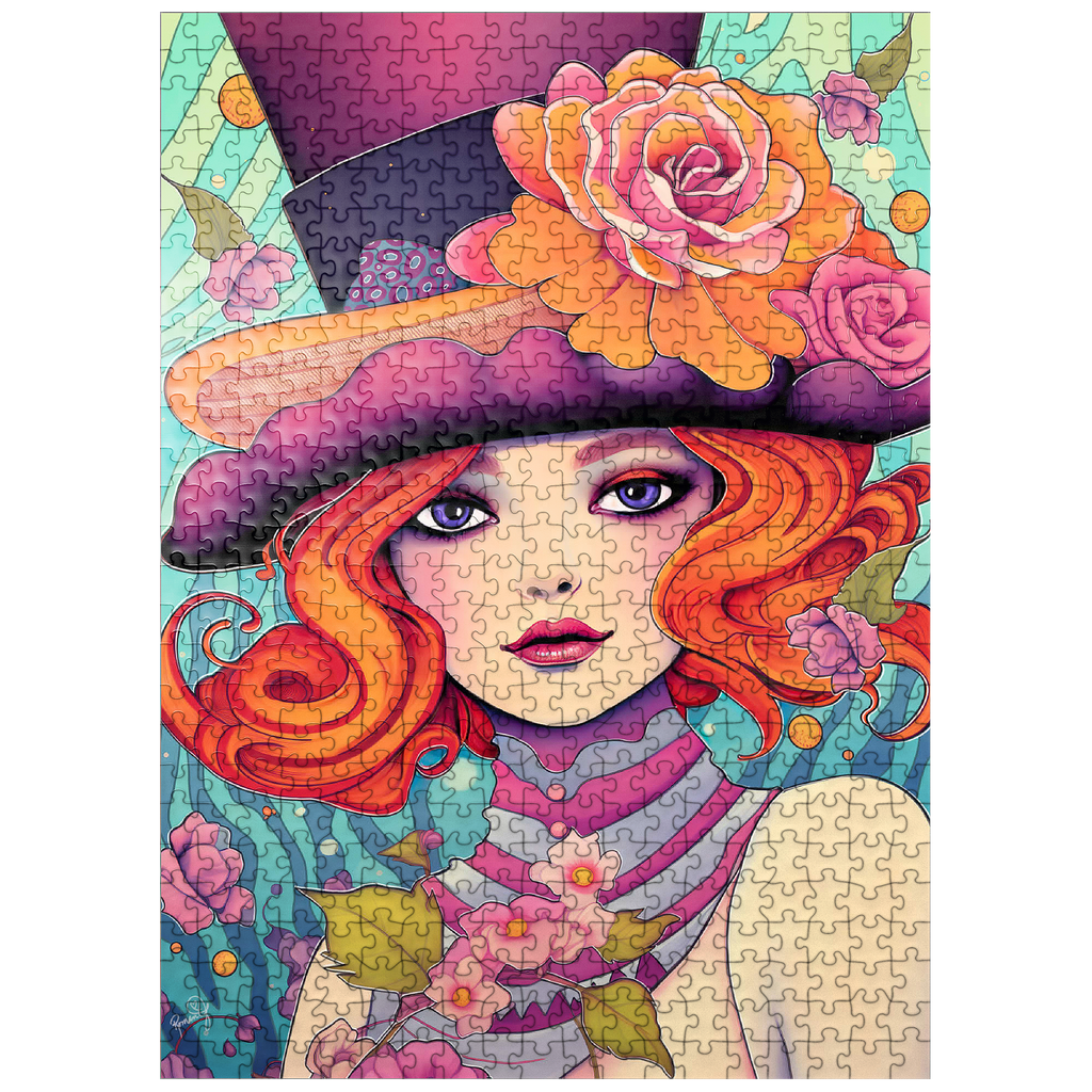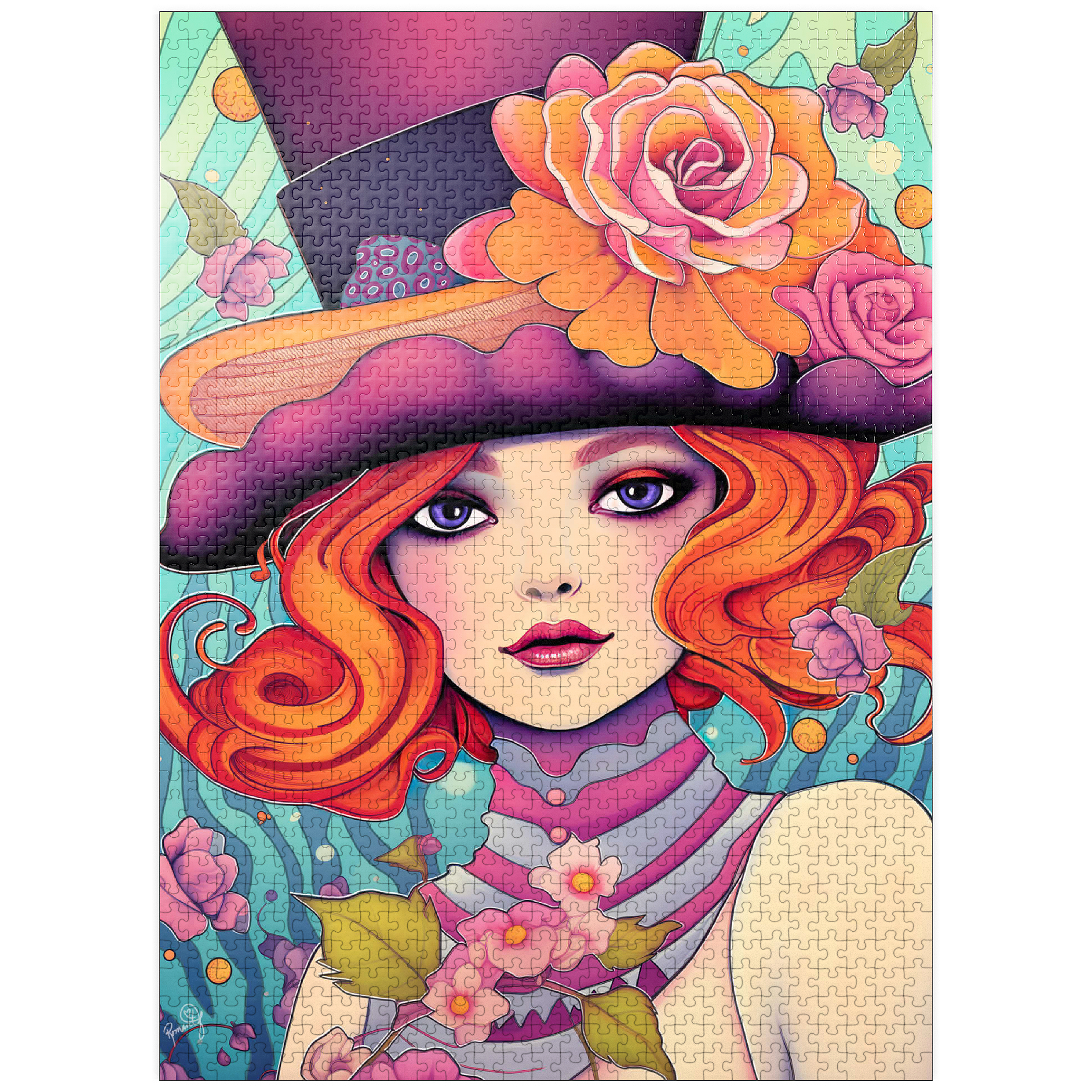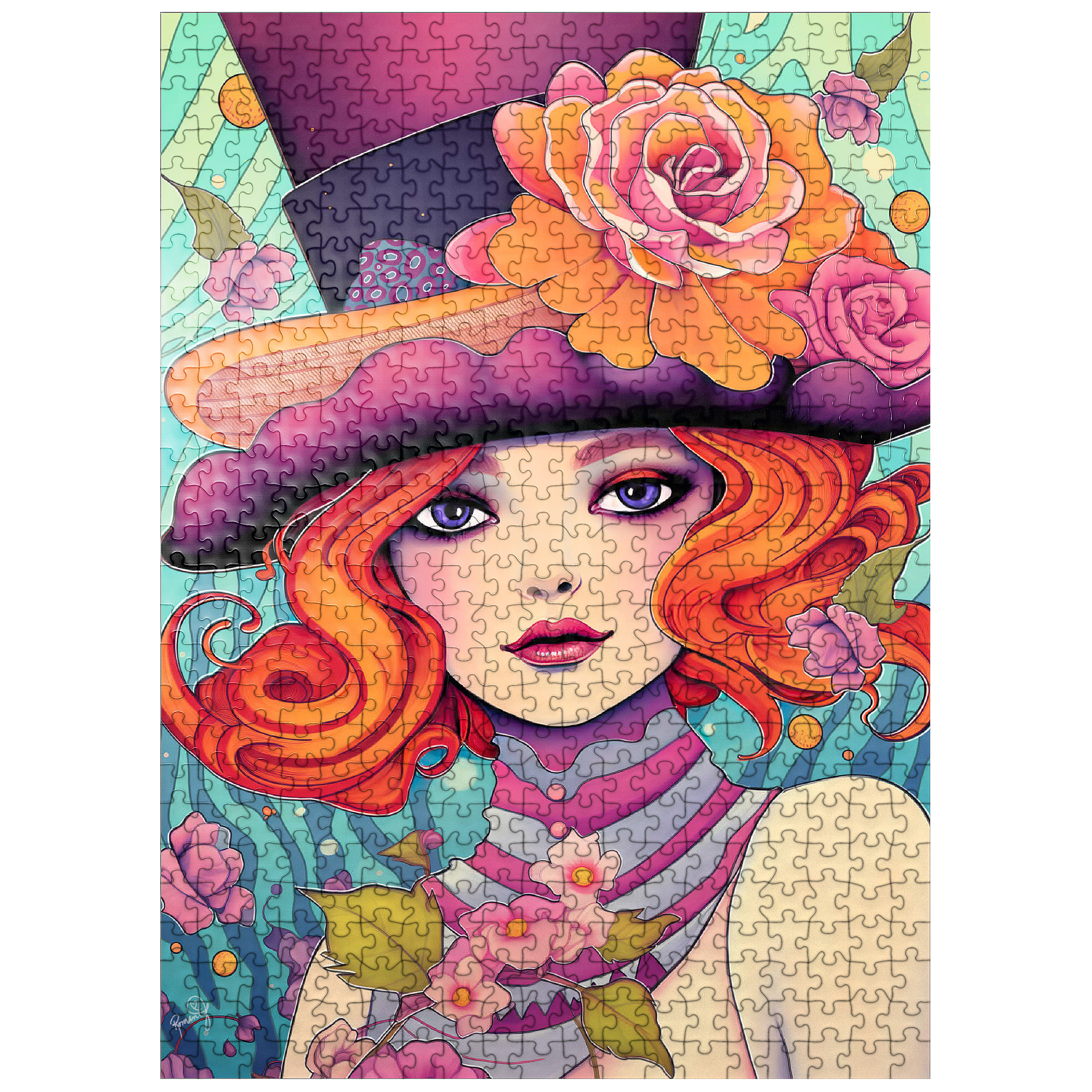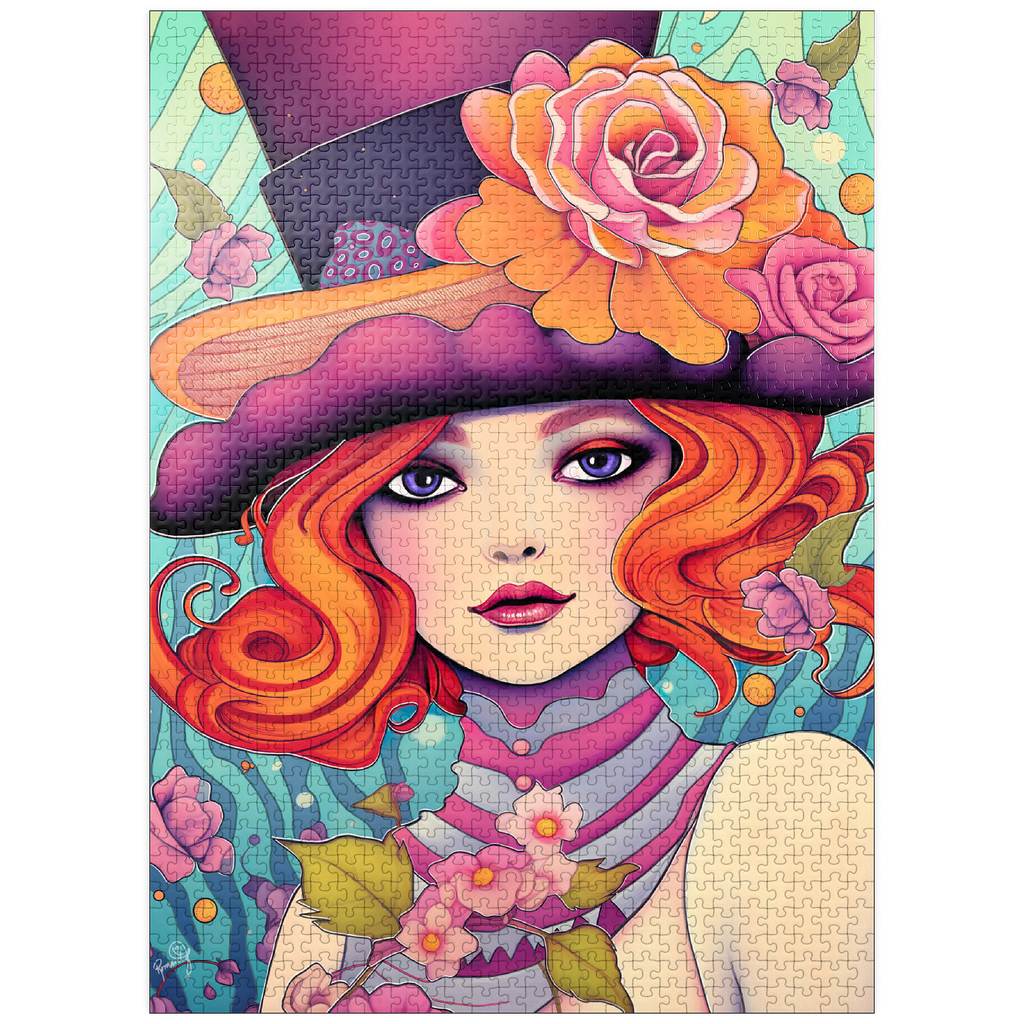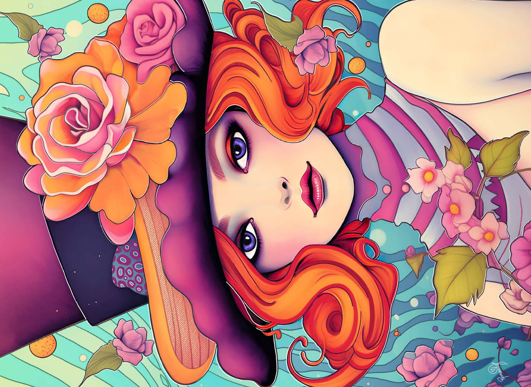 This enchanting digital artwork showcases a red-haired woman with striking violet eyes and an expressive gaze, adorned in a whimsical top hat decorated with vibrant orange and pink roses. Her flowing hair and pastel-toned accessories blend effortlessly with a dreamy, aquatic-inspired background filled with swirling patterns and floating blossoms. The image exudes a playful elegance, combining Art Nouveau influences with a touch of surreal fantasy. Perfect for those who appreciate feminine strength, creative flair, and visually captivating compositions.