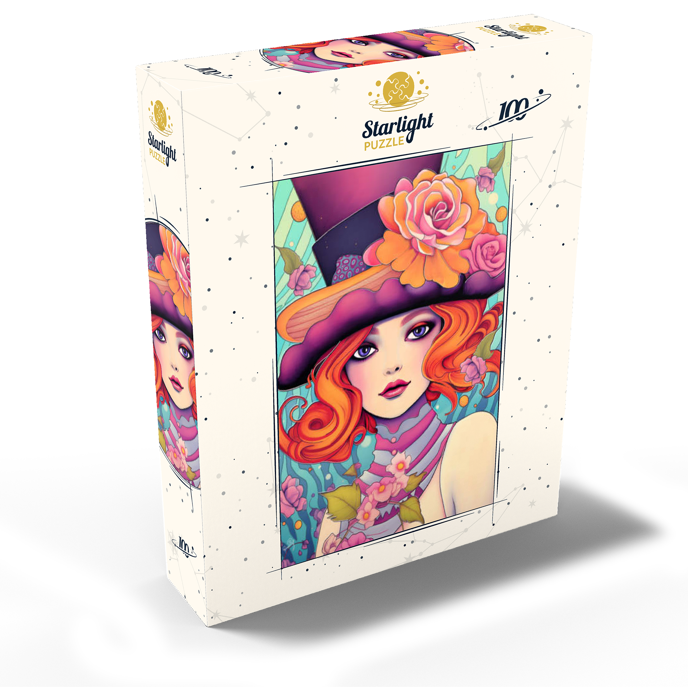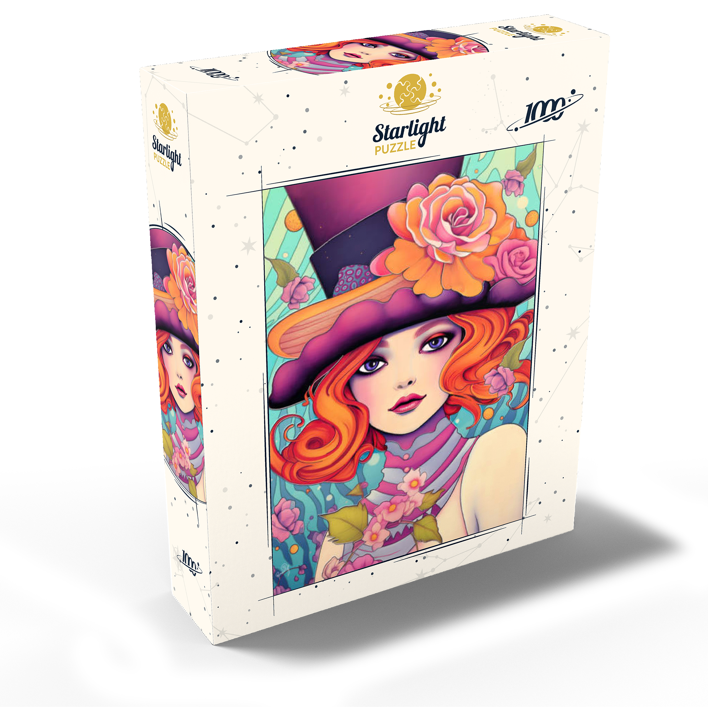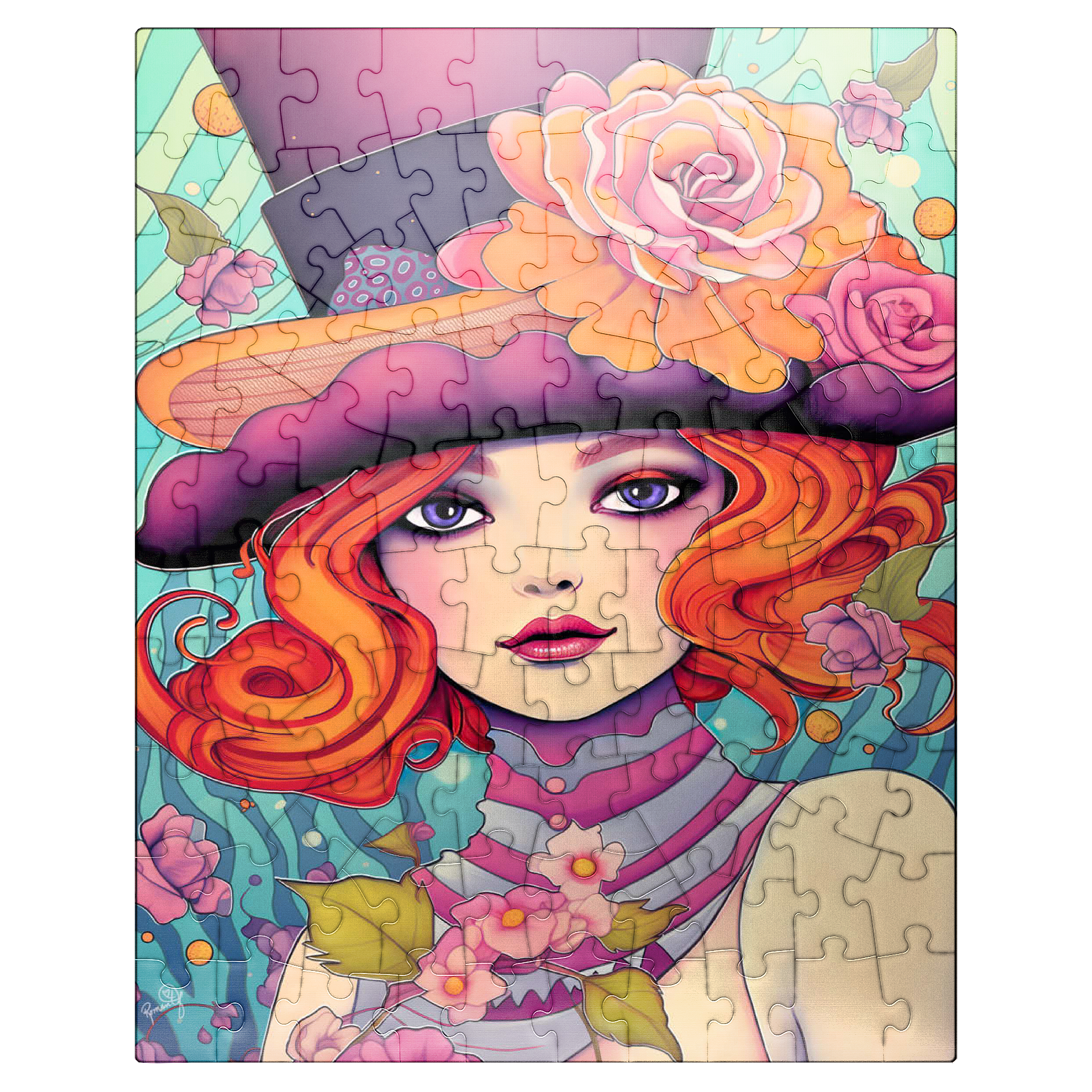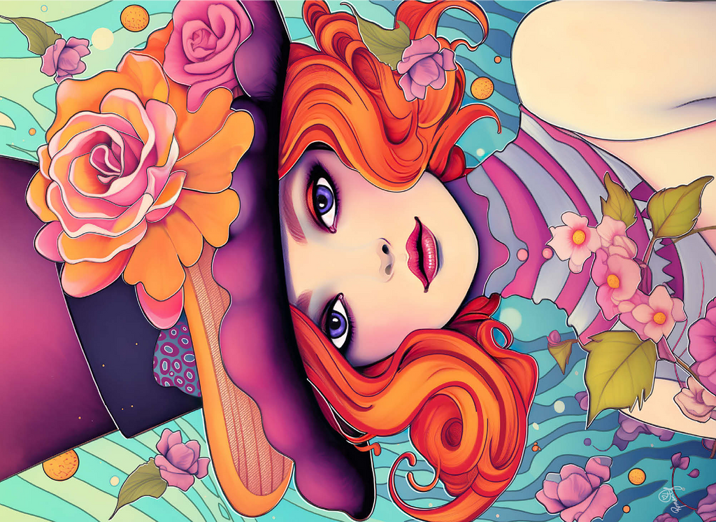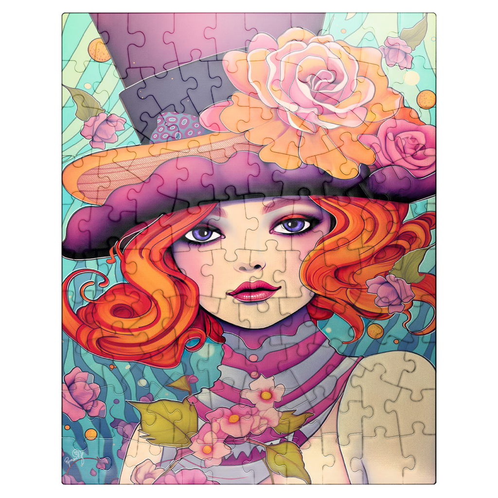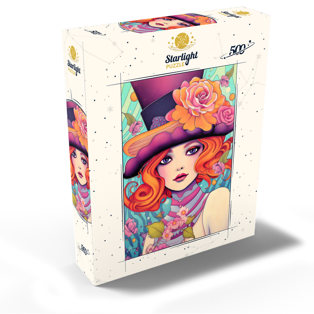 This enchanting digital artwork showcases a red-haired woman with striking violet eyes and an expressive gaze, adorned in a whimsical top hat decorated with vibrant orange and pink roses. Her flowing hair and pastel-toned accessories blend effortlessly with a dreamy, aquatic-inspired background filled with swirling patterns and floating blossoms. The image exudes a playful elegance, combining Art Nouveau influences with a touch of surreal fantasy. Perfect for those who appreciate feminine strength, creative flair, and visually captivating compositions.