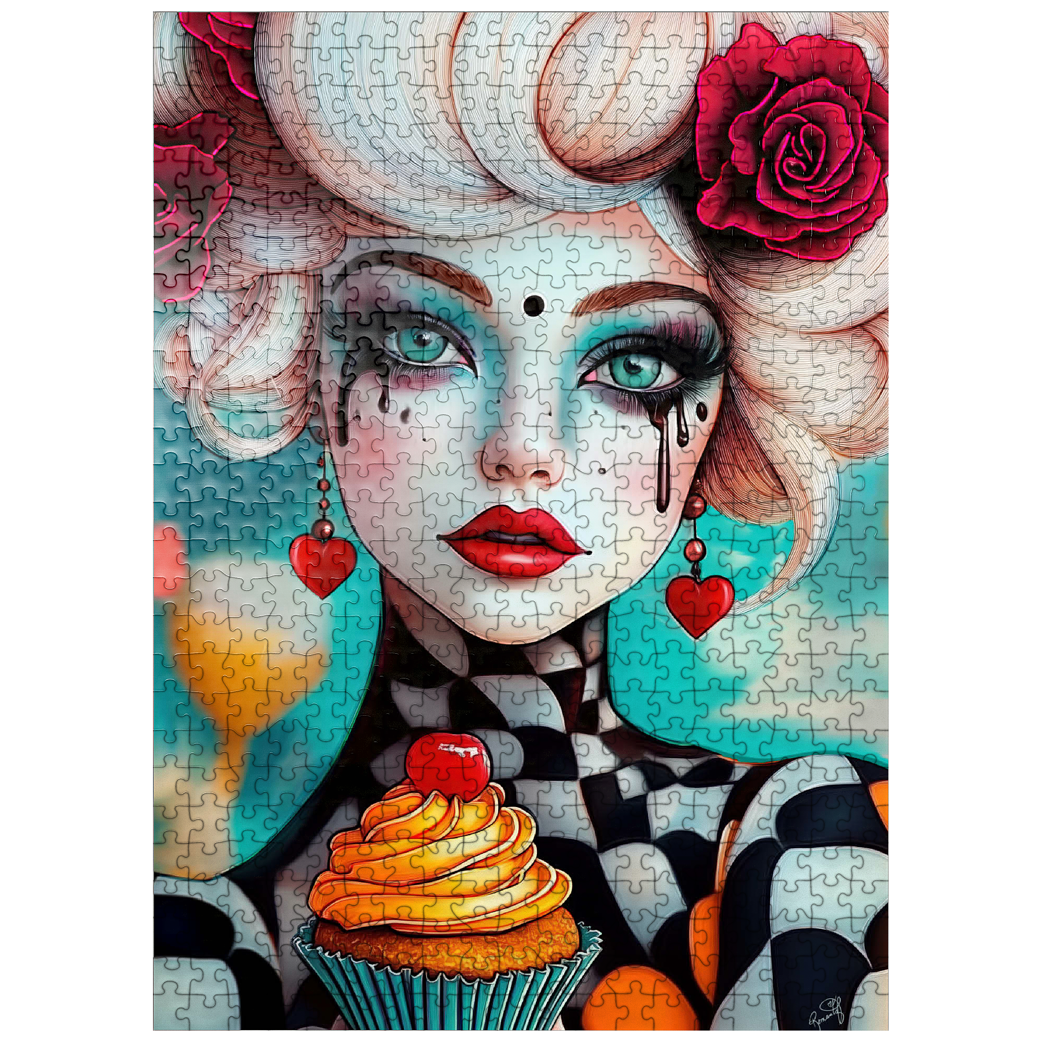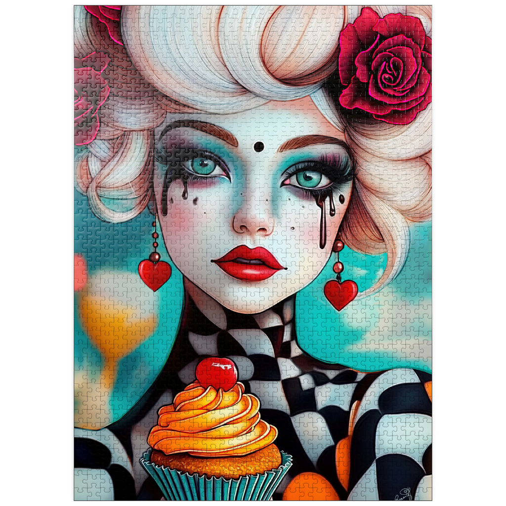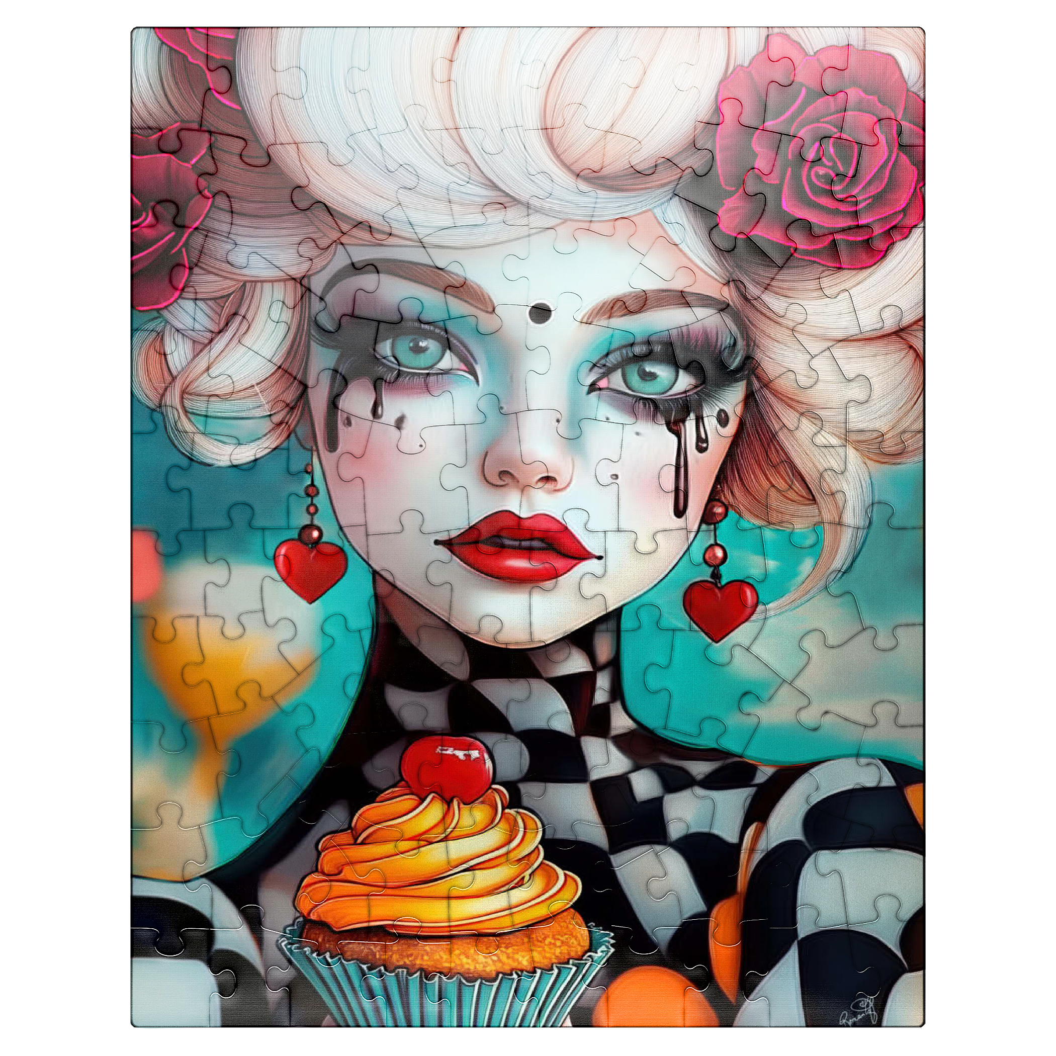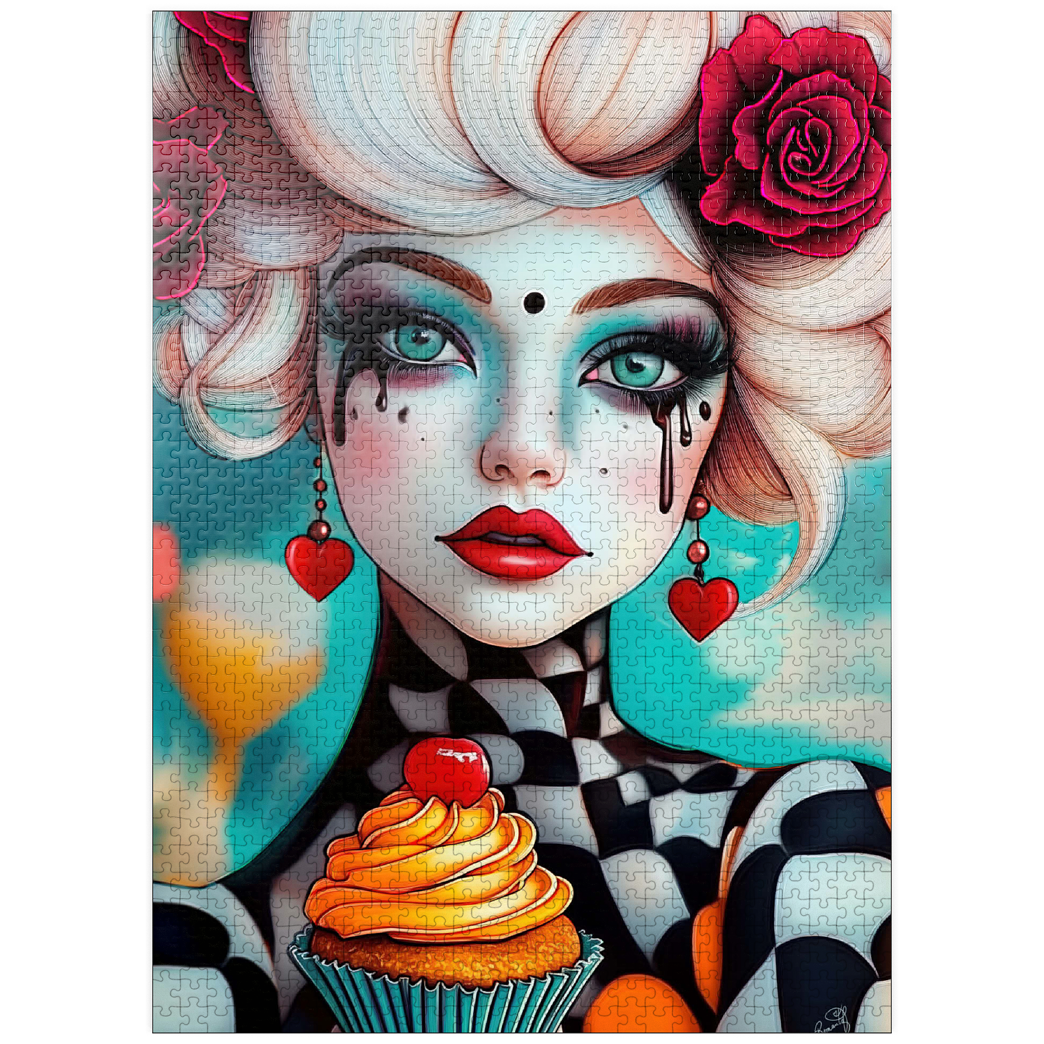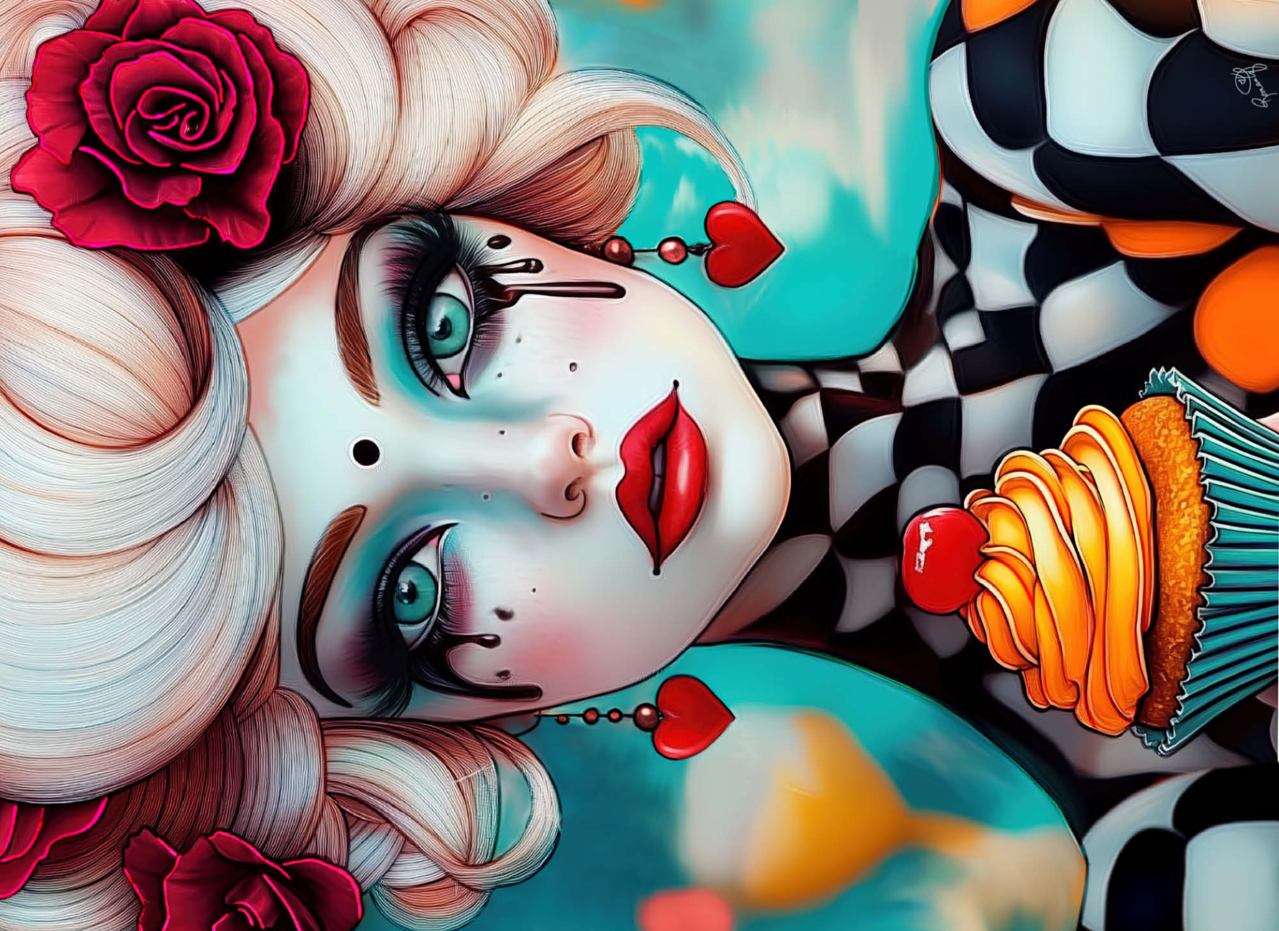 A striking digital artwork featuring a whimsical woman with pale porcelain skin, adorned with dramatic makeup and dripping black tears. Her piercing turquoise eyes and bold red lips contrast beautifully with her platinum blonde curls, which are decorated with vibrant red roses. She wears heart-shaped earrings and a playful black-and-white checkered outfit, adding a surreal, theatrical aesthetic. Holding an orange-frosted cupcake topped with a cherry, she exudes a sense of fantasy and eccentric charm. Ideal for lovers of surreal portrait art, whimsical fashion aesthetics, and imaginative character design, this piece is perfect for wall decor or artistic inspiration.