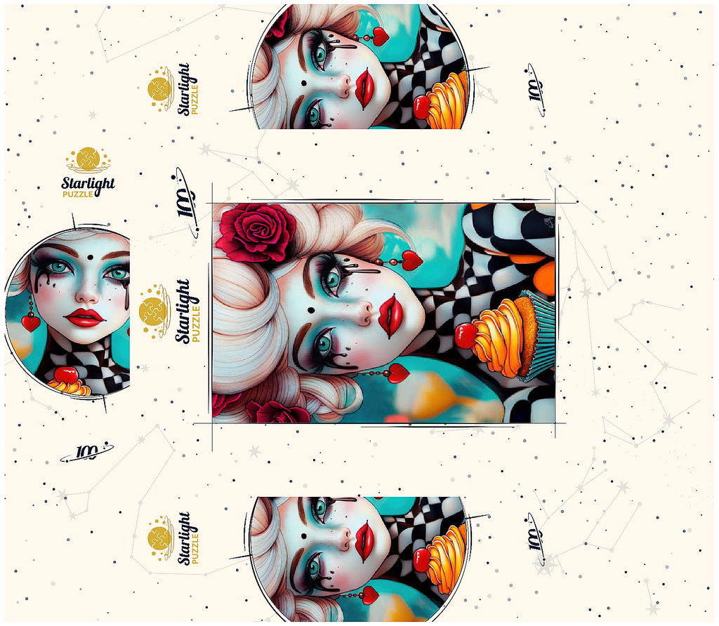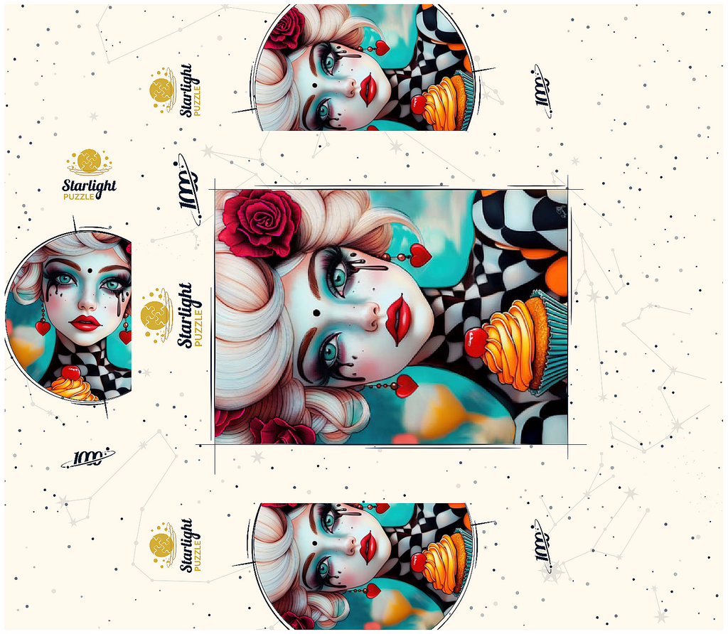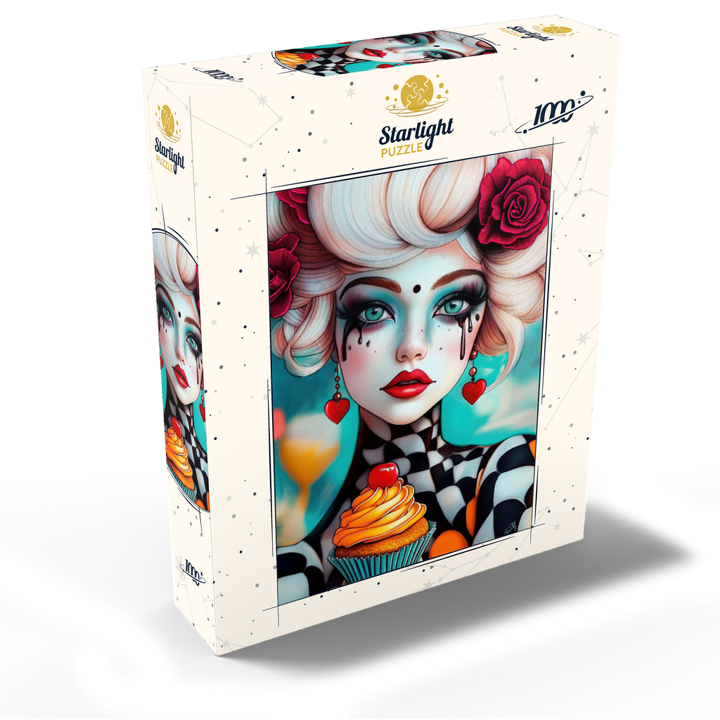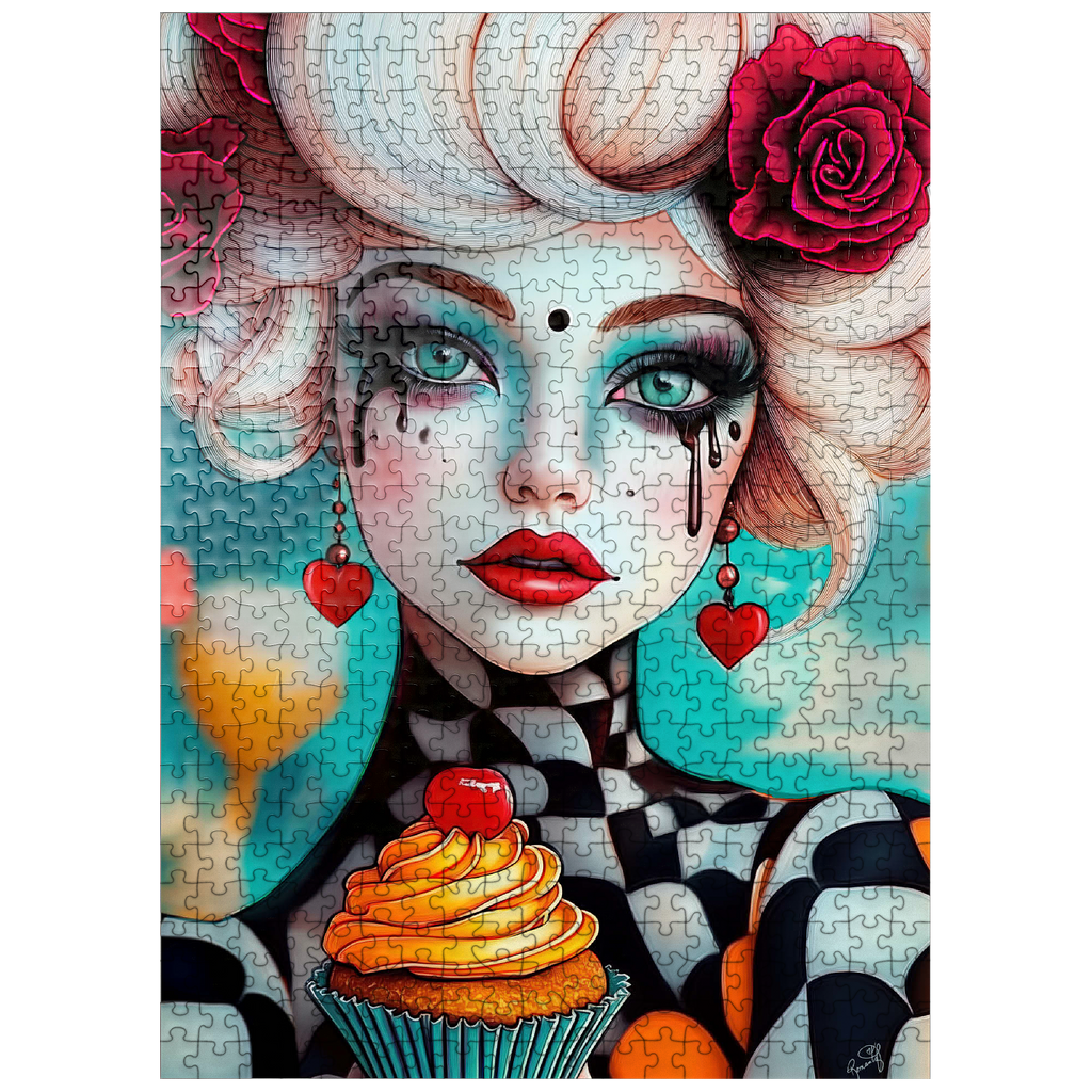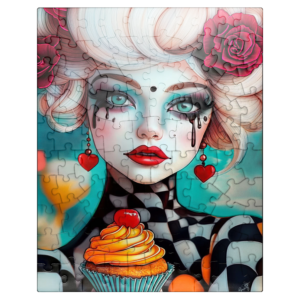 A striking digital artwork featuring a whimsical woman with pale porcelain skin, adorned with dramatic makeup and dripping black tears. Her piercing turquoise eyes and bold red lips contrast beautifully with her platinum blonde curls, which are decorated with vibrant red roses. She wears heart-shaped earrings and a playful black-and-white checkered outfit, adding a surreal, theatrical aesthetic. Holding an orange-frosted cupcake topped with a cherry, she exudes a sense of fantasy and eccentric charm. Ideal for lovers of surreal portrait art, whimsical fashion aesthetics, and imaginative character design, this piece is perfect for wall decor or artistic inspiration.