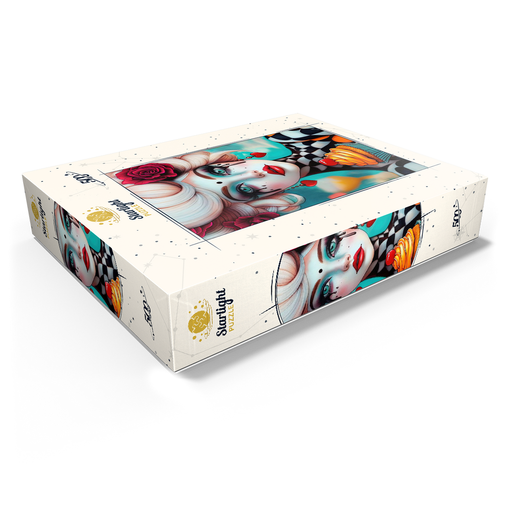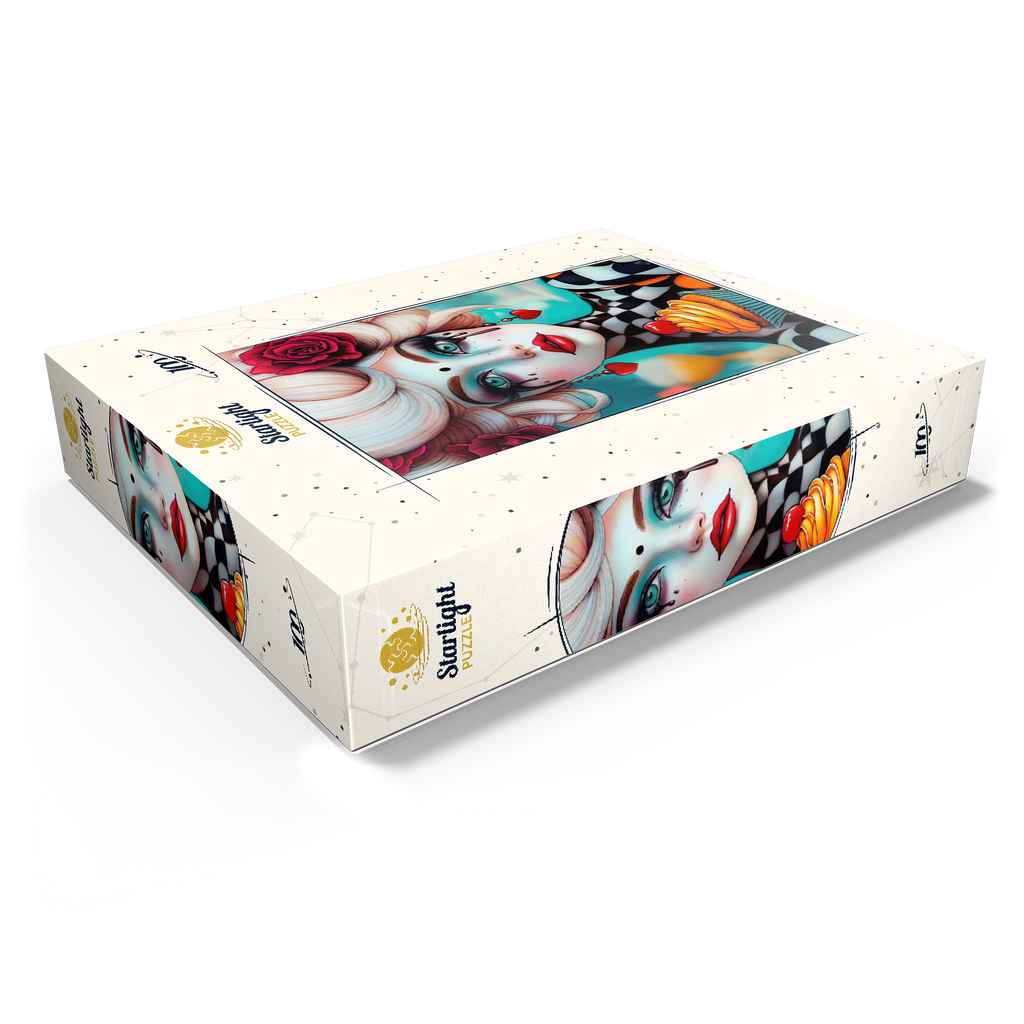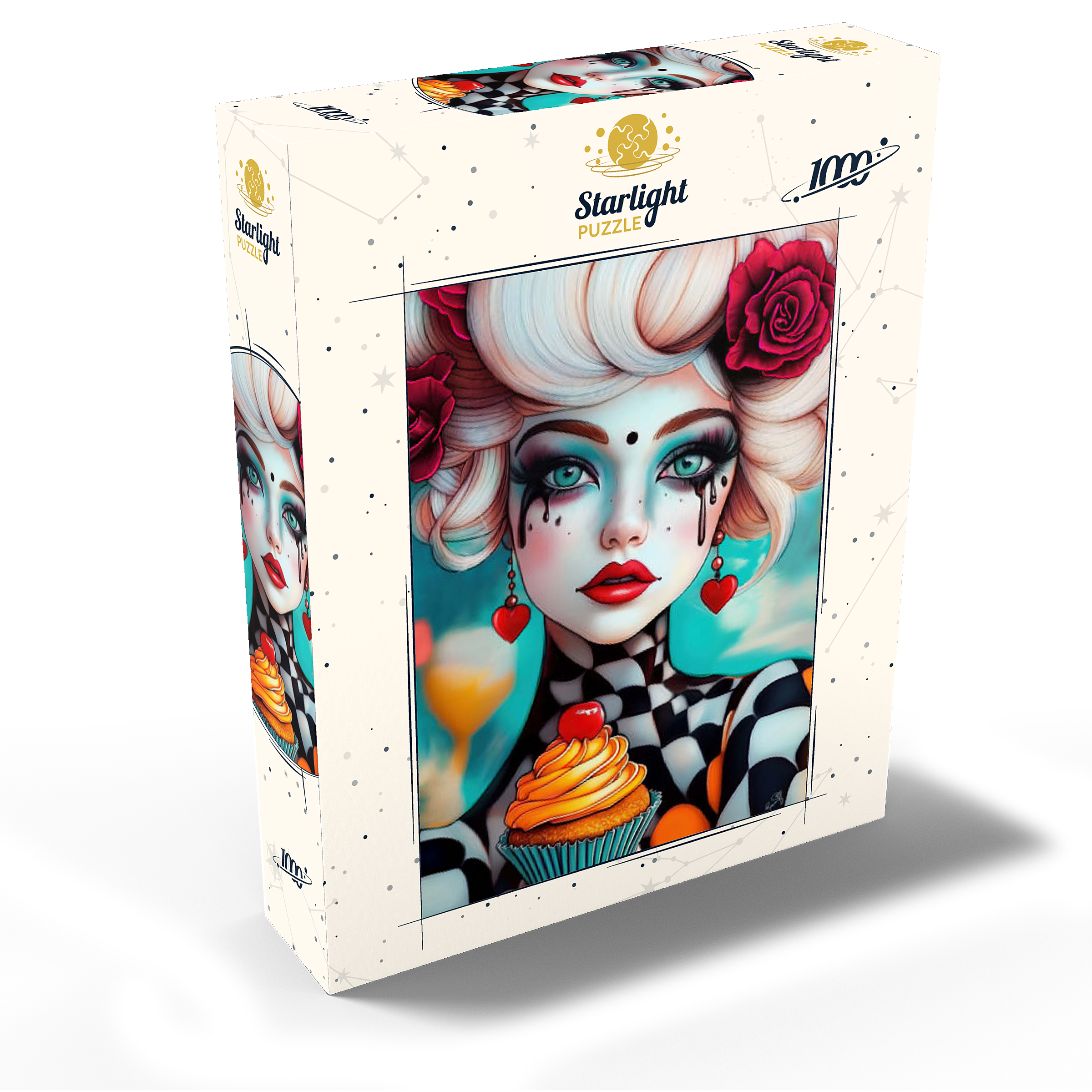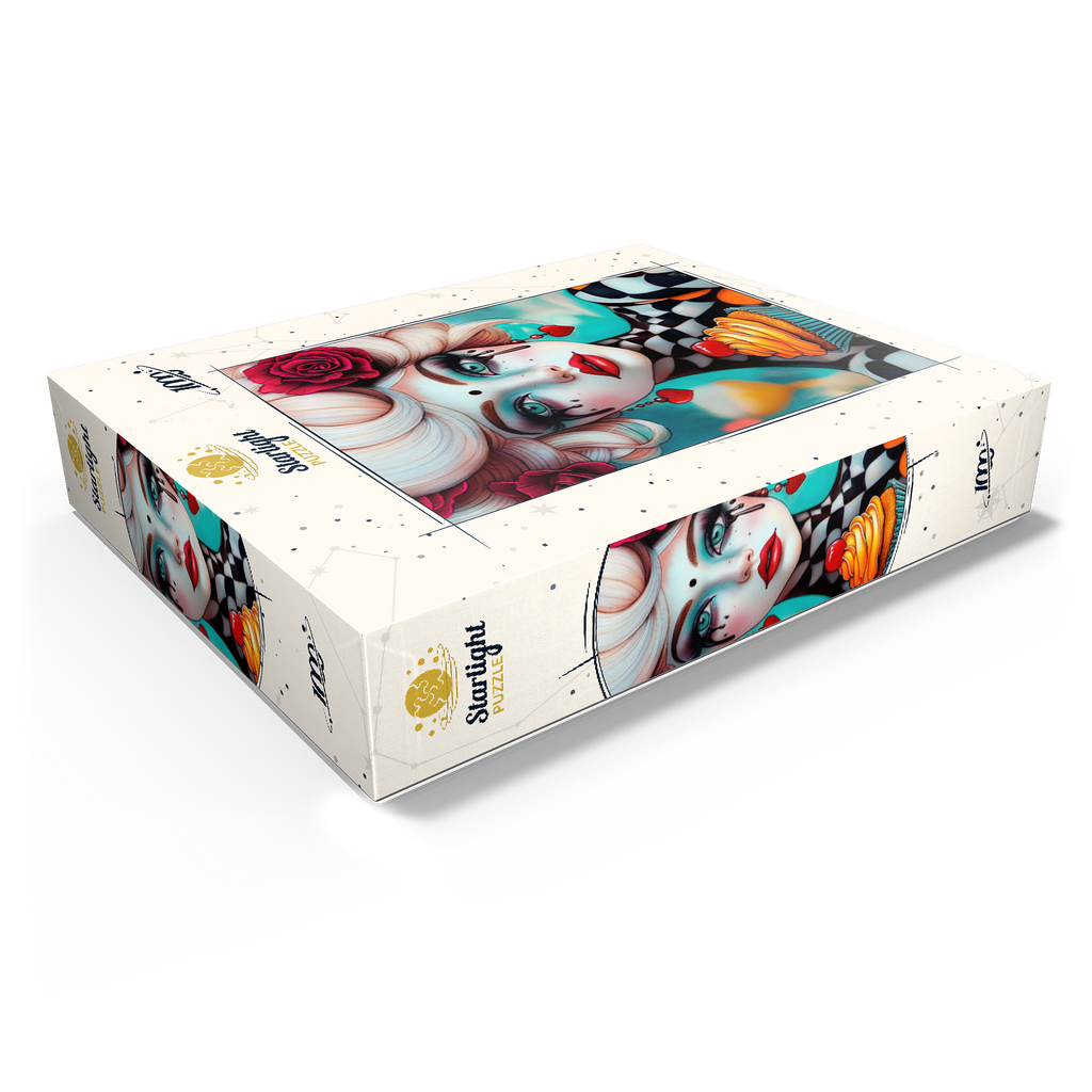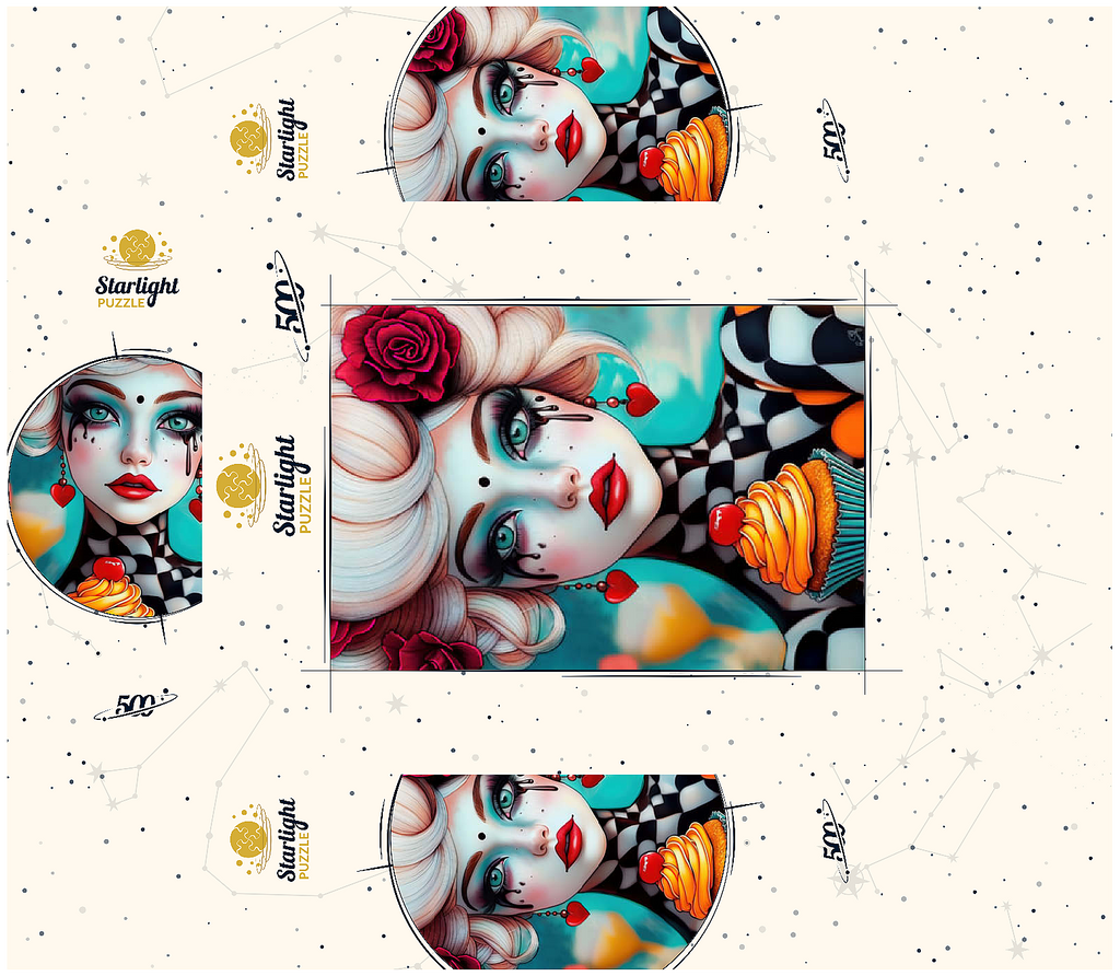 A striking digital artwork featuring a whimsical woman with pale porcelain skin, adorned with dramatic makeup and dripping black tears. Her piercing turquoise eyes and bold red lips contrast beautifully with her platinum blonde curls, which are decorated with vibrant red roses. She wears heart-shaped earrings and a playful black-and-white checkered outfit, adding a surreal, theatrical aesthetic. Holding an orange-frosted cupcake topped with a cherry, she exudes a sense of fantasy and eccentric charm. Ideal for lovers of surreal portrait art, whimsical fashion aesthetics, and imaginative character design, this piece is perfect for wall decor or artistic inspiration.