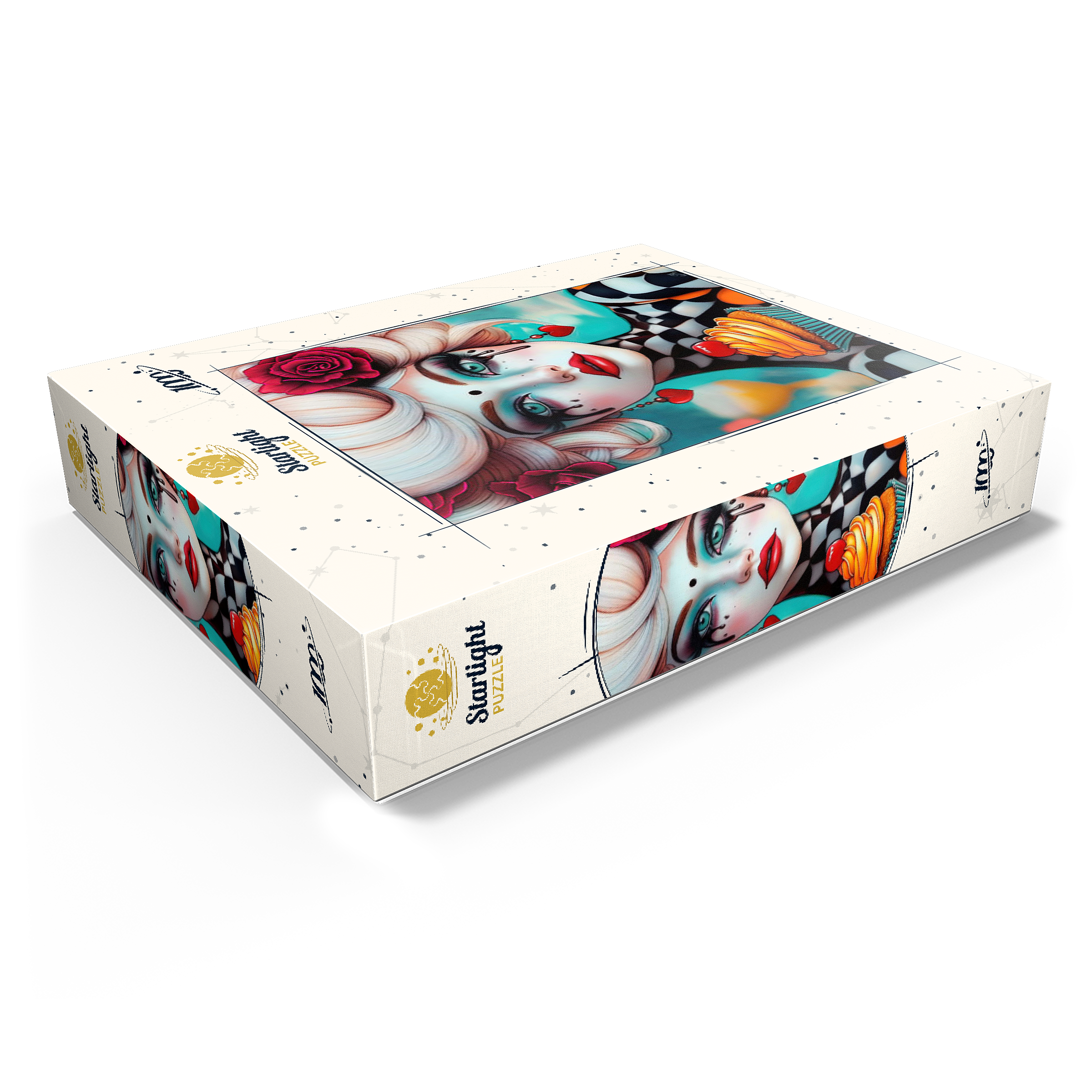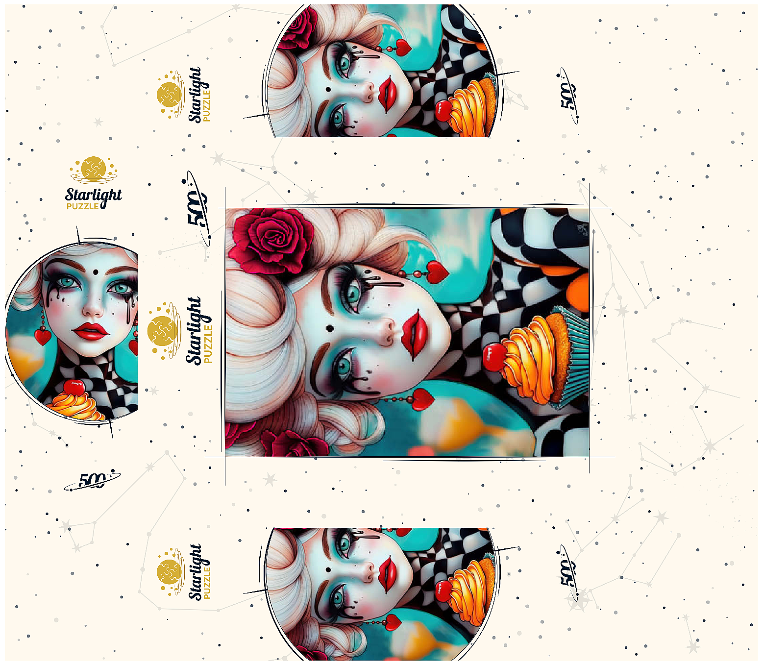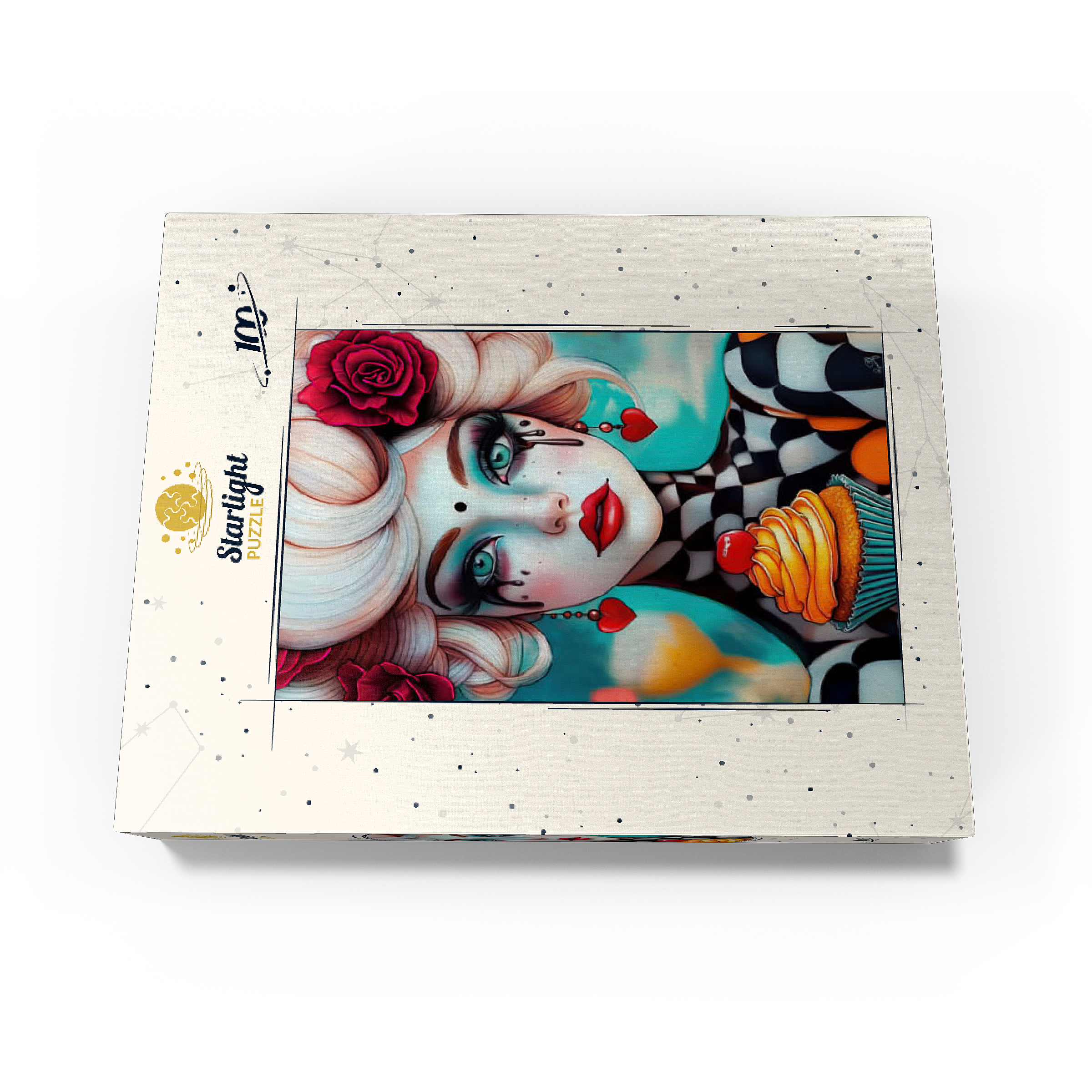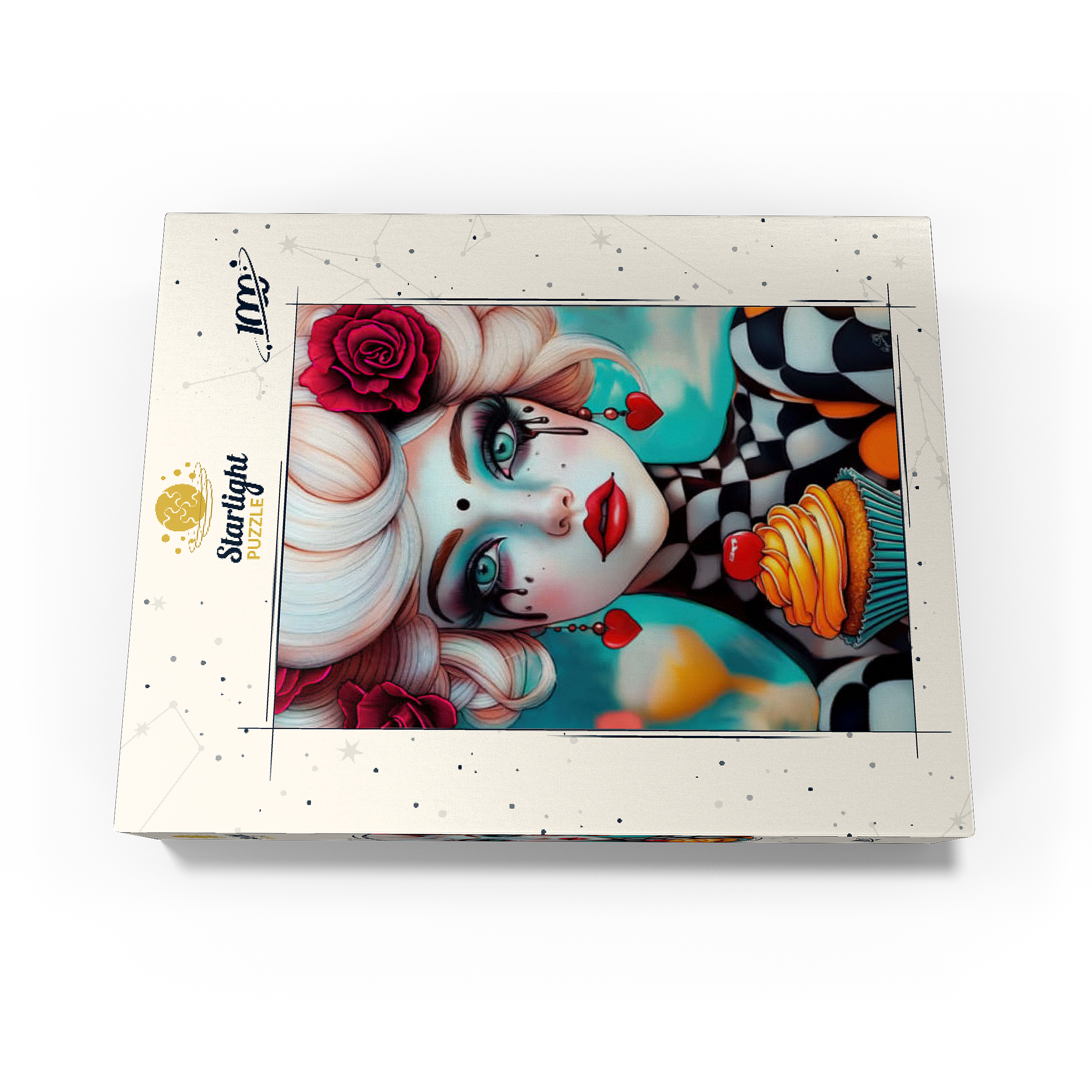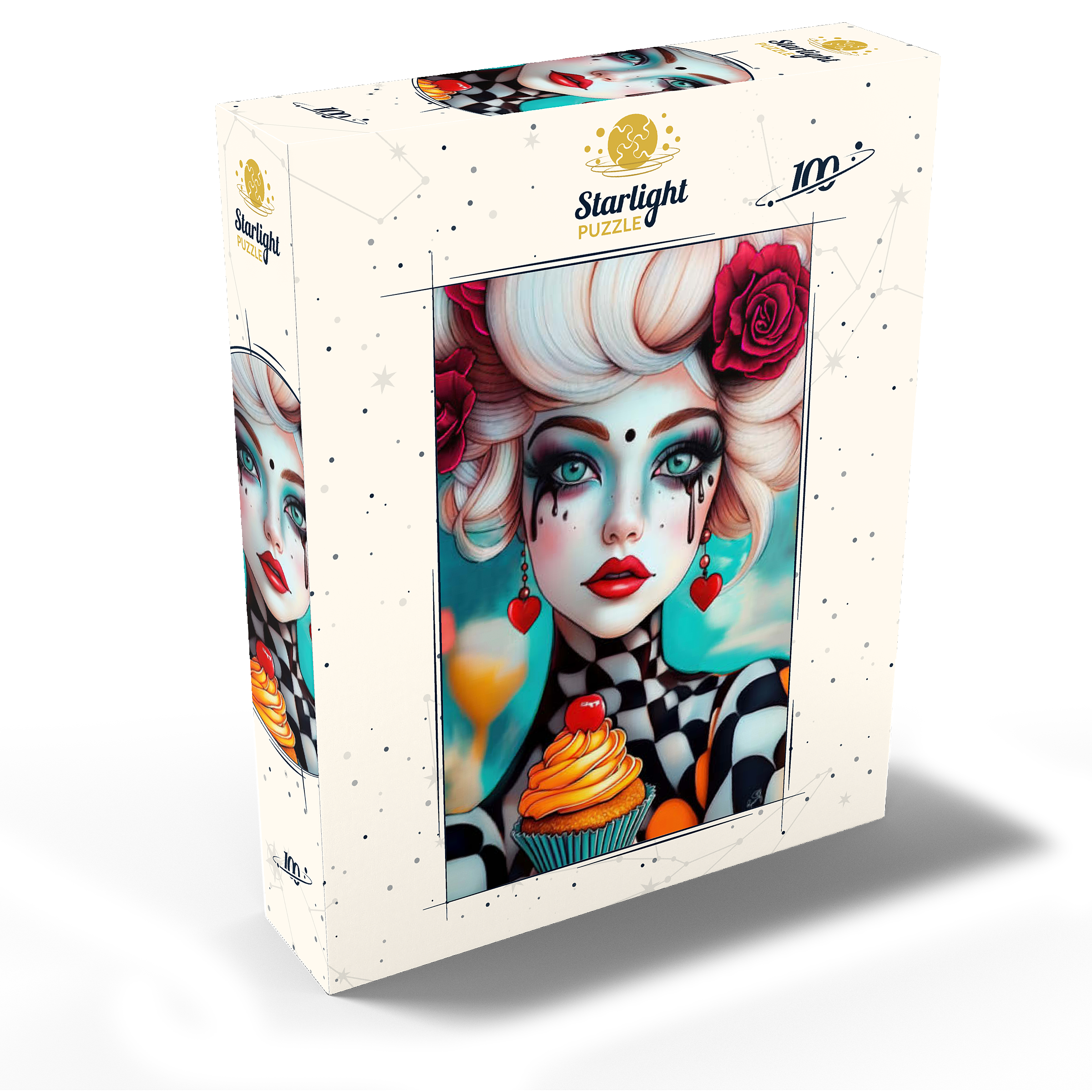A striking digital artwork featuring a whimsical woman with pale porcelain skin, adorned with dramatic makeup and dripping black tears. Her piercing turquoise eyes and bold red lips contrast beautifully with her platinum blonde curls, which are decorated with vibrant red roses. She wears heart-shaped earrings and a playful black-and-white checkered outfit, adding a surreal, theatrical aesthetic. Holding an orange-frosted cupcake topped with a cherry, she exudes a sense of fantasy and eccentric charm. Ideal for lovers of surreal portrait art, whimsical fashion aesthetics, and imaginative character design, this piece is perfect for wall decor or artistic inspiration.