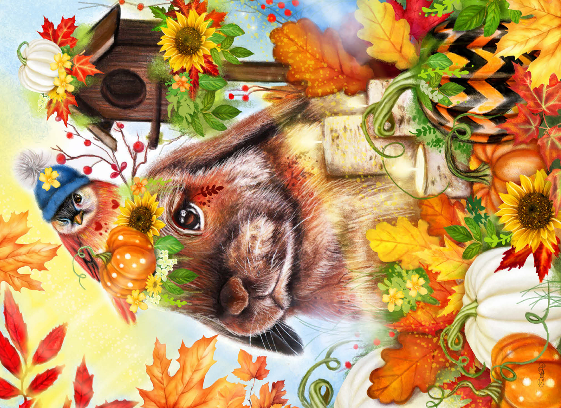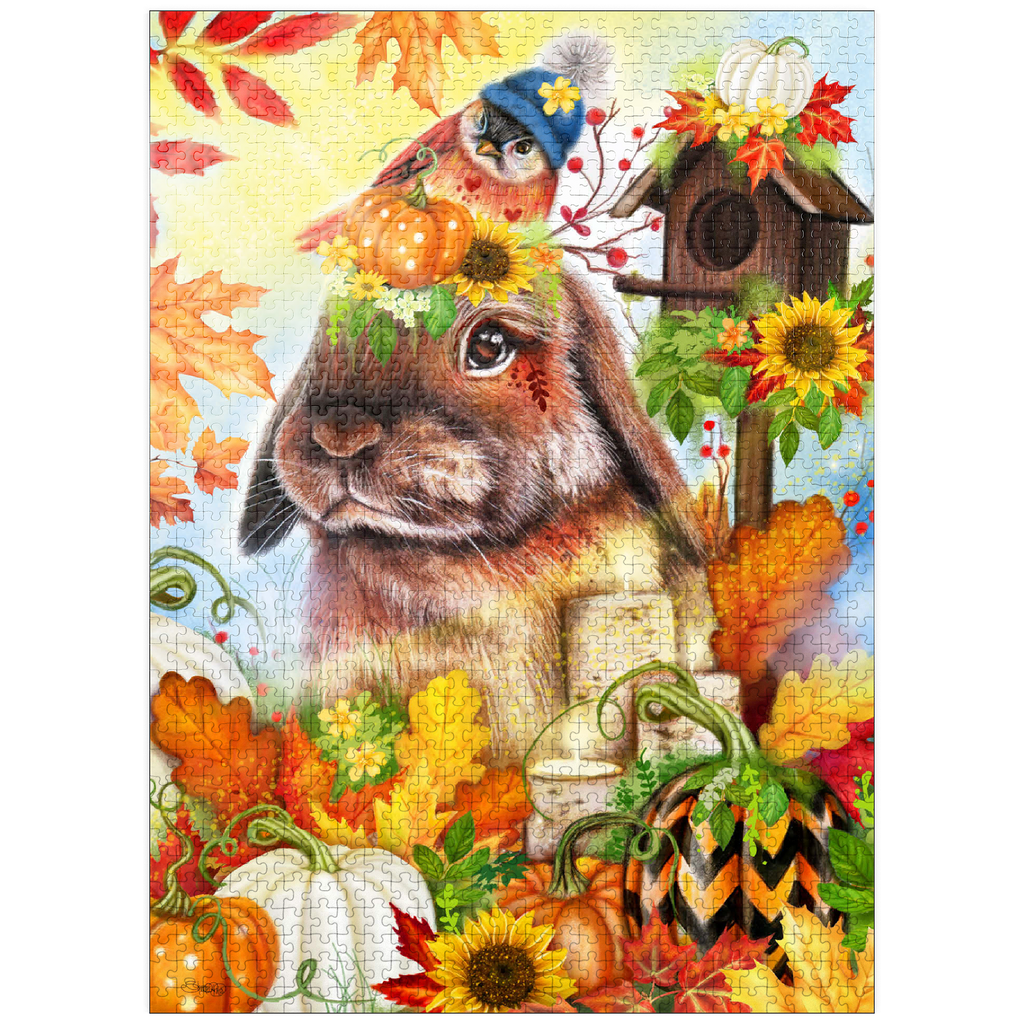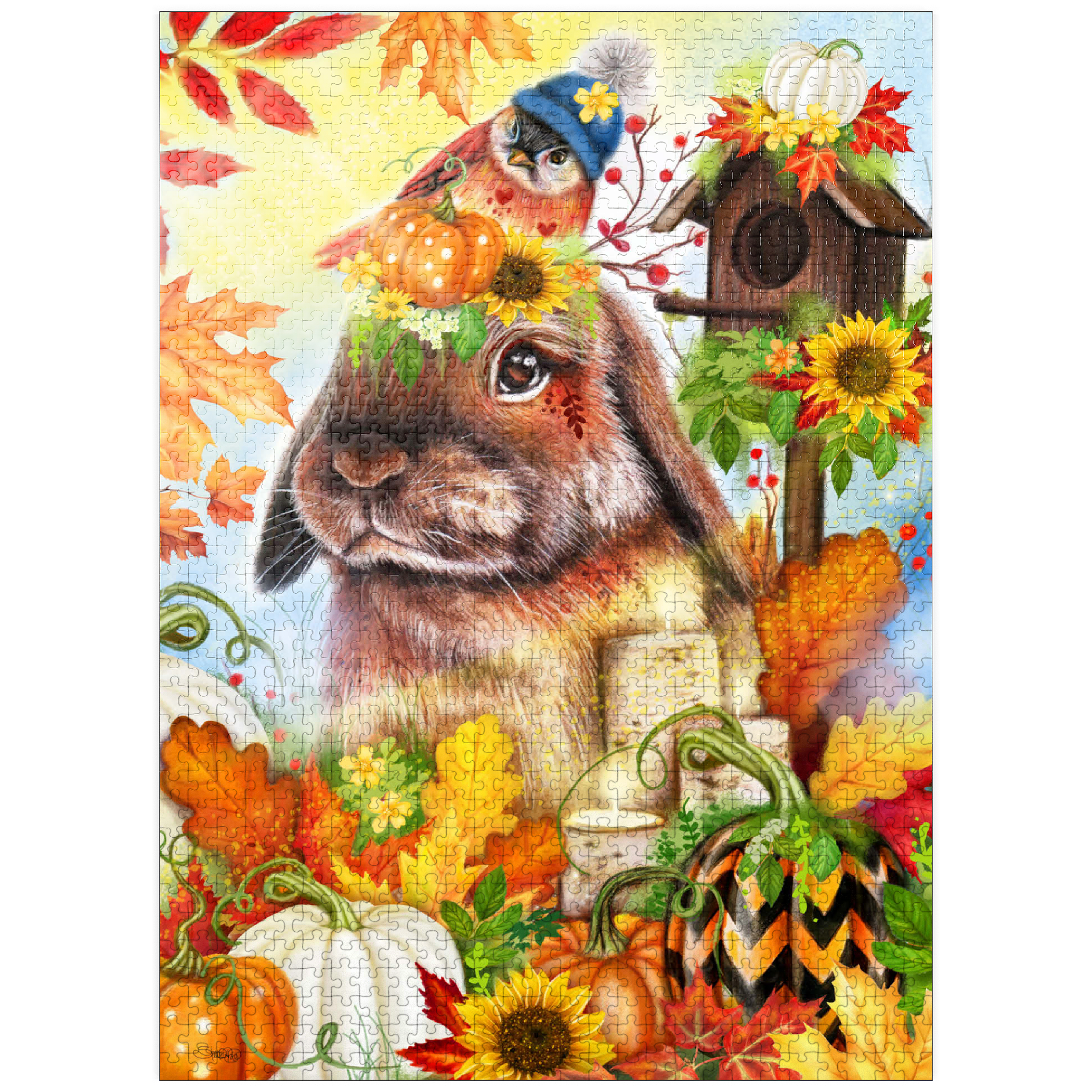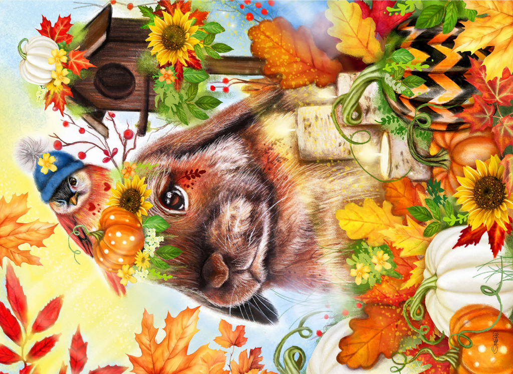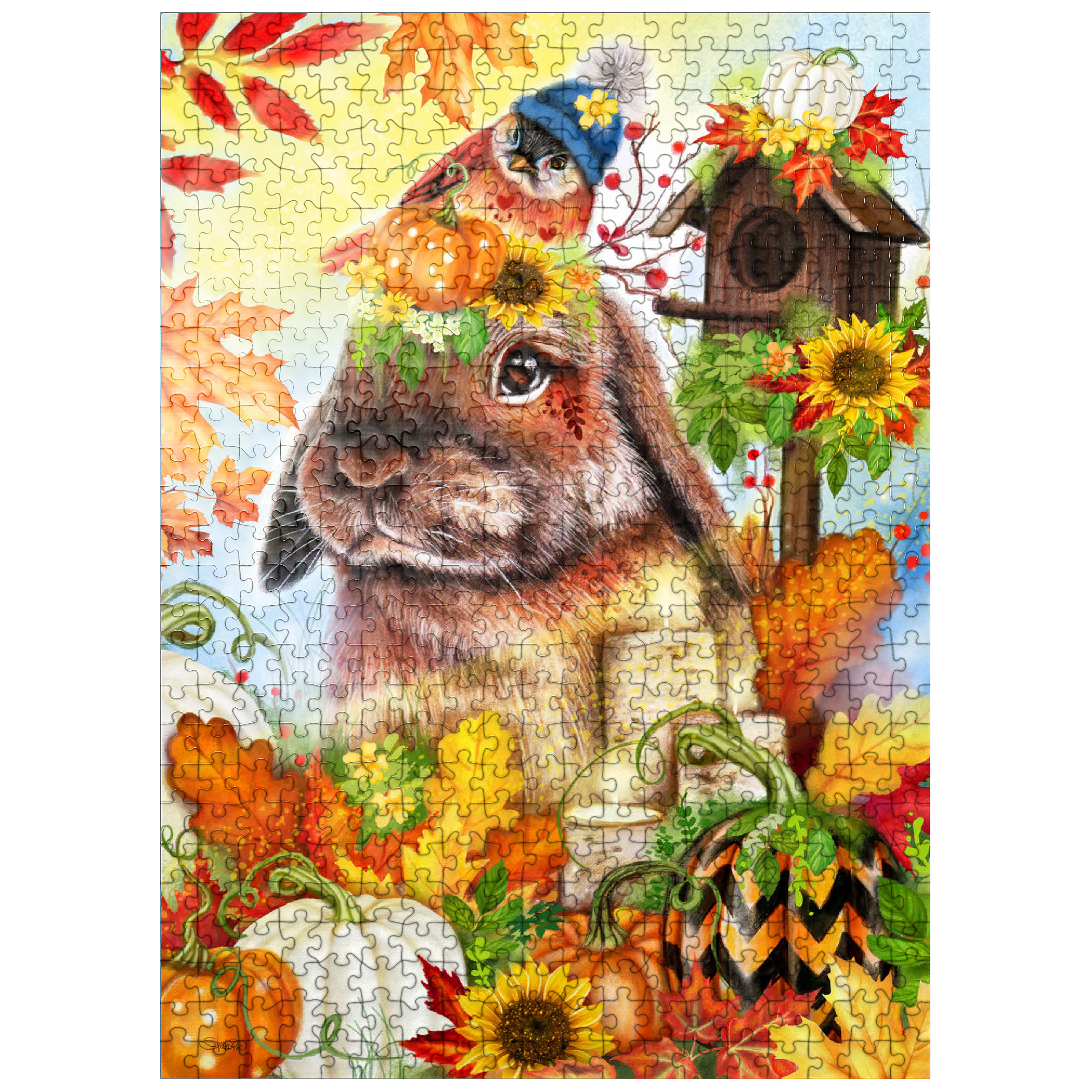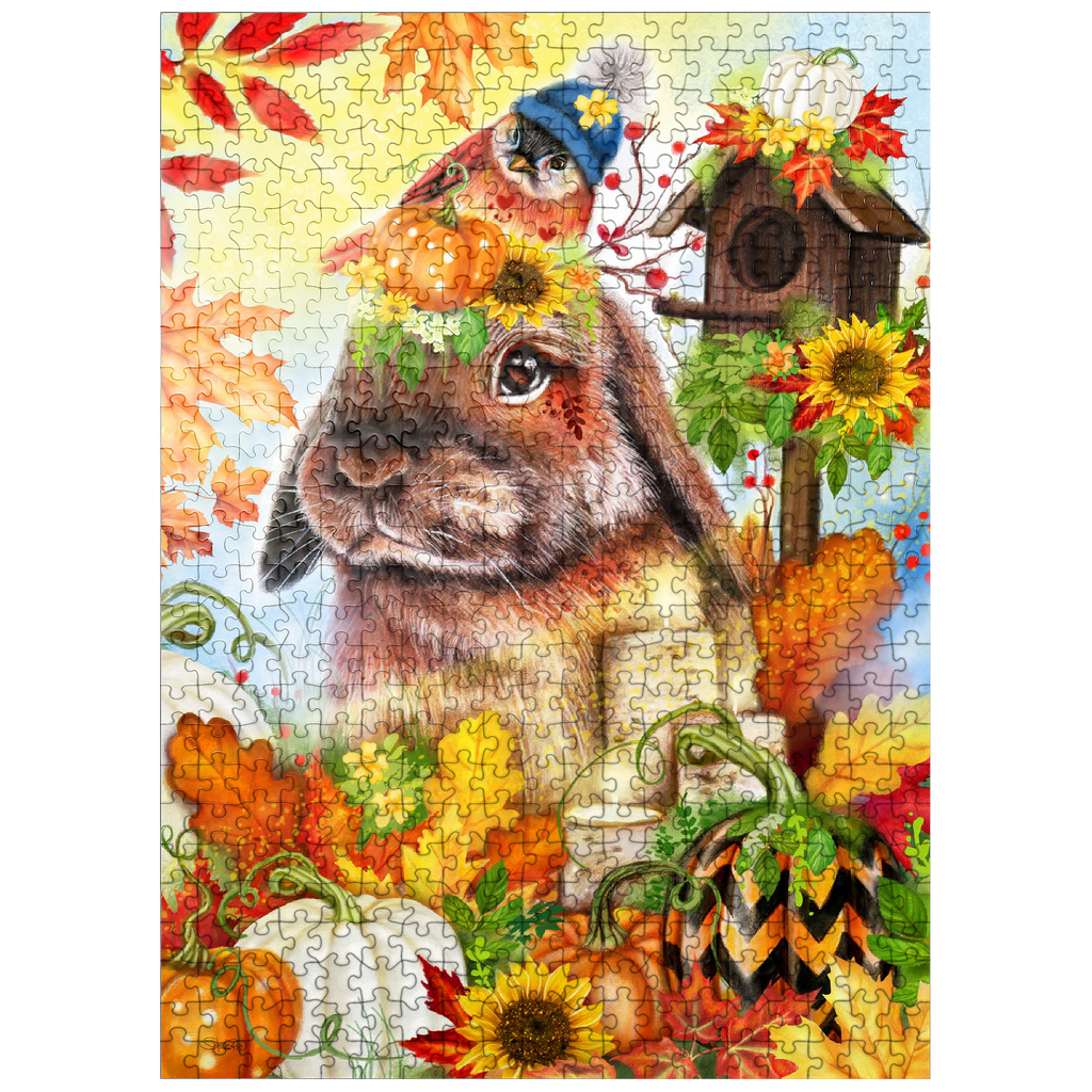 A charming and idyllic autumnal scene, masterfully illustrated. A gentle bunny, the central figure, is adorned with a sweet bird perched atop its head, creating a heartwarming sense of companionship. The surrounding environment bursts with the vibrant colors of fall foliage, intermingled with pumpkins and delicate flowers, evoking a feeling of rustic coziness. The scene is reminiscent of a pastoral garden, radiating warmth and tranquility. Inspired by the artistry of Sheena Pike, this imagery is ideally suited for a captivating puzzle, inviting the viewer into a world of gentle harmony and seasonal beaut