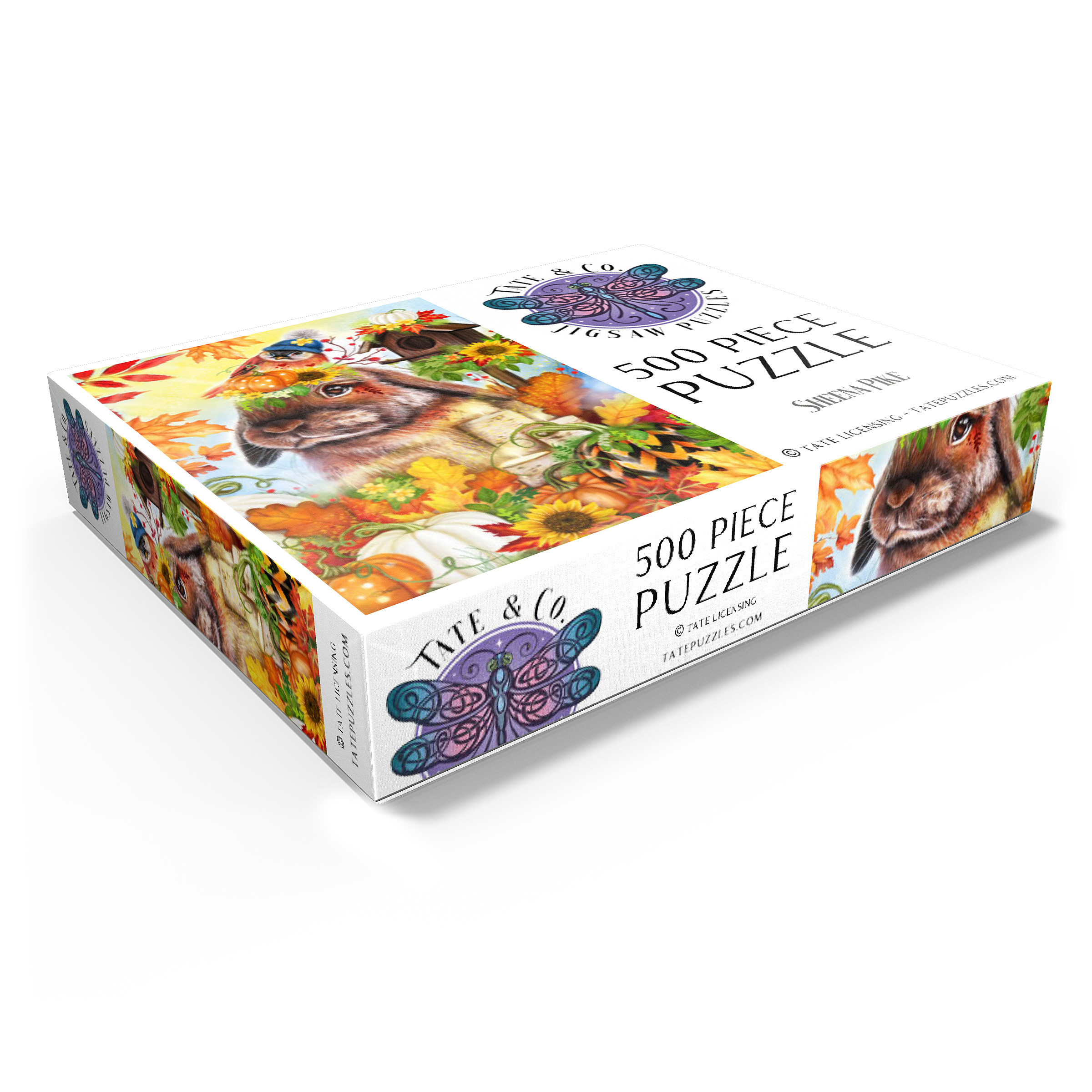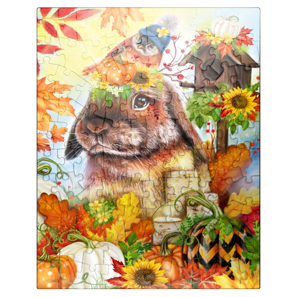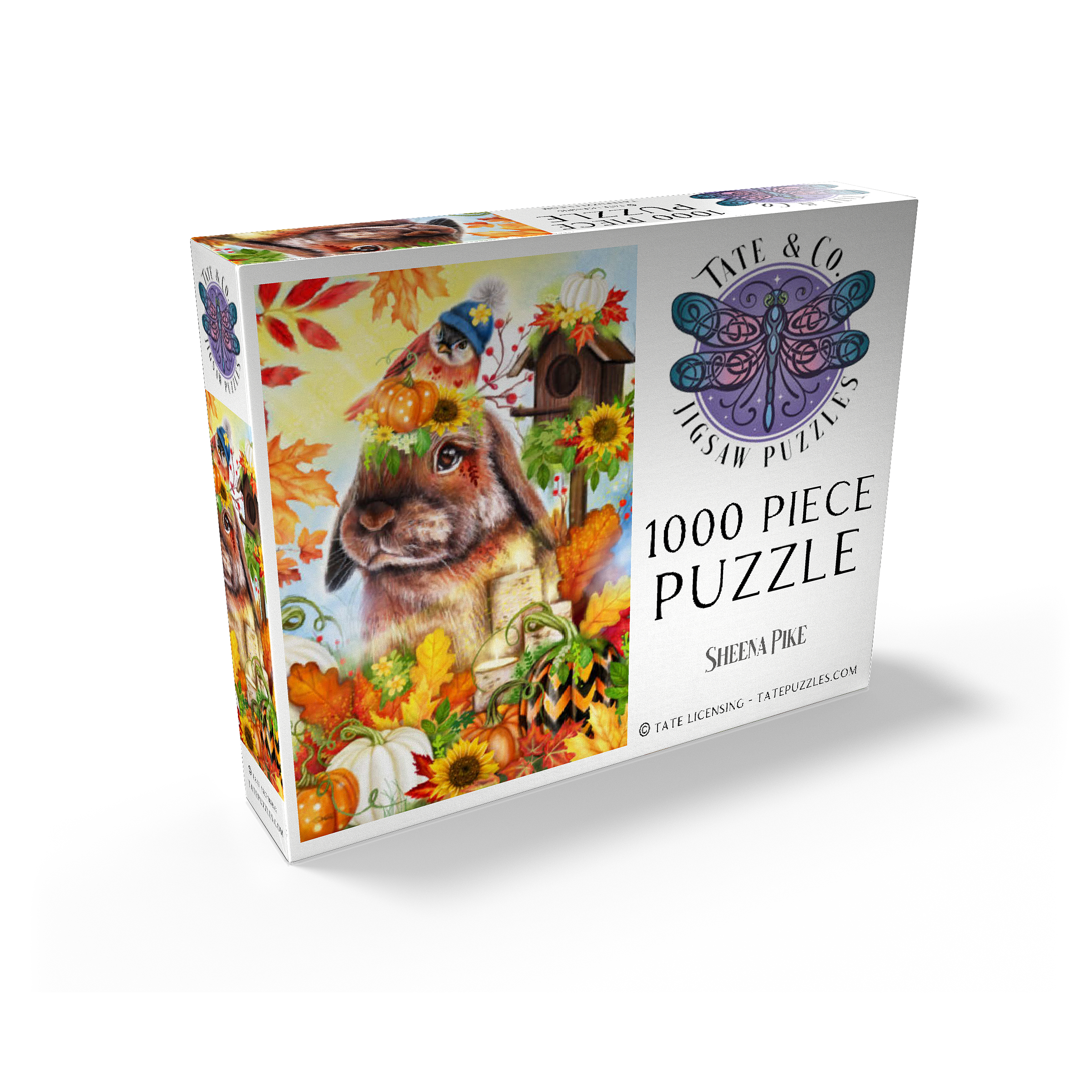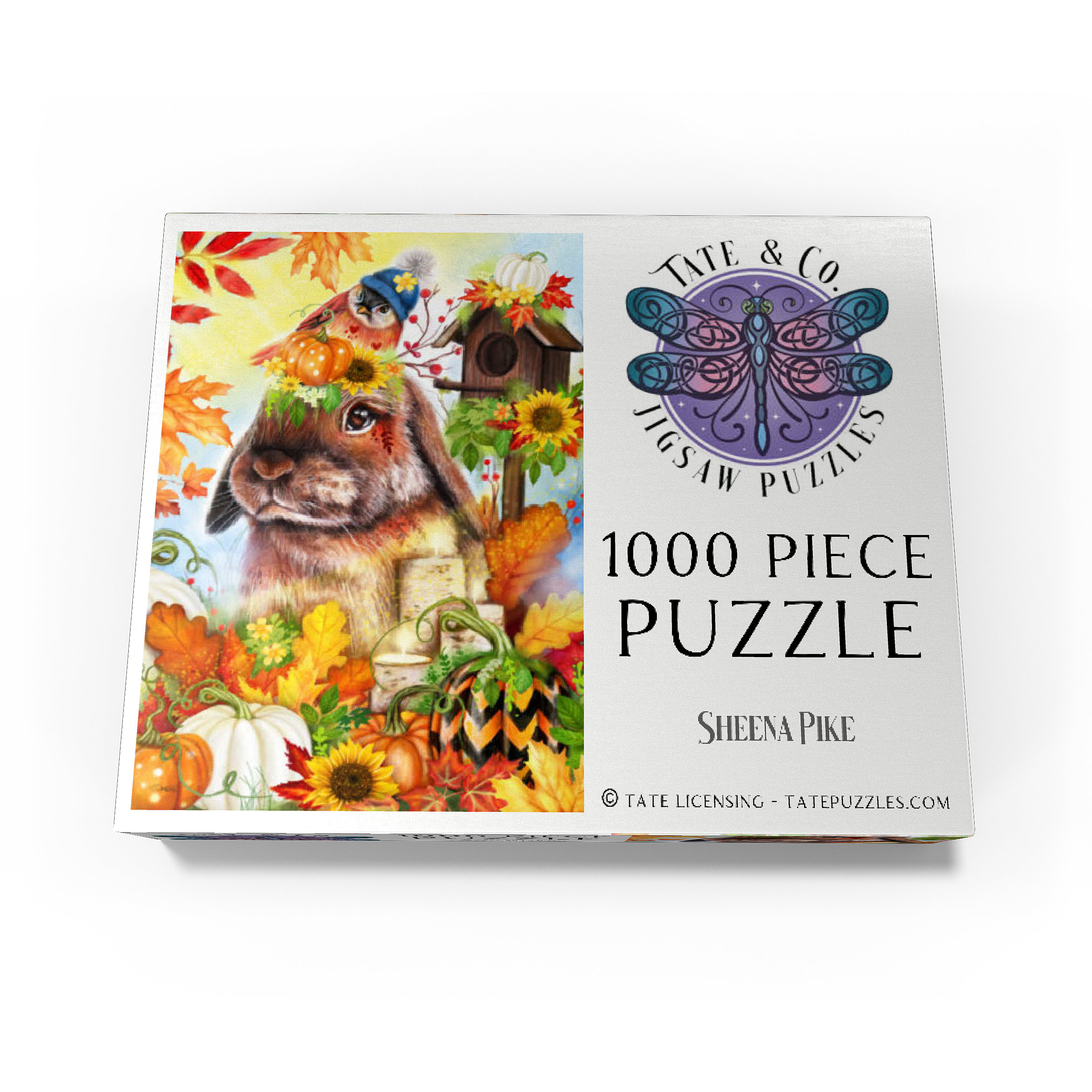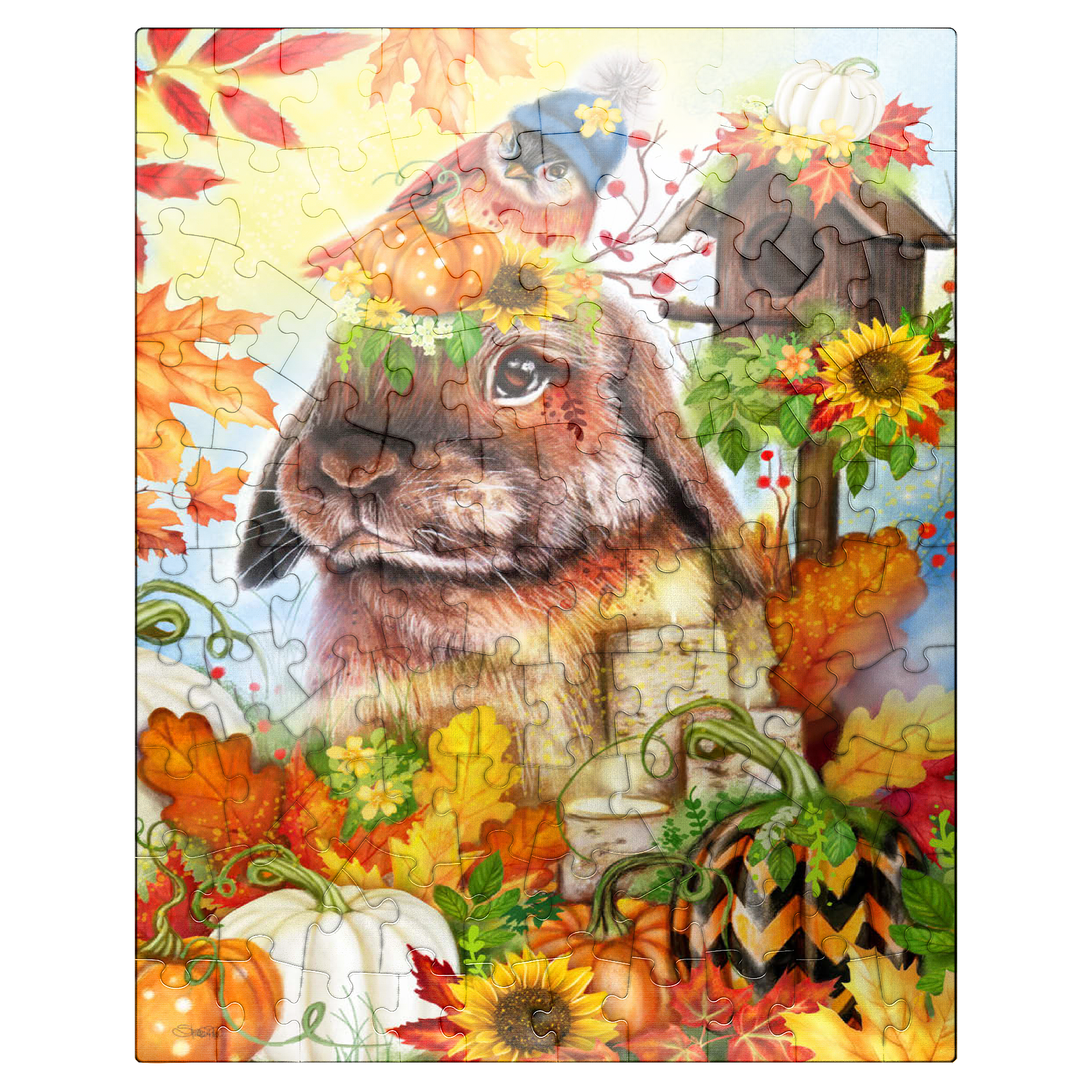 A charming and idyllic autumnal scene, masterfully illustrated. A gentle bunny, the central figure, is adorned with a sweet bird perched atop its head, creating a heartwarming sense of companionship. The surrounding environment bursts with the vibrant colors of fall foliage, intermingled with pumpkins and delicate flowers, evoking a feeling of rustic coziness. The scene is reminiscent of a pastoral garden, radiating warmth and tranquility. Inspired by the artistry of Sheena Pike, this imagery is ideally suited for a captivating puzzle, inviting the viewer into a world of gentle harmony and seasonal beaut