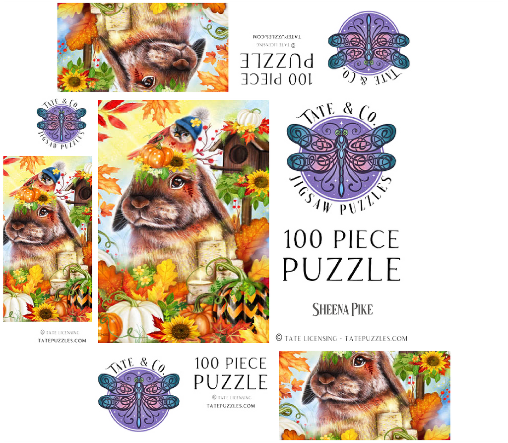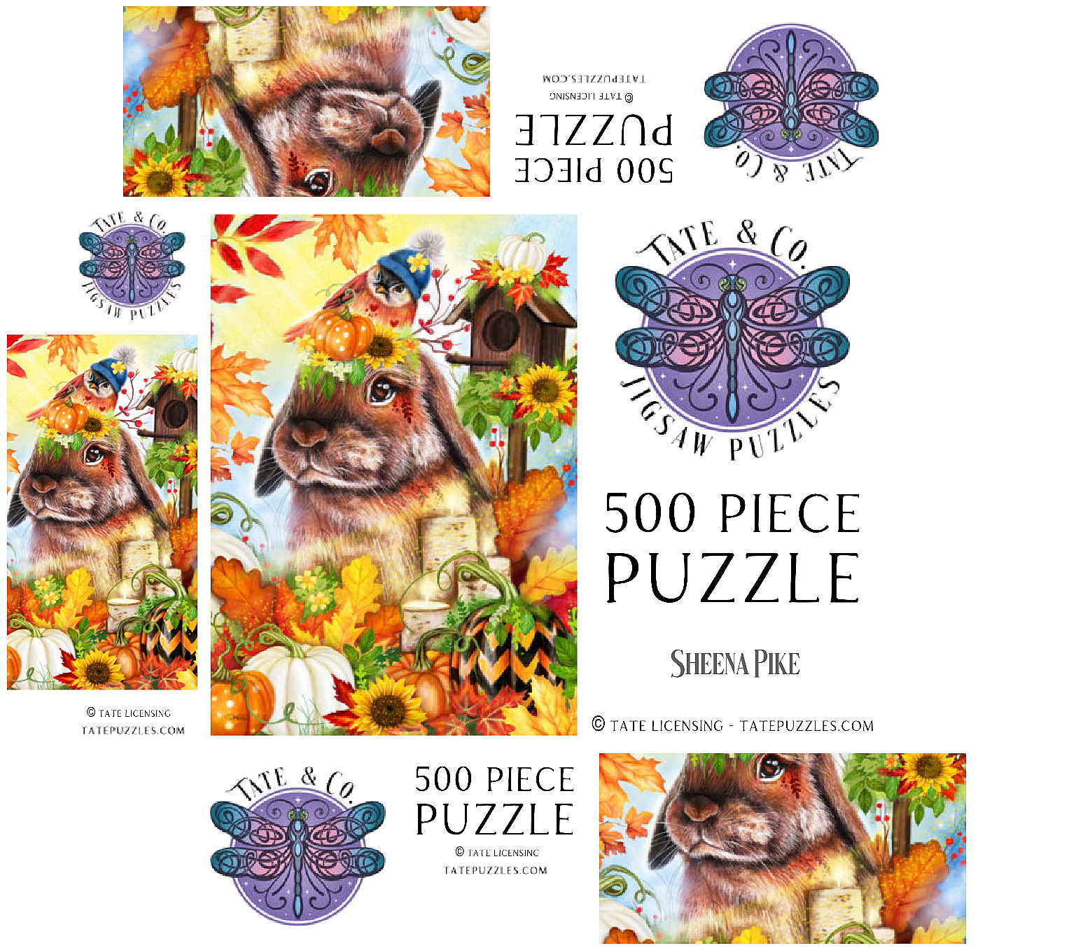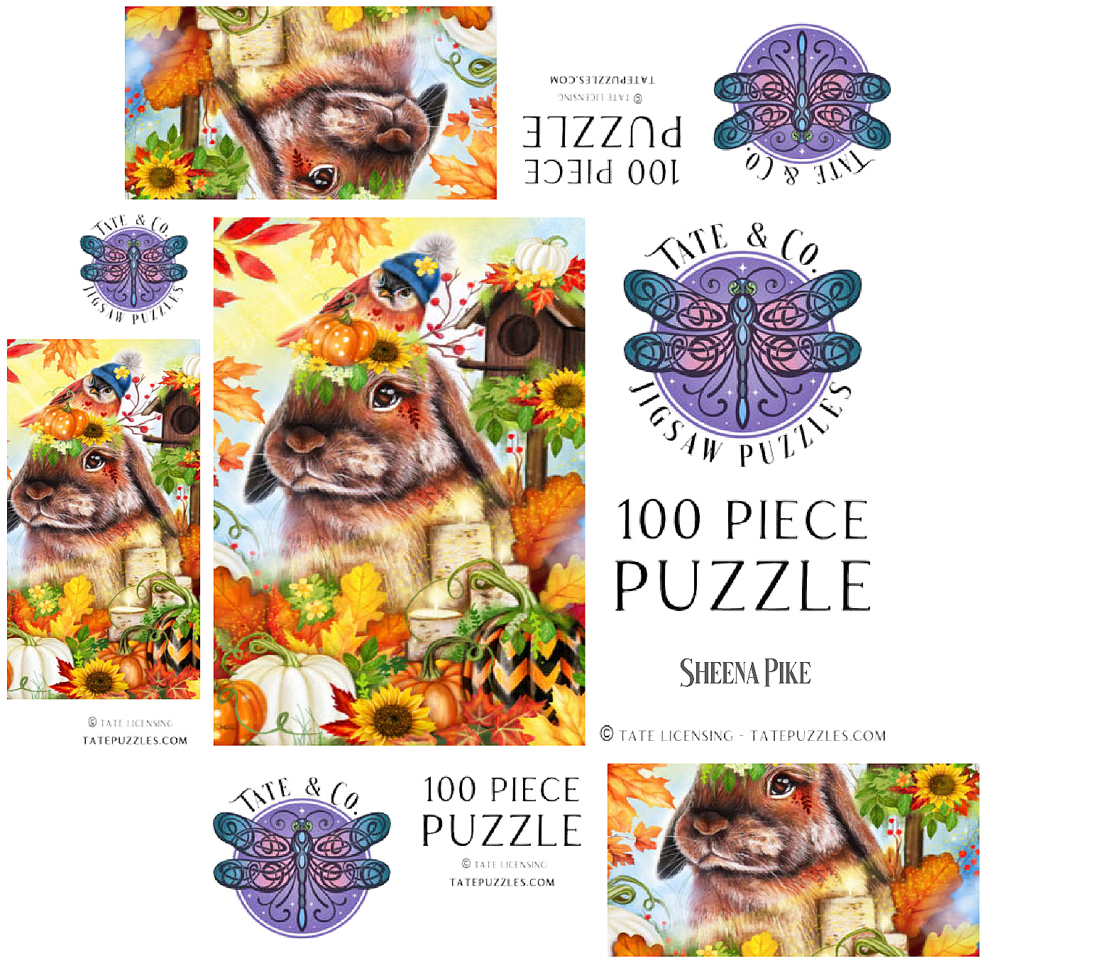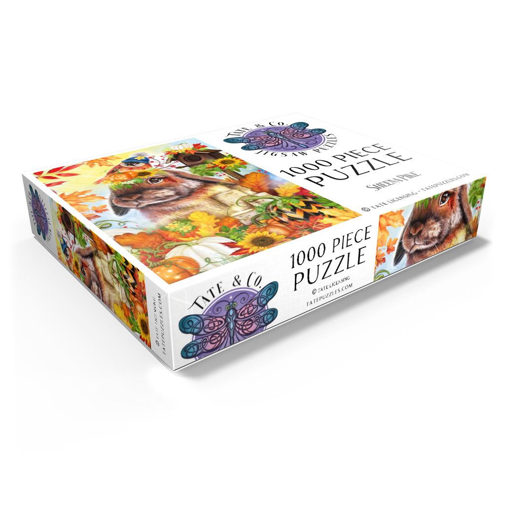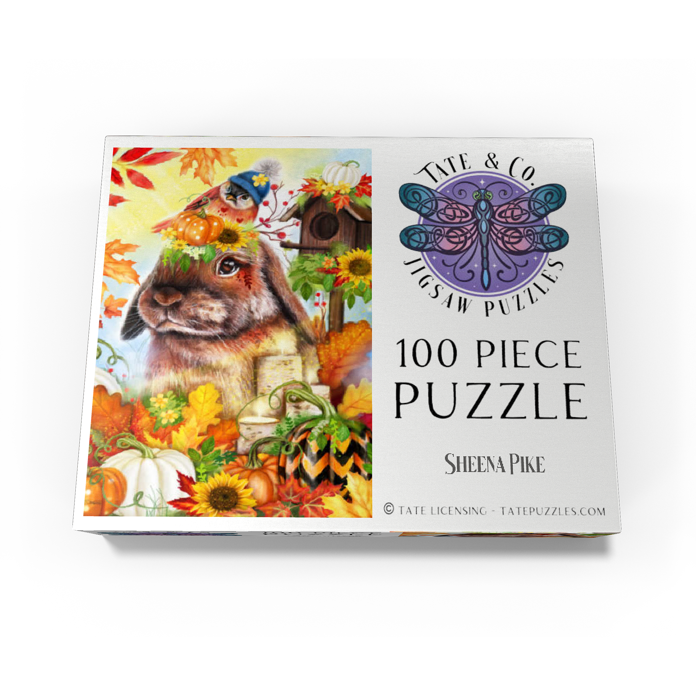 A charming and idyllic autumnal scene, masterfully illustrated. A gentle bunny, the central figure, is adorned with a sweet bird perched atop its head, creating a heartwarming sense of companionship. The surrounding environment bursts with the vibrant colors of fall foliage, intermingled with pumpkins and delicate flowers, evoking a feeling of rustic coziness. The scene is reminiscent of a pastoral garden, radiating warmth and tranquility. Inspired by the artistry of Sheena Pike, this imagery is ideally suited for a captivating puzzle, inviting the viewer into a world of gentle harmony and seasonal beaut