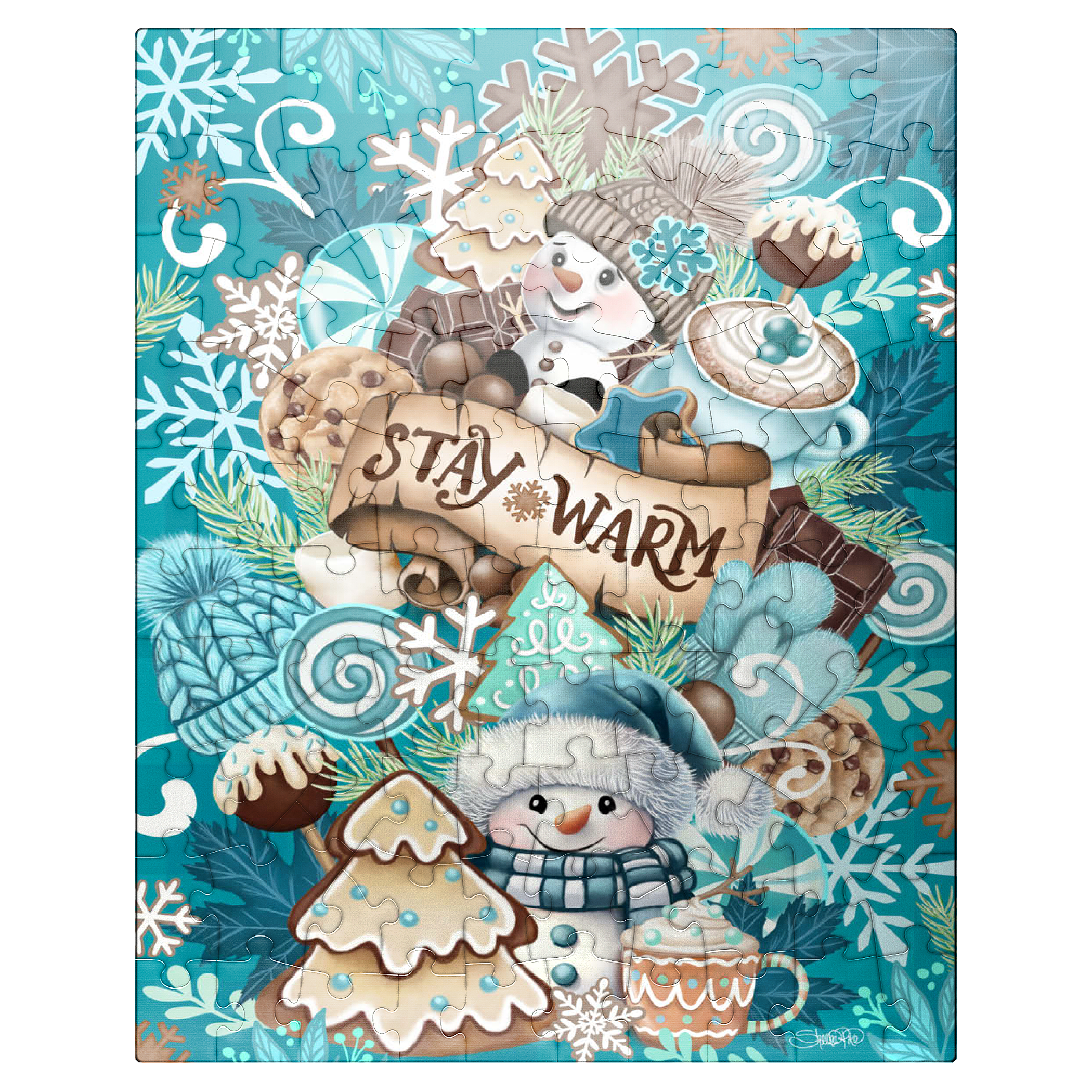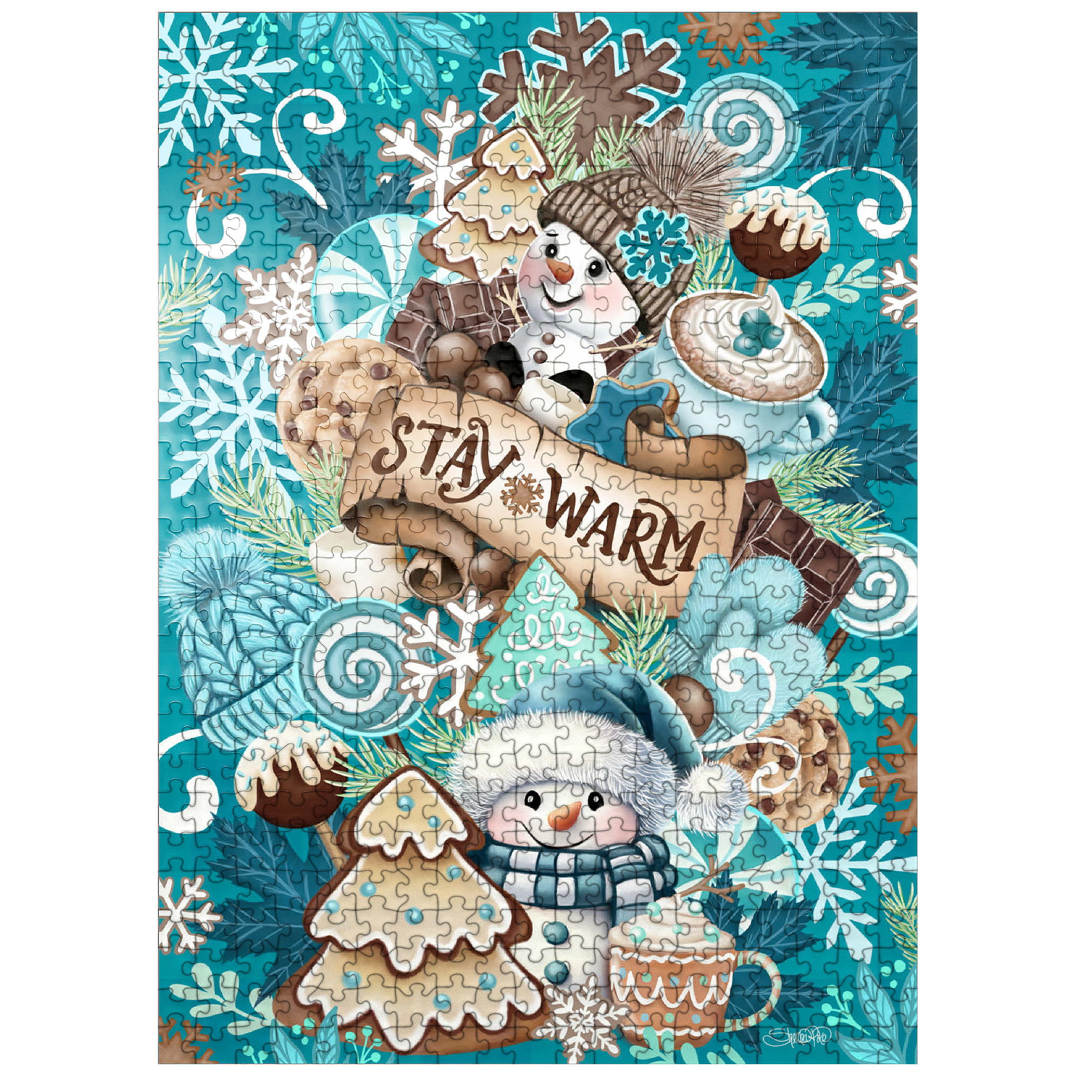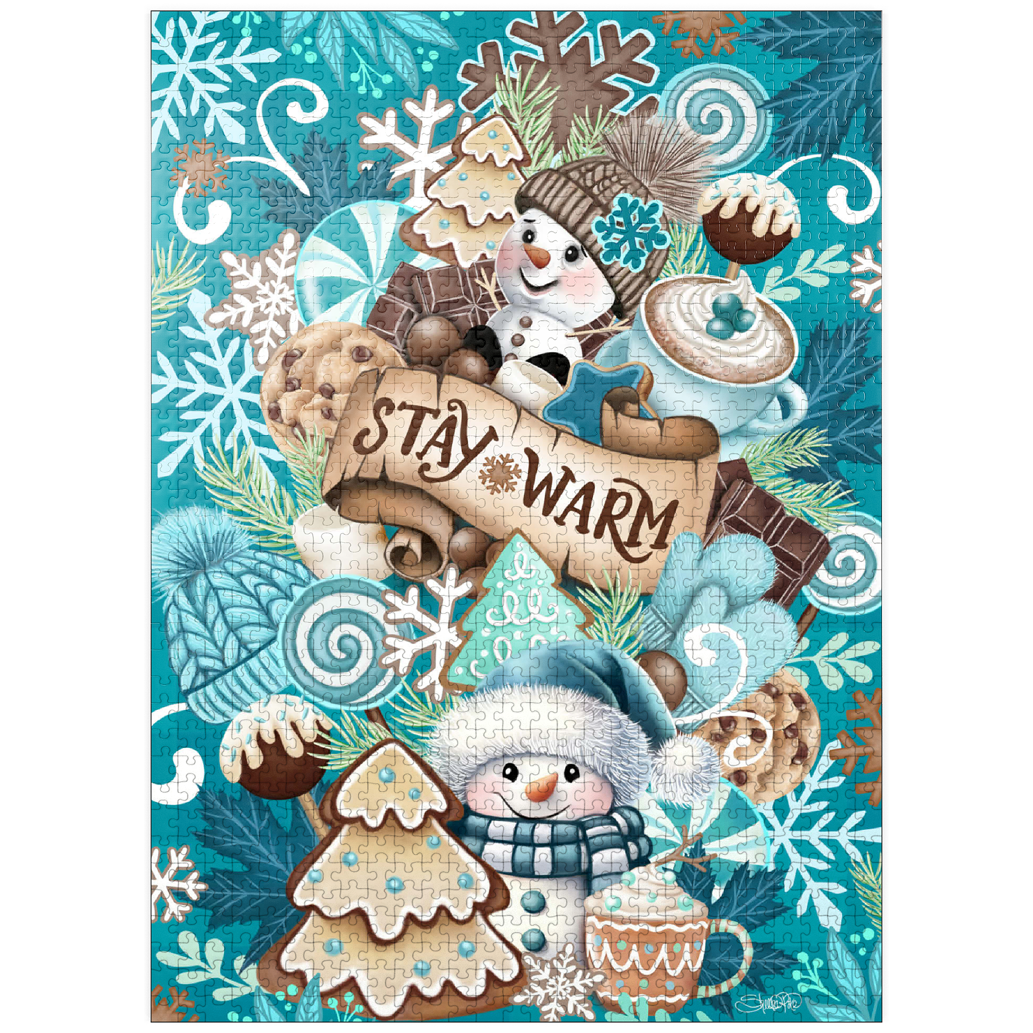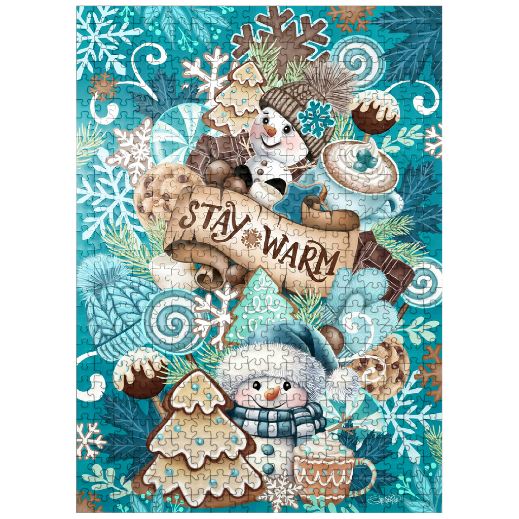holiday cheer and cozy comforts. this detailed composition features an adorable stack of festive items centered around two charming snowmen, each bundled up in their winter gear. the rich, teal-blue background is covered in stylized snowflakes and winter leaves, creating a stunning backdrop for the warm, edible elements. look forward to piecing together delicious gingerbread cookies shaped like Christmas trees and stars, chocolate chip cookies, tempting hot cocoa mugs topped with whipped cream, and spiral candies. a central banner proclaiming -STAY WARM- ties the entire cozy theme together. this puzzle is an essential addition to any seasonal collection, offering a fun, immersive experience for Christmas lovers, foodies, and winter enthusiasts