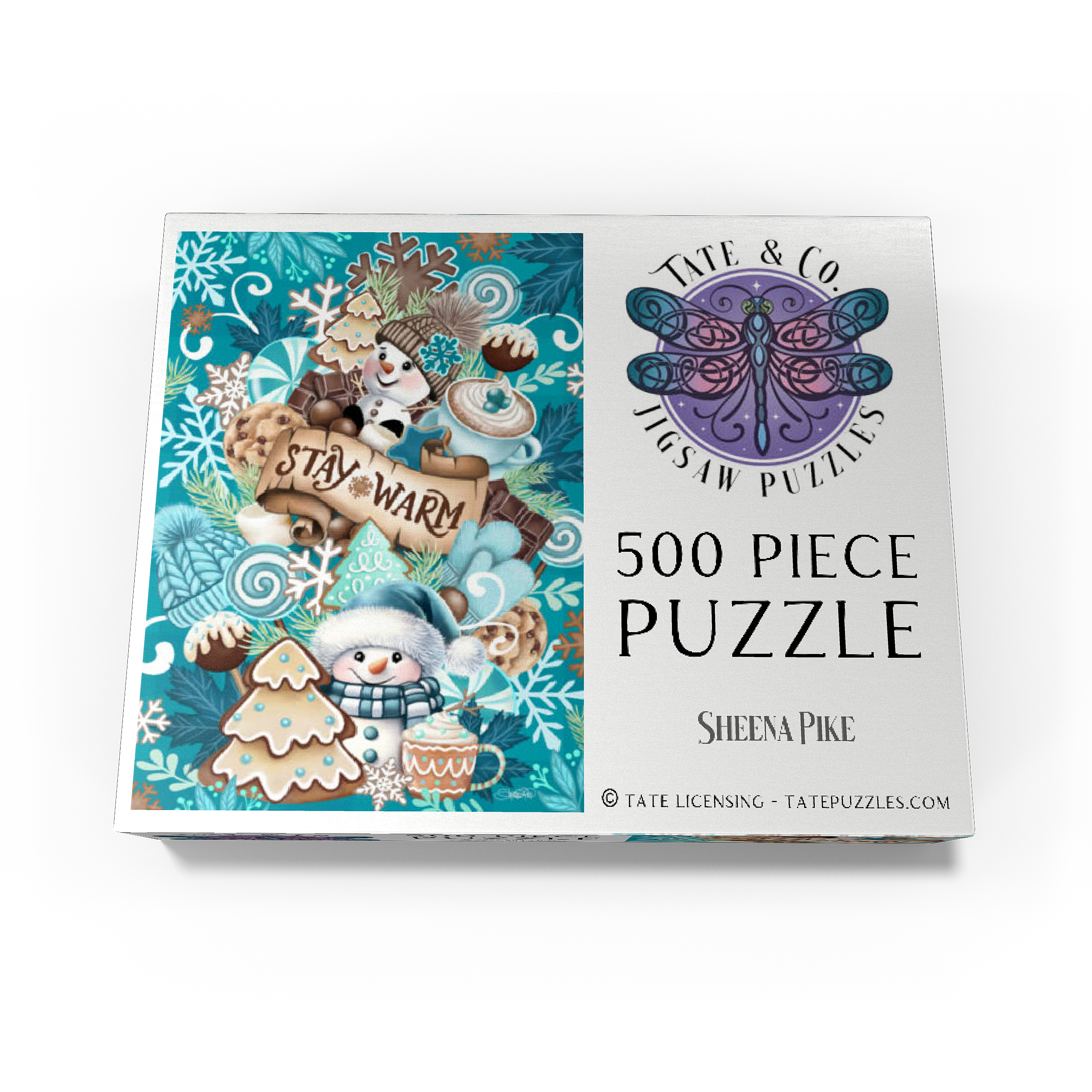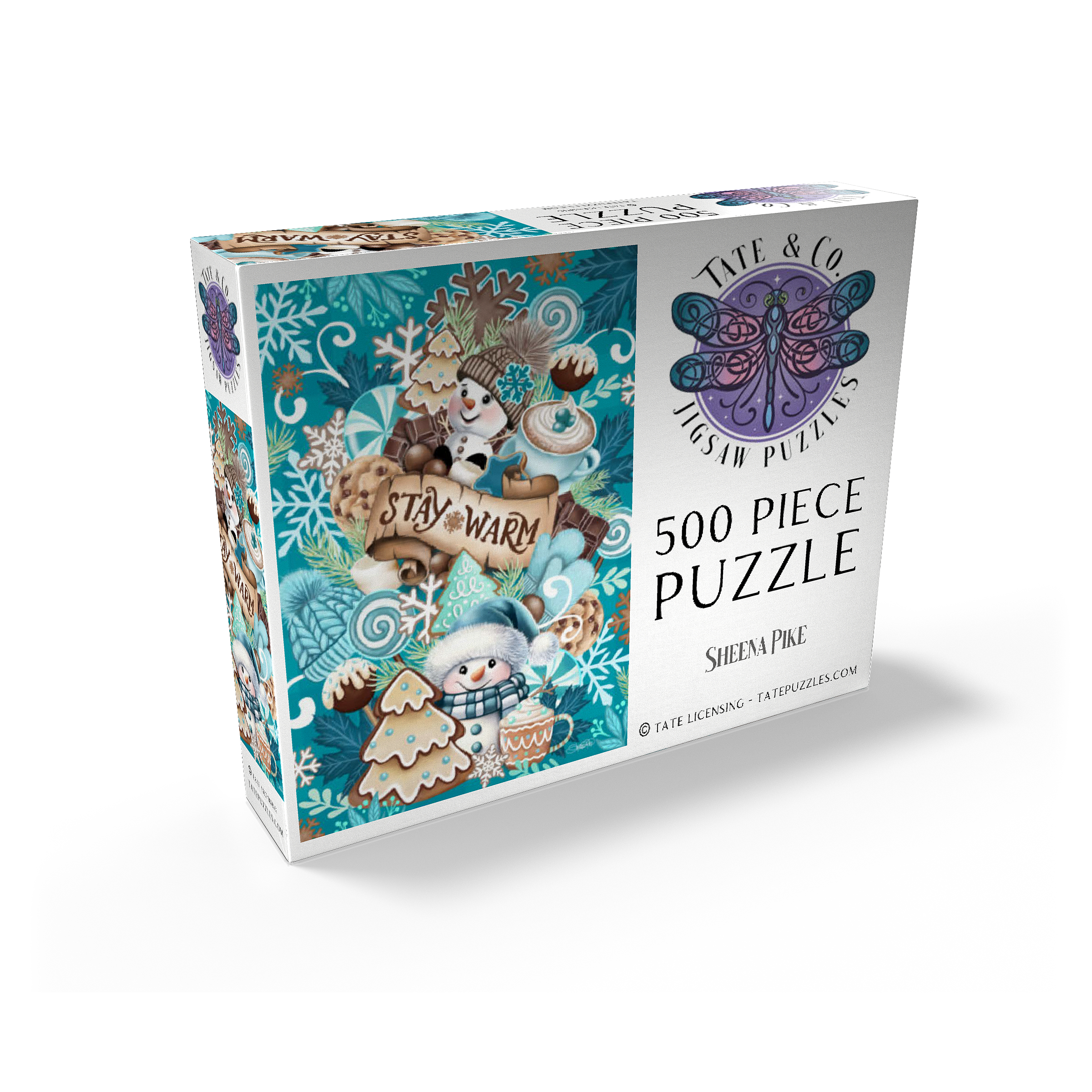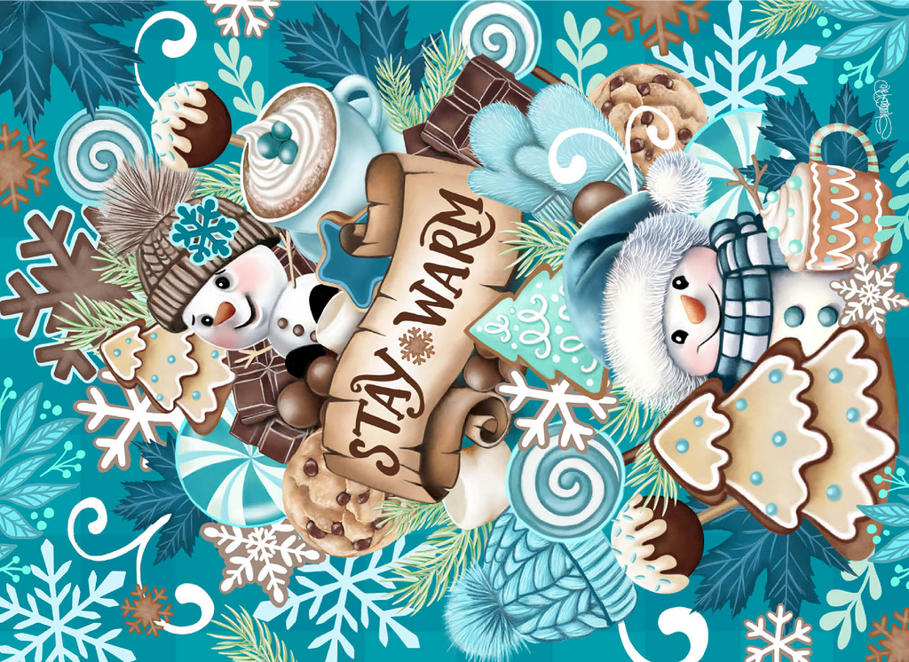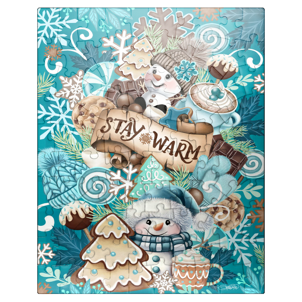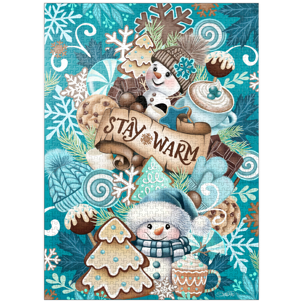 holiday cheer and cozy comforts. this detailed composition features an adorable stack of festive items centered around two charming snowmen, each bundled up in their winter gear. the rich, teal-blue background is covered in stylized snowflakes and winter leaves, creating a stunning backdrop for the warm, edible elements. look forward to piecing together delicious gingerbread cookies shaped like Christmas trees and stars, chocolate chip cookies, tempting hot cocoa mugs topped with whipped cream, and spiral candies. a central banner proclaiming -STAY WARM- ties the entire cozy theme together. this puzzle is an essential addition to any seasonal collection, offering a fun, immersive experience for Christmas lovers, foodies, and winter enthusiasts