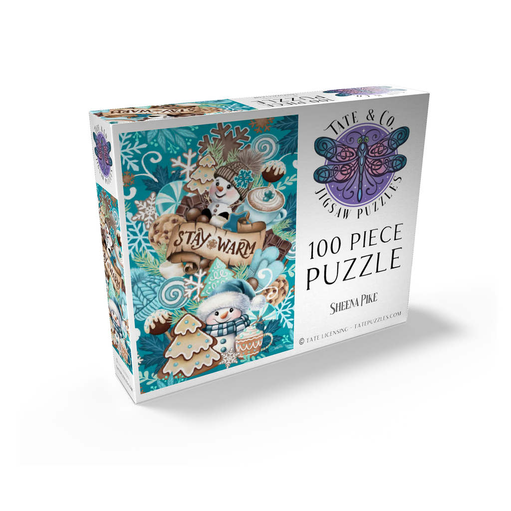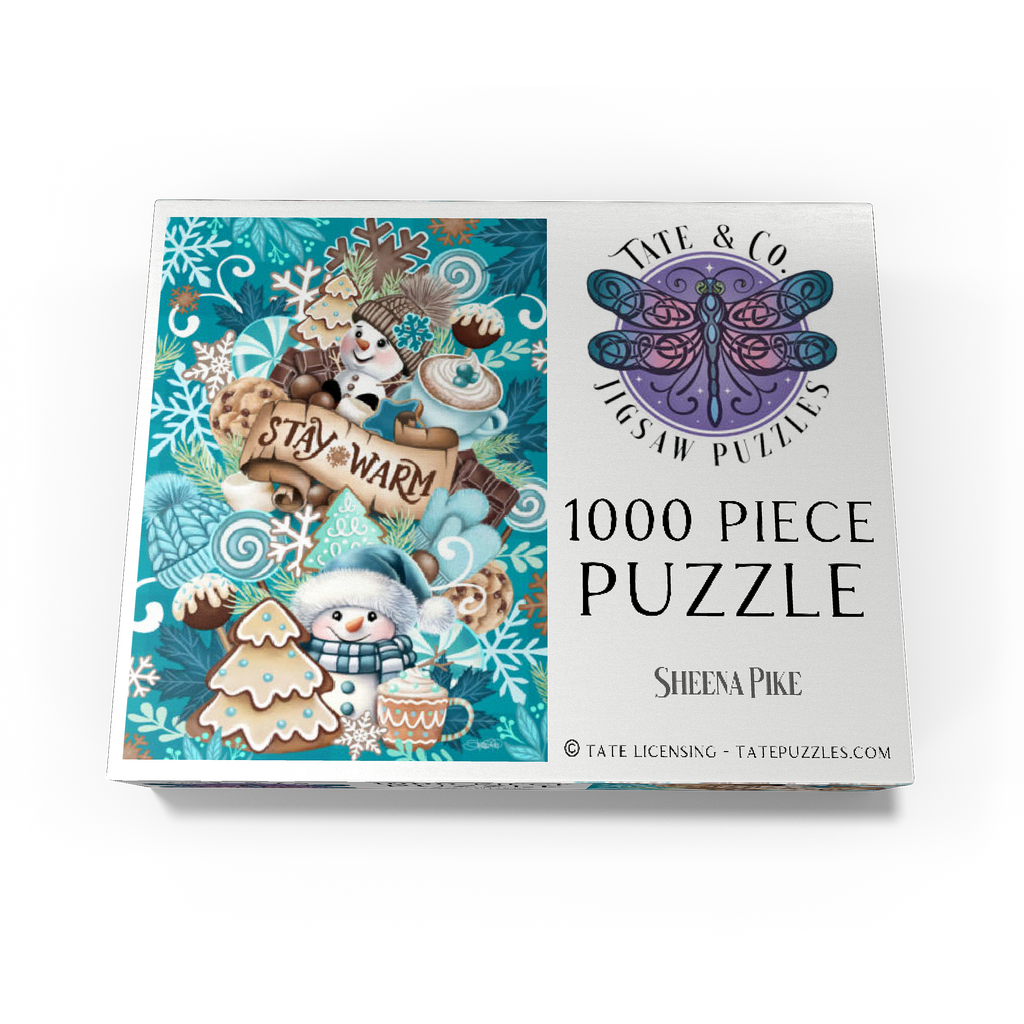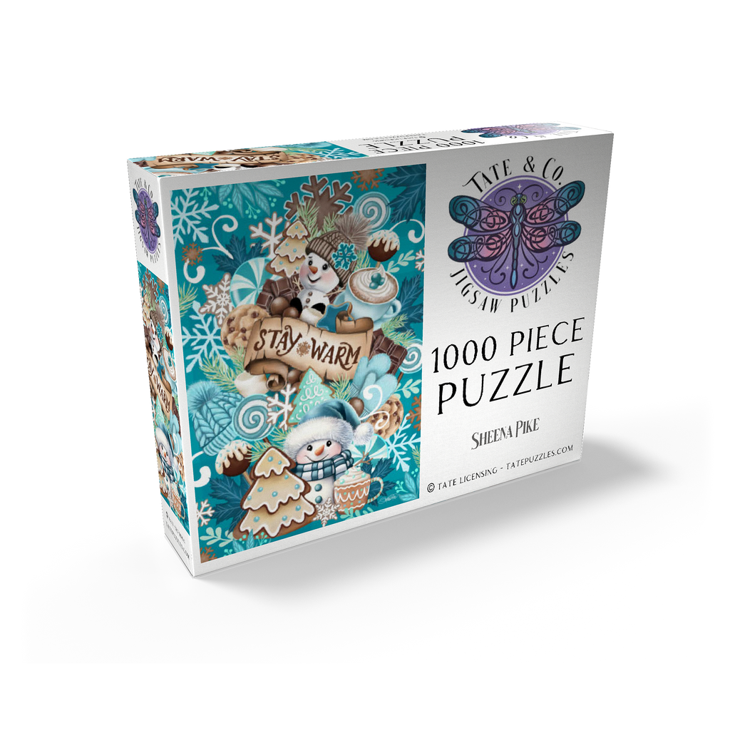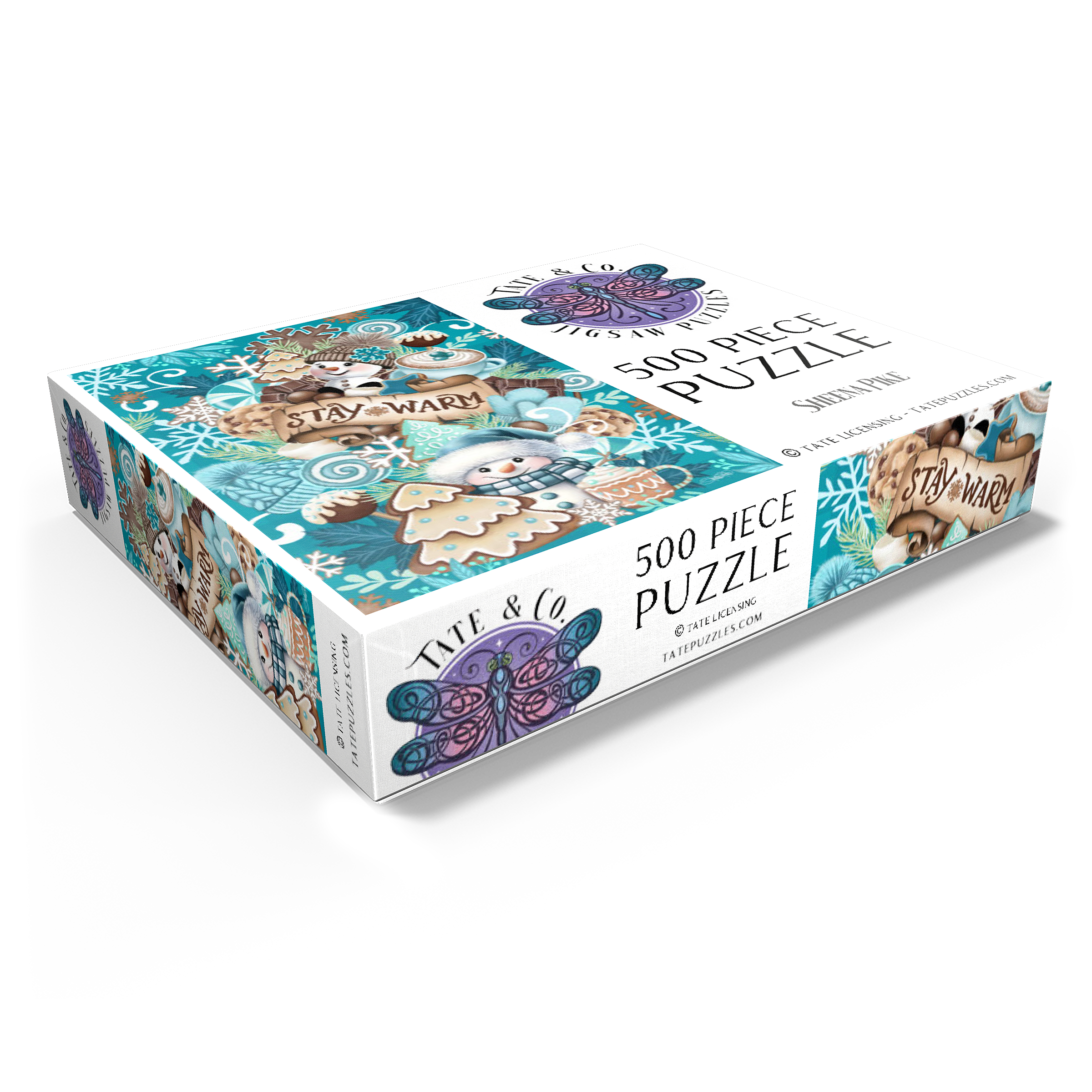 holiday cheer and cozy comforts. this detailed composition features an adorable stack of festive items centered around two charming snowmen, each bundled up in their winter gear. the rich, teal-blue background is covered in stylized snowflakes and winter leaves, creating a stunning backdrop for the warm, edible elements. look forward to piecing together delicious gingerbread cookies shaped like Christmas trees and stars, chocolate chip cookies, tempting hot cocoa mugs topped with whipped cream, and spiral candies. a central banner proclaiming -STAY WARM- ties the entire cozy theme together. this puzzle is an essential addition to any seasonal collection, offering a fun, immersive experience for Christmas lovers, foodies, and winter enthusiasts