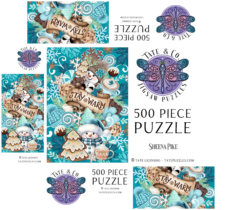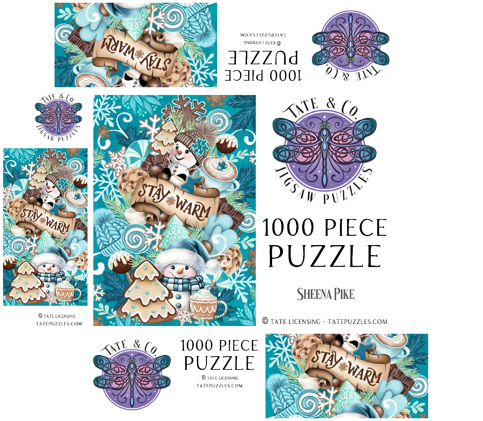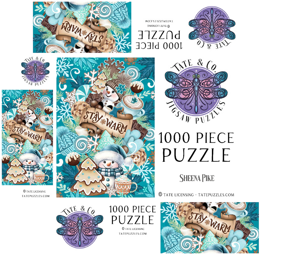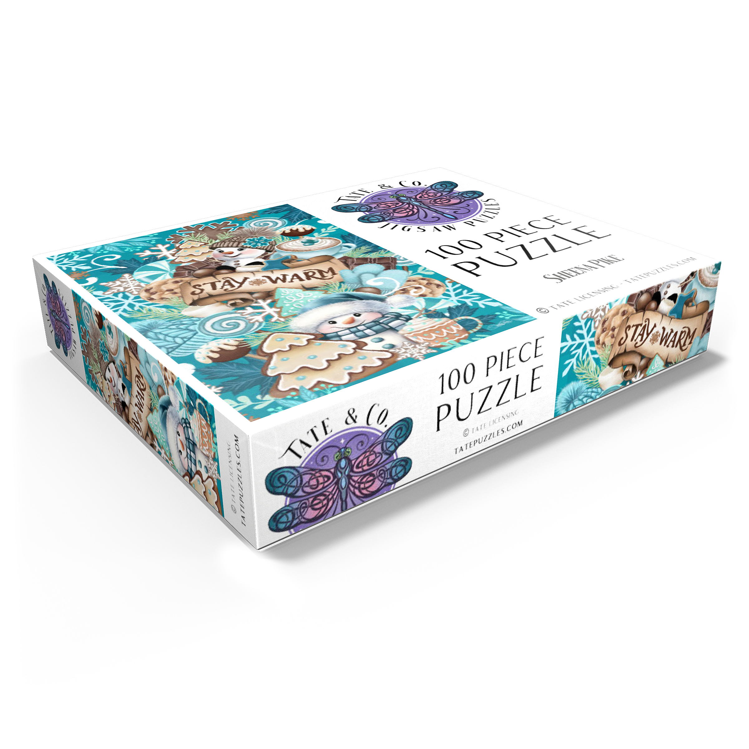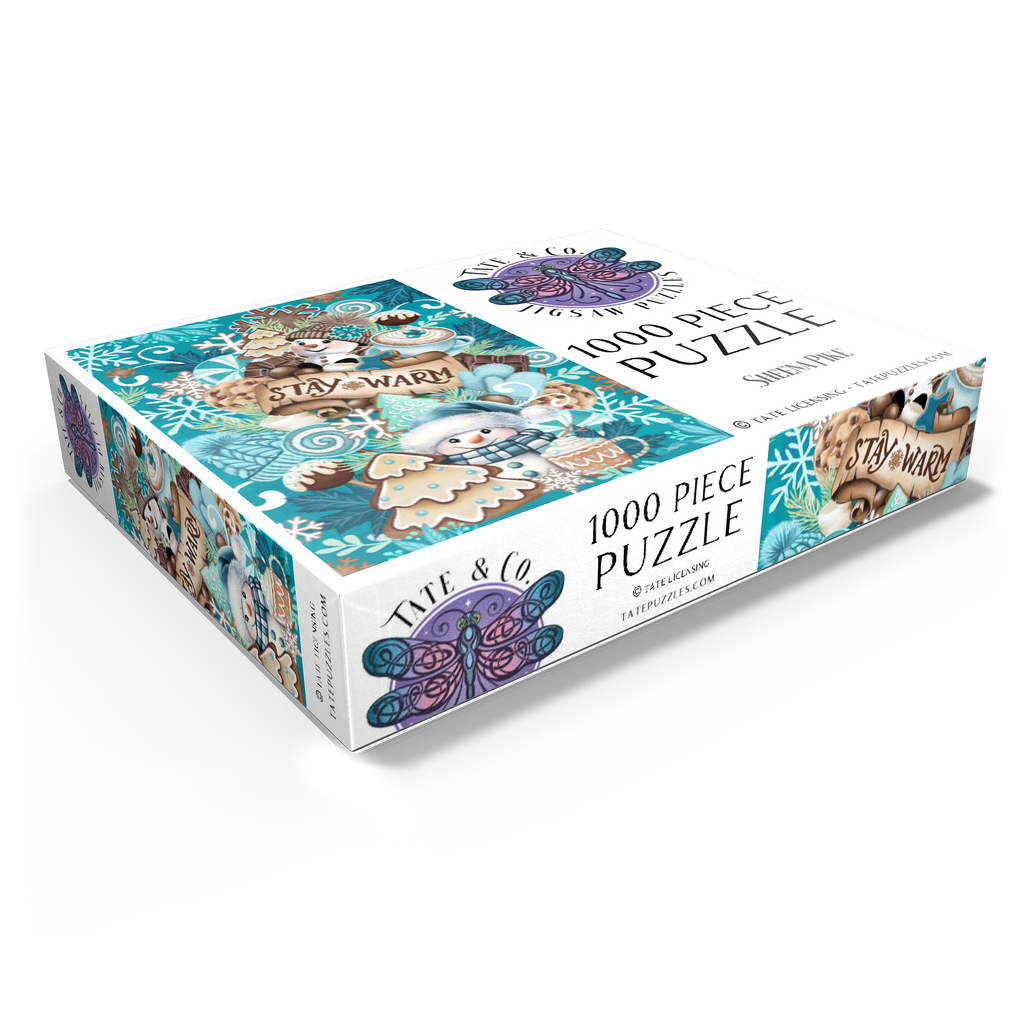 holiday cheer and cozy comforts. this detailed composition features an adorable stack of festive items centered around two charming snowmen, each bundled up in their winter gear. the rich, teal-blue background is covered in stylized snowflakes and winter leaves, creating a stunning backdrop for the warm, edible elements. look forward to piecing together delicious gingerbread cookies shaped like Christmas trees and stars, chocolate chip cookies, tempting hot cocoa mugs topped with whipped cream, and spiral candies. a central banner proclaiming -STAY WARM- ties the entire cozy theme together. this puzzle is an essential addition to any seasonal collection, offering a fun, immersive experience for Christmas lovers, foodies, and winter enthusiasts