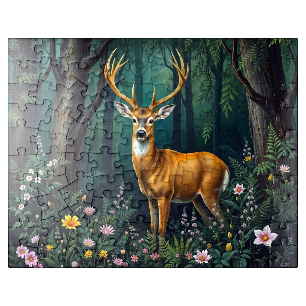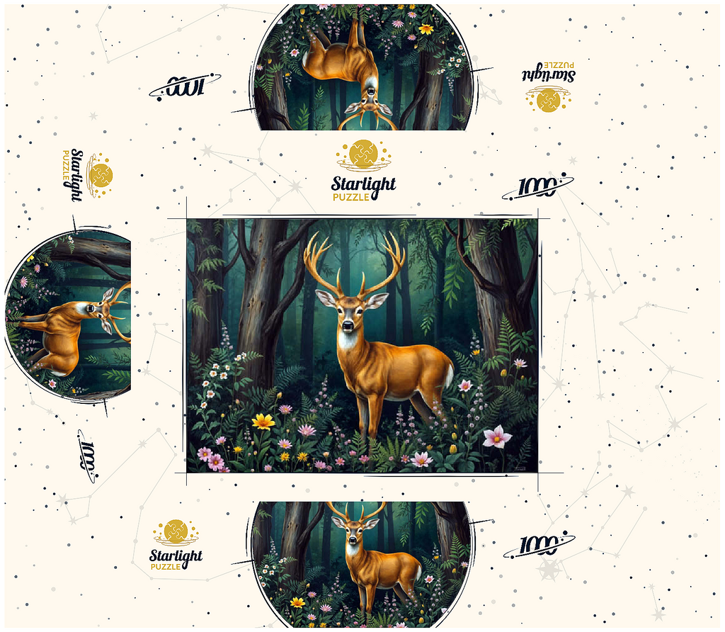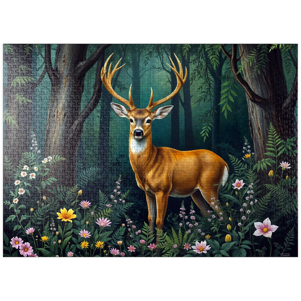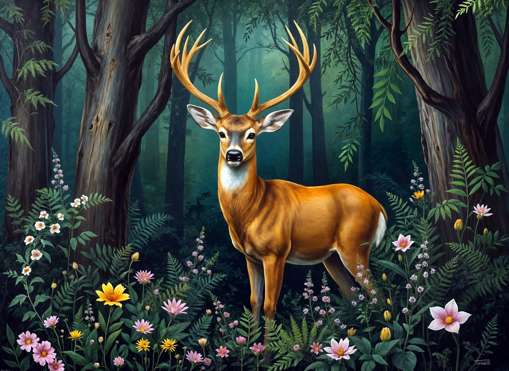 A captivating digital artwork featuring a majestic deer standing gracefully in a lush forest clearing. The deer's golden-brown coat and impressive antlers stand out against the vibrant green foliage of the dense woodland. Soft light filters through the tall trees, casting a serene glow on the forest floor, which is adorned with delicate wildflowers in shades of pink, yellow, and white. The peaceful ambiance and detailed artistry create a tranquil scene that is perfect for nature lovers, wildlife enthusiasts, and rustic decor fans. Ideal as wall art or a statement piece in cabins, lodges, or nature-themed spaces.