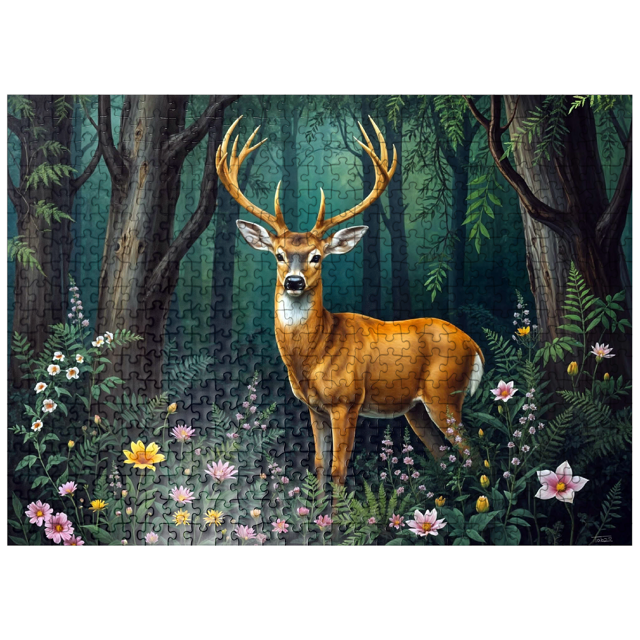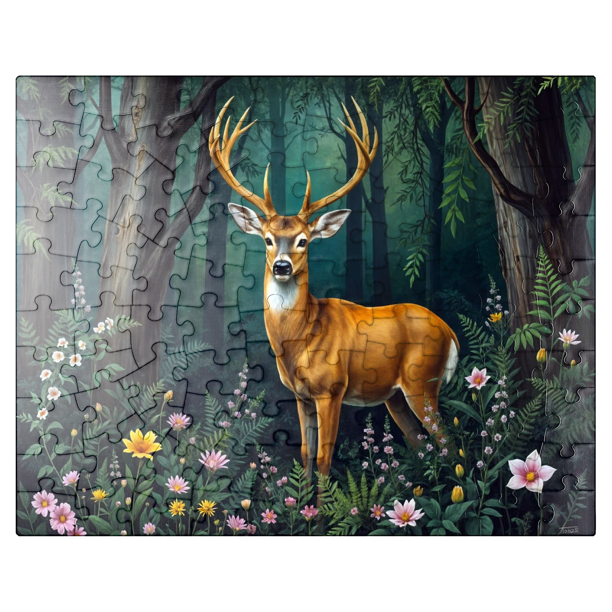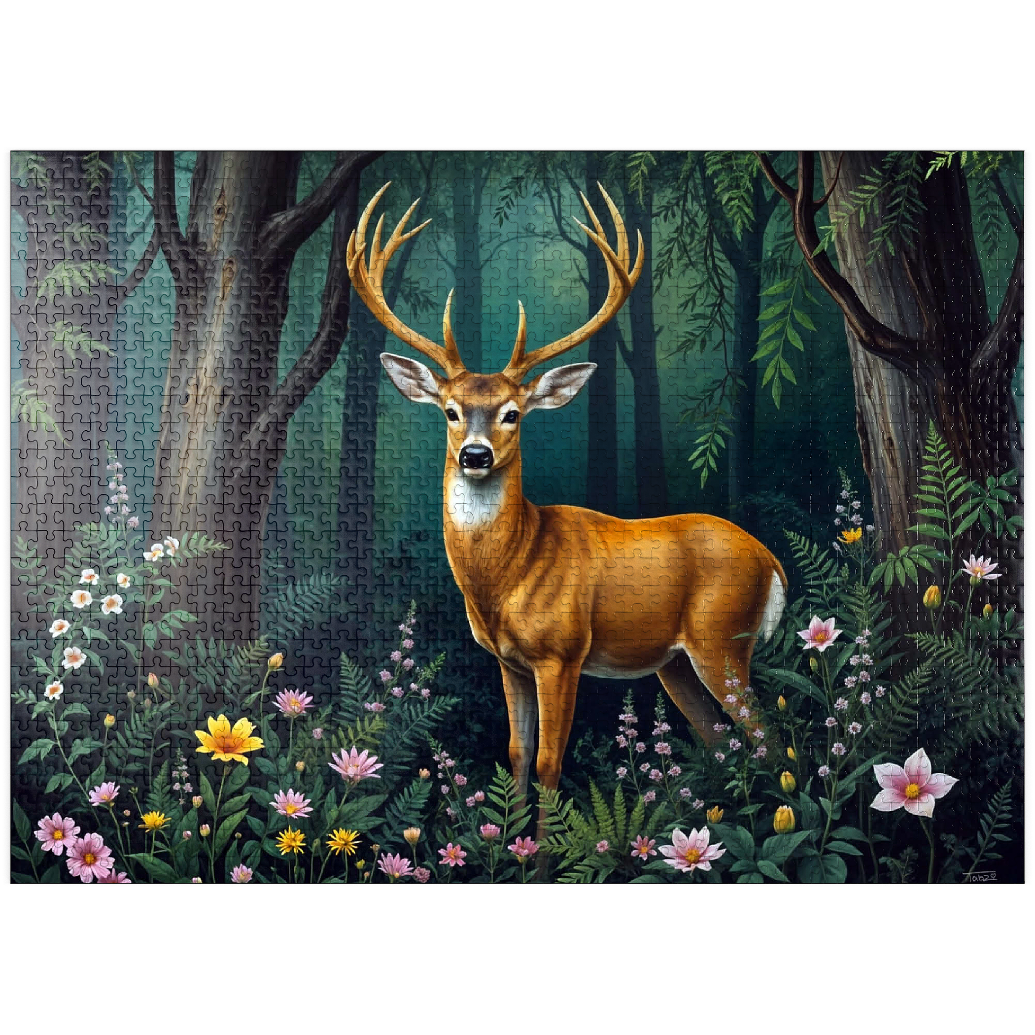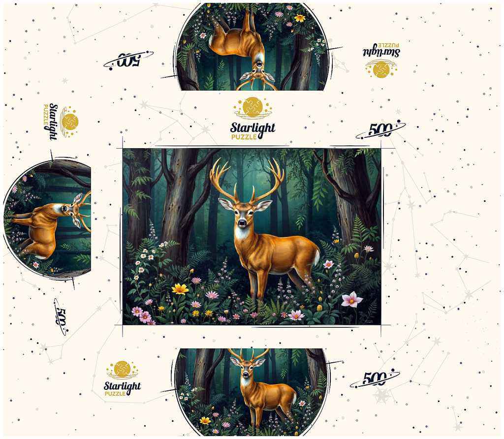 A captivating digital artwork featuring a majestic deer standing gracefully in a lush forest clearing. The deer's golden-brown coat and impressive antlers stand out against the vibrant green foliage of the dense woodland. Soft light filters through the tall trees, casting a serene glow on the forest floor, which is adorned with delicate wildflowers in shades of pink, yellow, and white. The peaceful ambiance and detailed artistry create a tranquil scene that is perfect for nature lovers, wildlife enthusiasts, and rustic decor fans. Ideal as wall art or a statement piece in cabins, lodges, or nature-themed spaces.