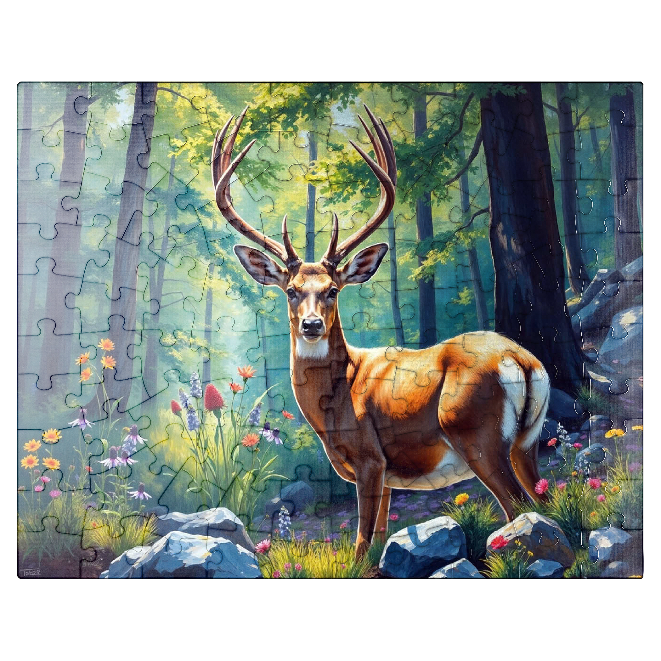A stunning digital artwork capturing a majestic deer standing gracefully in a sunlit forest clearing, surrounded by vibrant wildflowers. The sunlight filters through the tall trees, casting a golden glow on the deer's rich brown coat and highlighting its impressive antlers. The scene is adorned with colorful blossoms including daisies, coneflowers, and lupines, adding a touch of natural beauty. The peaceful forest atmosphere evokes a sense of tranquility and wonder. Perfect for wildlife lovers, nature enthusiasts, and those seeking captivating woodland art for home decor or rustic-themed spaces.