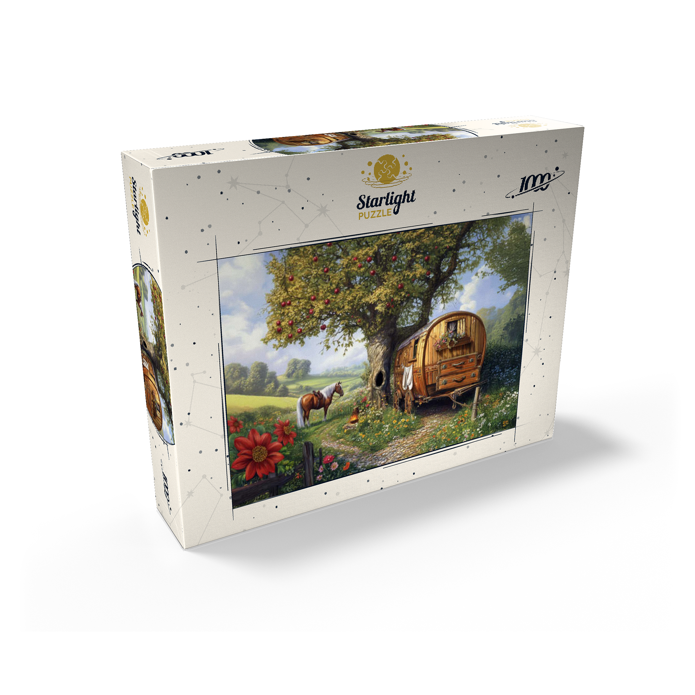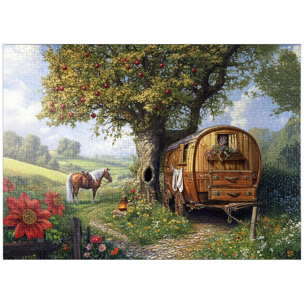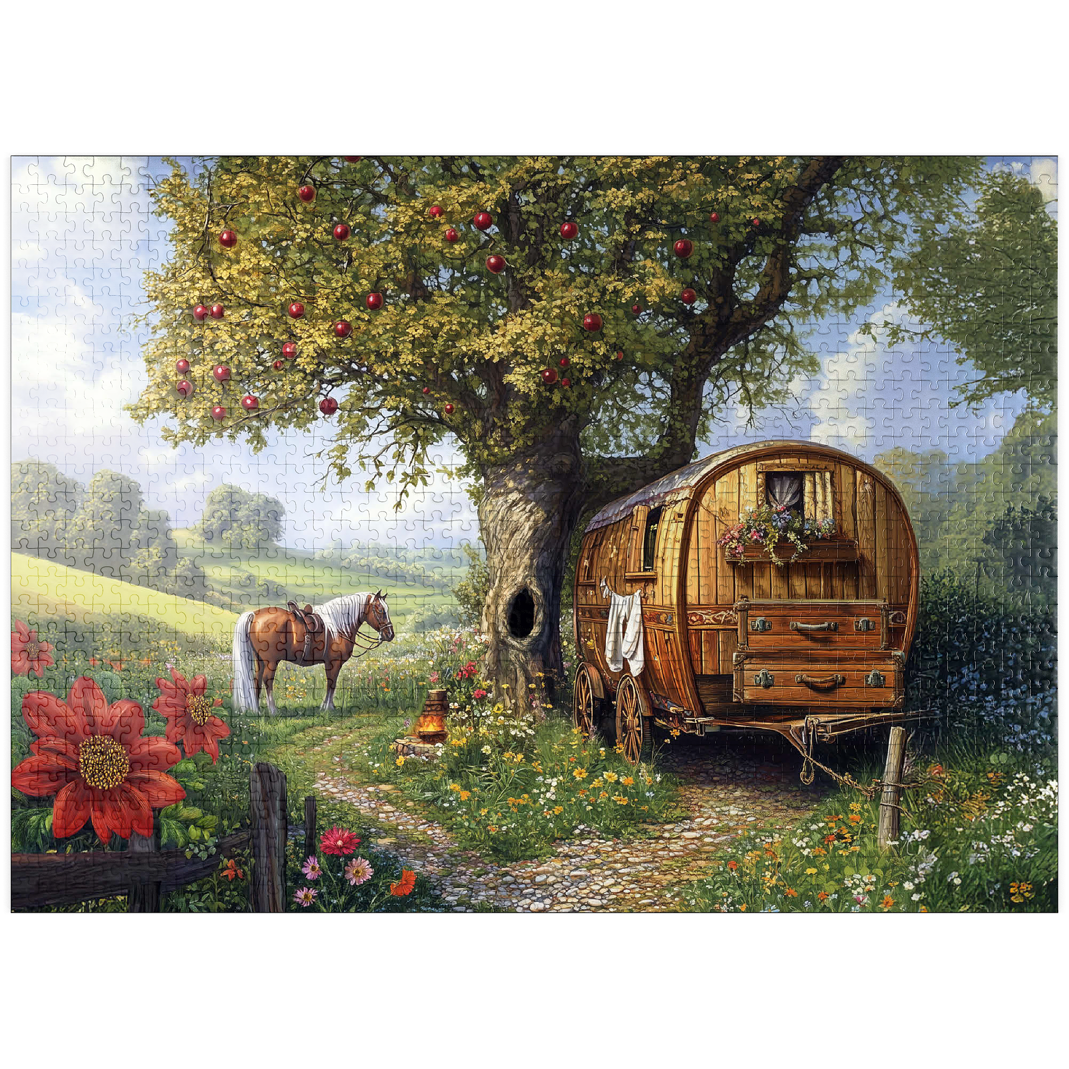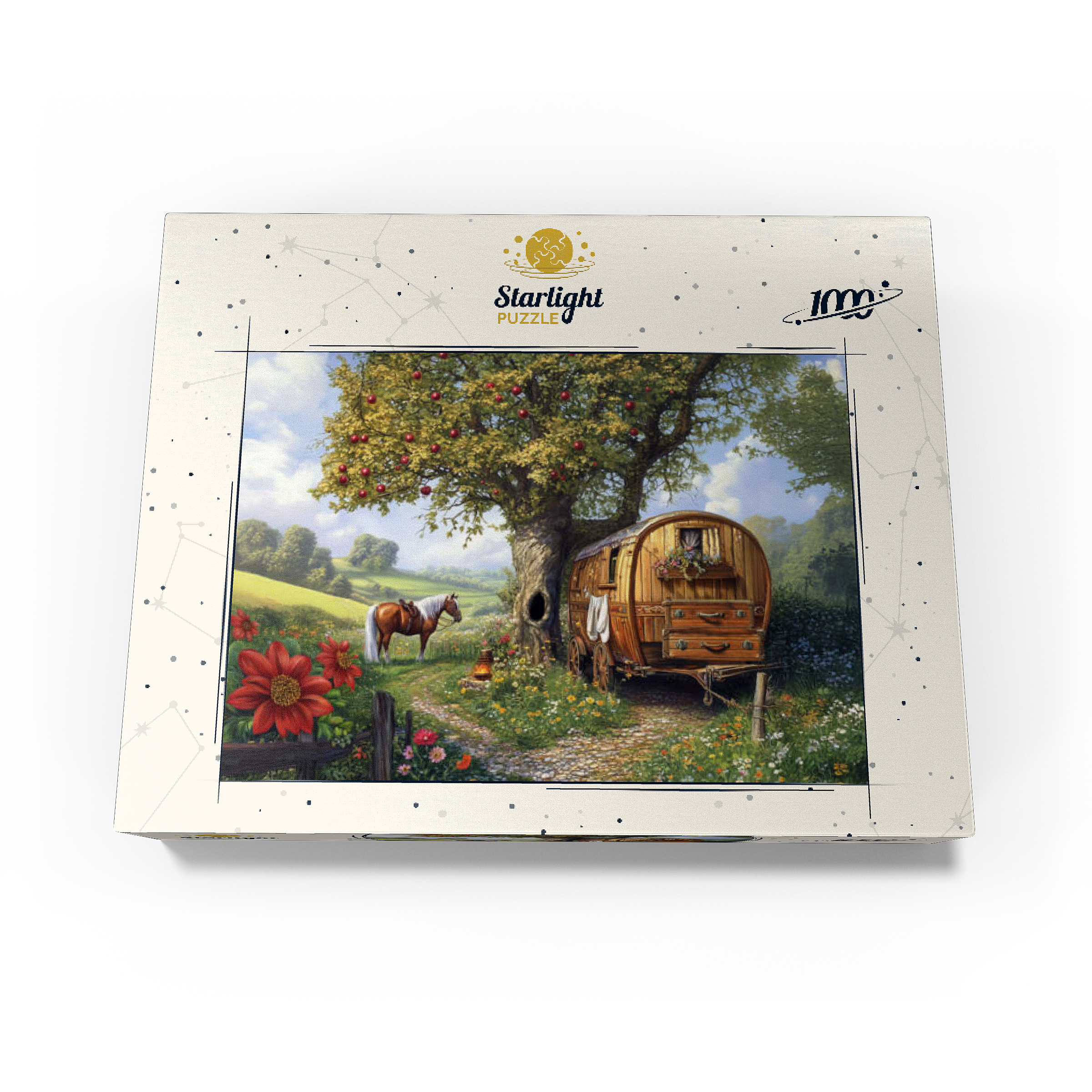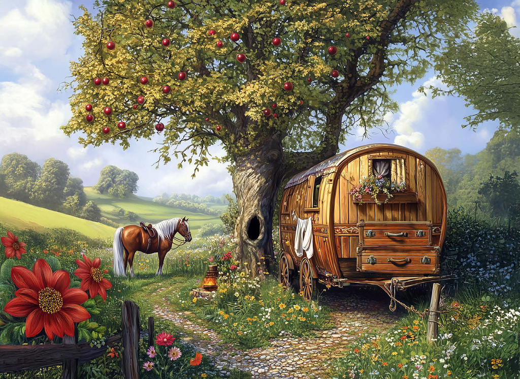 A picturesque digital artwork depicting a rustic wooden gypsy caravan nestled beneath a large apple tree, adorned with ripe red apples. The intricately crafted caravan features decorative carvings, a small flower-filled window, and wooden storage compartments. A white towel hangs from the side, adding a lived-in charm. Nearby, a beautiful chestnut horse with a flowing white mane stands calmly, surrounded by vibrant wildflowers in a lush green meadow. Rolling hills and a bright blue sky complete the serene countryside setting. Ideal for lovers of vintage caravans, pastoral landscapes, and rustic countryside charm, this artwork is perfect for home decor or nostalgic design inspiration.