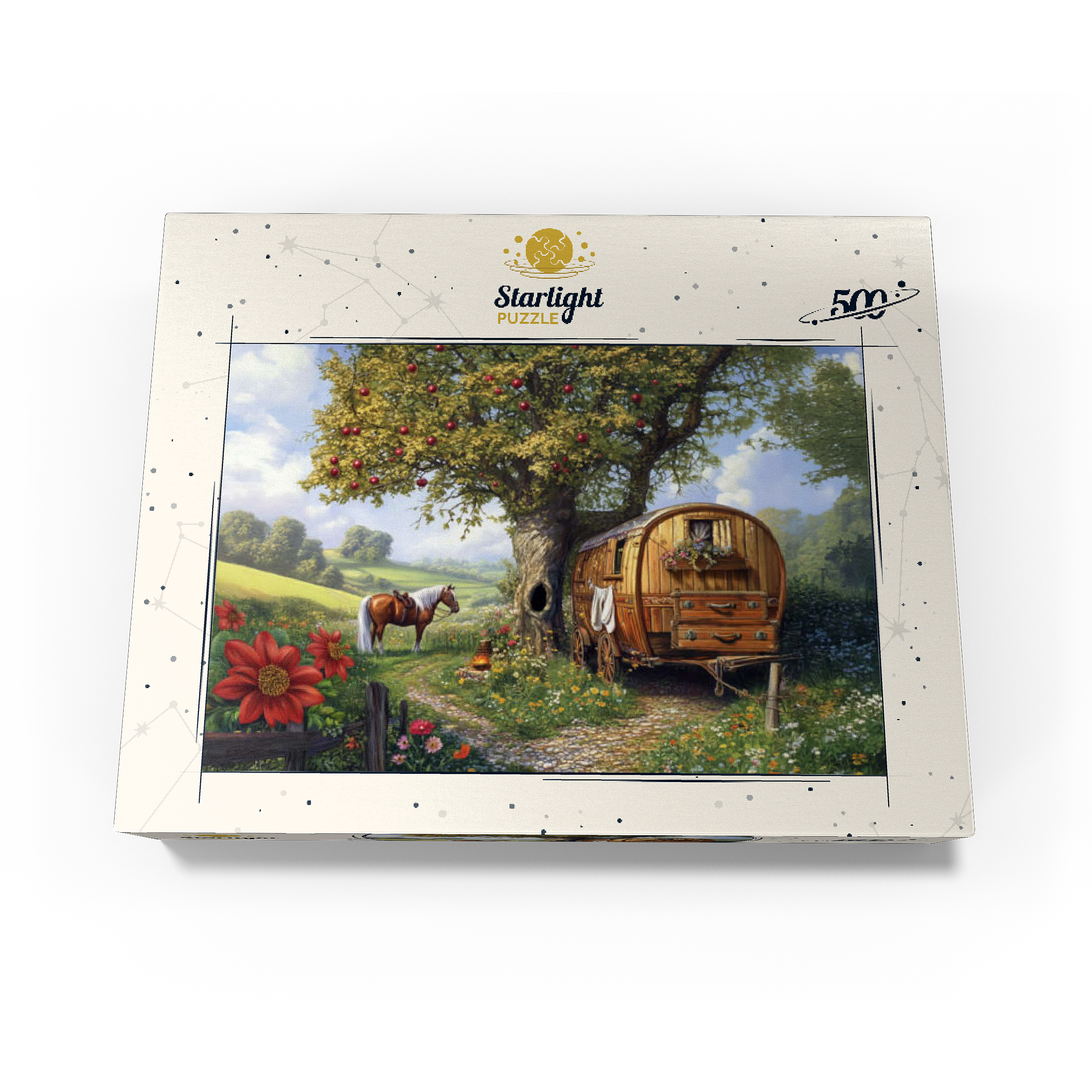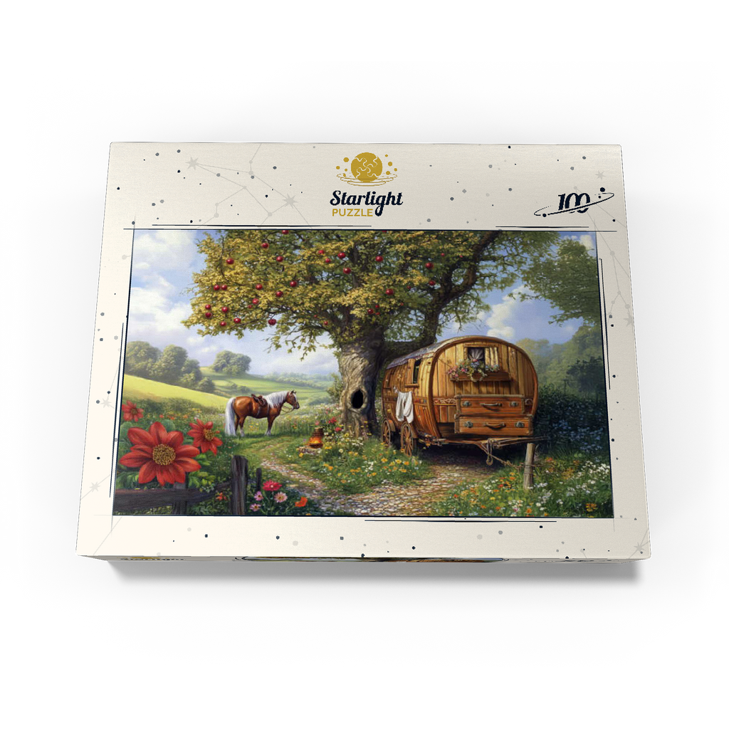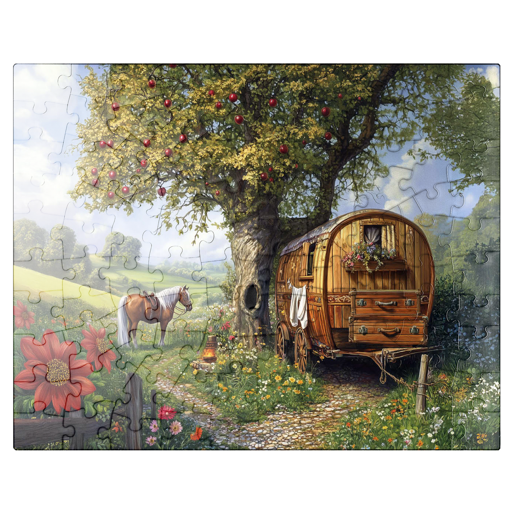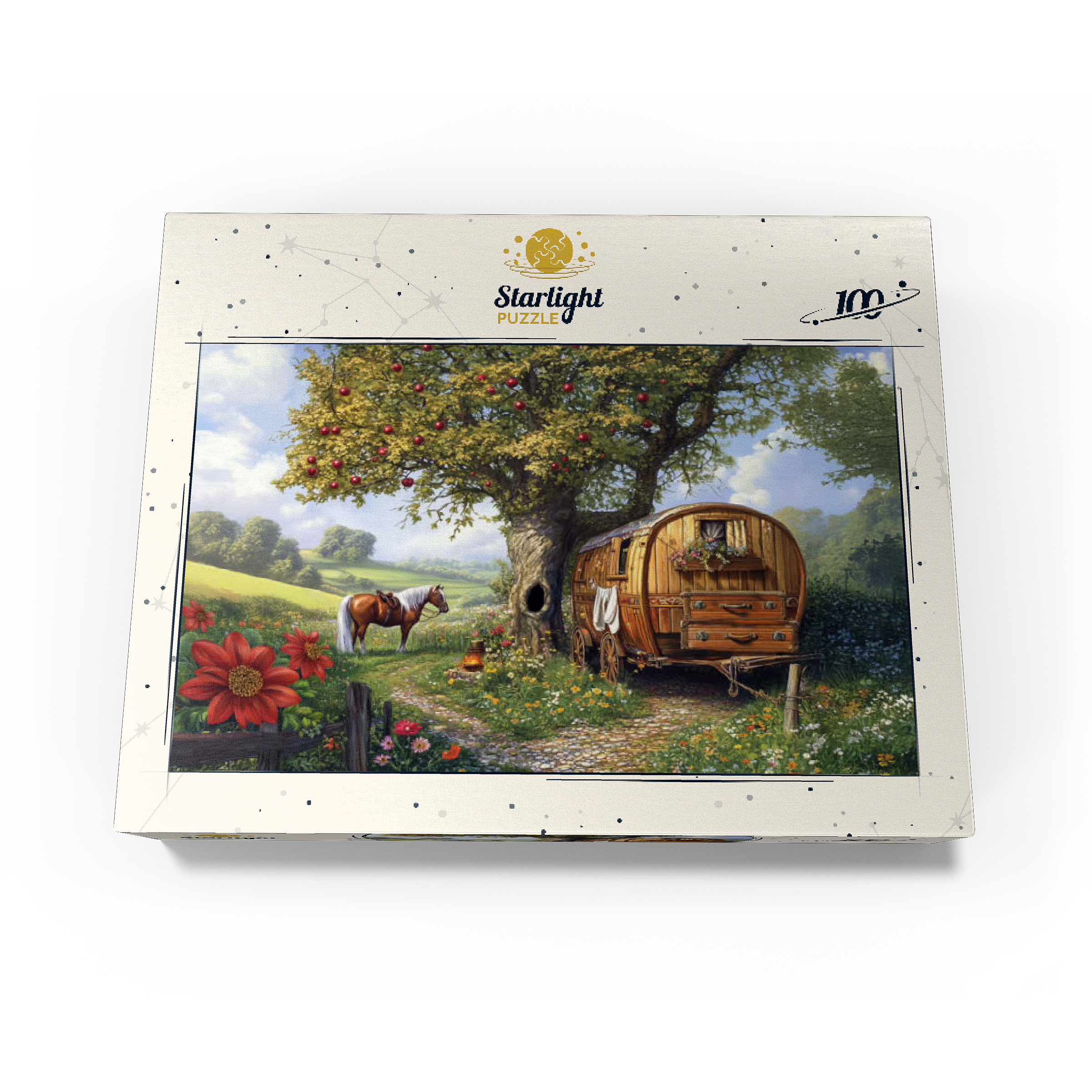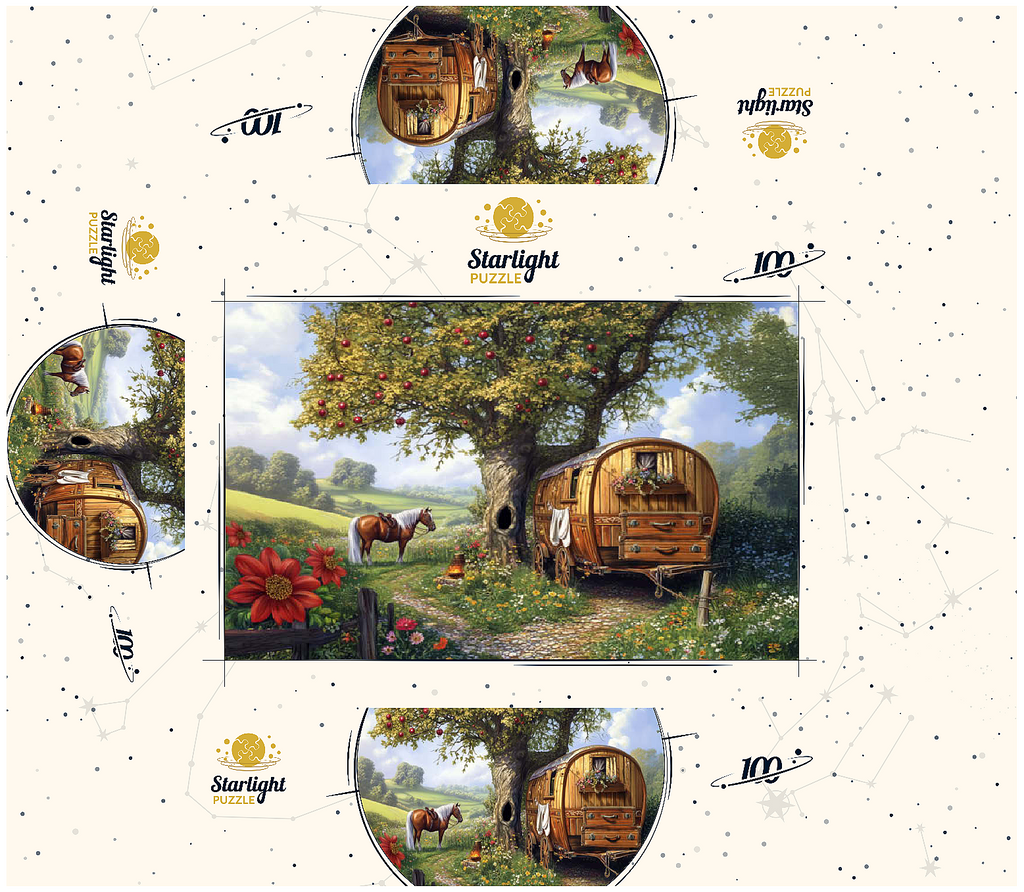 A picturesque digital artwork depicting a rustic wooden gypsy caravan nestled beneath a large apple tree, adorned with ripe red apples. The intricately crafted caravan features decorative carvings, a small flower-filled window, and wooden storage compartments. A white towel hangs from the side, adding a lived-in charm. Nearby, a beautiful chestnut horse with a flowing white mane stands calmly, surrounded by vibrant wildflowers in a lush green meadow. Rolling hills and a bright blue sky complete the serene countryside setting. Ideal for lovers of vintage caravans, pastoral landscapes, and rustic countryside charm, this artwork is perfect for home decor or nostalgic design inspiration.