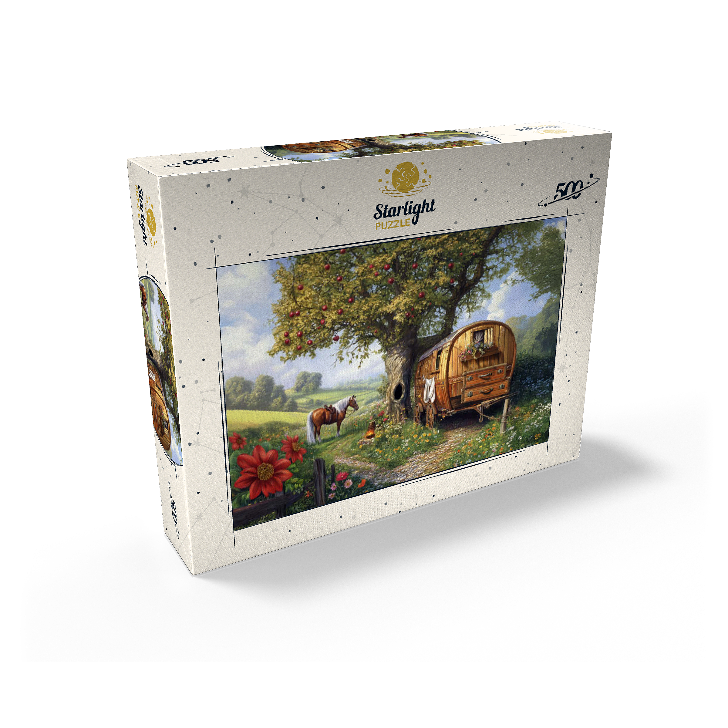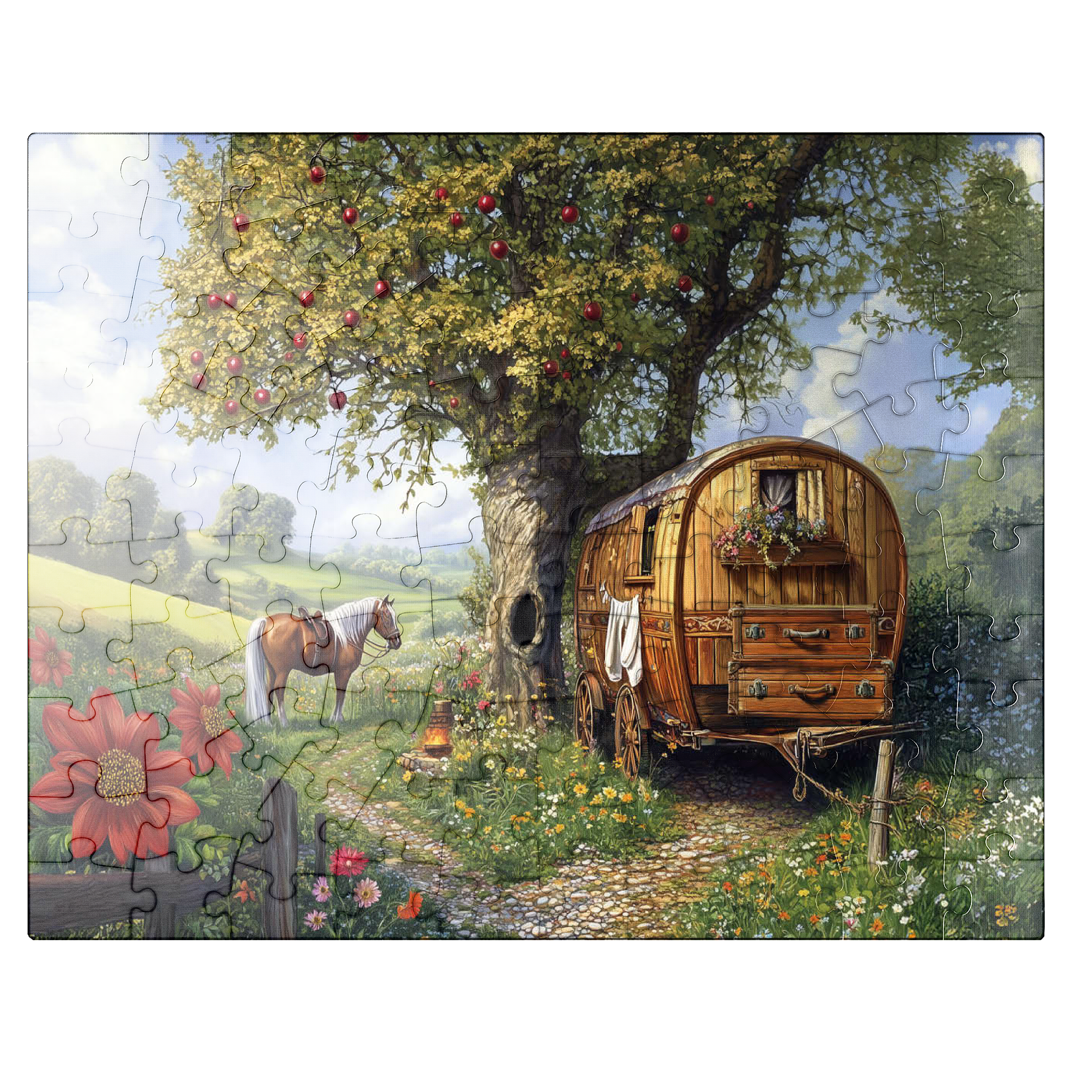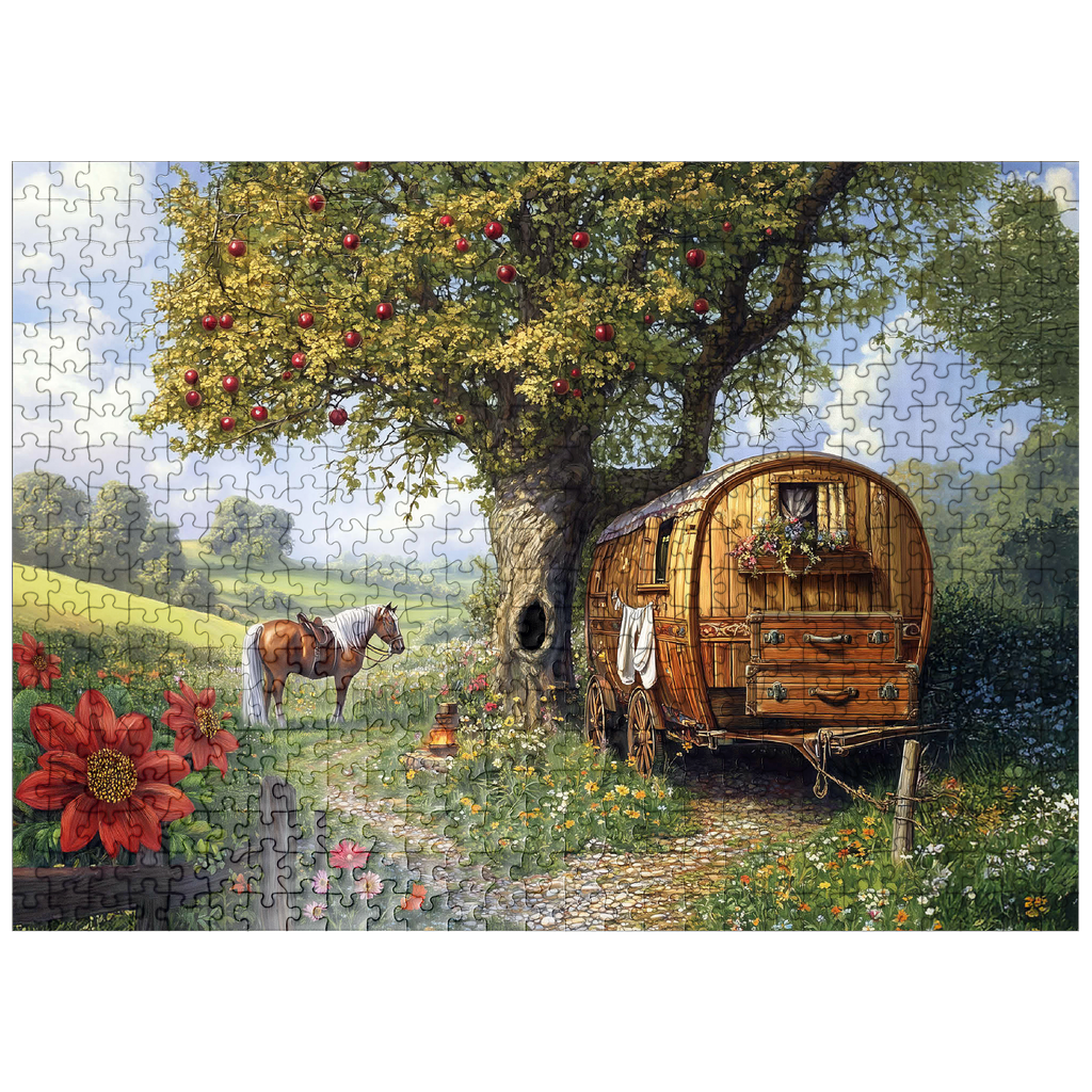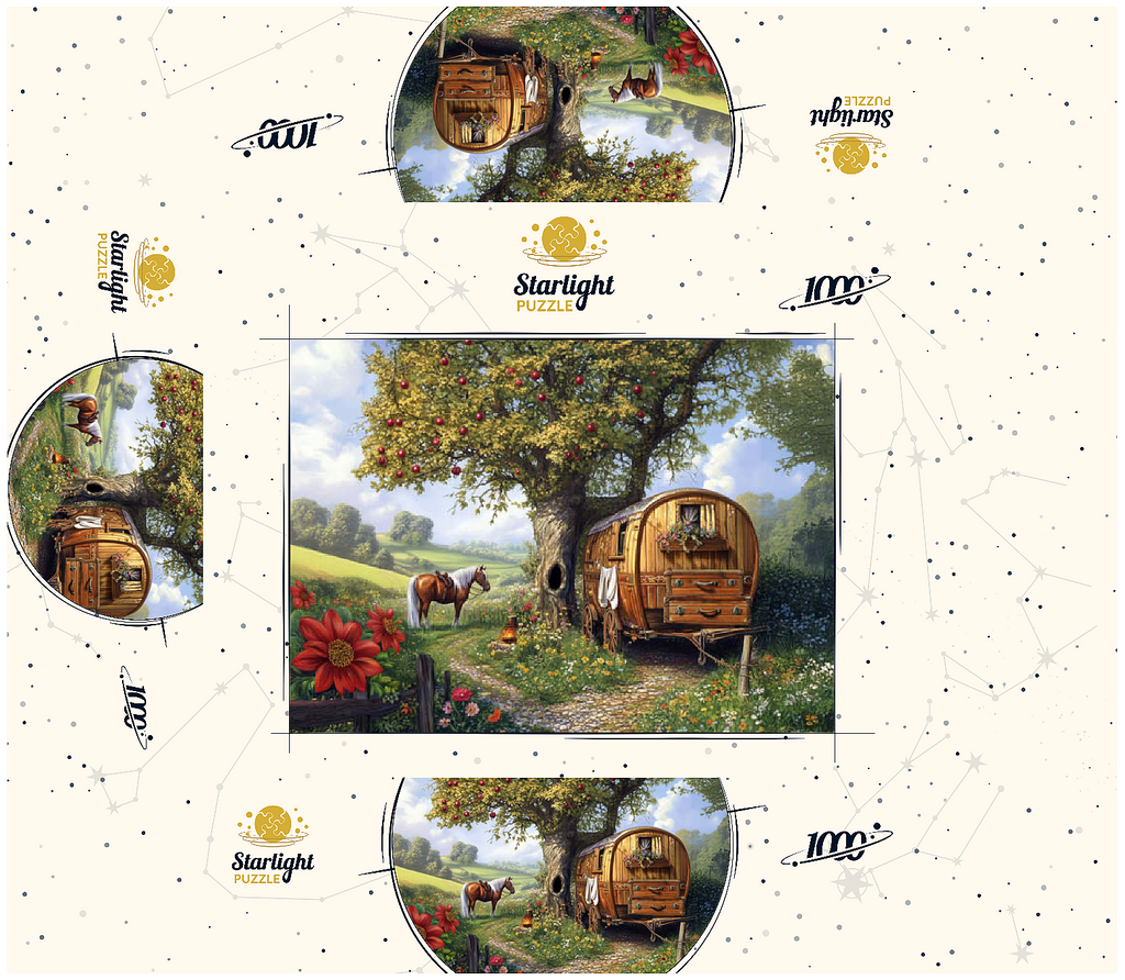 A picturesque digital artwork depicting a rustic wooden gypsy caravan nestled beneath a large apple tree, adorned with ripe red apples. The intricately crafted caravan features decorative carvings, a small flower-filled window, and wooden storage compartments. A white towel hangs from the side, adding a lived-in charm. Nearby, a beautiful chestnut horse with a flowing white mane stands calmly, surrounded by vibrant wildflowers in a lush green meadow. Rolling hills and a bright blue sky complete the serene countryside setting. Ideal for lovers of vintage caravans, pastoral landscapes, and rustic countryside charm, this artwork is perfect for home decor or nostalgic design inspiration.