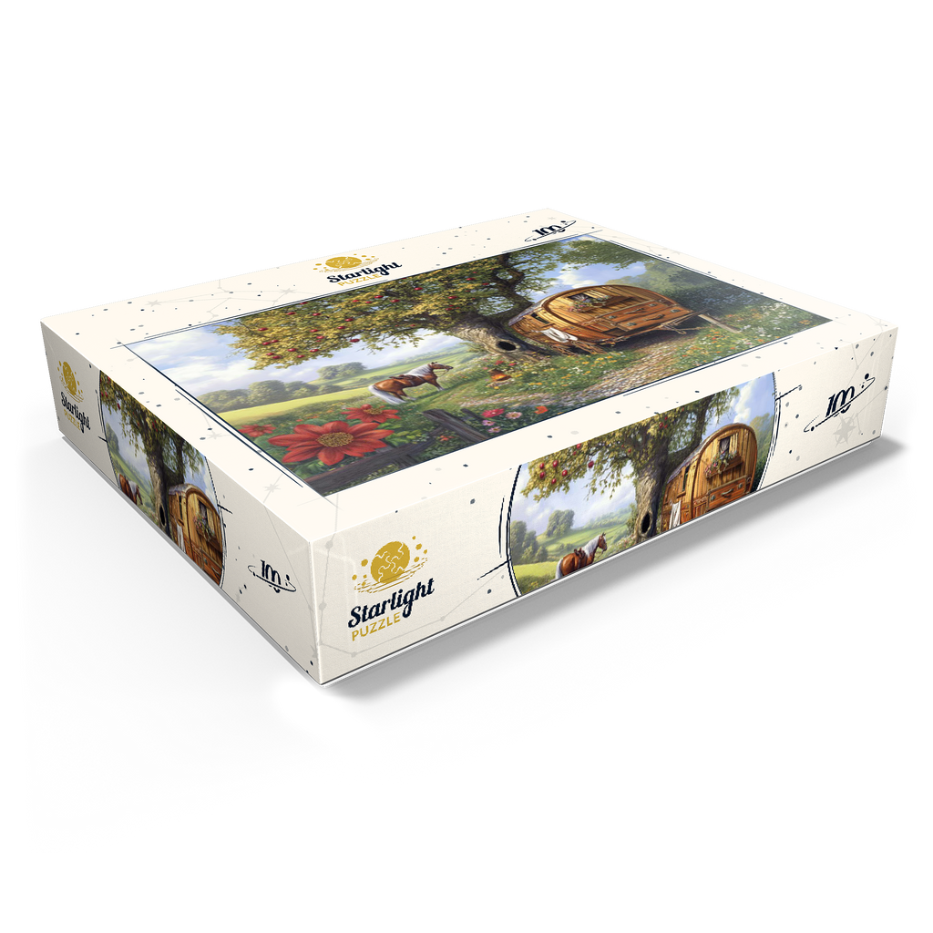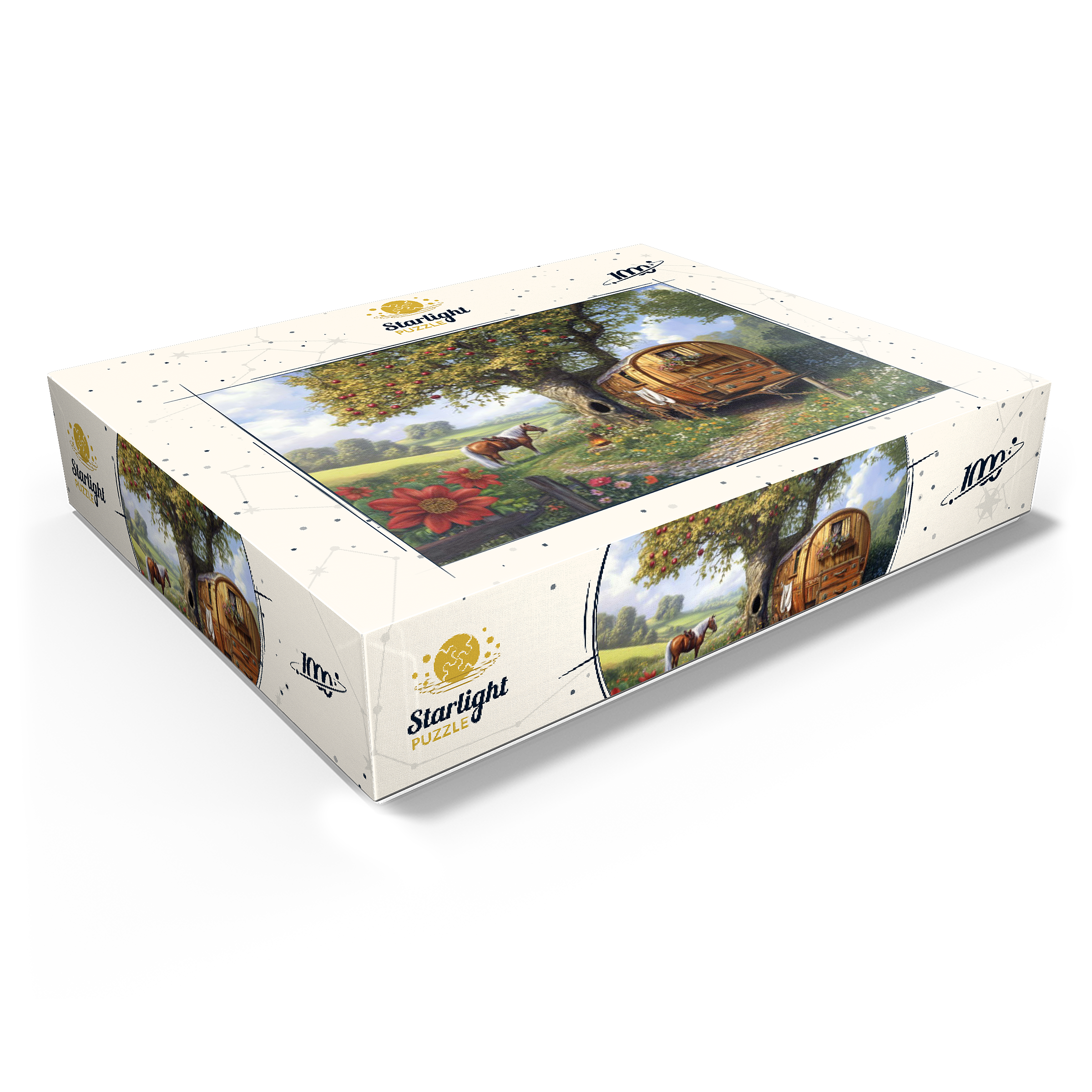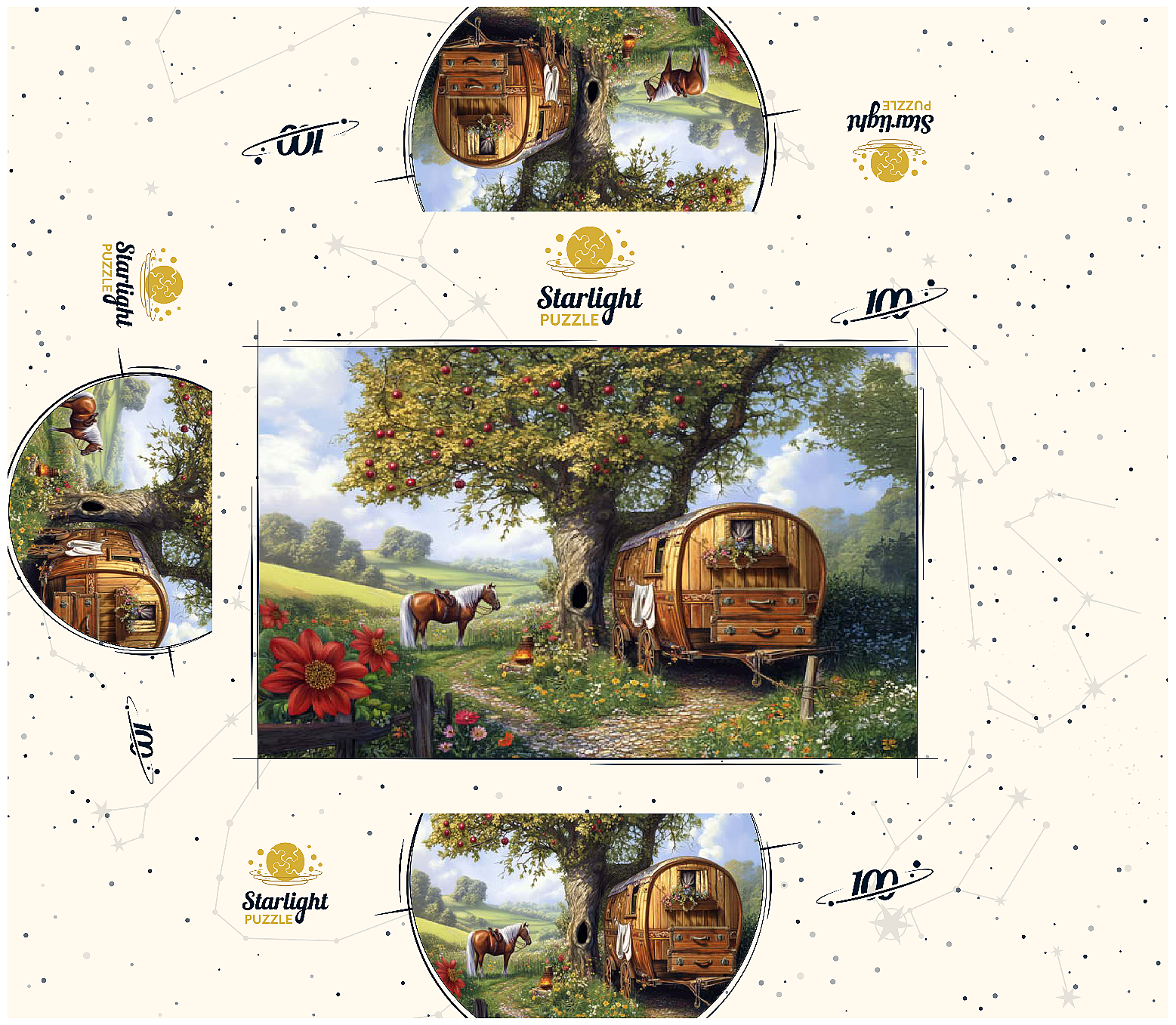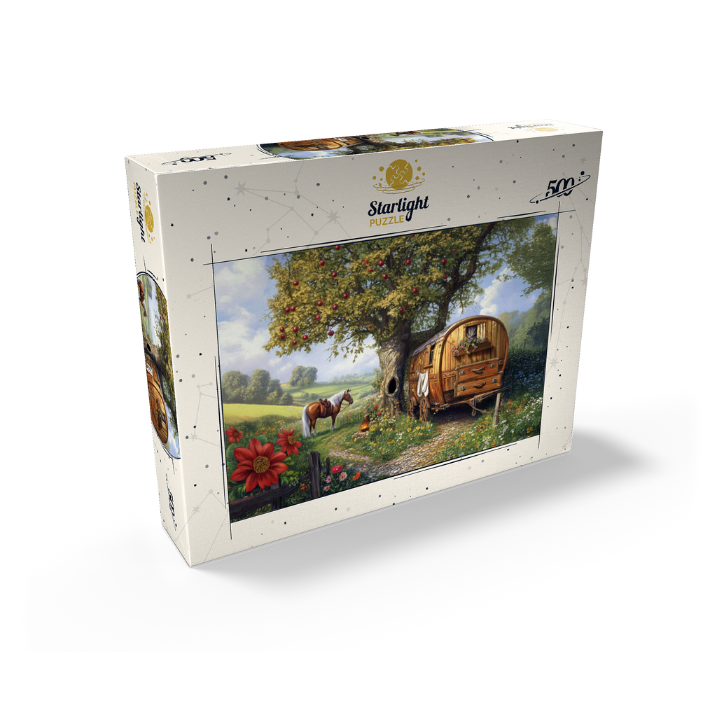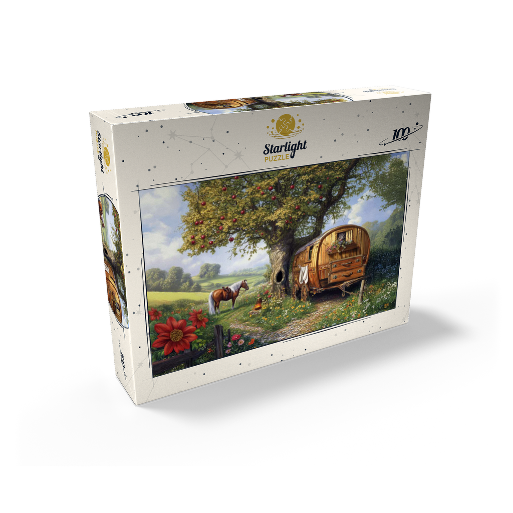 A picturesque digital artwork depicting a rustic wooden gypsy caravan nestled beneath a large apple tree, adorned with ripe red apples. The intricately crafted caravan features decorative carvings, a small flower-filled window, and wooden storage compartments. A white towel hangs from the side, adding a lived-in charm. Nearby, a beautiful chestnut horse with a flowing white mane stands calmly, surrounded by vibrant wildflowers in a lush green meadow. Rolling hills and a bright blue sky complete the serene countryside setting. Ideal for lovers of vintage caravans, pastoral landscapes, and rustic countryside charm, this artwork is perfect for home decor or nostalgic design inspiration.