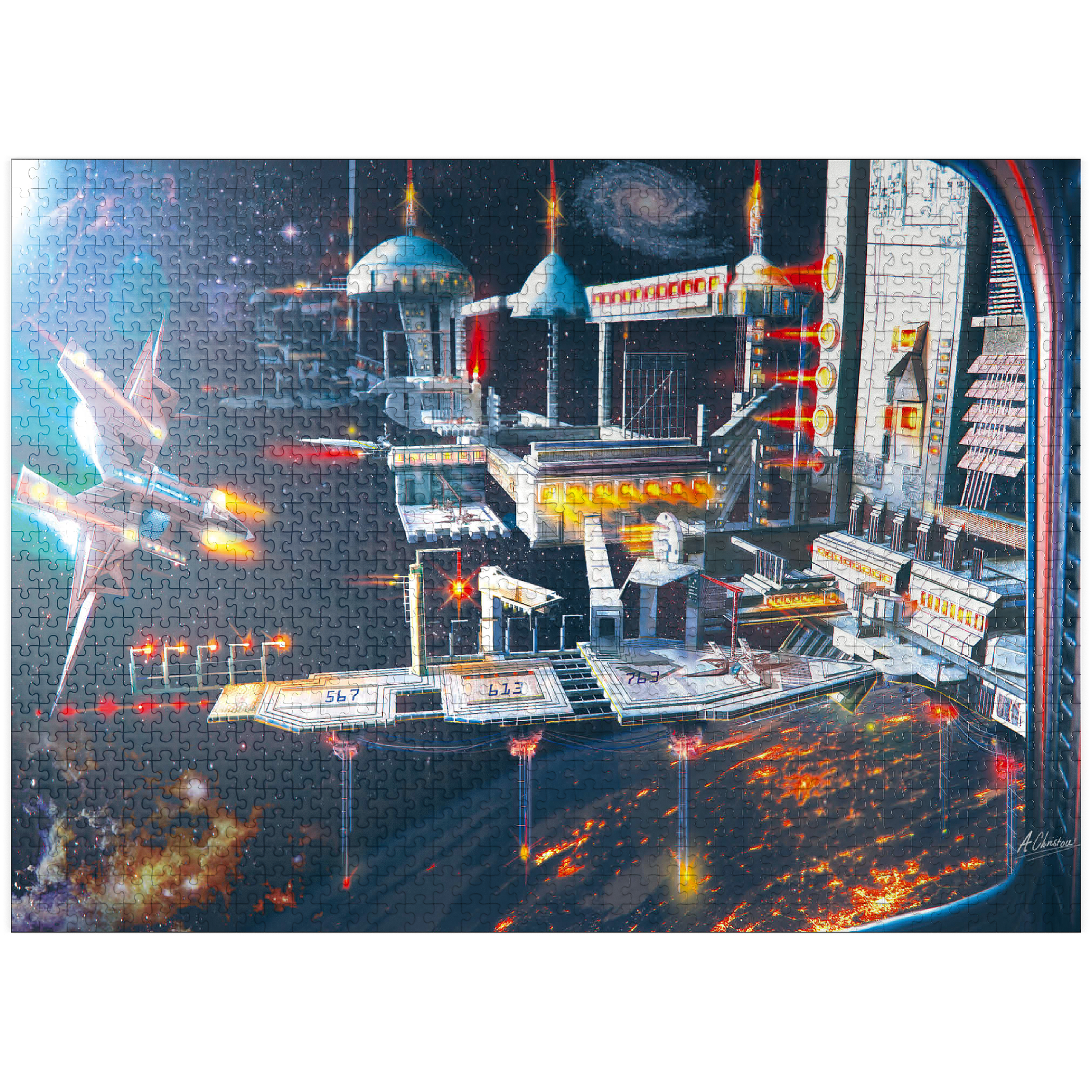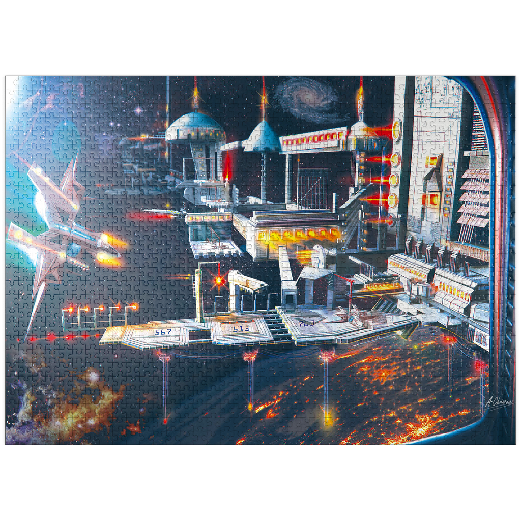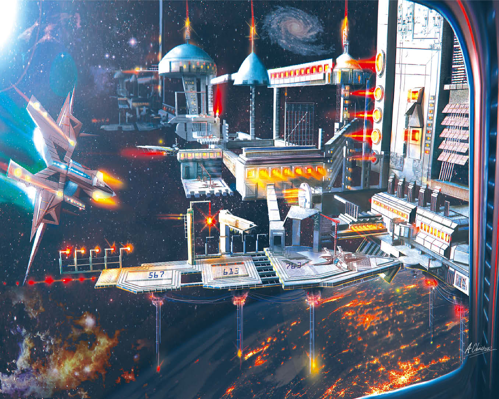 Space Station Landing Bay by Anthony Christou immerses viewers in a breathtaking sci-fi vista viewed from the cockpit of a spacecraft. in the foreground, the sleek glass panels frame a sprawling space station glowing with orange, yellow, and red hues, accented by neon blues and a soft cyberpunk glow. Below, a luminous planet pulses with city lights, while starships hover and one soars through the docking lanes. Behind it all, galaxies swirl and stars glimmer in the vastness of space. this painting captures the awe of deep space travel, blending science fiction with a rich, cinematic palette of light and wonder.