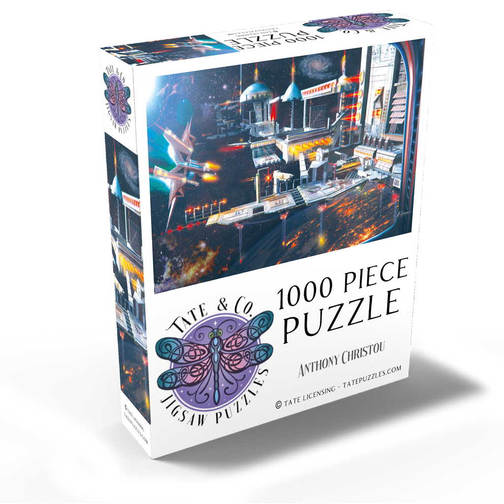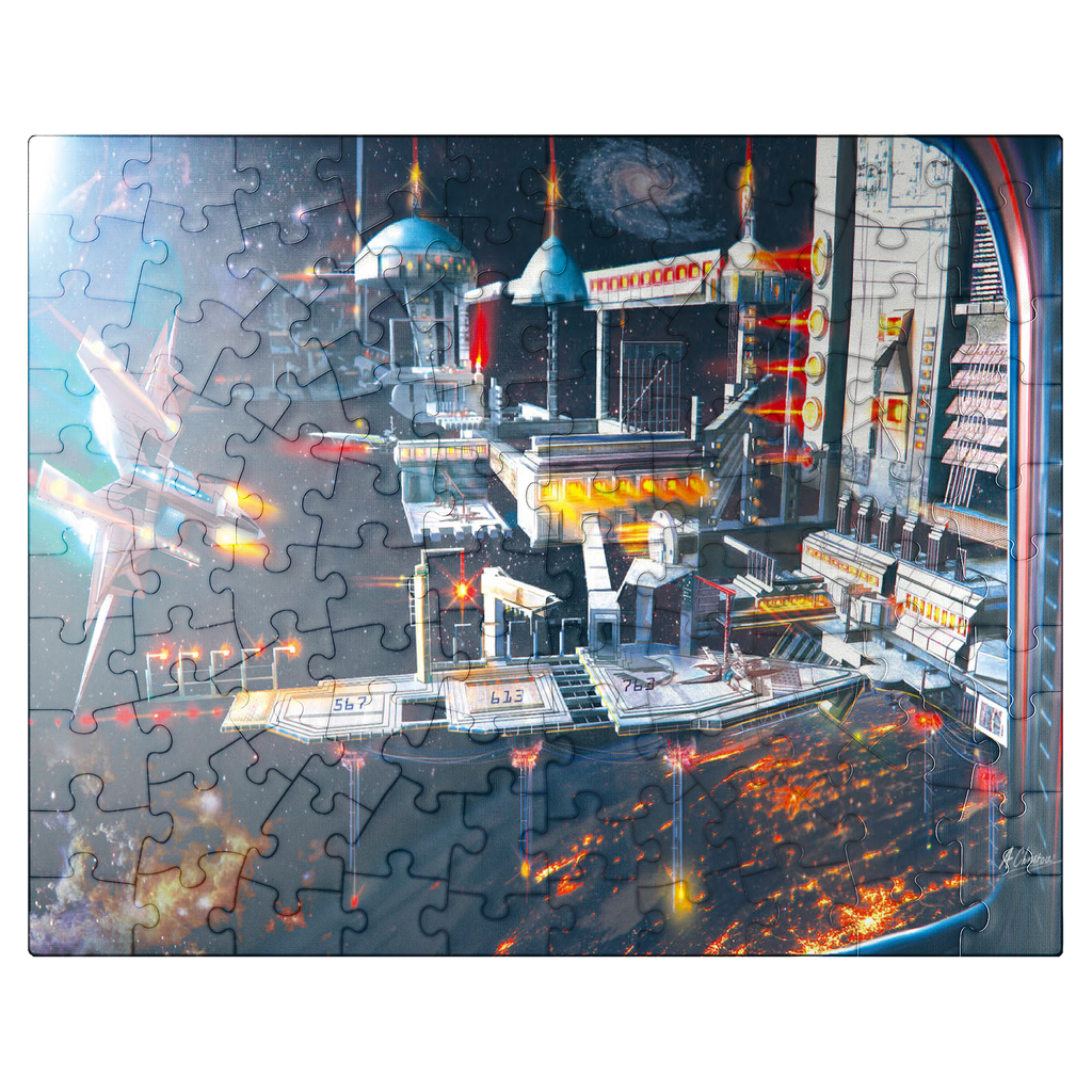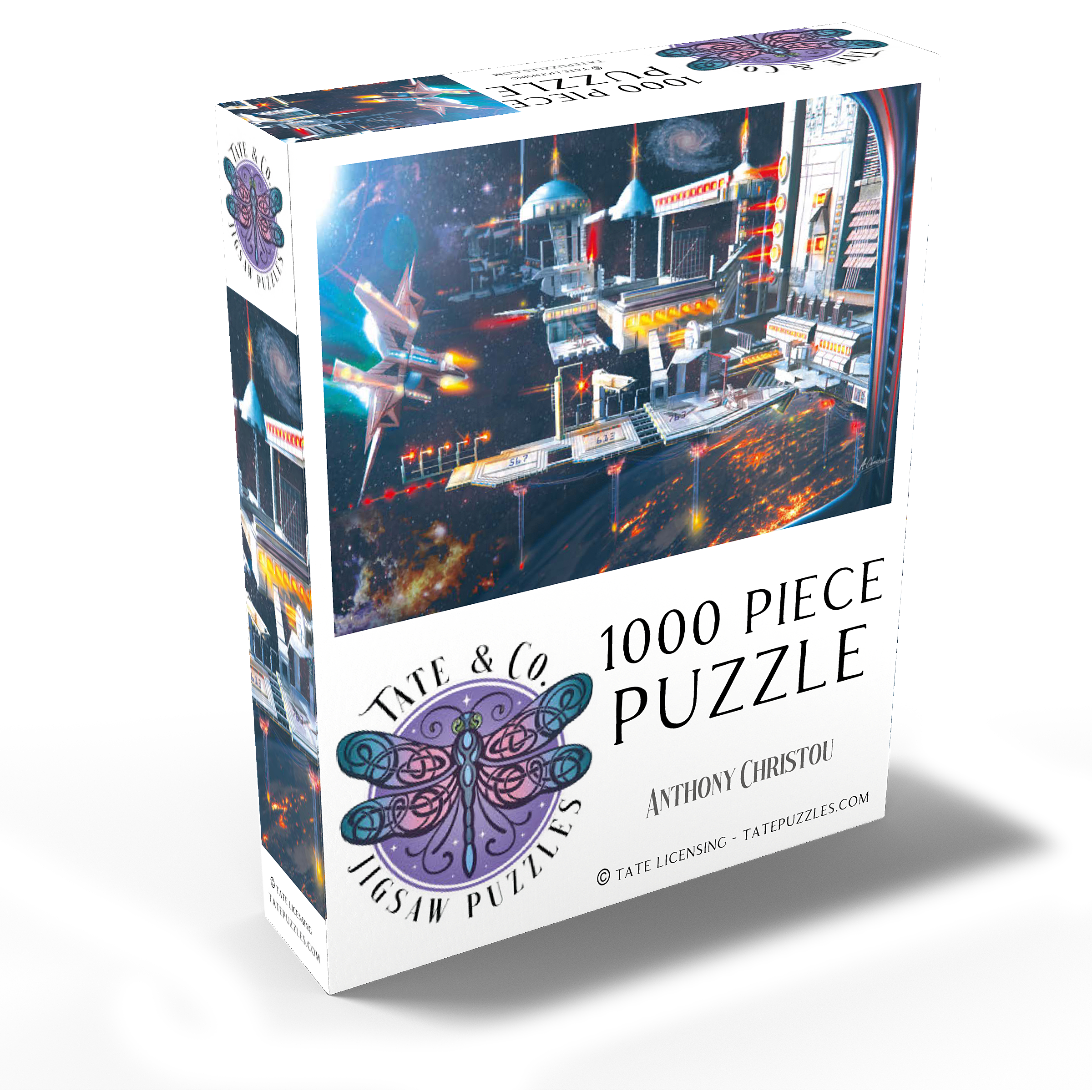 Space Station Landing Bay by Anthony Christou immerses viewers in a breathtaking sci-fi vista viewed from the cockpit of a spacecraft. in the foreground, the sleek glass panels frame a sprawling space station glowing with orange, yellow, and red hues, accented by neon blues and a soft cyberpunk glow. Below, a luminous planet pulses with city lights, while starships hover and one soars through the docking lanes. Behind it all, galaxies swirl and stars glimmer in the vastness of space. this painting captures the awe of deep space travel, blending science fiction with a rich, cinematic palette of light and wonder.