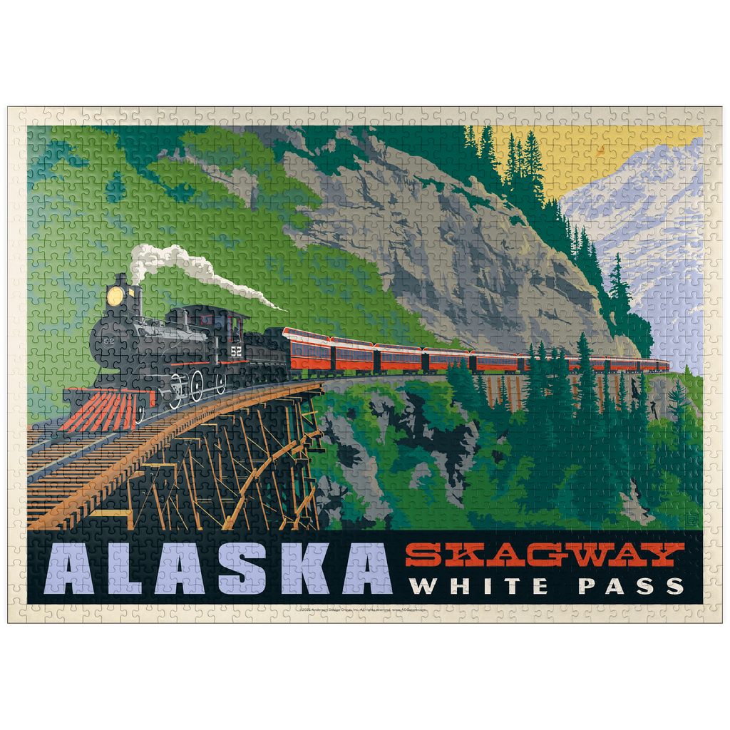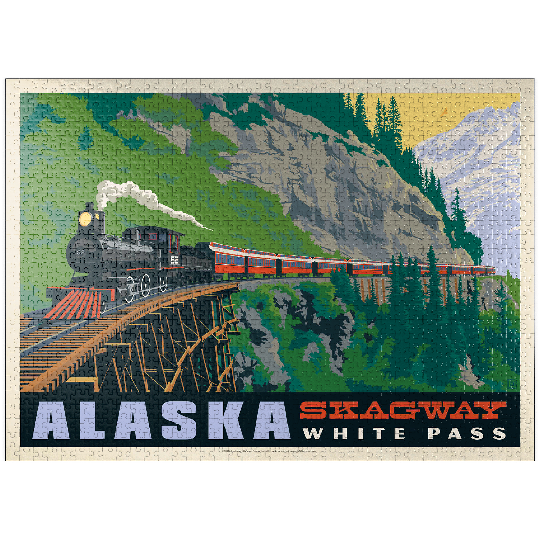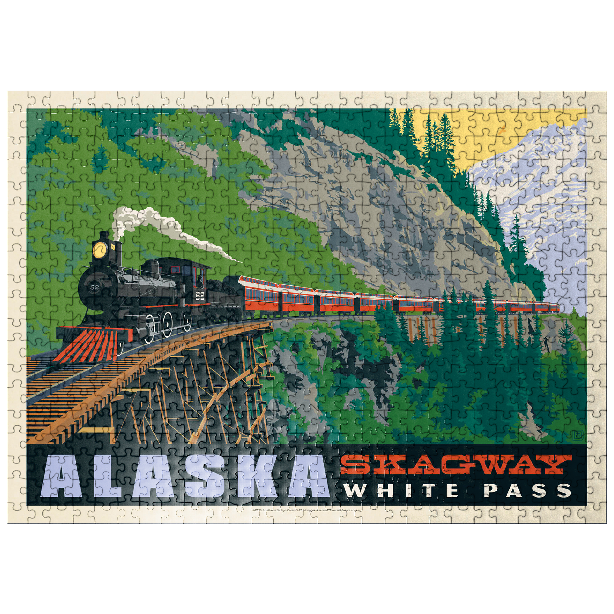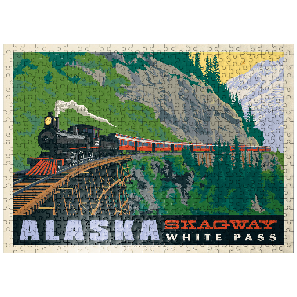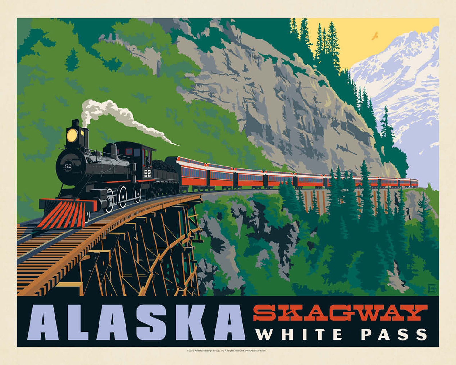 The White Pass and Yukon Route in Skagway, Alaska, is one of the most famous historic railways in North America, offering breathtaking views and a journey through rugged mountain landscapes. This artwork captures the dramatic scene of a steam locomotive and its bright red passenger cars winding along a trestle bridge high above a steep gorge, with lush evergreen forests and snow-capped peaks completing the background. Originally built during the Klondike Gold Rush of 1898, the White Pass railway was an engineering marvel, overcoming treacherous terrain with steep grades, sharp curves, and towering bridges. Today, it stands as both a National Historic Engineering Landmark and a beloved attraction, carrying visitors through spectacular scenery that includes waterfalls, glaciers, and alpine valleys. The train ride from Skagway climbs nearly 3,000 feet to the White Pass summit, retracing the footsteps of gold rush stampeders who once braved this unforgiving wilderness.
