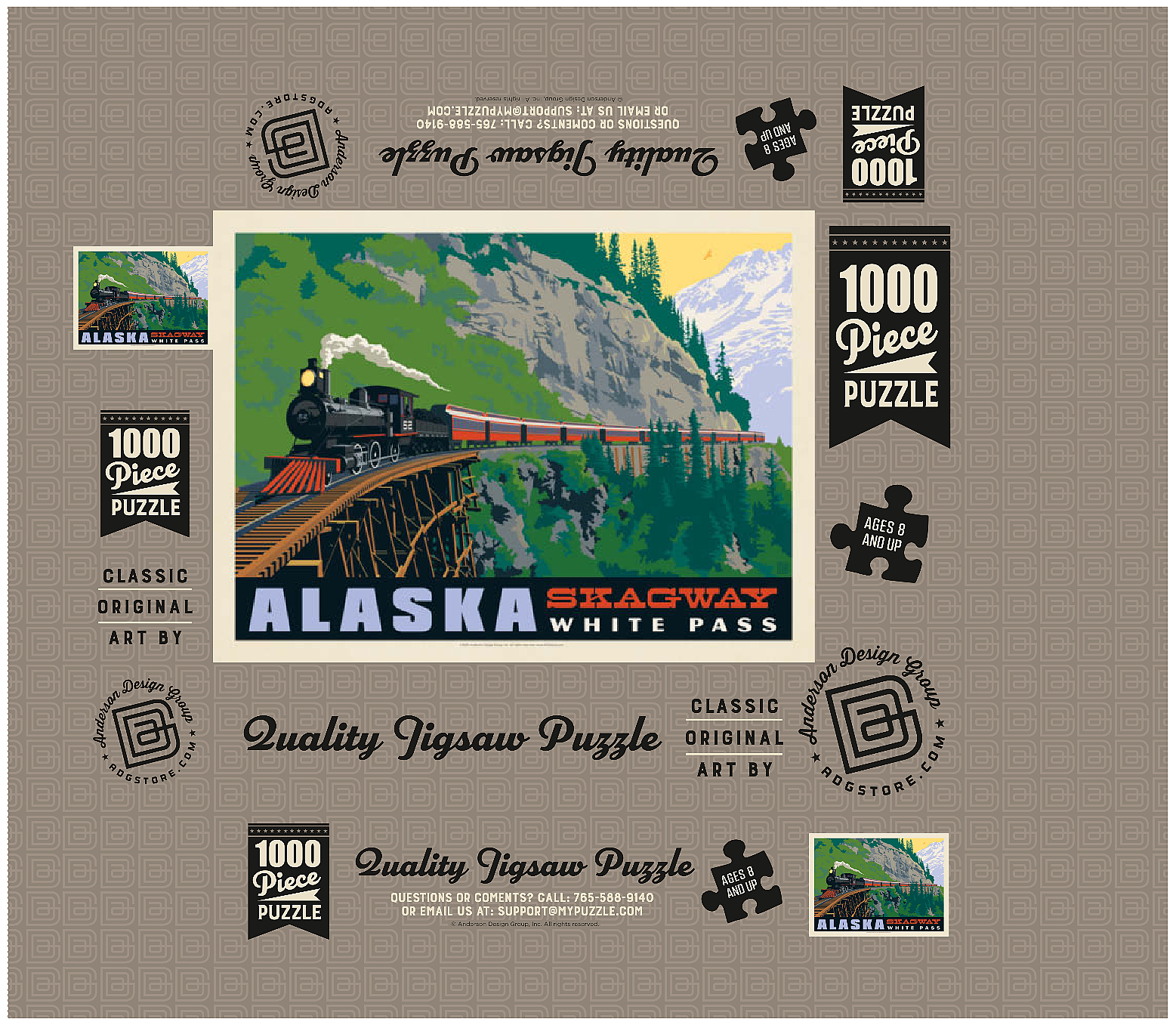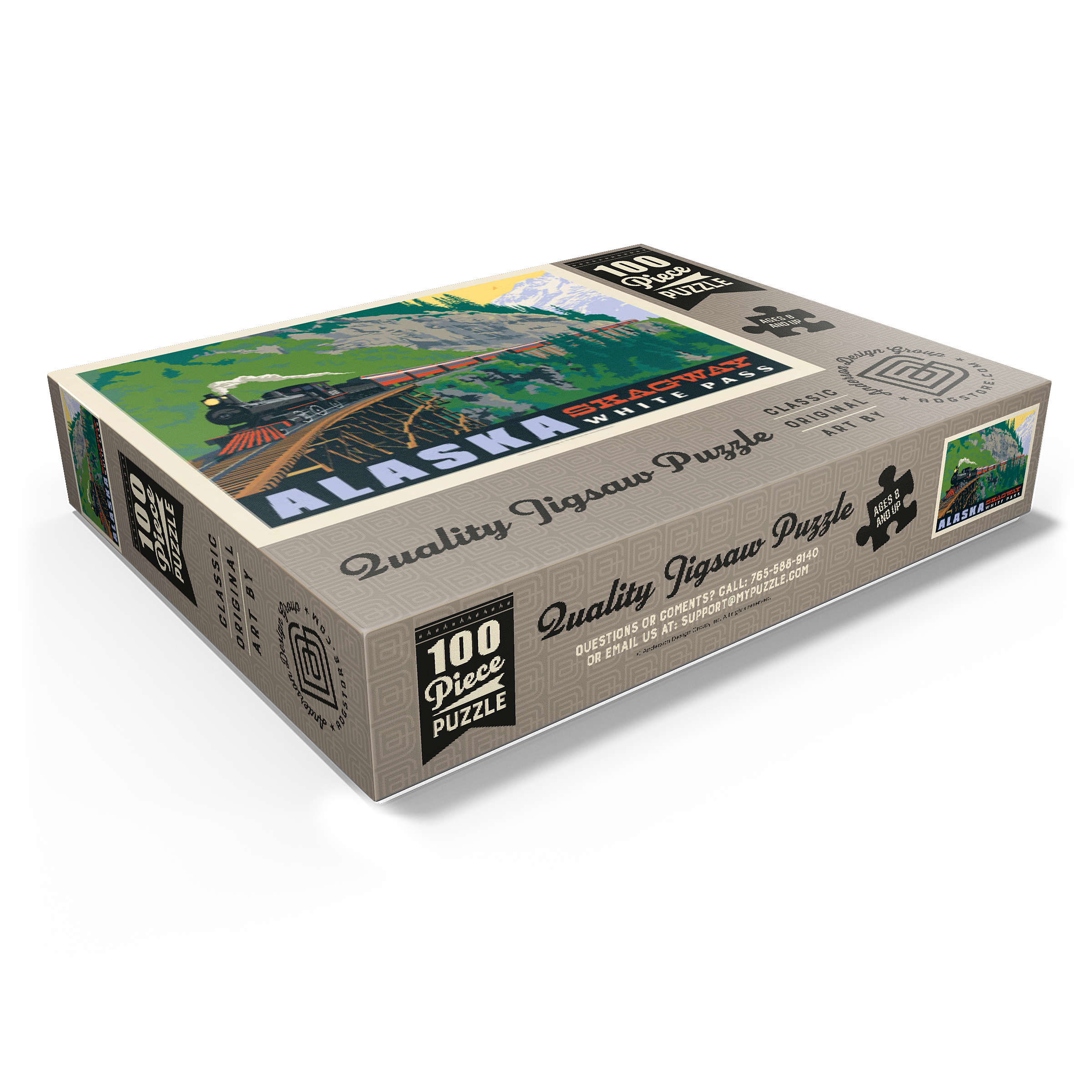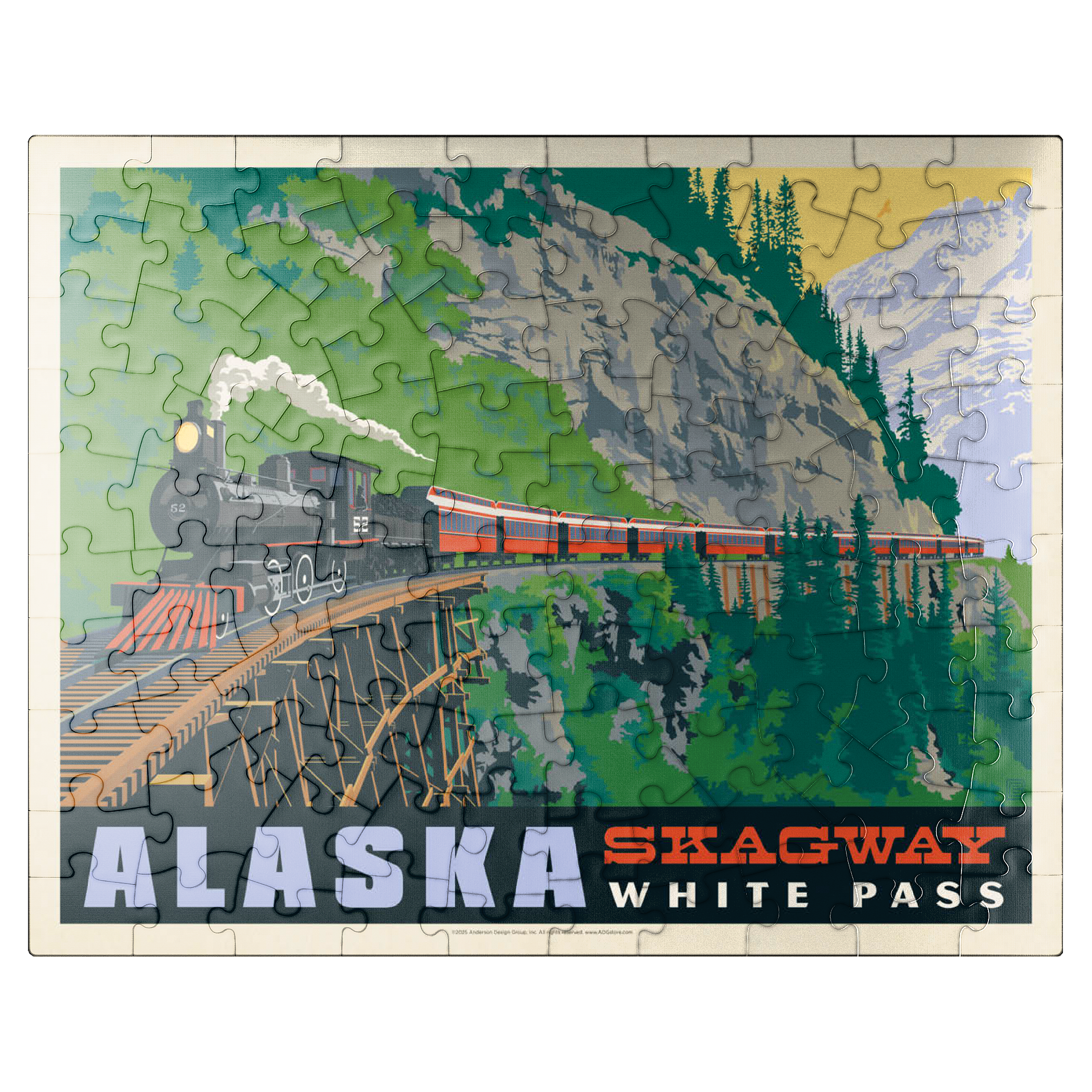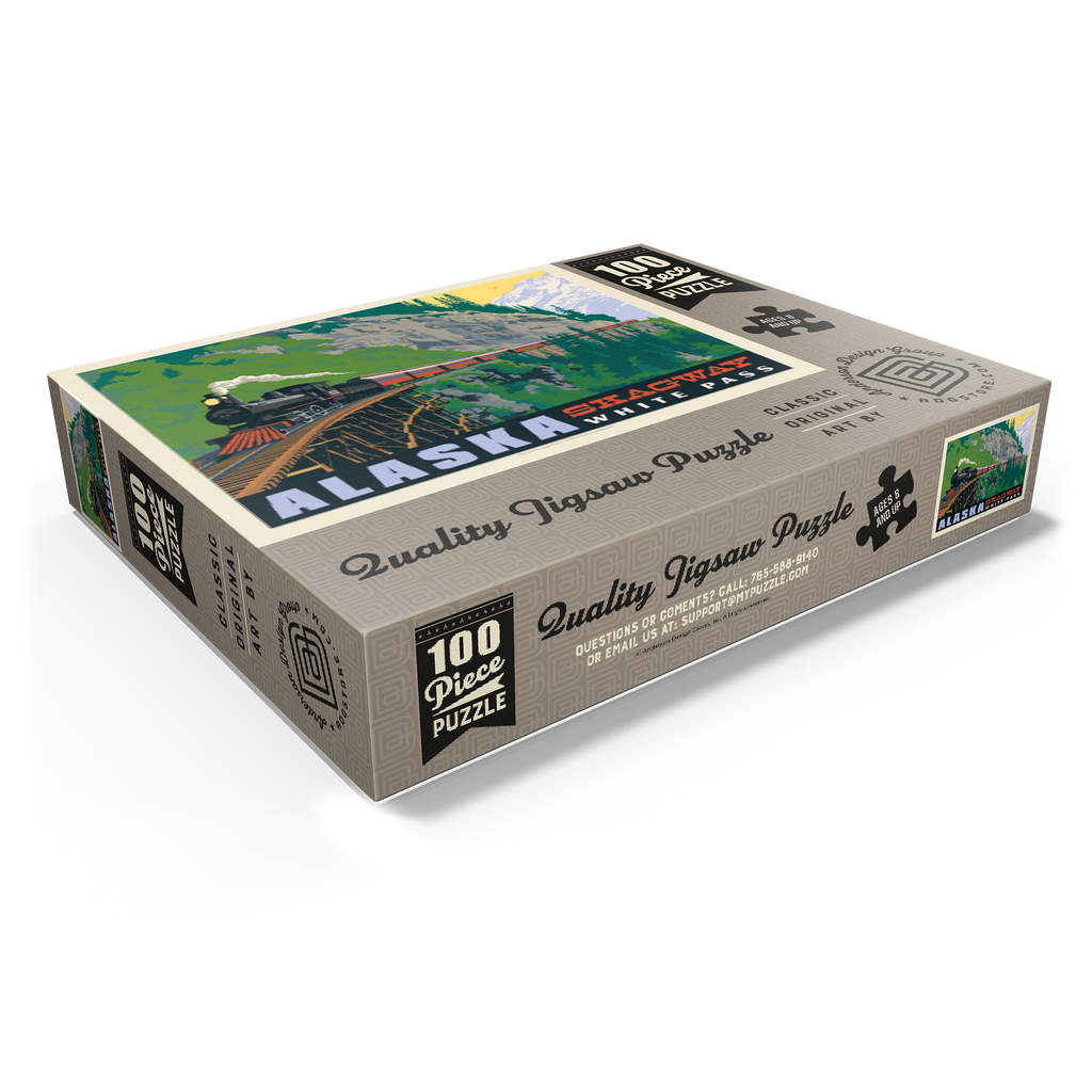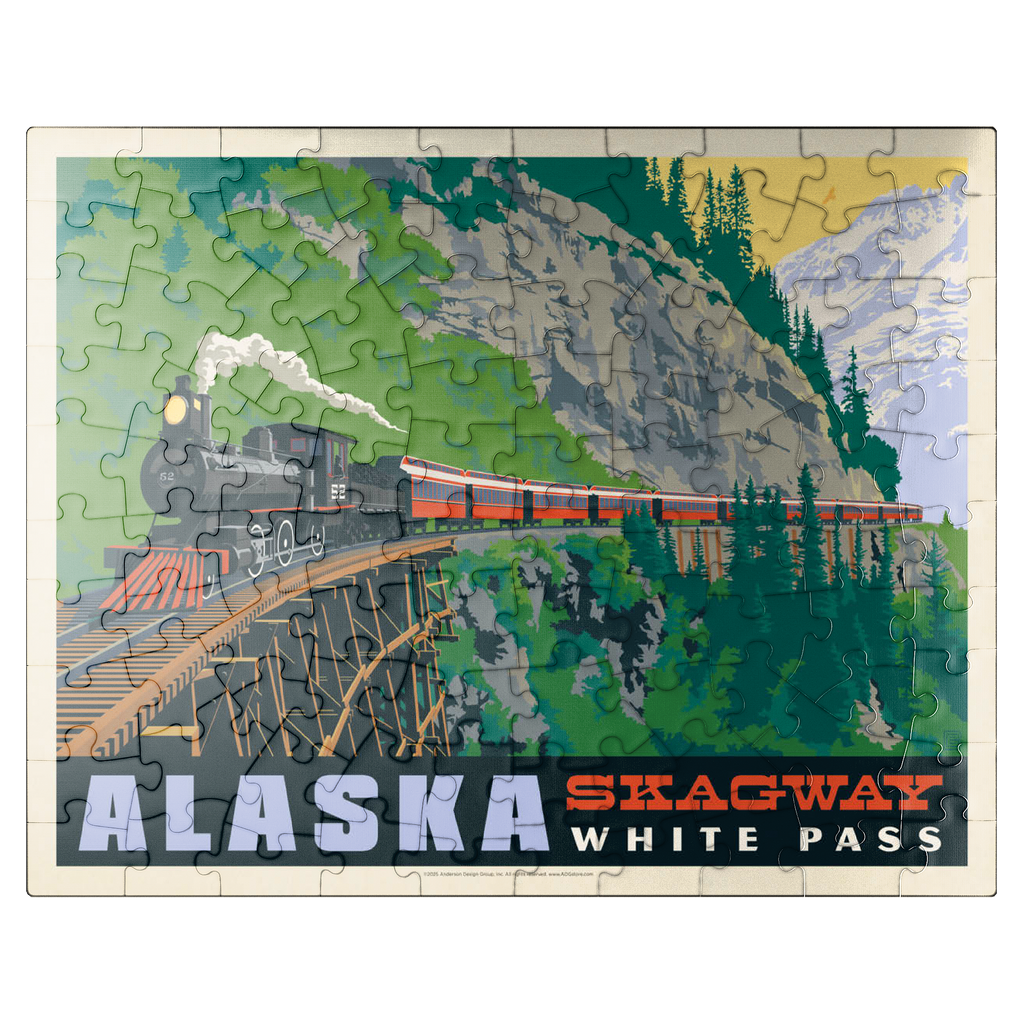The White Pass and Yukon Route in Skagway, Alaska, is one of the most famous historic railways in North America, offering breathtaking views and a journey through rugged mountain landscapes. This artwork captures the dramatic scene of a steam locomotive and its bright red passenger cars winding along a trestle bridge high above a steep gorge, with lush evergreen forests and snow-capped peaks completing the background. Originally built during the Klondike Gold Rush of 1898, the White Pass railway was an engineering marvel, overcoming treacherous terrain with steep grades, sharp curves, and towering bridges. Today, it stands as both a National Historic Engineering Landmark and a beloved attraction, carrying visitors through spectacular scenery that includes waterfalls, glaciers, and alpine valleys. The train ride from Skagway climbs nearly 3,000 feet to the White Pass summit, retracing the footsteps of gold rush stampeders who once braved this unforgiving wilderness.