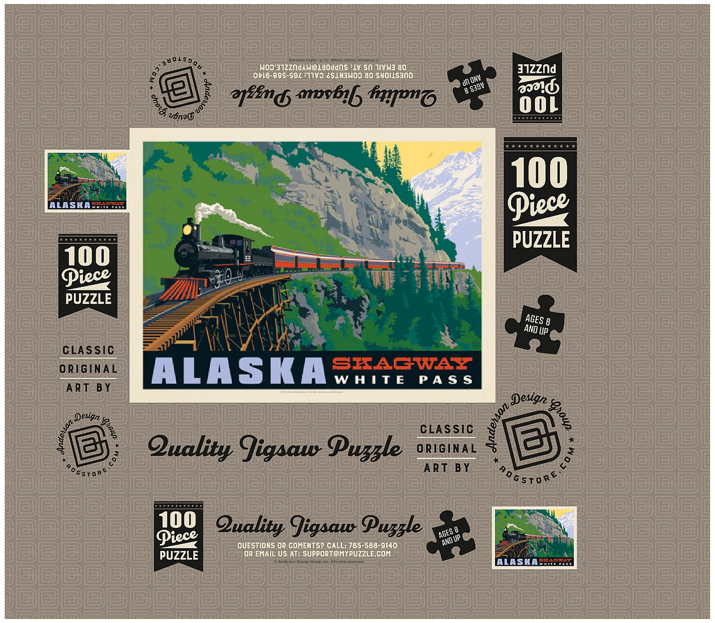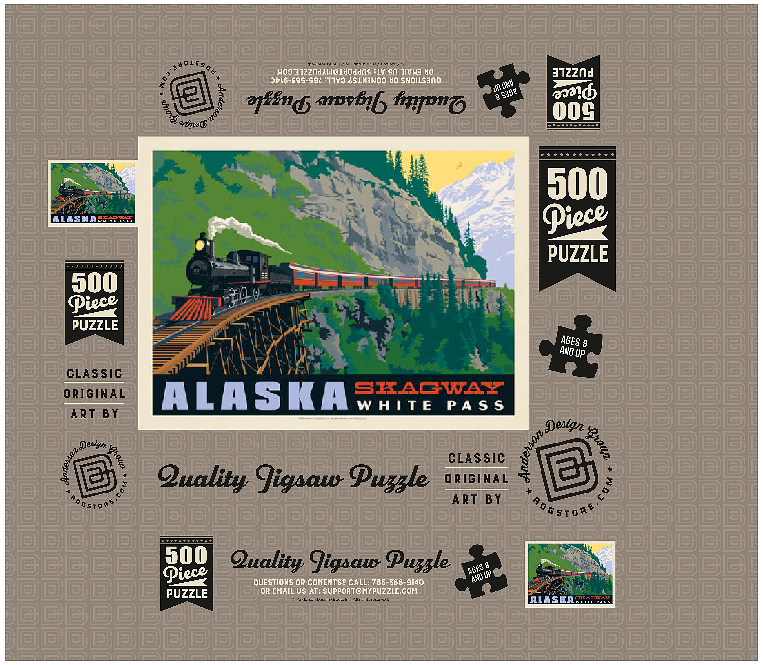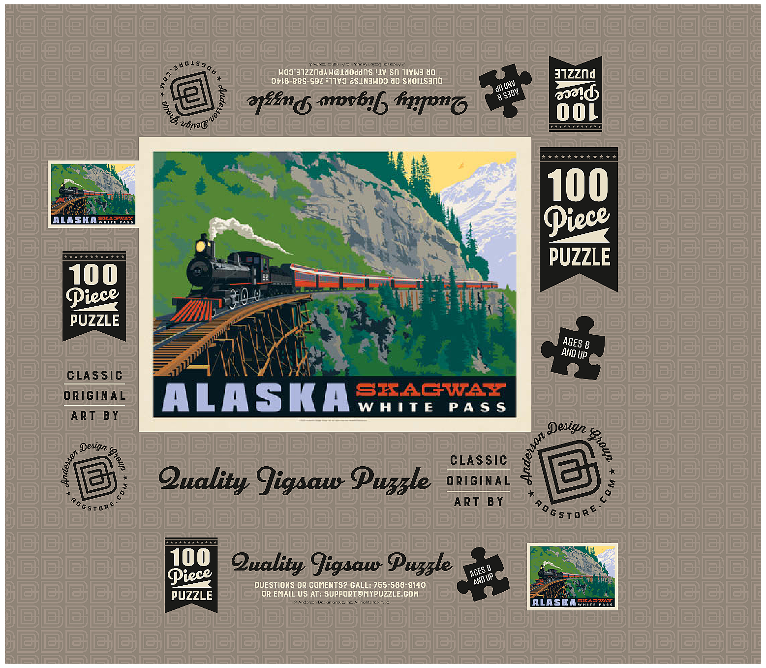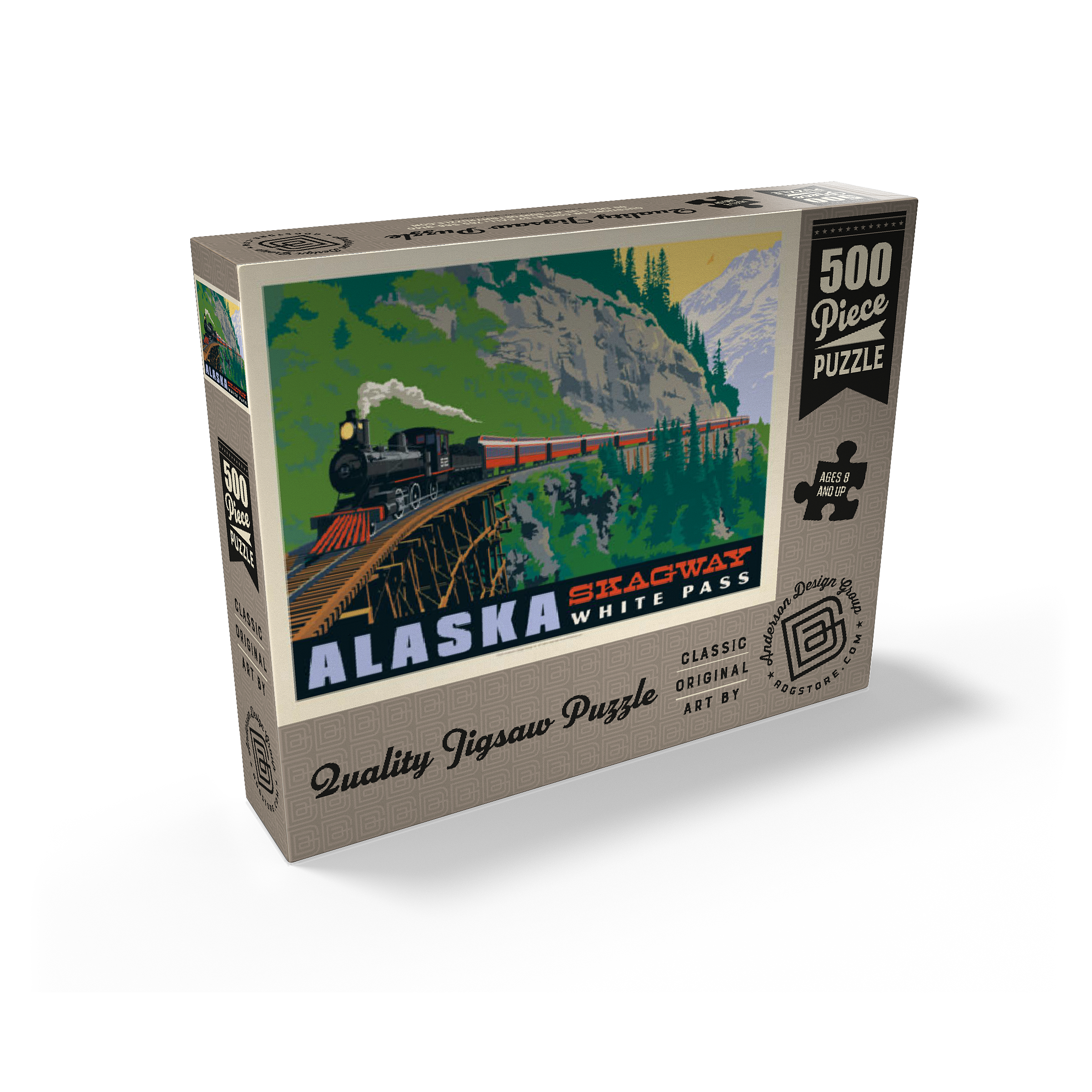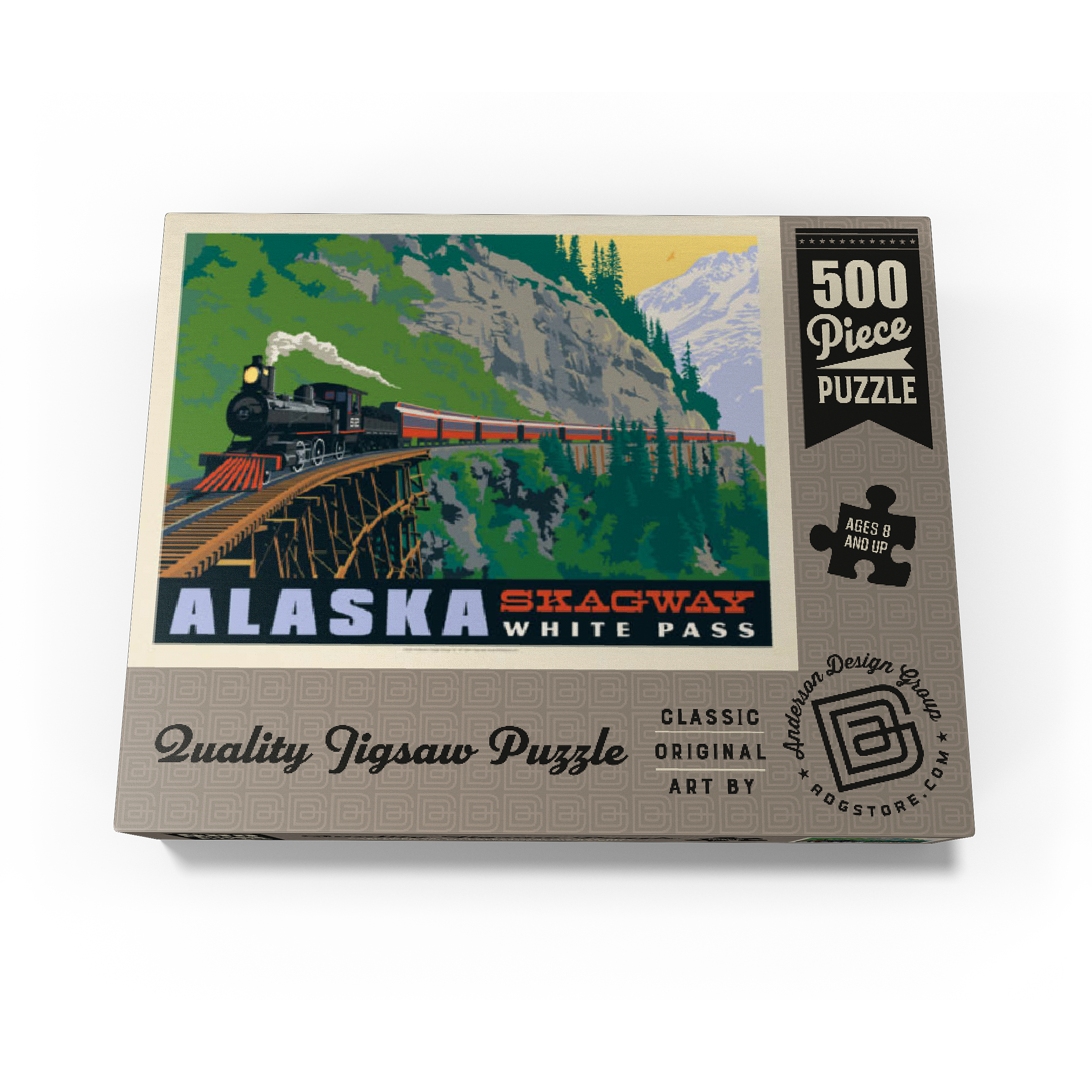The White Pass and Yukon Route in Skagway, Alaska, is one of the most famous historic railways in North America, offering breathtaking views and a journey through rugged mountain landscapes. This artwork captures the dramatic scene of a steam locomotive and its bright red passenger cars winding along a trestle bridge high above a steep gorge, with lush evergreen forests and snow-capped peaks completing the background. Originally built during the Klondike Gold Rush of 1898, the White Pass railway was an engineering marvel, overcoming treacherous terrain with steep grades, sharp curves, and towering bridges. Today, it stands as both a National Historic Engineering Landmark and a beloved attraction, carrying visitors through spectacular scenery that includes waterfalls, glaciers, and alpine valleys. The train ride from Skagway climbs nearly 3,000 feet to the White Pass summit, retracing the footsteps of gold rush stampeders who once braved this unforgiving wilderness.