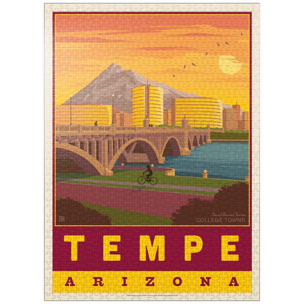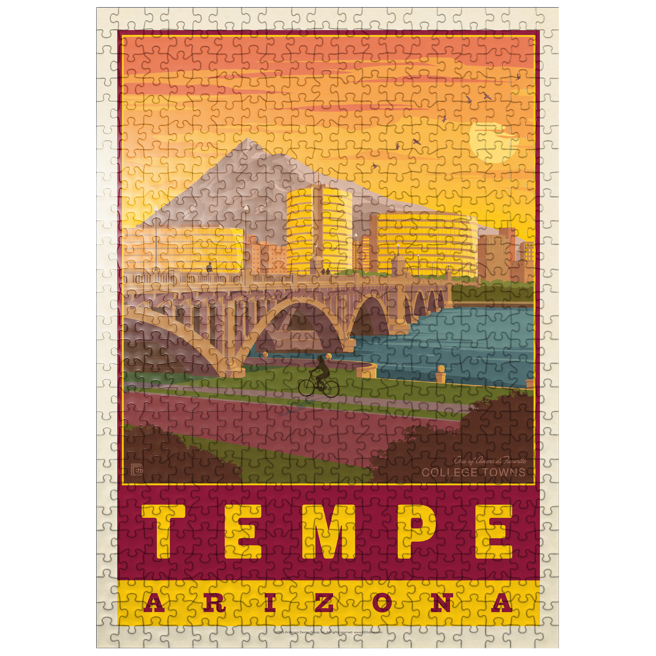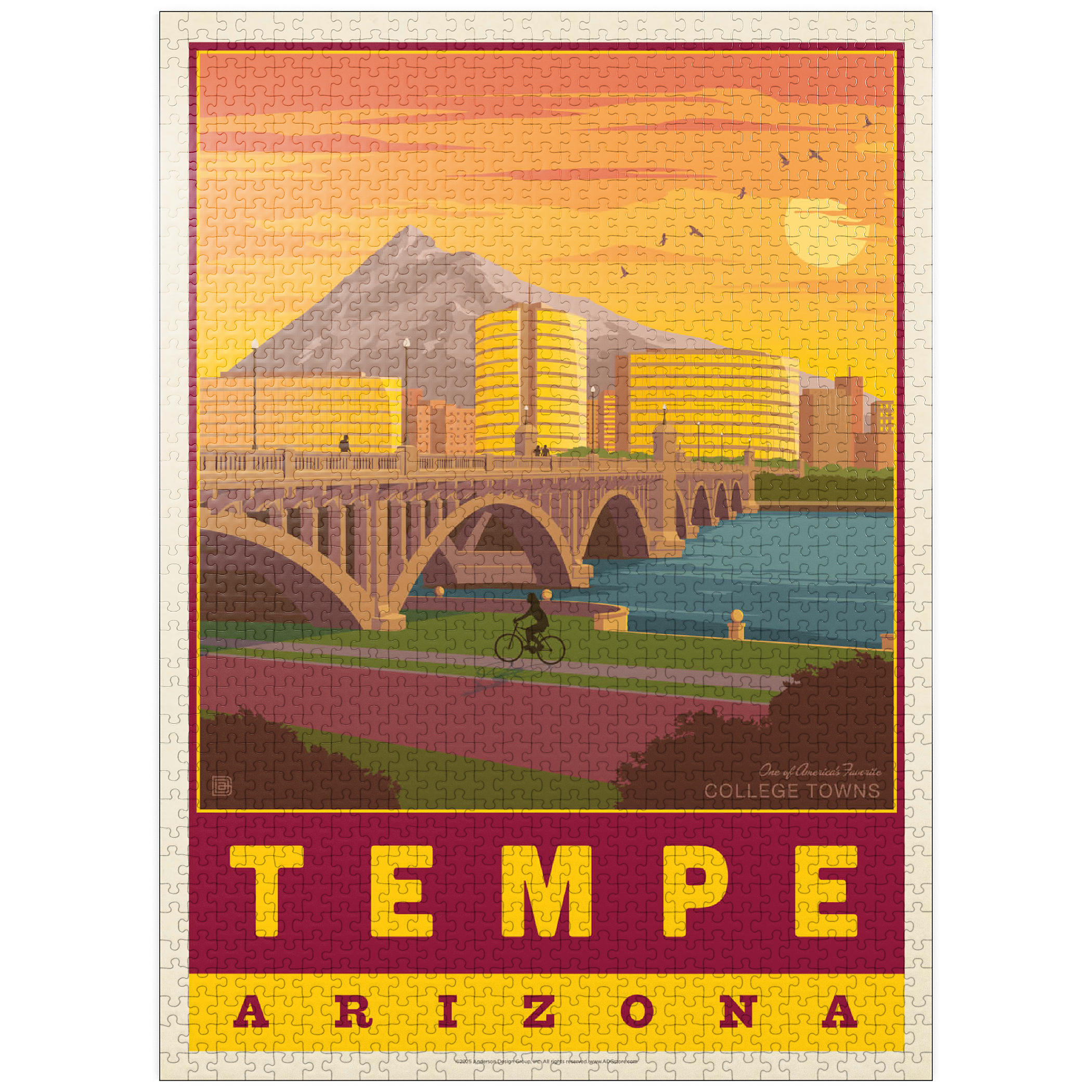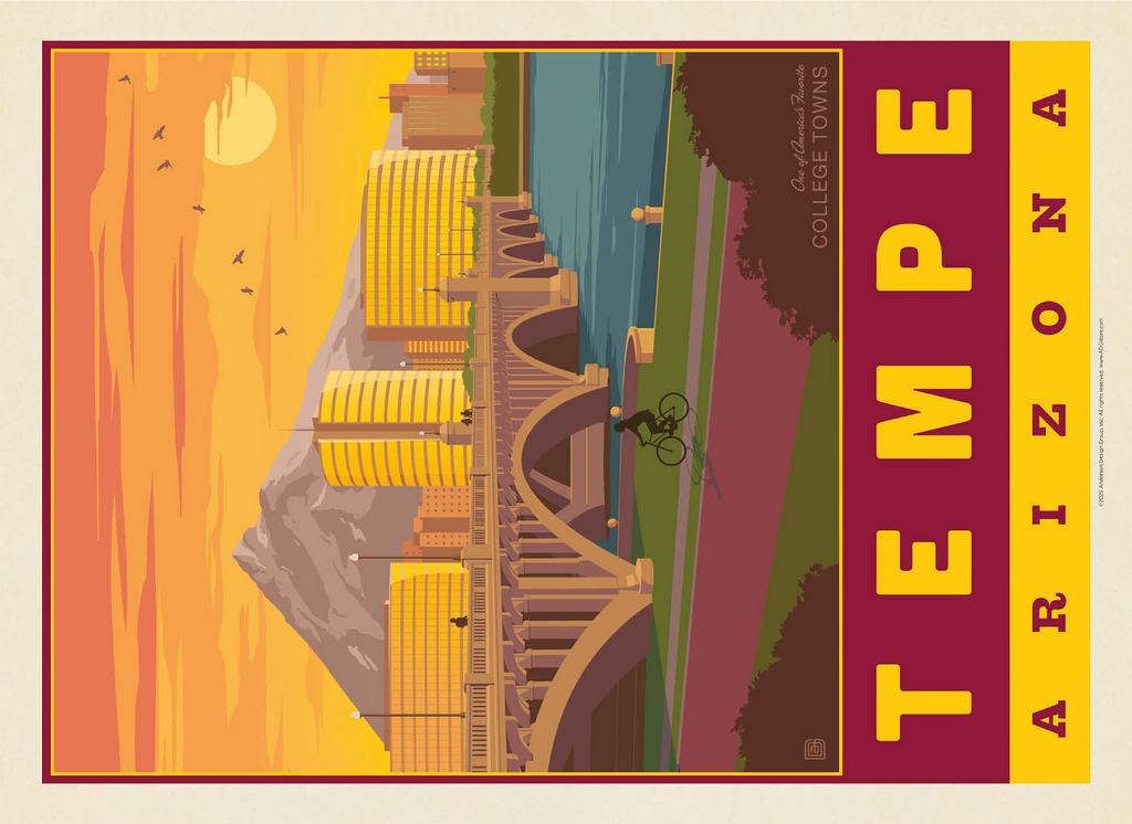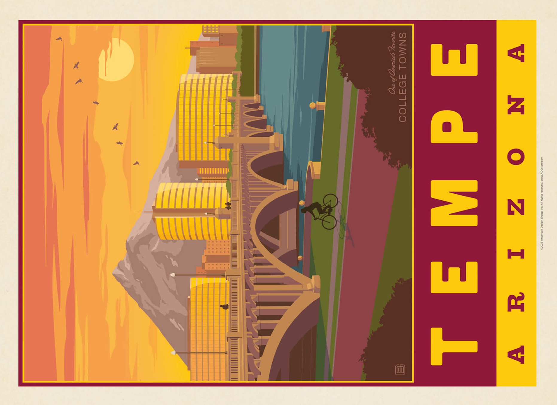 Tempe, Arizona, a lively college town in the heart of the Southwest, is beautifully illustrated with the Mill Avenue Bridge crossing Tempe Town Lake at sunset. The golden skyline reflects modern architecture, while mountains rise in the distance to create a striking desert backdrop. A cyclist along the waterfront highlights the city’s active outdoor lifestyle. Known for its vibrant downtown, cultural events, and warm climate, Tempe blends youthful energy with stunning desert landscapes. This design captures the city’s spirit, scenic waterways, and the iconic views that make Tempe one of the Southwest’s most appealing destinations.