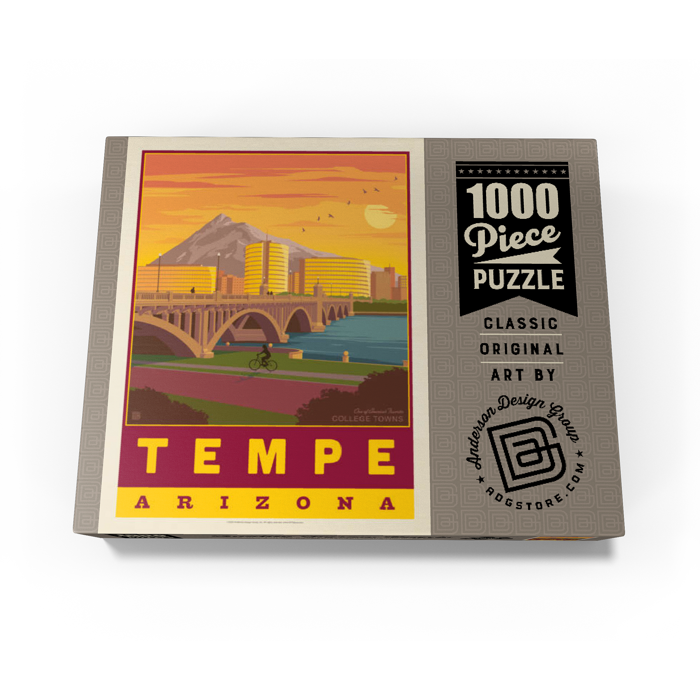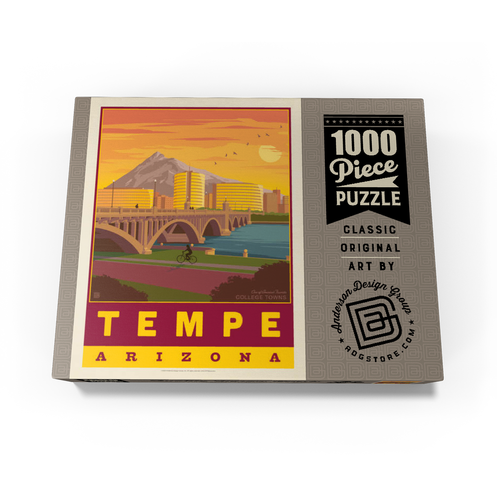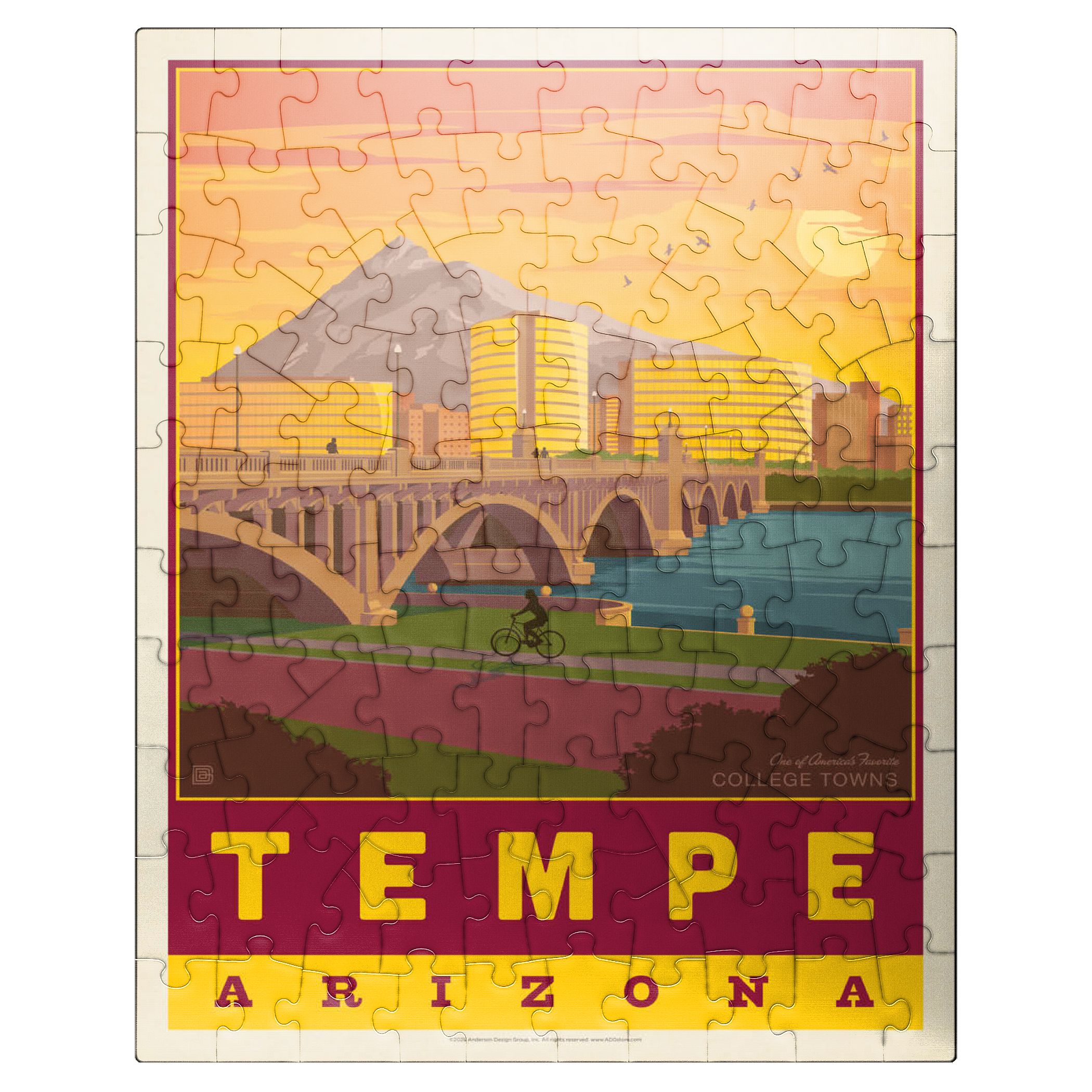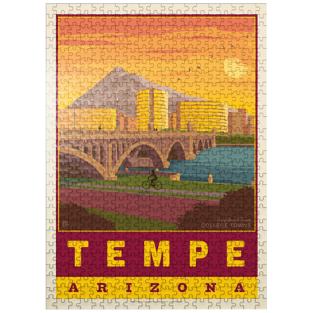 Tempe, Arizona, a lively college town in the heart of the Southwest, is beautifully illustrated with the Mill Avenue Bridge crossing Tempe Town Lake at sunset. The golden skyline reflects modern architecture, while mountains rise in the distance to create a striking desert backdrop. A cyclist along the waterfront highlights the city’s active outdoor lifestyle. Known for its vibrant downtown, cultural events, and warm climate, Tempe blends youthful energy with stunning desert landscapes. This design captures the city’s spirit, scenic waterways, and the iconic views that make Tempe one of the Southwest’s most appealing destinations.