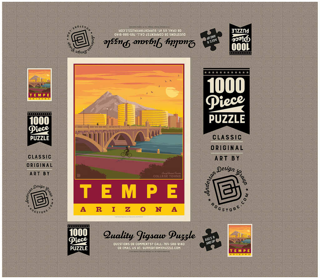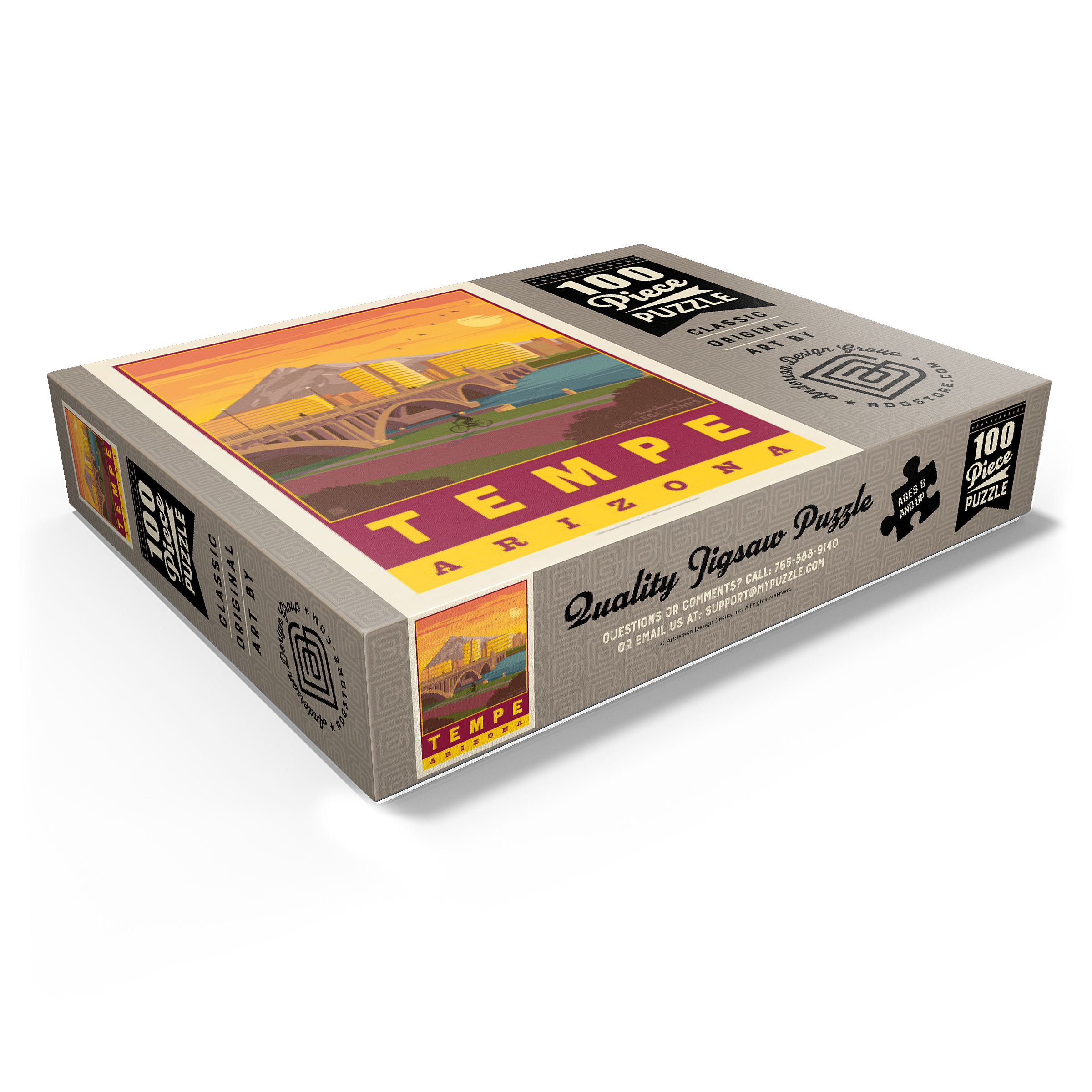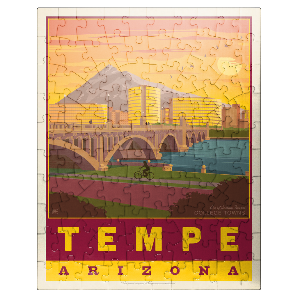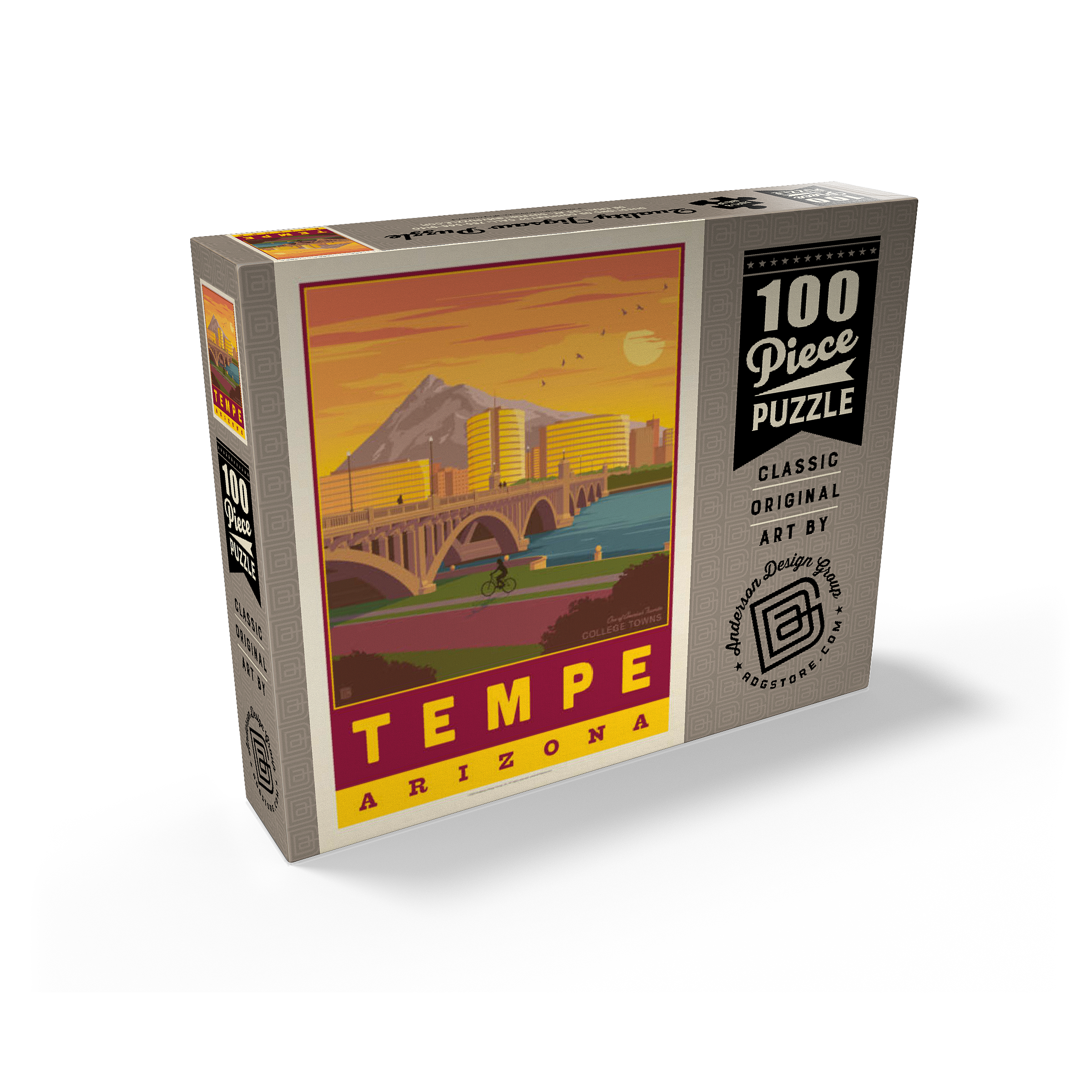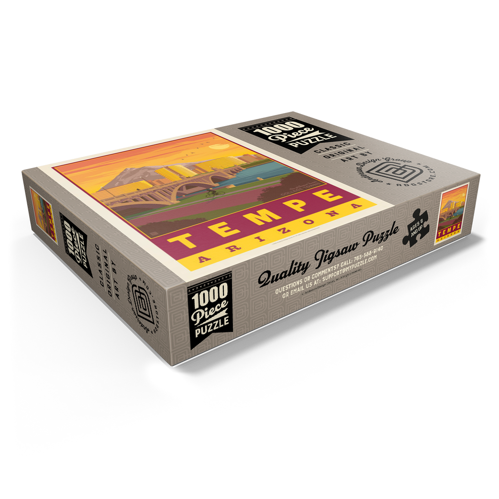 Tempe, Arizona, a lively college town in the heart of the Southwest, is beautifully illustrated with the Mill Avenue Bridge crossing Tempe Town Lake at sunset. The golden skyline reflects modern architecture, while mountains rise in the distance to create a striking desert backdrop. A cyclist along the waterfront highlights the city’s active outdoor lifestyle. Known for its vibrant downtown, cultural events, and warm climate, Tempe blends youthful energy with stunning desert landscapes. This design captures the city’s spirit, scenic waterways, and the iconic views that make Tempe one of the Southwest’s most appealing destinations.