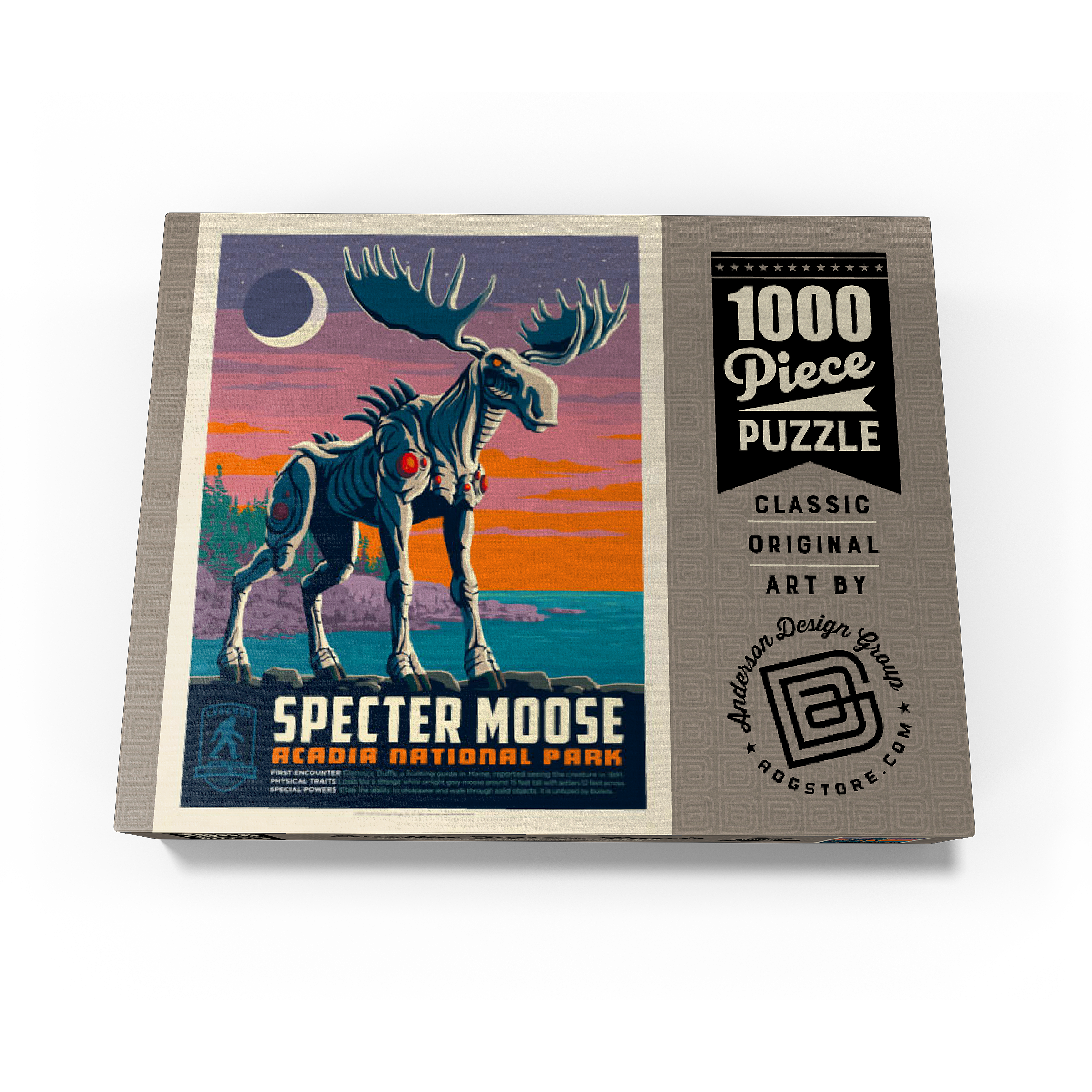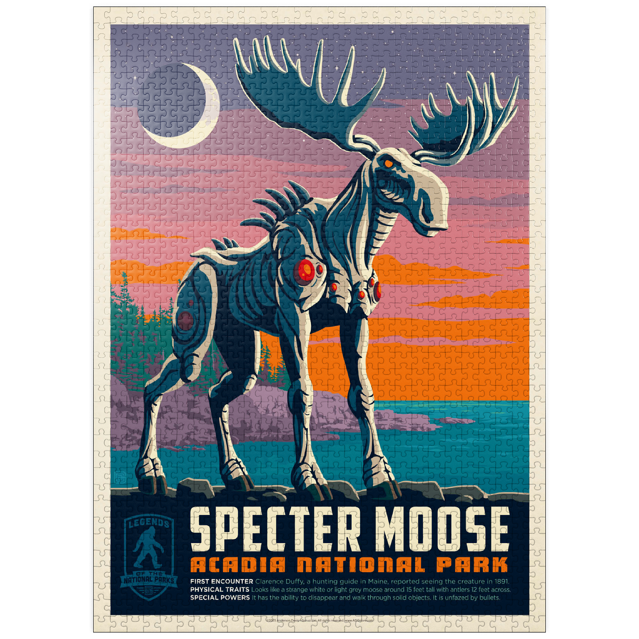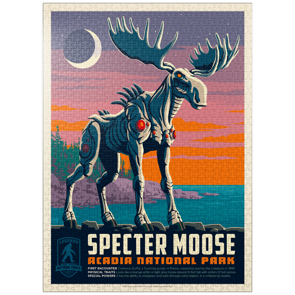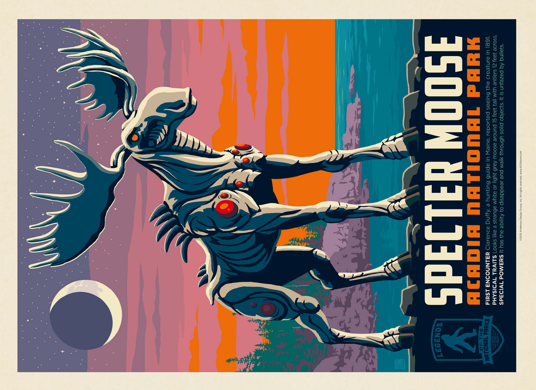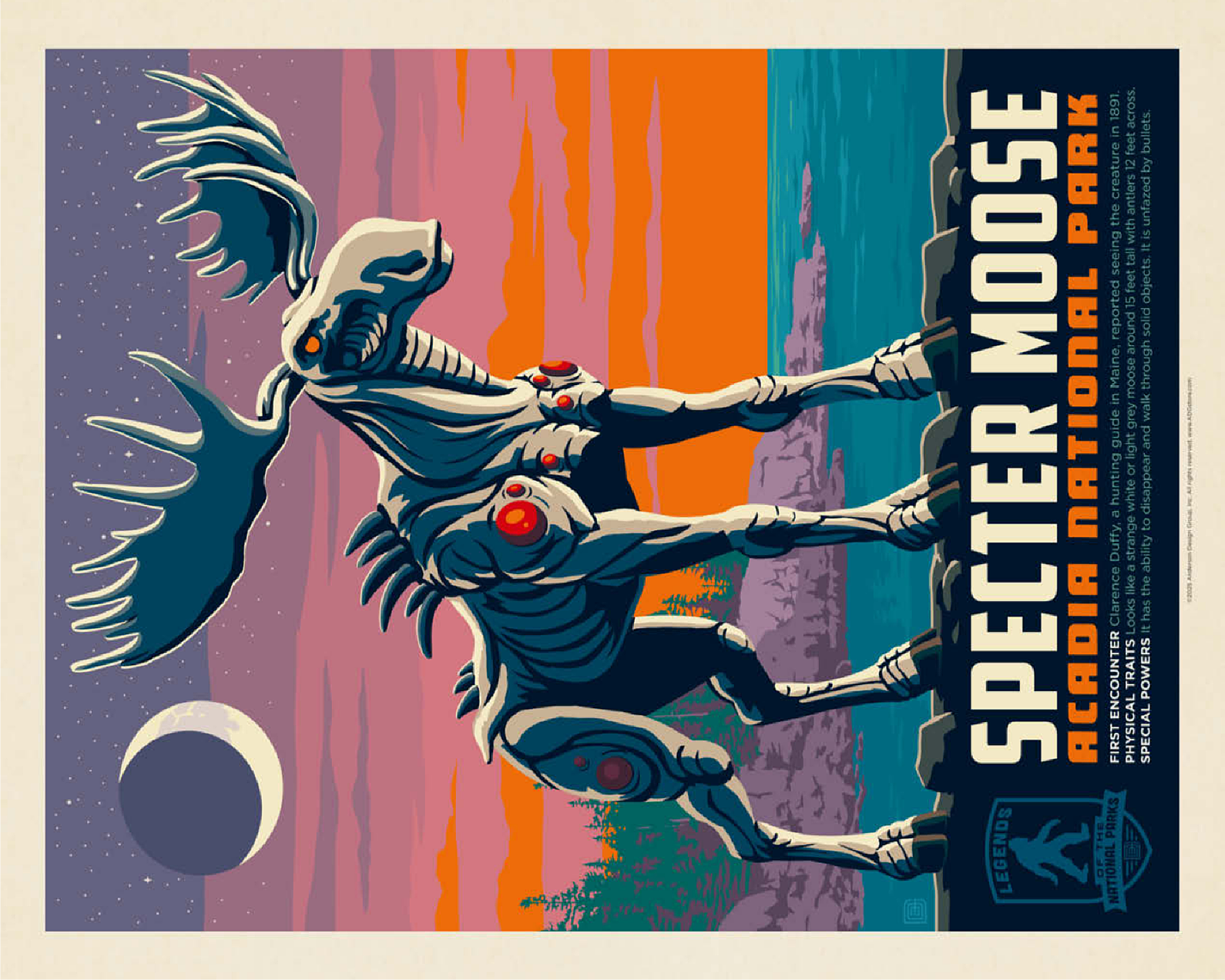 The Specter Moose is a legendary cryptid said to roam the forests of Acadia National Park, Maine. First reported in 1891 by hunting guide Clarence Duffy, this supernatural creature is described as an enormous moose, standing 15 feet tall with 12-foot-wide antlers. Its eerie white or ghostly appearance adds to its mystique, and folklore claims it possesses the ability to disappear and walk through solid objects, making it impervious to bullets. This vintage-style artwork captures the mythical beast under a moonlit sky, with a stunning twilight backdrop of Acadia's rugged coastline. A perfect piece for cryptid enthusiasts, national park lovers, and fans of American folklore, this design merges artistic creativity with legendary storytelling.