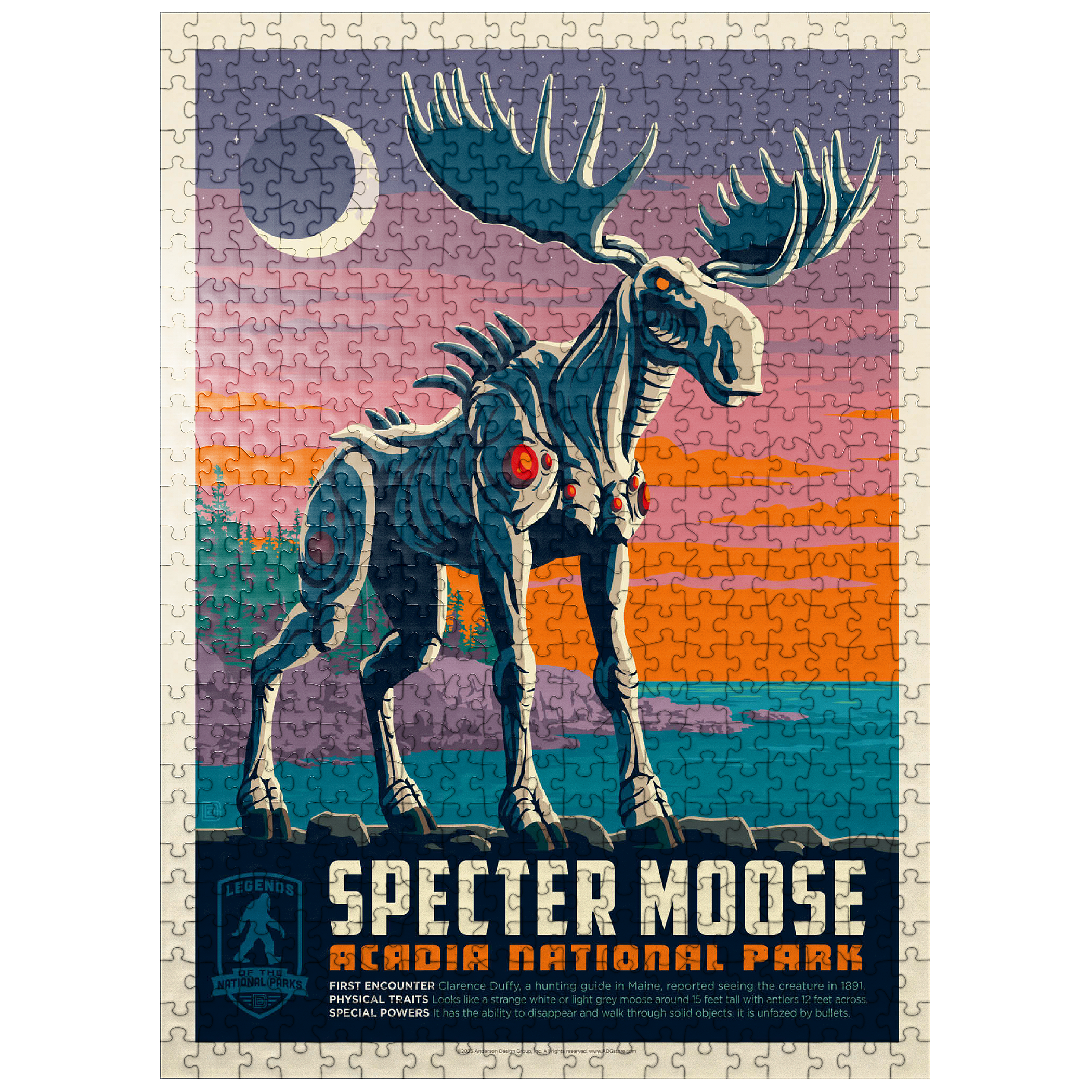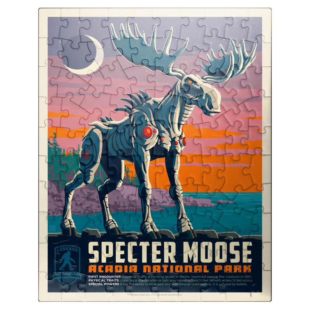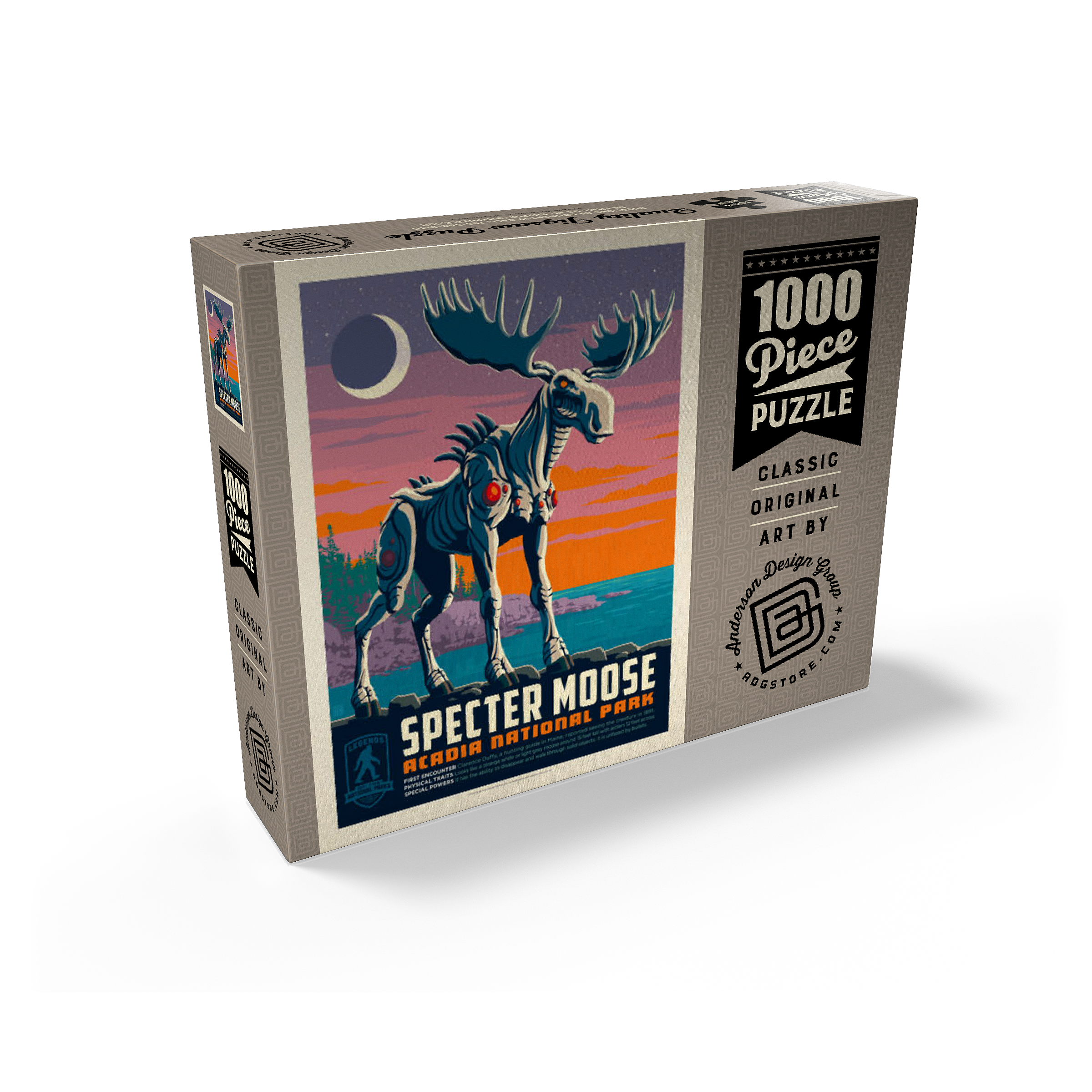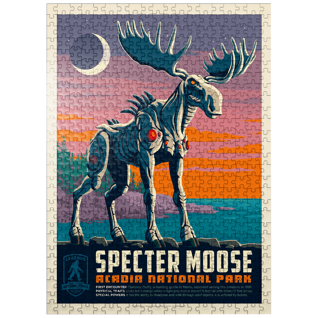 The Specter Moose is a legendary cryptid said to roam the forests of Acadia National Park, Maine. First reported in 1891 by hunting guide Clarence Duffy, this supernatural creature is described as an enormous moose, standing 15 feet tall with 12-foot-wide antlers. Its eerie white or ghostly appearance adds to its mystique, and folklore claims it possesses the ability to disappear and walk through solid objects, making it impervious to bullets. This vintage-style artwork captures the mythical beast under a moonlit sky, with a stunning twilight backdrop of Acadia's rugged coastline. A perfect piece for cryptid enthusiasts, national park lovers, and fans of American folklore, this design merges artistic creativity with legendary storytelling.