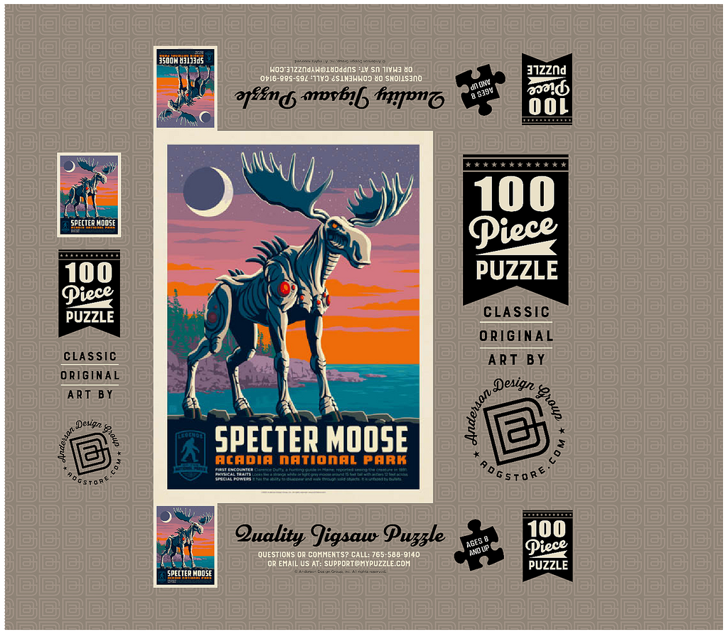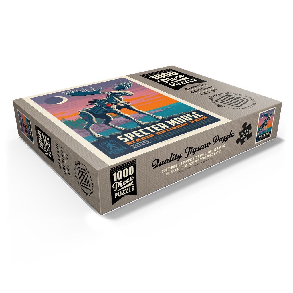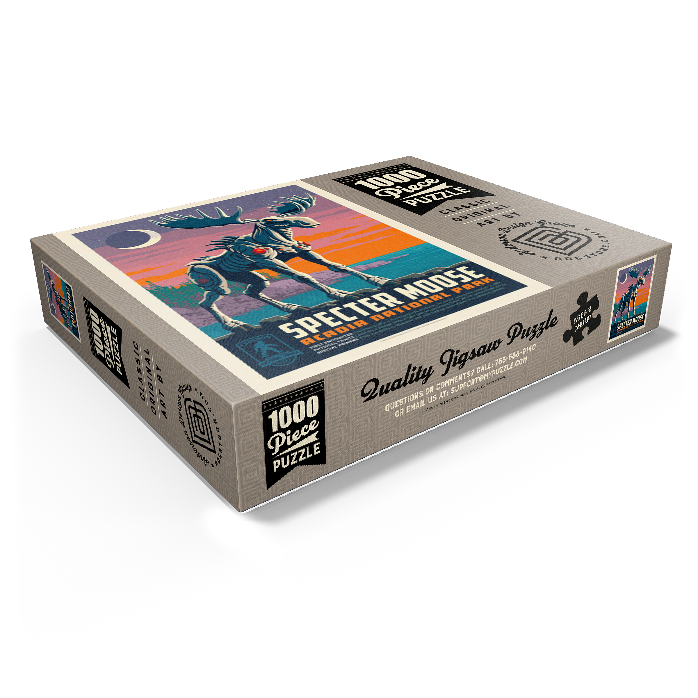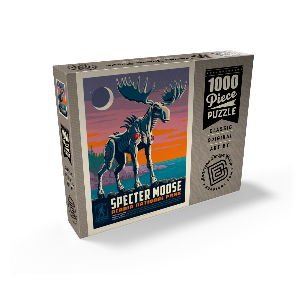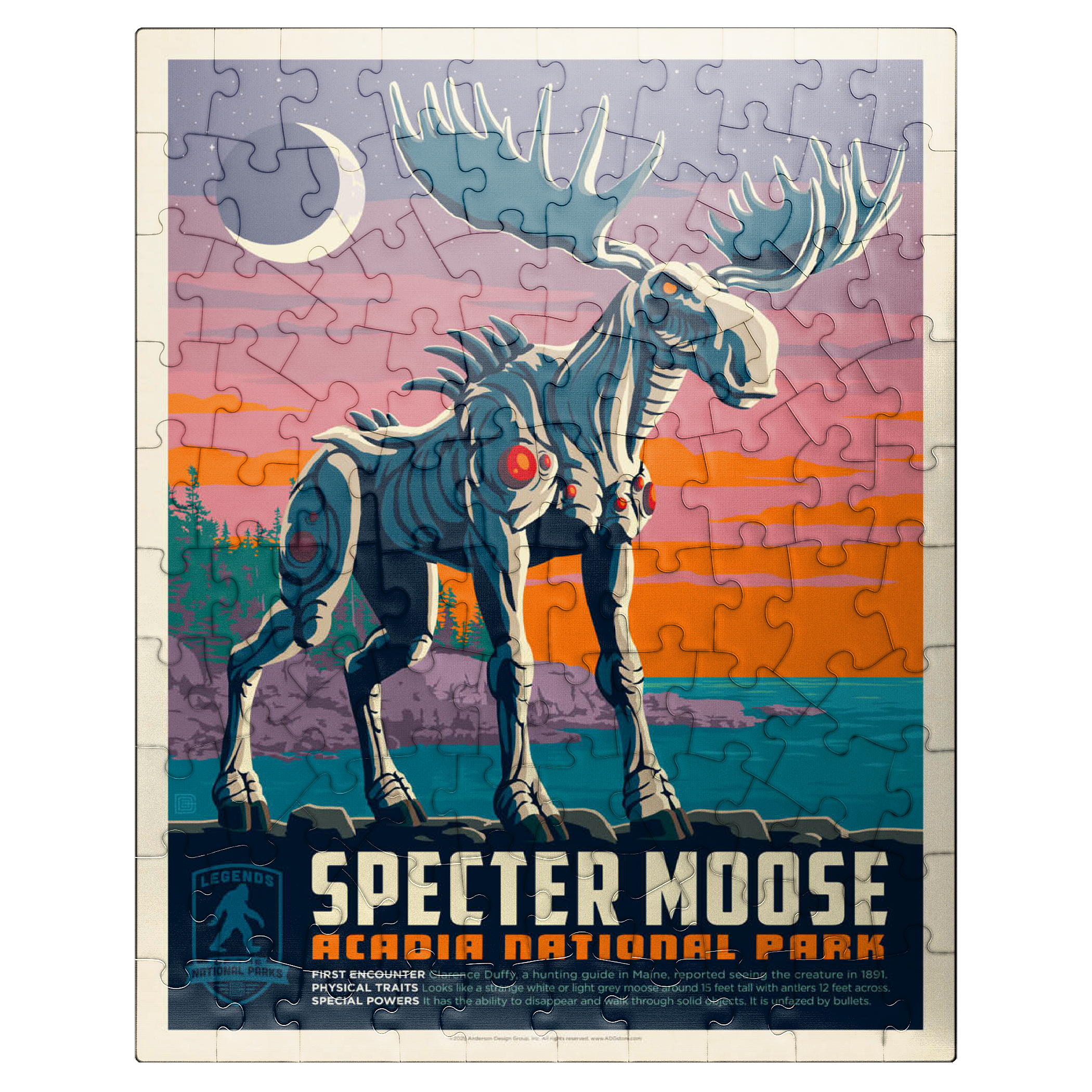 The Specter Moose is a legendary cryptid said to roam the forests of Acadia National Park, Maine. First reported in 1891 by hunting guide Clarence Duffy, this supernatural creature is described as an enormous moose, standing 15 feet tall with 12-foot-wide antlers. Its eerie white or ghostly appearance adds to its mystique, and folklore claims it possesses the ability to disappear and walk through solid objects, making it impervious to bullets. This vintage-style artwork captures the mythical beast under a moonlit sky, with a stunning twilight backdrop of Acadia's rugged coastline. A perfect piece for cryptid enthusiasts, national park lovers, and fans of American folklore, this design merges artistic creativity with legendary storytelling.