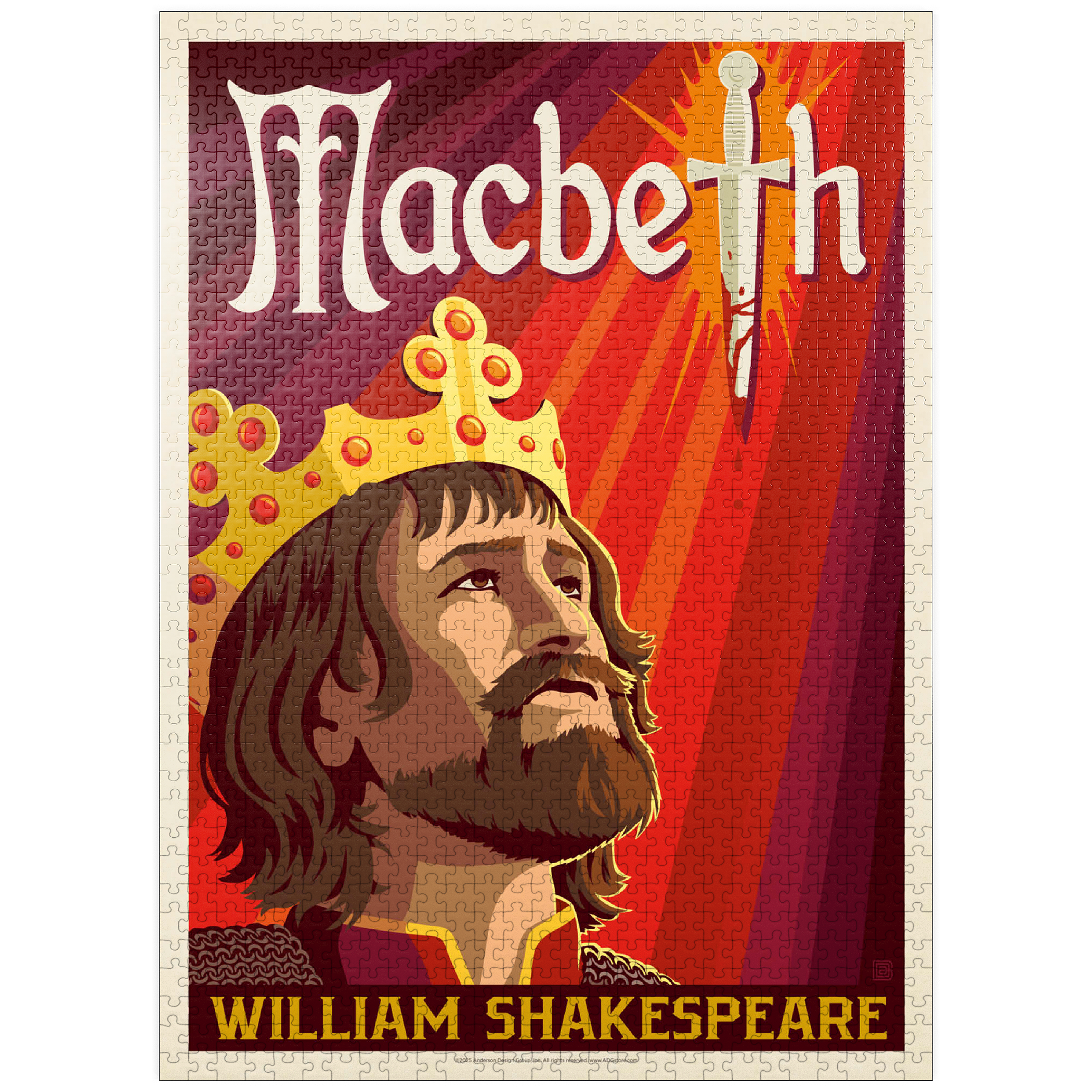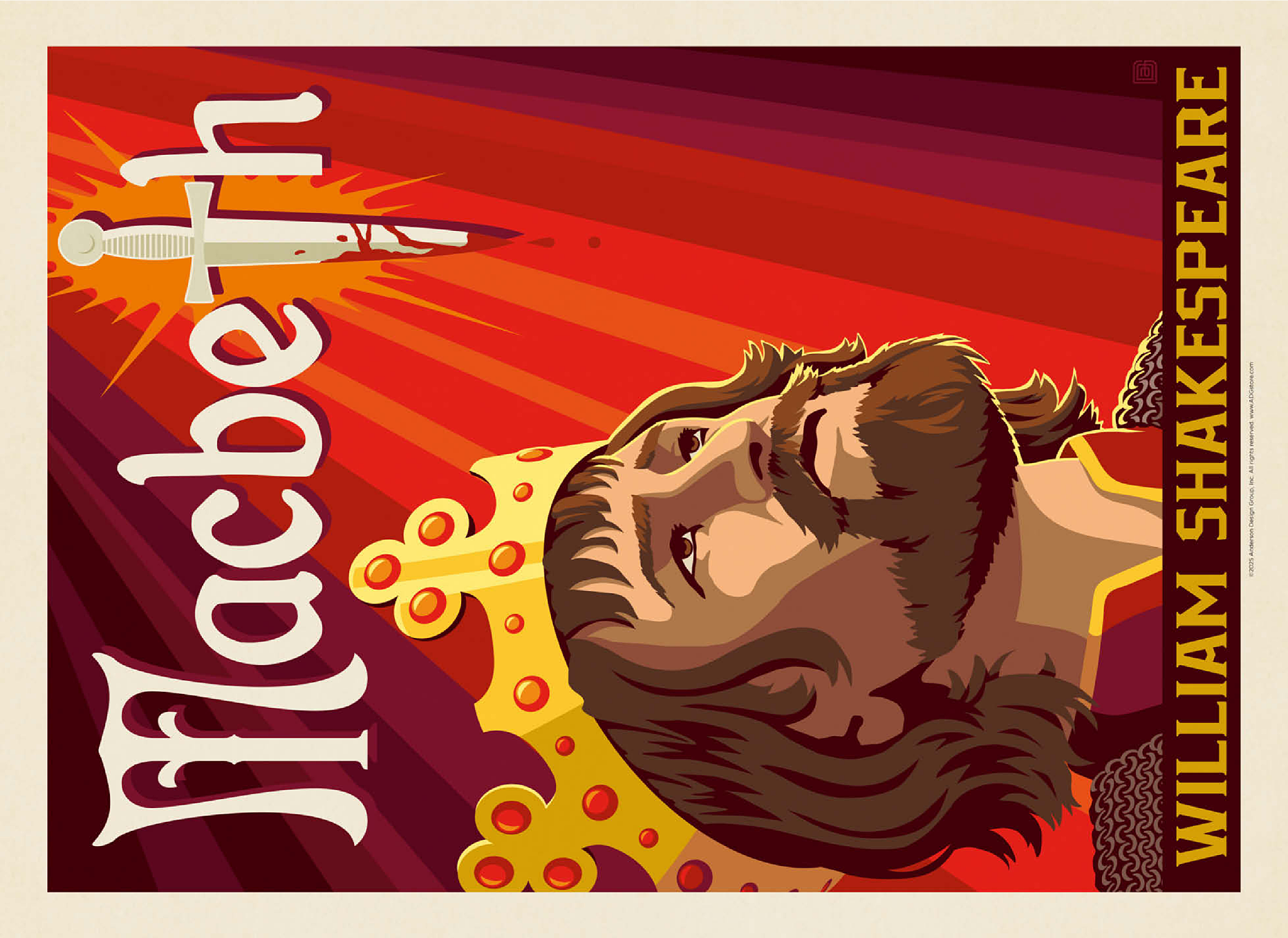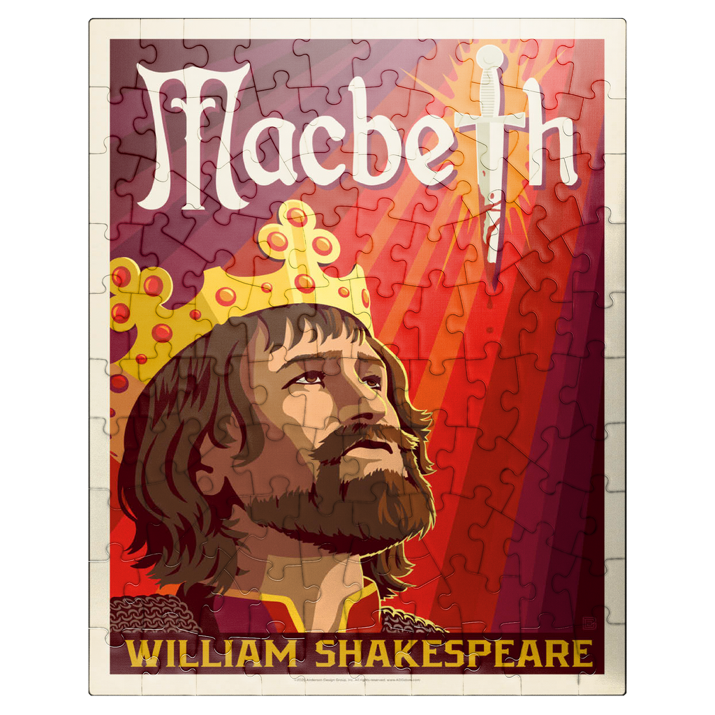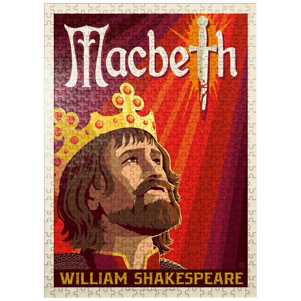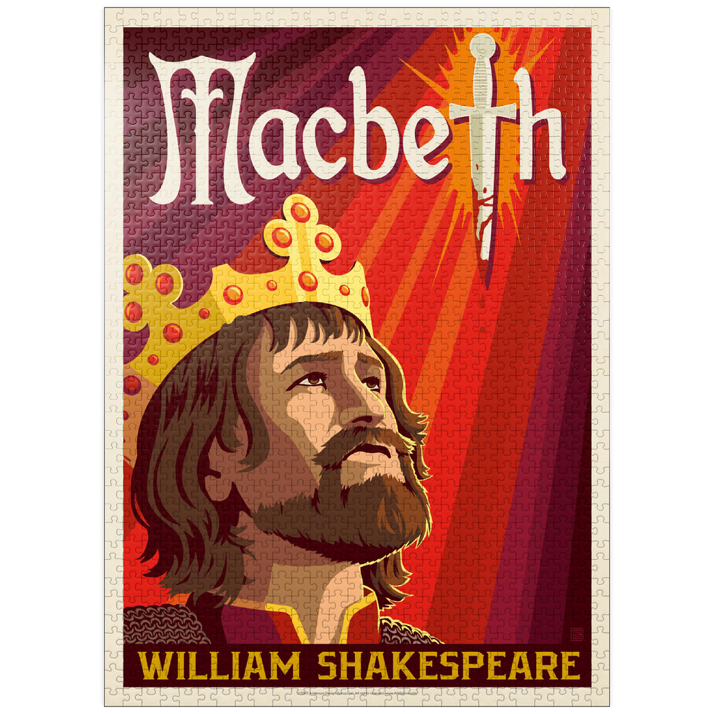 This striking artistic depiction presents Macbeth, the legendary tragic figure from William Shakespeare’s renowned play, captured in a moment of intense ambition and inner conflict. The crowned king is illustrated gazing upward, symbolizing his relentless pursuit of power and the heavy burden of his destiny. Dominating the background is a blood-stained dagger, dramatically integrated into the typography, representing the central theme of betrayal, murder, and fate that drives the story forward. The deep red and orange tones evoke tension, violence, and the psychological turmoil that permeate Macbeth’s rise and fall. The stylized composition combines bold graphic elements with medieval detailing, perfectly reflecting the dark, dramatic essence of Shakespeare’s work. As one of the most famous tragedies in English literature, Macbeth continues to captivate audiences with its exploration of ambition, guilt, and moral decay. This visual interpretation highlights the emotional depth and timeless relevance of
