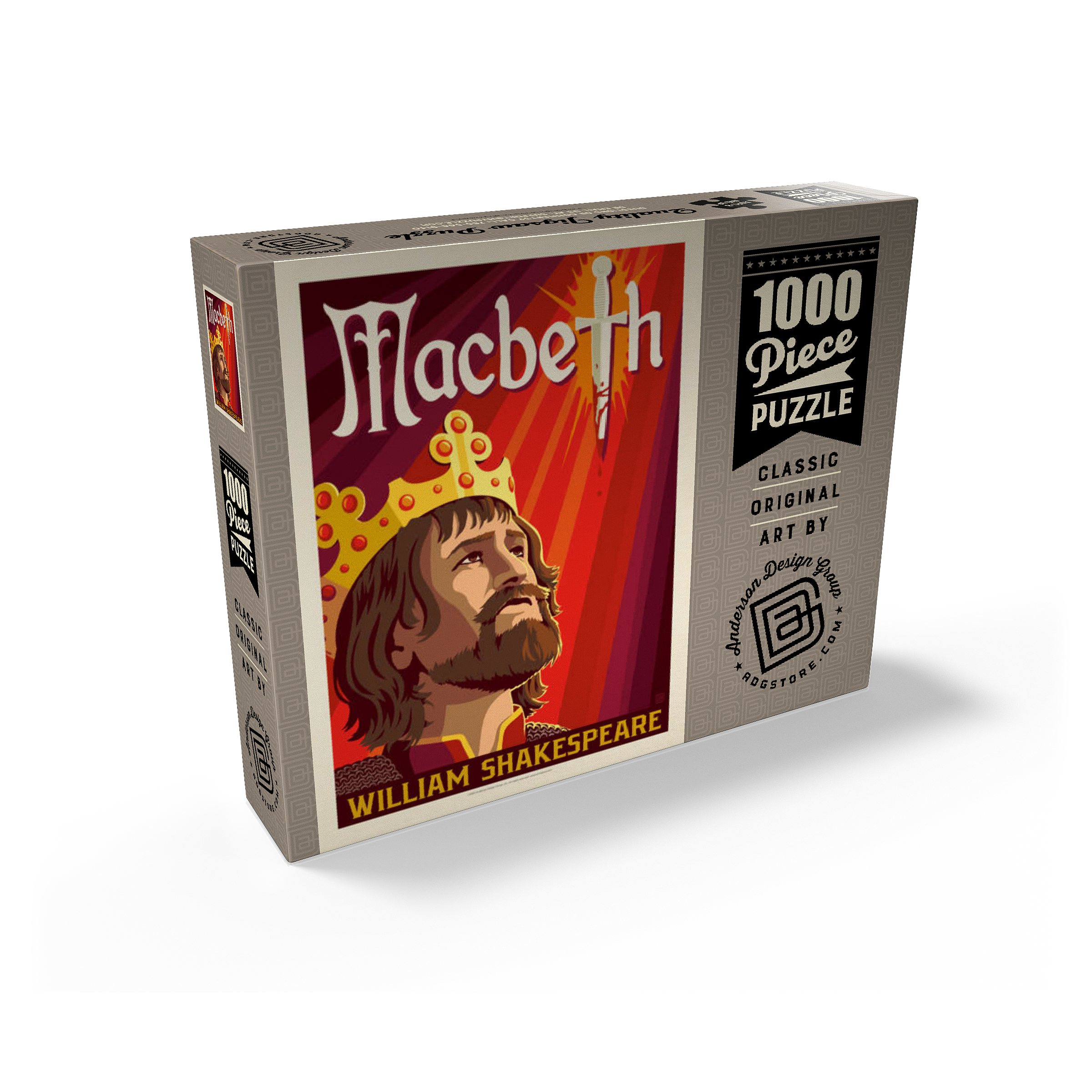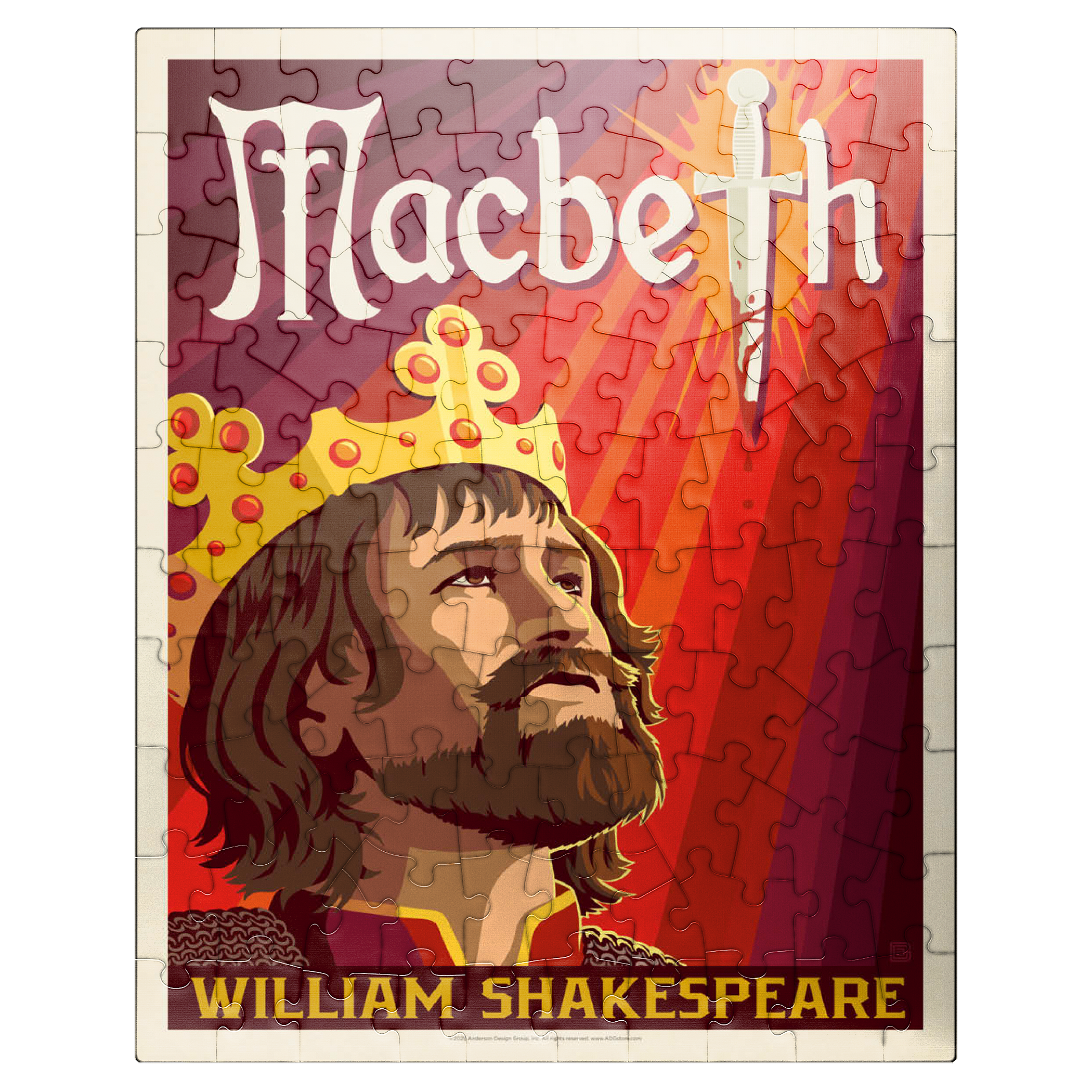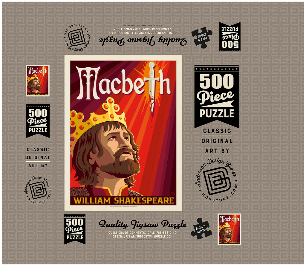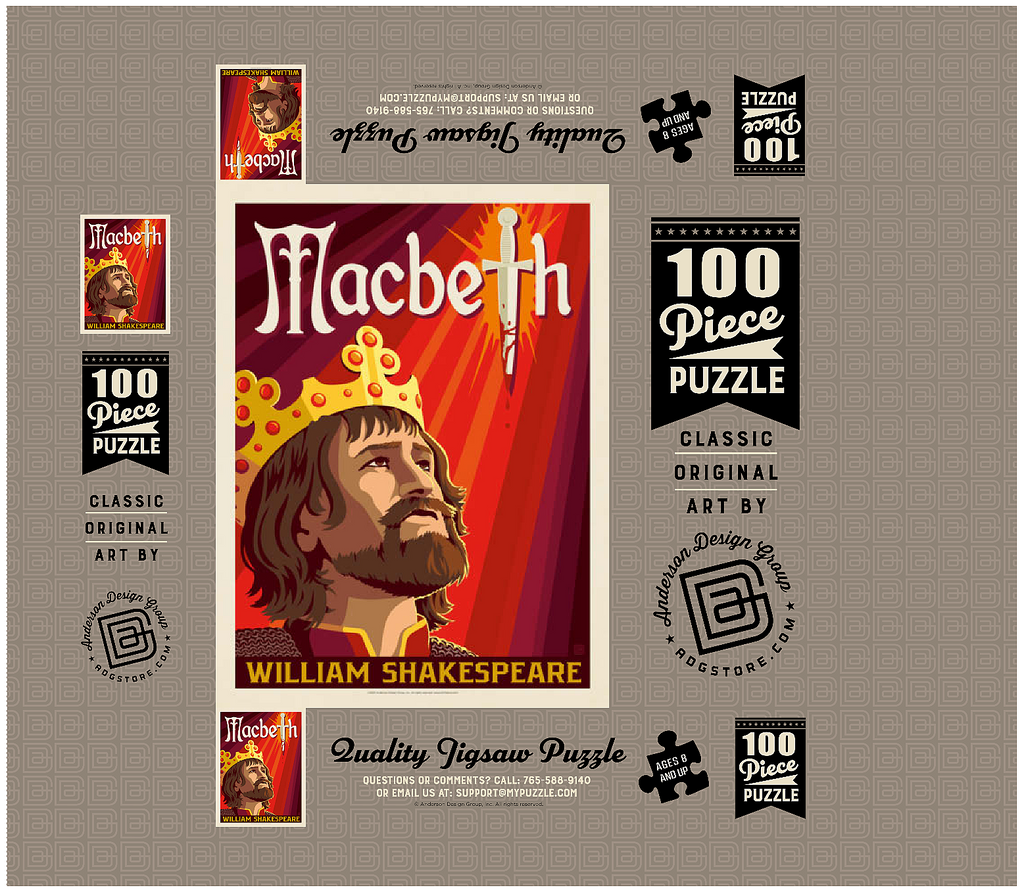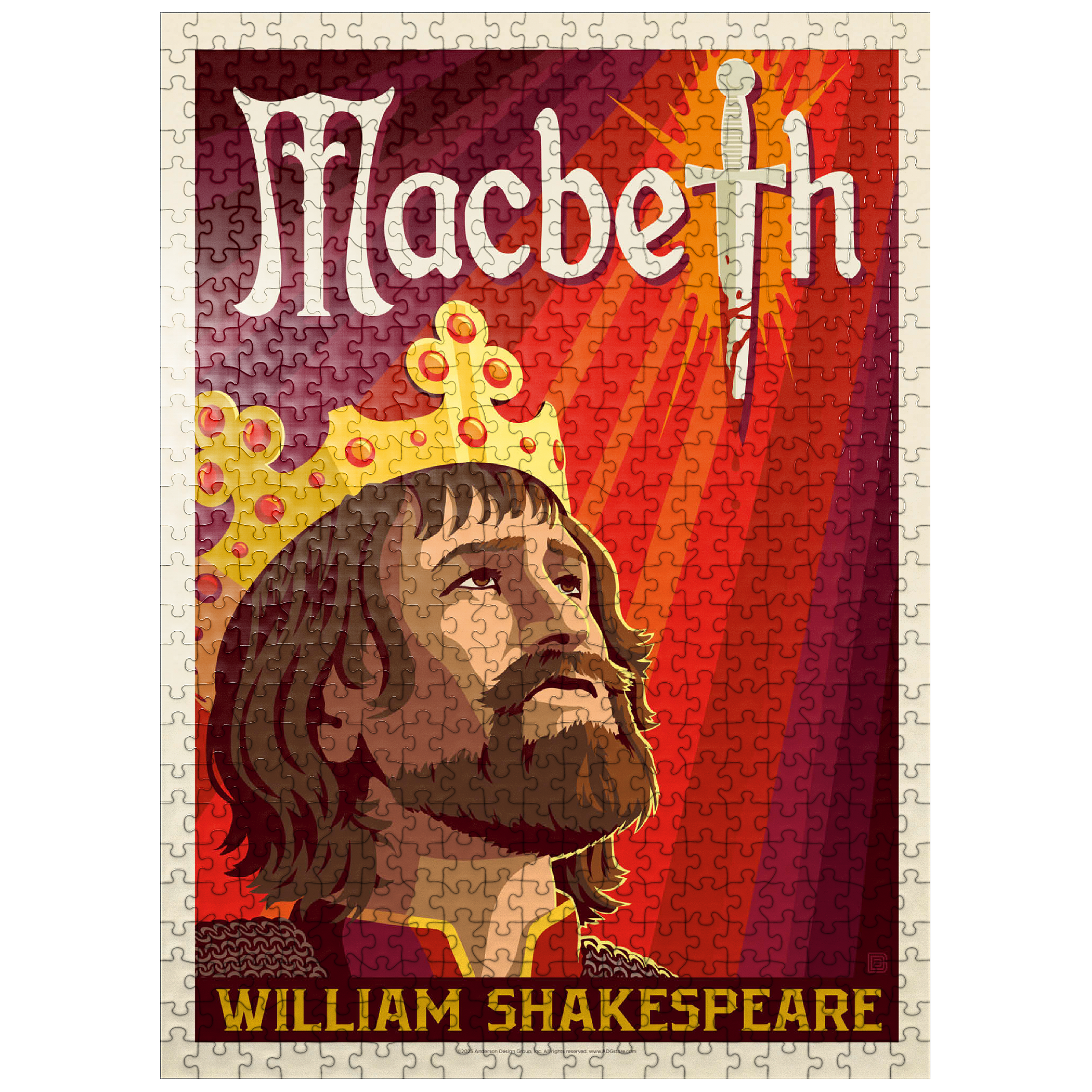 This striking artistic depiction presents Macbeth, the legendary tragic figure from William Shakespeare’s renowned play, captured in a moment of intense ambition and inner conflict. The crowned king is illustrated gazing upward, symbolizing his relentless pursuit of power and the heavy burden of his destiny. Dominating the background is a blood-stained dagger, dramatically integrated into the typography, representing the central theme of betrayal, murder, and fate that drives the story forward. The deep red and orange tones evoke tension, violence, and the psychological turmoil that permeate Macbeth’s rise and fall. The stylized composition combines bold graphic elements with medieval detailing, perfectly reflecting the dark, dramatic essence of Shakespeare’s work. As one of the most famous tragedies in English literature, Macbeth continues to captivate audiences with its exploration of ambition, guilt, and moral decay. This visual interpretation highlights the emotional depth and timeless relevance of