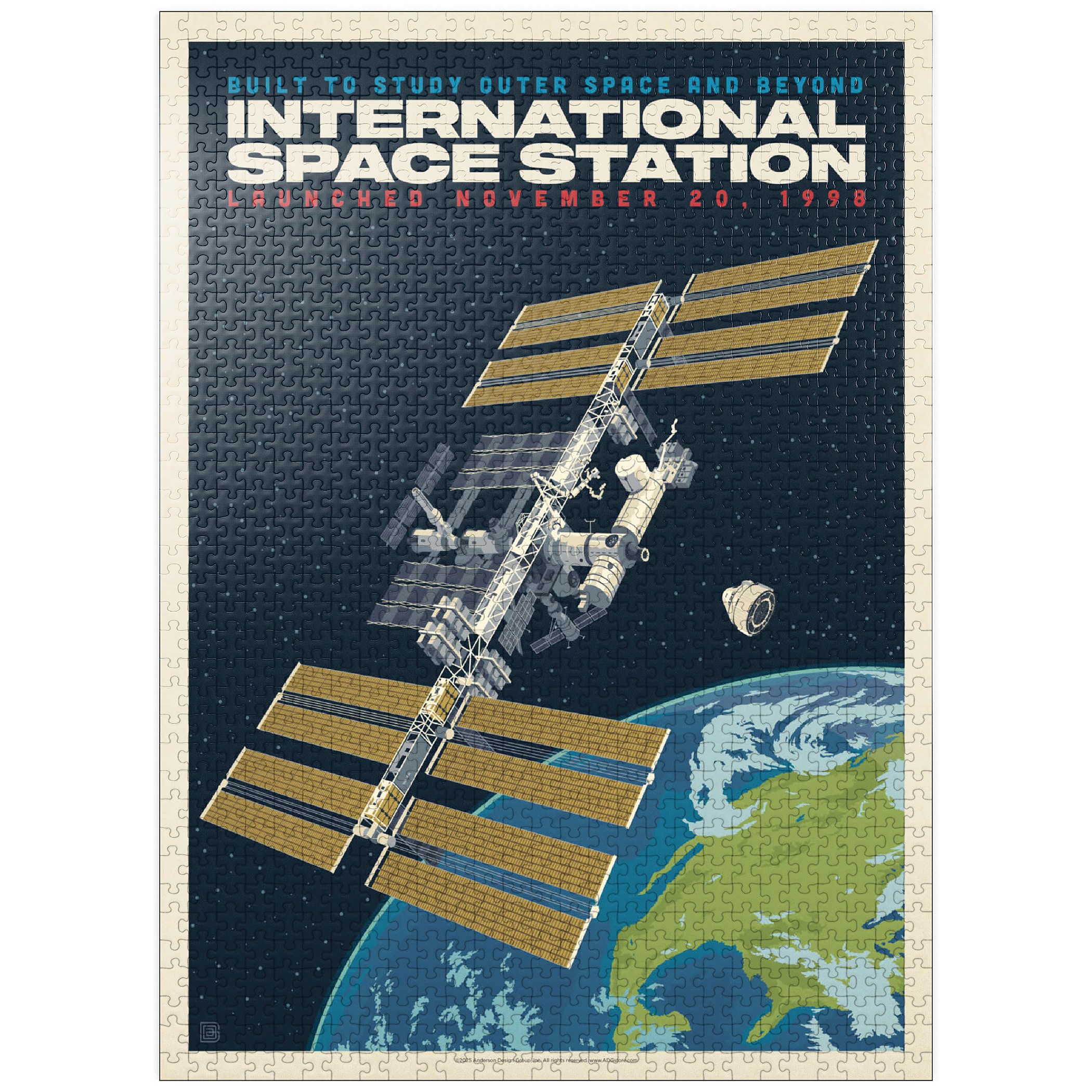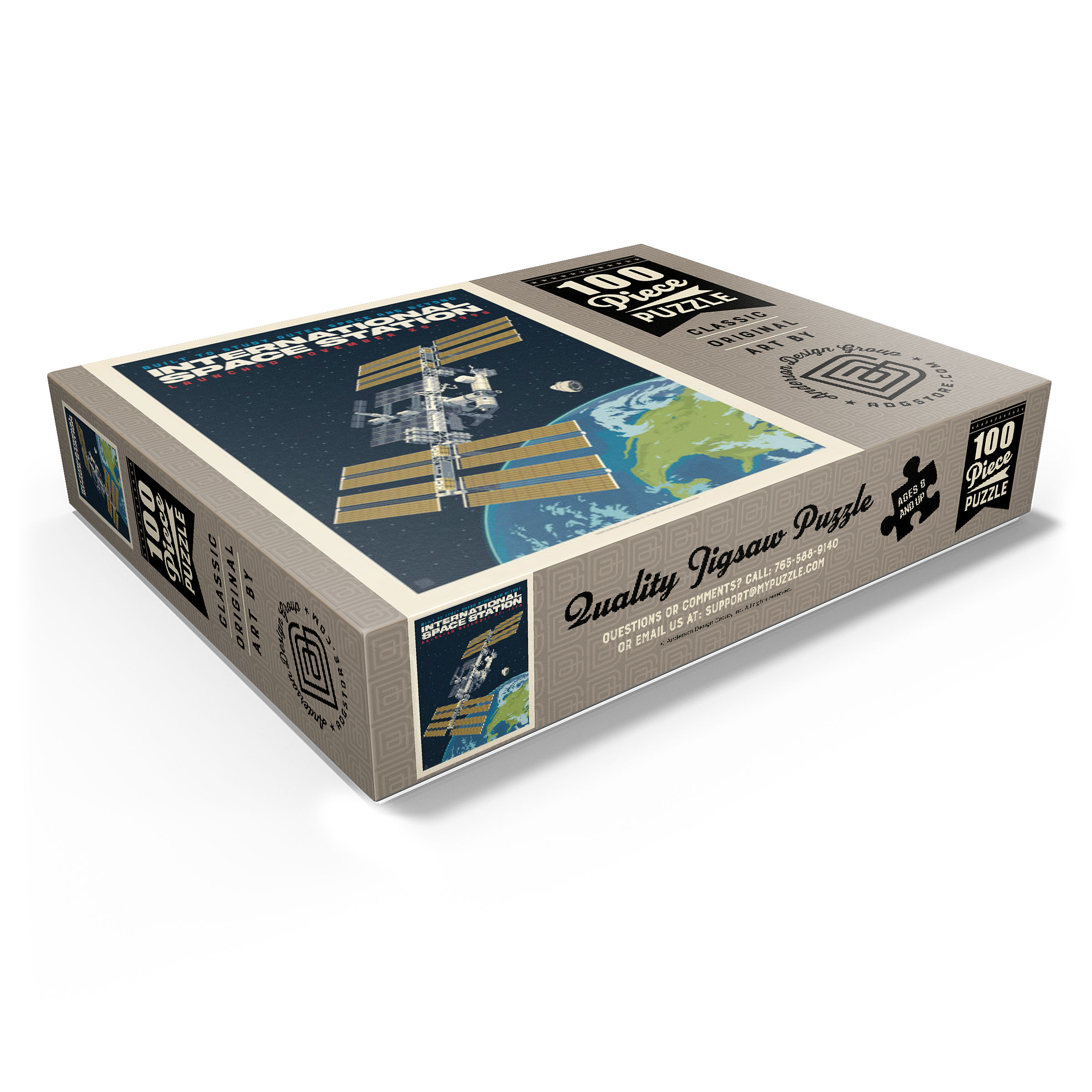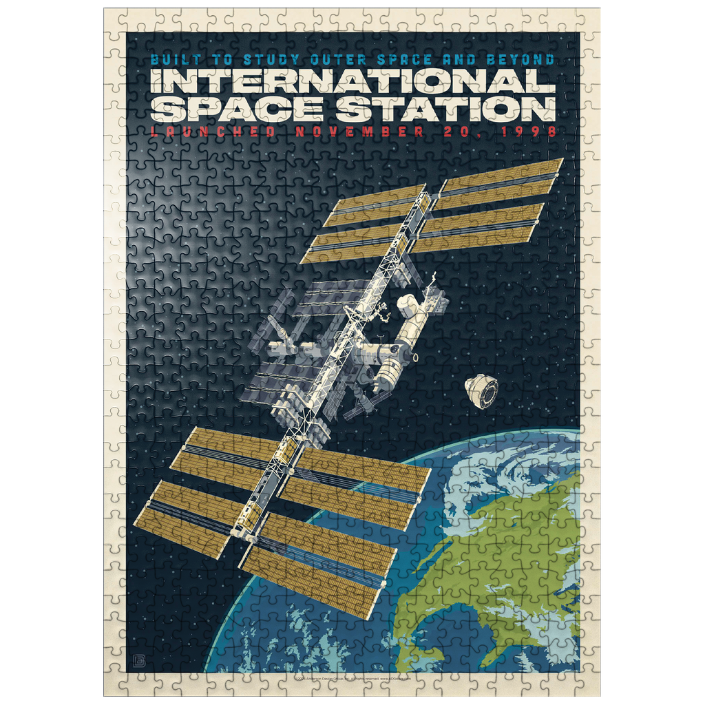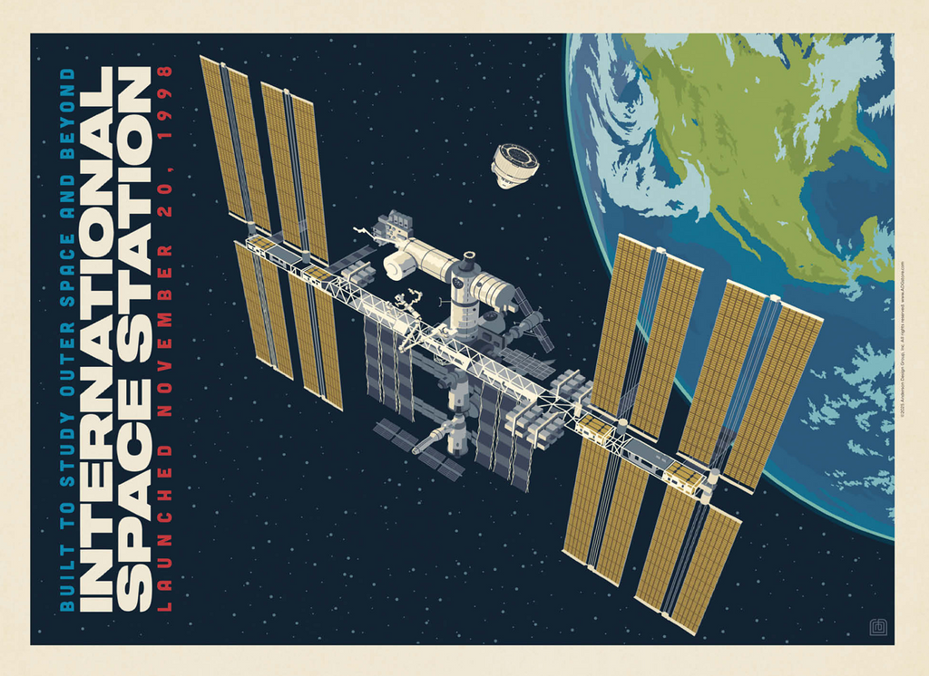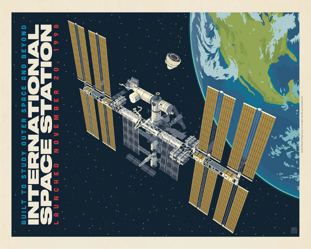 The International Space Station (ISS), launched on November 20, 1998, is a landmark achievement in global space exploration. This detailed artwork captures the ISS orbiting above Earth, with its expansive solar arrays illuminated against the backdrop of deep space. Floating nearby is a space capsule, emphasizing the station's role in transporting astronauts and conducting cutting-edge research. Positioned between day and night over the planet's surface, the scene reflects the ISS's continuous mission to study space, Earth science, and human physiology in microgravity. As a joint project by NASA, Roscosmos, ESA, JAXA, and CSA, the ISS symbolizes international cooperation in science and technology.