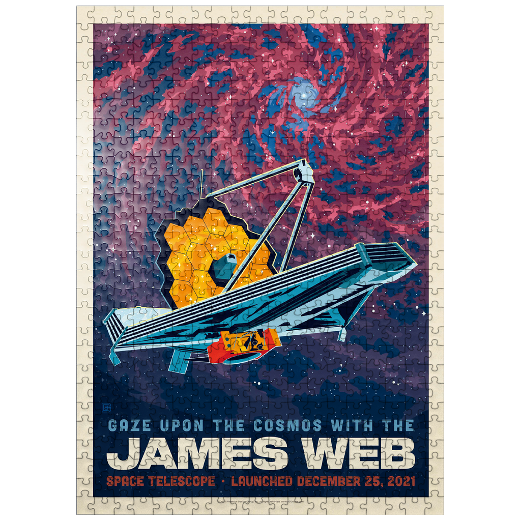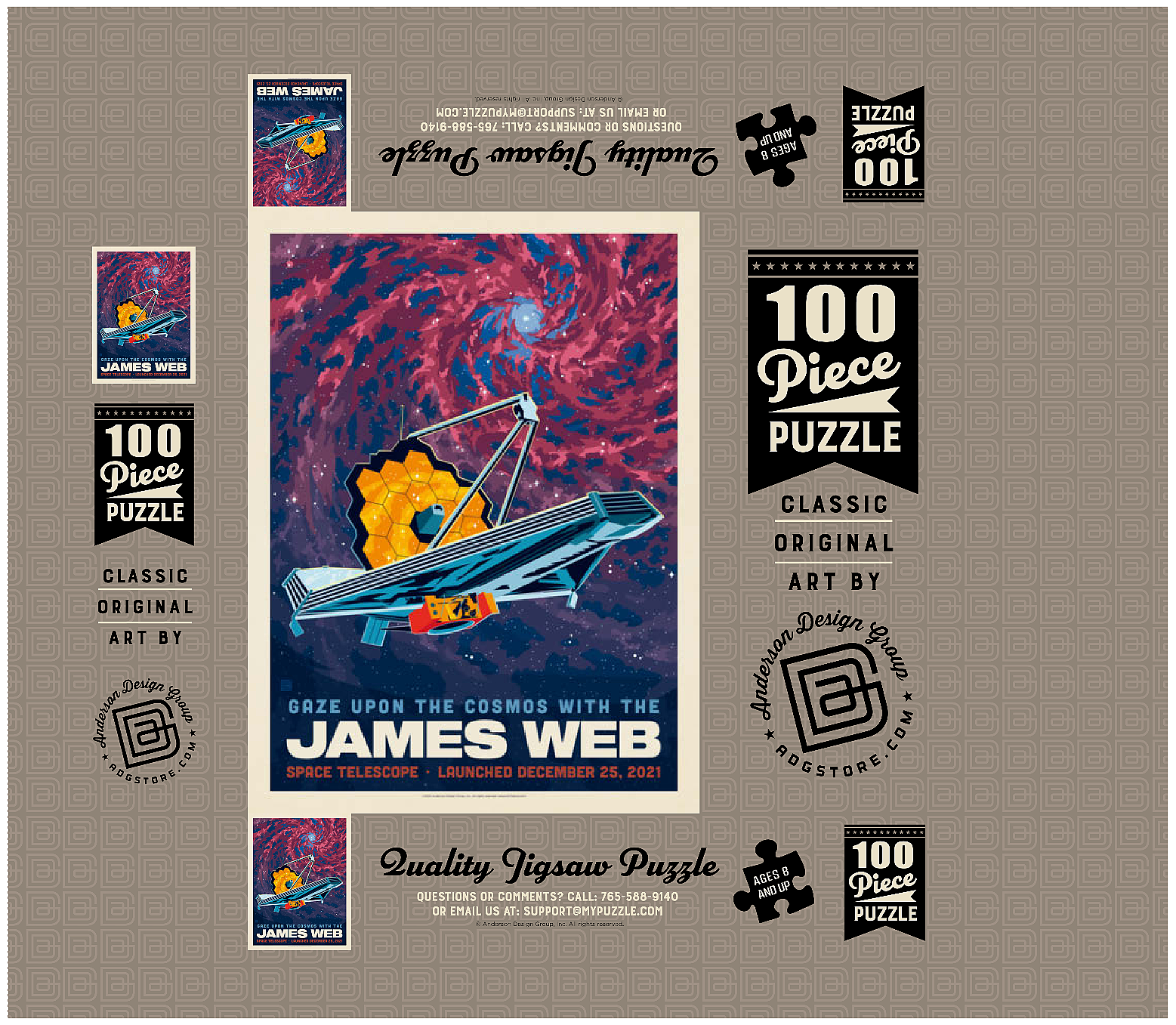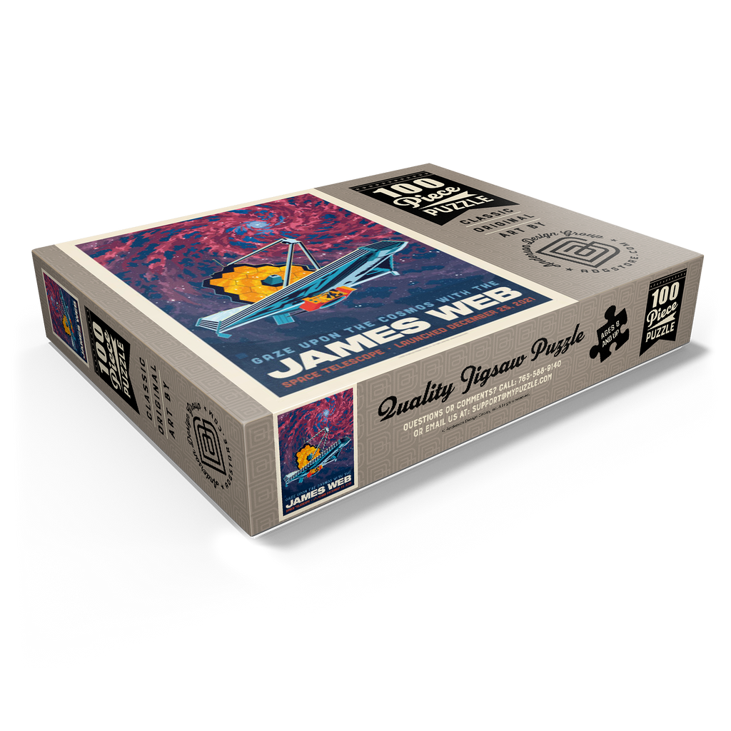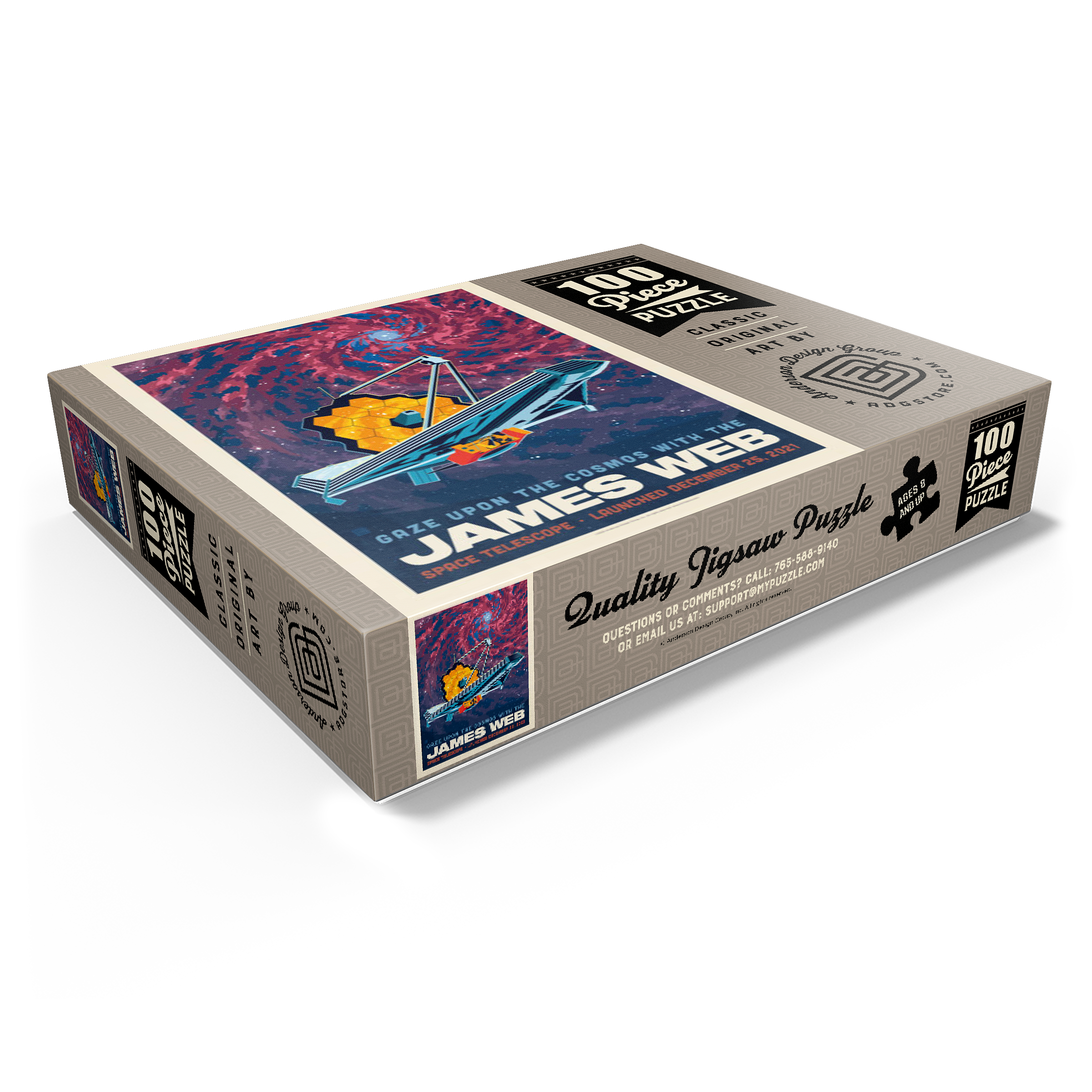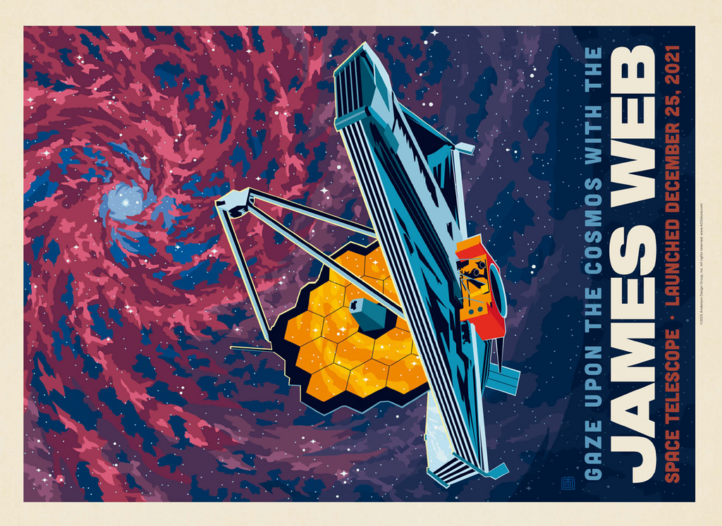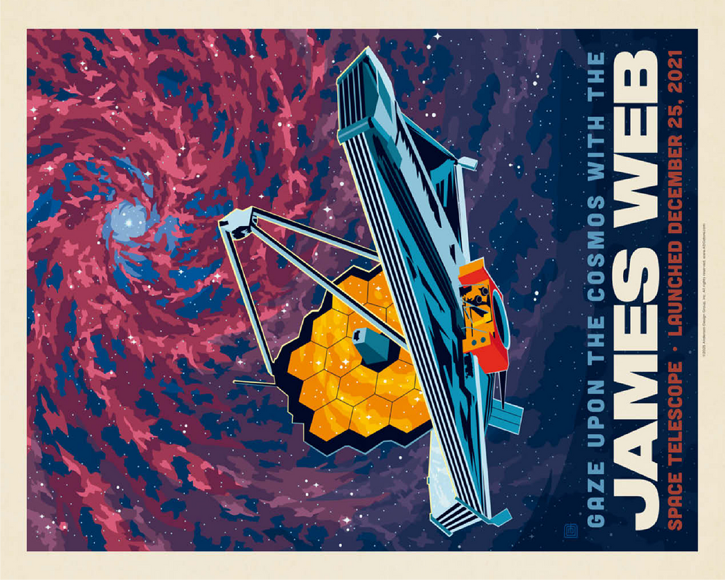 This bold retro-style artwork features the James Webb Space Telescope, launched on December 25, 2021, as it peers into the depths of the cosmos. Floating in space beyond Earth's orbit, its striking gold hexagonal mirrors reflect light from distant galaxies, nebulae, and the early universe. The swirling red and purple background evokes the vastness of space and the mysteries Webb continues to uncover. Designed to succeed Hubble, this powerful infrared observatory allows astronomers to study the origins of stars, planets, and galaxies with unprecedented clarity. The artwork celebrates scientific progress and the limitless curiosity of space exploration.