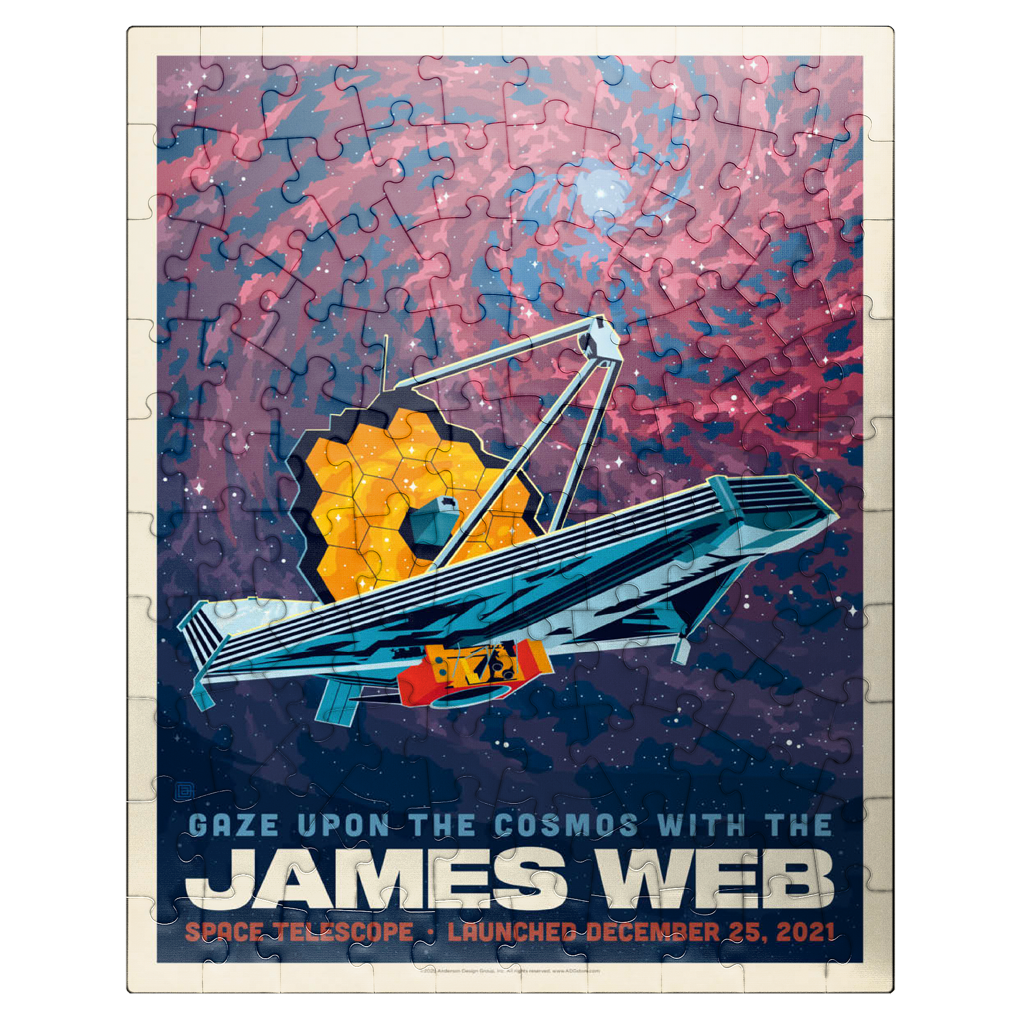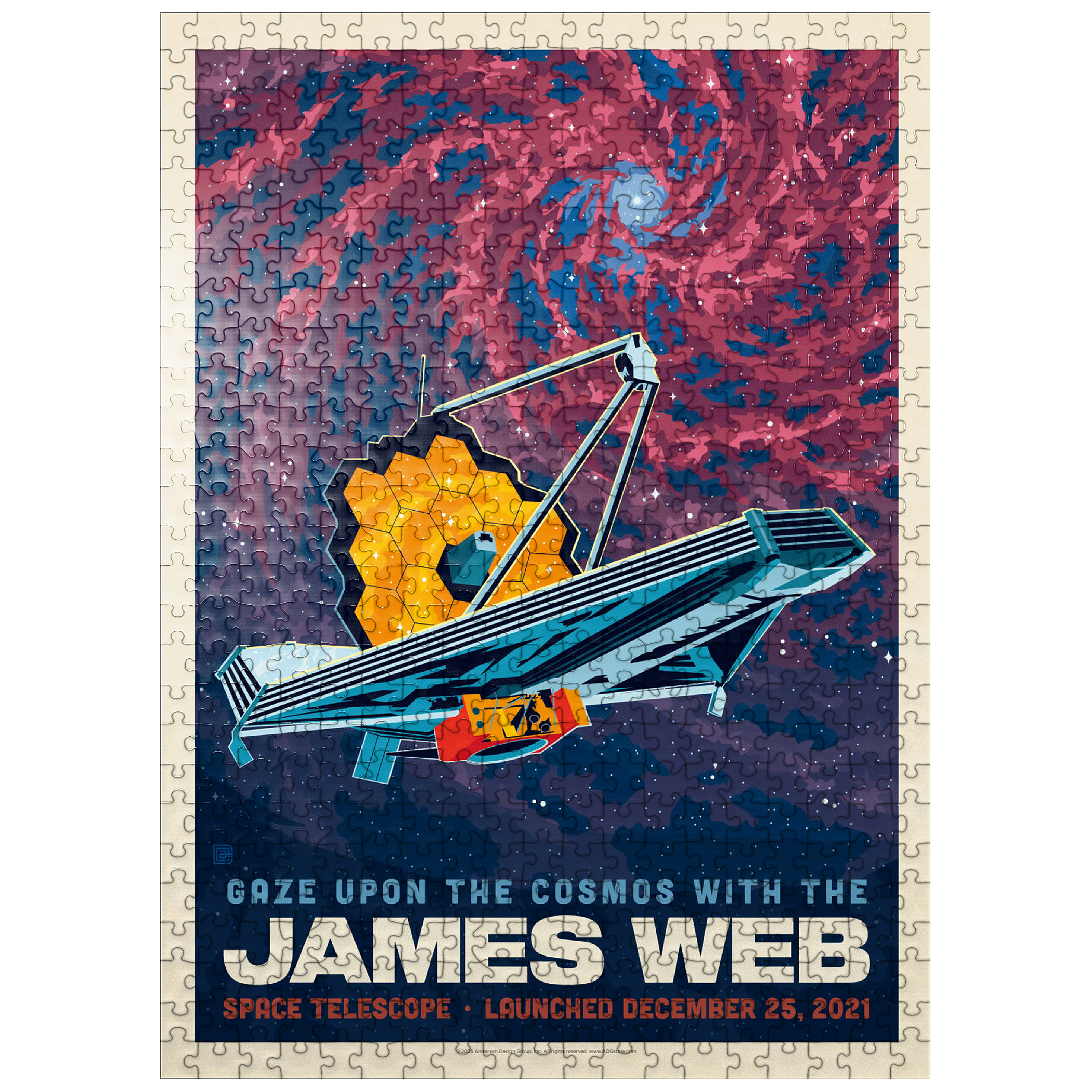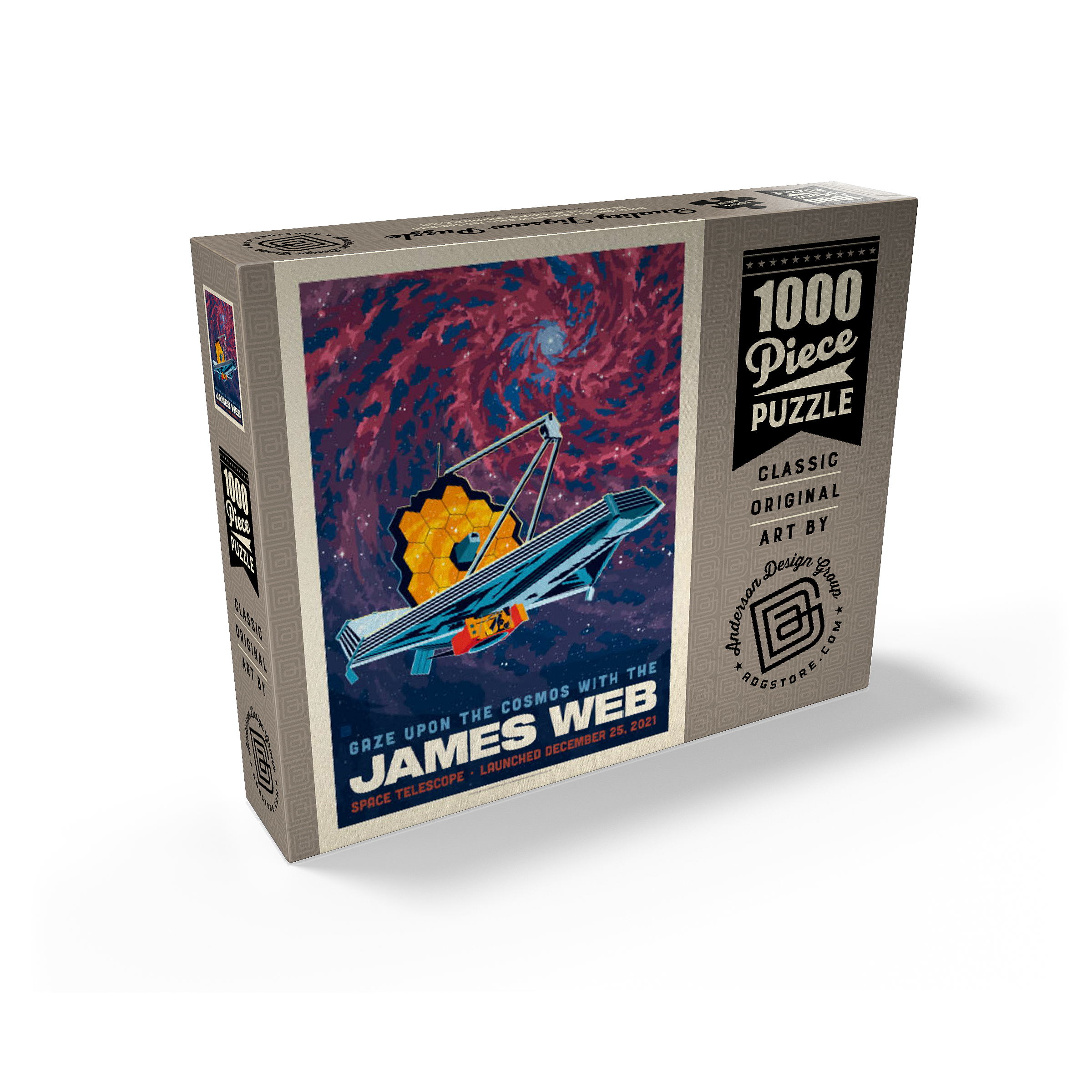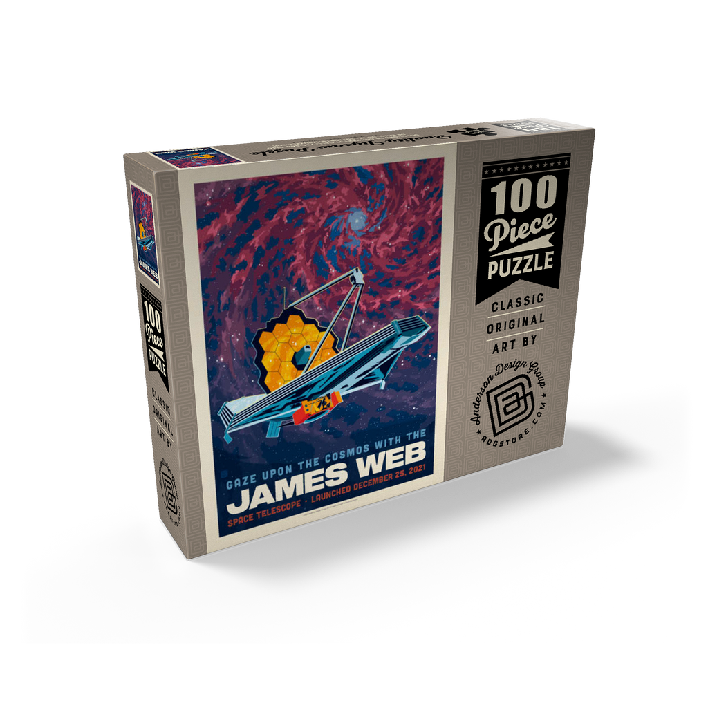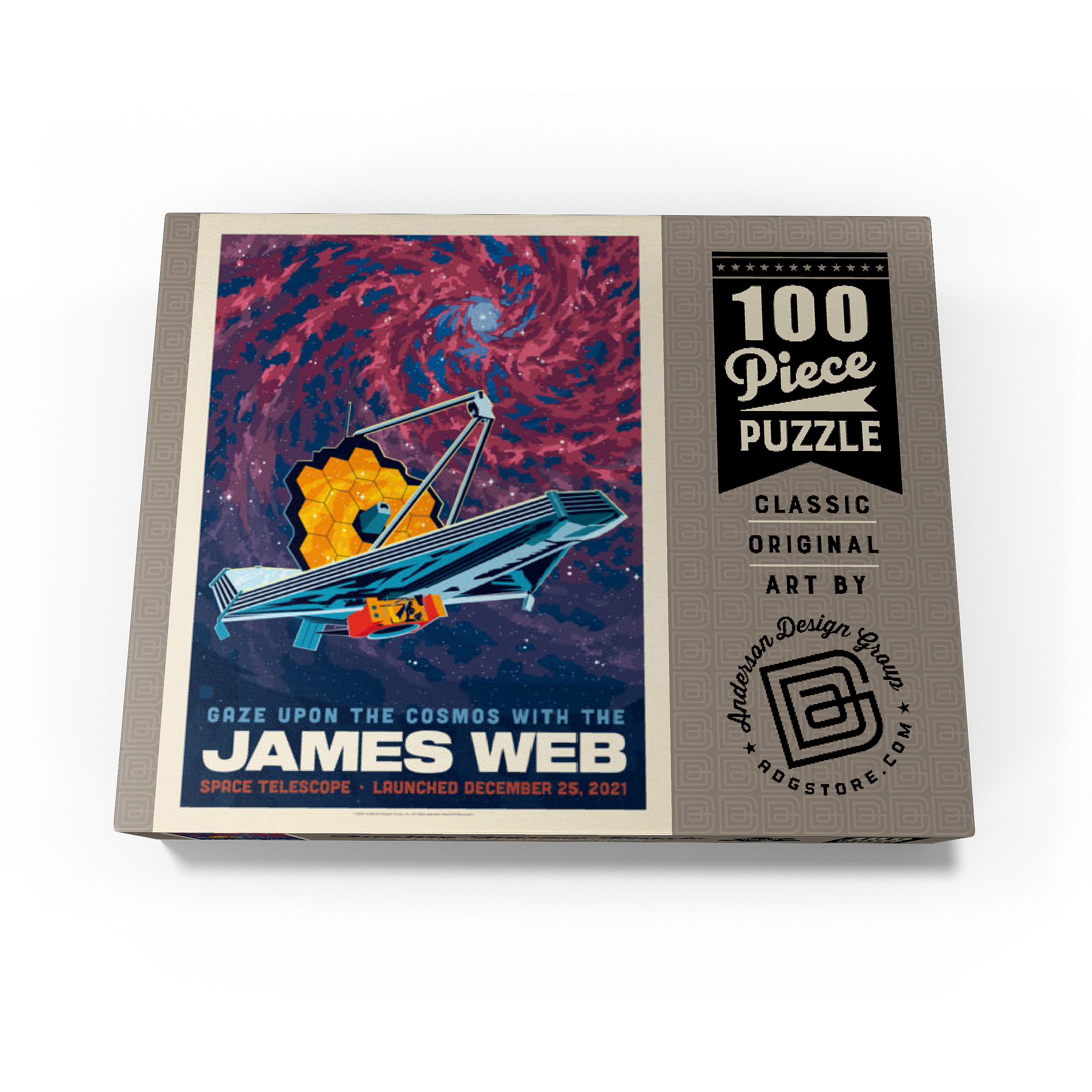 This bold retro-style artwork features the James Webb Space Telescope, launched on December 25, 2021, as it peers into the depths of the cosmos. Floating in space beyond Earth's orbit, its striking gold hexagonal mirrors reflect light from distant galaxies, nebulae, and the early universe. The swirling red and purple background evokes the vastness of space and the mysteries Webb continues to uncover. Designed to succeed Hubble, this powerful infrared observatory allows astronomers to study the origins of stars, planets, and galaxies with unprecedented clarity. The artwork celebrates scientific progress and the limitless curiosity of space exploration.